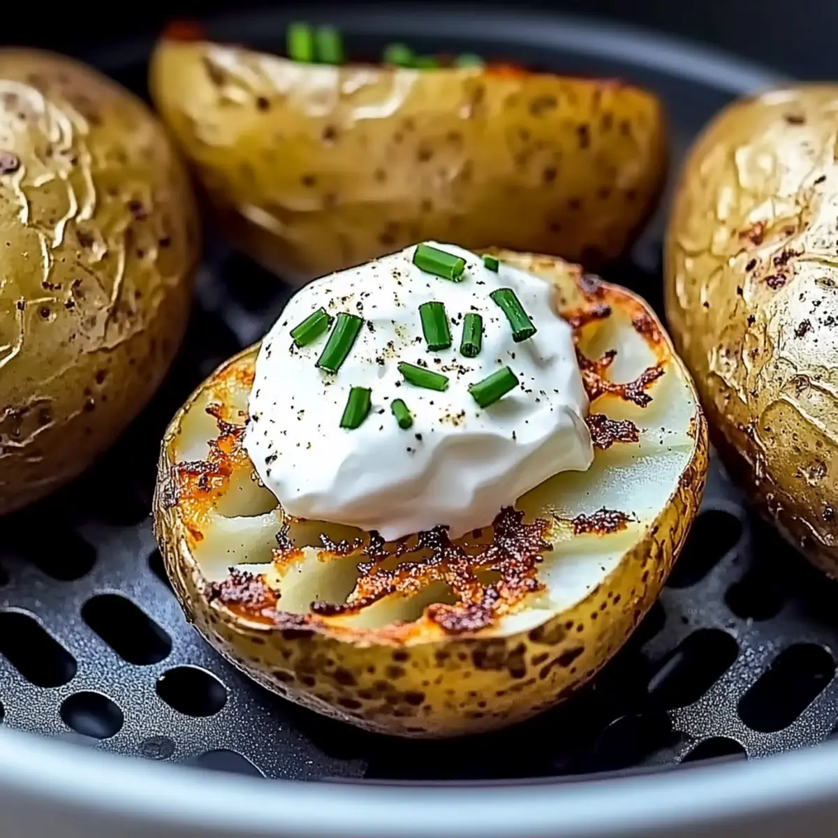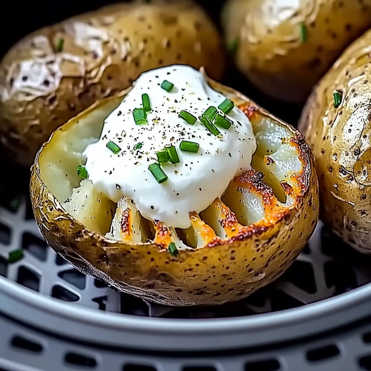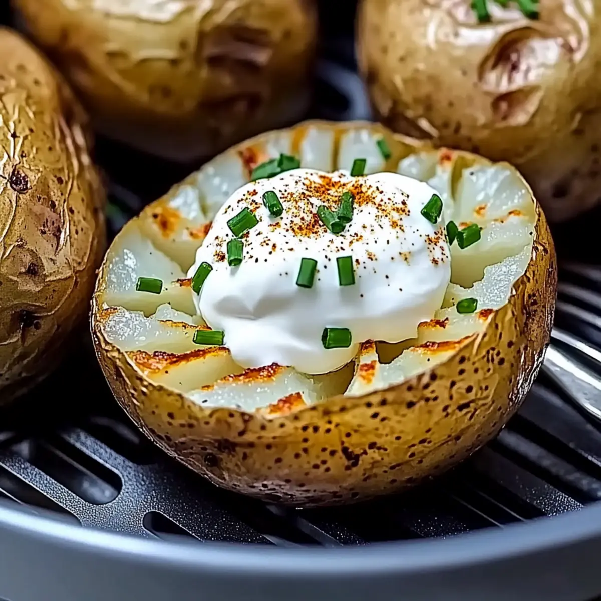 Jump to Recipe Print RecipeThere’s something magical about the first bite of a perfectly baked potato, especially when those crispy skins call out to you from the air fryer. This recipe for Air Fryer Baked Potatoes delivers just that, transforming a humble spud into a golden, crunchy delight in only 35-40 minutes! Not only is this dish a satisfying comfort food, but it also caters to gluten-free, low-carb, and even vegan diets, making it a versatile choice for any meal. Whether you serve them alongside a juicy steak or load them up with your favorite toppings for a cozy snack, you’ll find these fluffy, crispy potatoes are bound to bring a little warmth to your kitchen. Curious about how to whip up this delightful dish? Let’s dive in! Why are Air Fryer Baked Potatoes a must-try? Simplicity at Its Finest: You only need a few ingredients and minimal effort to make these crispy baked potatoes. Perfectly Crispy Skins: The air fryer brings out a delightful crunch that traditional baking simply can’t compete with. Customizable for Everyone: These potatoes are a blank canvas—top them with sour cream, avocado, or jalapeños to suit your taste! Quick Cooking Time: In just 35-40 minutes, you can transform a simple potato into a mouth-watering dish. Health-Conscious Option: Enjoy a gluten-free, low-carb, or vegan-friendly side that fits various dietary needs. Pair them with Baked Beef Chiles or a fresh salad for a wholesome meal! Air Fryer Baked Potatoes Ingredients • Here’s what you’ll need to create those delicious Air Fryer Baked Potatoes! For the Potatoes Medium Russet or Idaho Potatoes – These varieties provide the fluffy texture essential for baked potatoes; aim for 7-ounce sizes. For the Seasoning Olive Oil Spray – This enhances the crispiness of the potato skin; you can substitute with any high-heat oil spray if desired. Kosher Salt – Use one teaspoon per potato; it enhances flavor and contributes to that coveted crispy skin texture; avoid table salt for best results. Black Pepper – An optional seasoning that adds mild heat; feel free to adjust according to your personal taste! Optional Toppings Sour Cream or Butter – Classic toppings that add creamy richness; they balance the crispy texture beautifully. Chili or Broccoli – Adds a savory, hearty touch for variety; these are great for extra flavor fusion. Chives or Cheese – Perfect for a fresh finish or cheesiness; these will take your baked potatoes to the next level! With these ingredients, you’ll be well on your way to creating irresistible Air Fryer Baked Potatoes with a delightful crunch! Step‑by‑Step Instructions for Air Fryer Baked Potatoes Step 1: Prep Potatoes Begin by thoroughly washing and drying the medium Russet or Idaho potatoes. Next, pierce each potato all over with a fork—this allows steam to escape during cooking, preventing sogginess. Once done, the potatoes should look clean and have small holes evenly spaced around them. Step 2: Oil and Season Spray the prepared potatoes generously with olive oil, giving them a nice sheen. Following this, sprinkle kosher salt evenly over the surface, enhancing flavor and contributing to crispiness. If desired, add a dash of black pepper for a mild kick. These seasoned potatoes will soon transform into delicious air fryer baked potatoes. Step 3: Air Fry Carefully place the seasoned potatoes in your air fryer basket, ensuring they’re not touching, for optimum air circulation. Set the air fryer to 400°F (200°C) and cook for 35–40 minutes. About halfway through, pause to turn the potatoes for even cooking, ensuring a golden, crispy skin all around. Step 4: Check Doneness After 35 minutes, take a moment to check the doneness of your air fryer baked potatoes. Insert a knife or fork into the center; it should slide in without much resistance. If needed, continue air frying in 2-minute increments until perfectly tender, keeping an eye on that crispy outer layer. Step 5: Serve Once done, carefully remove the potatoes from the air fryer and let them rest for a minute on a plate. After resting, slice each potato open gently to add your favorite toppings. Let the delicious, fluffy interiors shine, paired wonderfully with the crunchy, golden skin. Enjoy your delightful air fryer baked potatoes! Air Fryer Baked Potatoes Variations Feel free to get creative with these variations and make this dish your own! Vegan-Friendly: Substitute traditional toppings with avocado or nutritional yeast for a creamy, flavorful alternative. You won’t even miss the dairy! Spicy Kick: Add diced jalapeños or a drizzle of your favorite hot sauce for a fiery twist. It elevates the flavor profile, perfect for those who love a bit of heat. Cheesy Goodness: Top with melted cheese for a rich experience that will satisfy all your cheesy cravings. It’s a comforting addition that pairs beautifully with crispy skins. Herb Infusion: Use fresh herbs like rosemary or thyme to sprinkle over the potatoes before serving. The fragrant aroma brings a fresh, earthy element that enhances the dish. Nutty Flavor: Drizzle with tahini or peanut sauce for a unique twist. This unexpected flavor will delight your taste buds and make your potatoes stand out. Garlic Butter: Brush warm, melted garlic butter over the finished potatoes for an added layer of richness. This classic combo takes these baked potatoes to another level. Mediterranean Delight: Top with feta cheese, olives, and cherry tomatoes for a Mediterranean flair. It adds a burst of flavor and an inviting coastal vibe to your meal. Loaded Option: Go all out and make them loaded with bacon bits, sour cream, and chives! This hearty version resembles a fully loaded baked potato, perfect for special occasions. Now, if you’re looking for other fun meals, consider trying out these Baked Hot Honey chicken or the creamy goodness in Baked Mac Cheese. They’re favorites in my home! Make Ahead Options Preparing Air Fryer Baked Potatoes ahead of time 