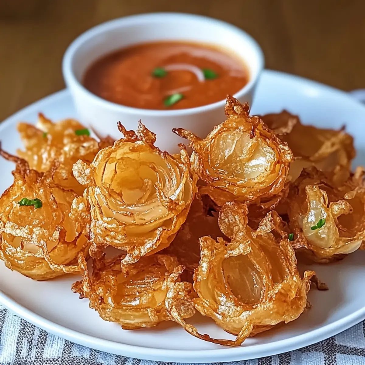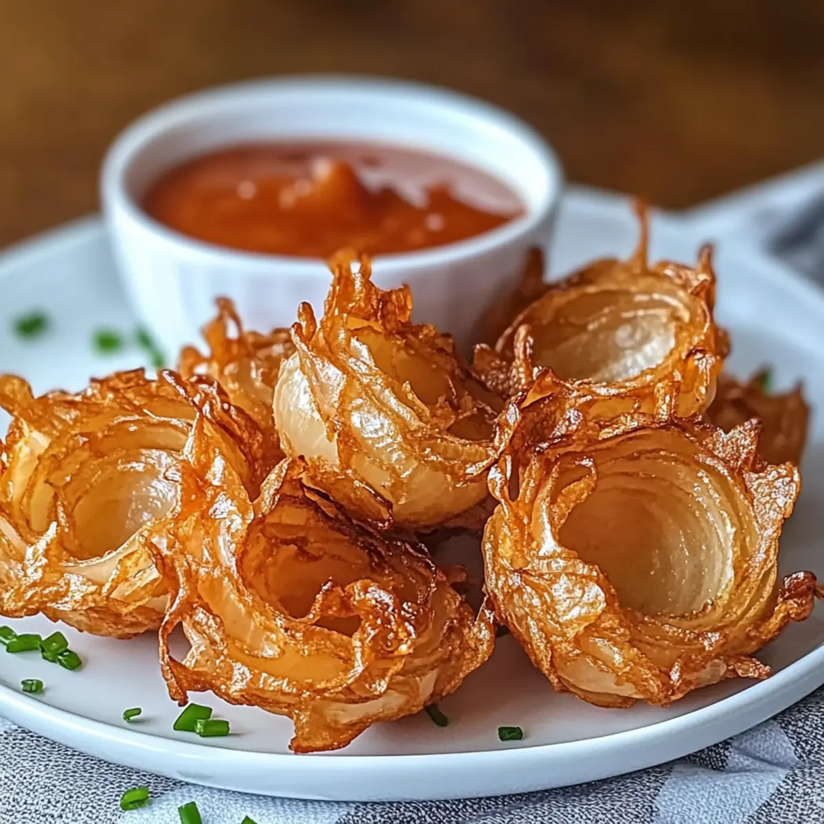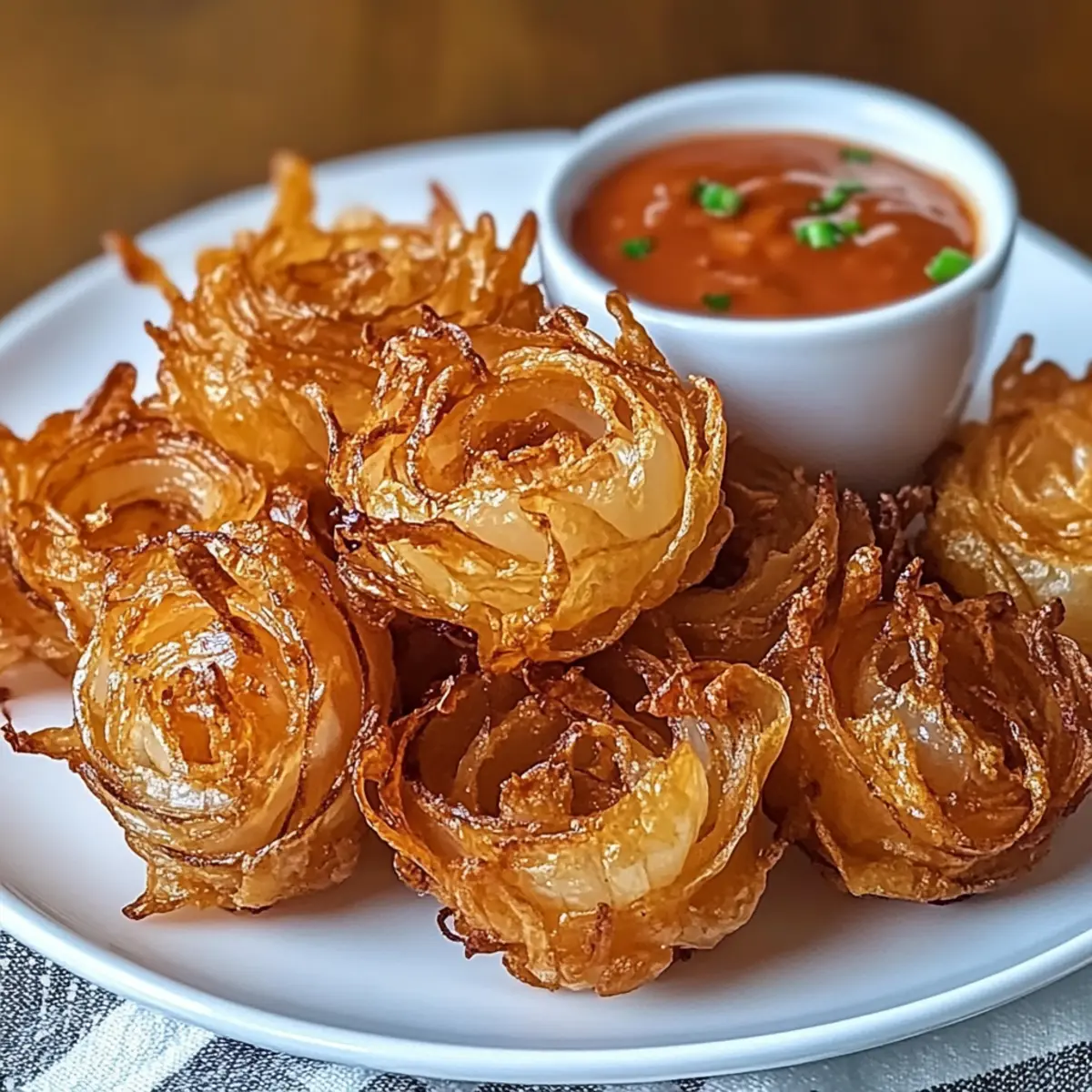 Jump to Recipe Print RecipeEvery so often, a bite transports you back to that fairground feast, where the air is thick with tantalizing aromas. Enter the Guilt-Free Air Fryer Crispy Mini Blooming Onions, a delightful twist on a classic! With a light crunch that skips the deep frying, these beauties are ideal for gatherings or a cozy night in. You’ll love the crispy exterior and tender interior that makes snacking feel like a joyous occasion. Plus, they’re easily customizable with various seasoning options and a gluten-free alternative, ensuring everyone can join in the fun. So, what will you dip yours into—classic ranch or something a bit more adventurous? Why are Air Fryer Mini Blooming Onions a Must-Try? Crispy Perfection: Enjoy a satisfyingly crunchy bite without the guilt of deep frying—perfect for health-conscious snackers. Customizable Flavors: Tailor your seasoning—spicy, cheesy, or herby—to match your cravings! Switch it up with enticing combinations. Easy to Make: This simple recipe takes just a few minutes, letting you whip up a crowd-pleaser whenever the mood strikes. Impressive Presentation: These mini blooming onions are not only fun to eat but also make a stunning appetizer for gatherings, sure to be a hit! Dipping Delight: Pair with your favorite sauces, like ranch or sriracha mayo, for a flavor explosion that elevates each bite! Air Fryer Crispy Mini Blooming Onions Ingredients For the Batter Buttermilk – Adds moisture and helps the coating adhere to the onions; can be substituted with milk mixed with lemon juice. Flour – Provides structure to the coating; for a gluten-free option, substitute with gluten-free flour. Paprika – Adds color and flavor; smoked paprika can be used for a deeper flavor. Garlic Powder – Enhances taste with savory notes. Onion Powder – Reinforces the onion flavor in the coating. Cayenne Pepper – Provides a kick of heat; adjust according to taste. Salt and Pepper – Essential for seasoning. For the Onions Sweet Onions (like Vidalia) – Main ingredient; seek firm onions with smooth skin. Cooking Spray/Oil – Used for a crispy exterior; lightly spray or brush onto coated onions. These Air Fryer Crispy Mini Blooming Onions are not only delicious but guilt-free, making them an excellent choice for your next snack or appetizer! Step‑by‑Step Instructions for Air Fryer Crispy Mini Blooming Onions Step 1: Prepare Buttermilk In a bowl, combine buttermilk and lemon juice, letting it sit for 5 minutes to curdle slightly. This will create a creamy base that clings beautifully to the onions, ensuring the coating sticks well. Step 2: Prepare Onions Peel your sweet onions and trim both the tops and bottoms. Carefully make vertical cuts in the onions to create petal-like blooms, ensuring you don’t cut all the way through. Aim for about 8–12 cuts per onion, allowing them to open up during cooking. Step 3: Mix Dry Ingredients In a separate bowl, whisk together flour, paprika, garlic powder, onion powder, cayenne, salt, and pepper until evenly mixed. This flavorful coating is key to achieving deliciously crispy Air Fryer Crispy Mini Blooming Onions, enhancing their taste and presentation. Step 4: Coat Onions Dip each prepared onion into the buttermilk mixture, allowing any excess to drip off. Then, coat it all over with the flour mixture, ensuring an even layer covers the entire surface. This step is crucial for obtaining a crunchy, golden-brown exterior. Step 5: Preheat Air Fryer Set your air fryer to 380°F (190°C) and preheat for 5 minutes. This preheating step is essential for ensuring that your Air Fryer Crispy Mini Blooming Onions cook evenly and develop that perfect crispy texture. Step 6: Arrange & Spray Carefully place the coated onions in the air fryer basket, making sure they are spaced adequately apart to allow air circulation. Lightly spray the tops with cooking spray for extra crispiness, ensuring each onion is well-coated but not drenched. Step 7: Air Fry Cook the onions in the air fryer for 10–12 minutes, shaking the basket halfway through to promote even browning. Keep an eye on them, as you’re aiming for a beautiful golden hue and a crispy finish that is visually appetizing. Step 8: Prepare Dipping Sauce While the Air Fryer Crispy Mini Blooming Onions are cooking, mix together mayonnaise, ketchup, horseradish sauce, lemon juice, and any additional seasonings to taste in a bowl. This flavorful dipping sauce will complement the onions perfectly when serving. Step 9: Serve Once cooked to a perfect golden-brown color, remove the onions from the air fryer and let them cool slightly. Serve warm with your prepared dipping sauce on the side, and watch how these crispy treats disappear at your gathering! How to Store and Freeze Air Fryer Crispy Mini Blooming Onions Fridge: Keep any leftover Air Fryer Crispy Mini Blooming Onions in an airtight container for up to 2 days. Reheat them in the air fryer at 350°F (175°C) for about 5 minutes to regain their crunch. Freezer: For longer storage, freeze uncooked, coated onions in a single layer for up to 1 month. When ready to enjoy, cook directly from frozen, adding a few extra minutes to the cooking time. Make-Ahead: You can prepare and coat the onions in advance; refrigerate them until ready to cook. This way, you’re just minutes away from a delightful and crispy snack! Air Fryer Crispy Mini Blooming Onions Variations Feel free to explore your creativity with these delicious Air Fryer Crispy Mini Blooming Onions and add your personal touch! Gluten-Free: Swap out regular flour for your favorite gluten-free blend to enjoy a guilt-free version. When modifying recipes, it can be fun to see how versatile your ingredients are. Don’t hesitate to experiment! Spicy Kick: Increase the cayenne pepper or add a splash of hot sauce to the buttermilk for a flavorful heat boost. Your taste buds might just thank you for this electrifying twist! Spice levels can be easily adjusted to cate
