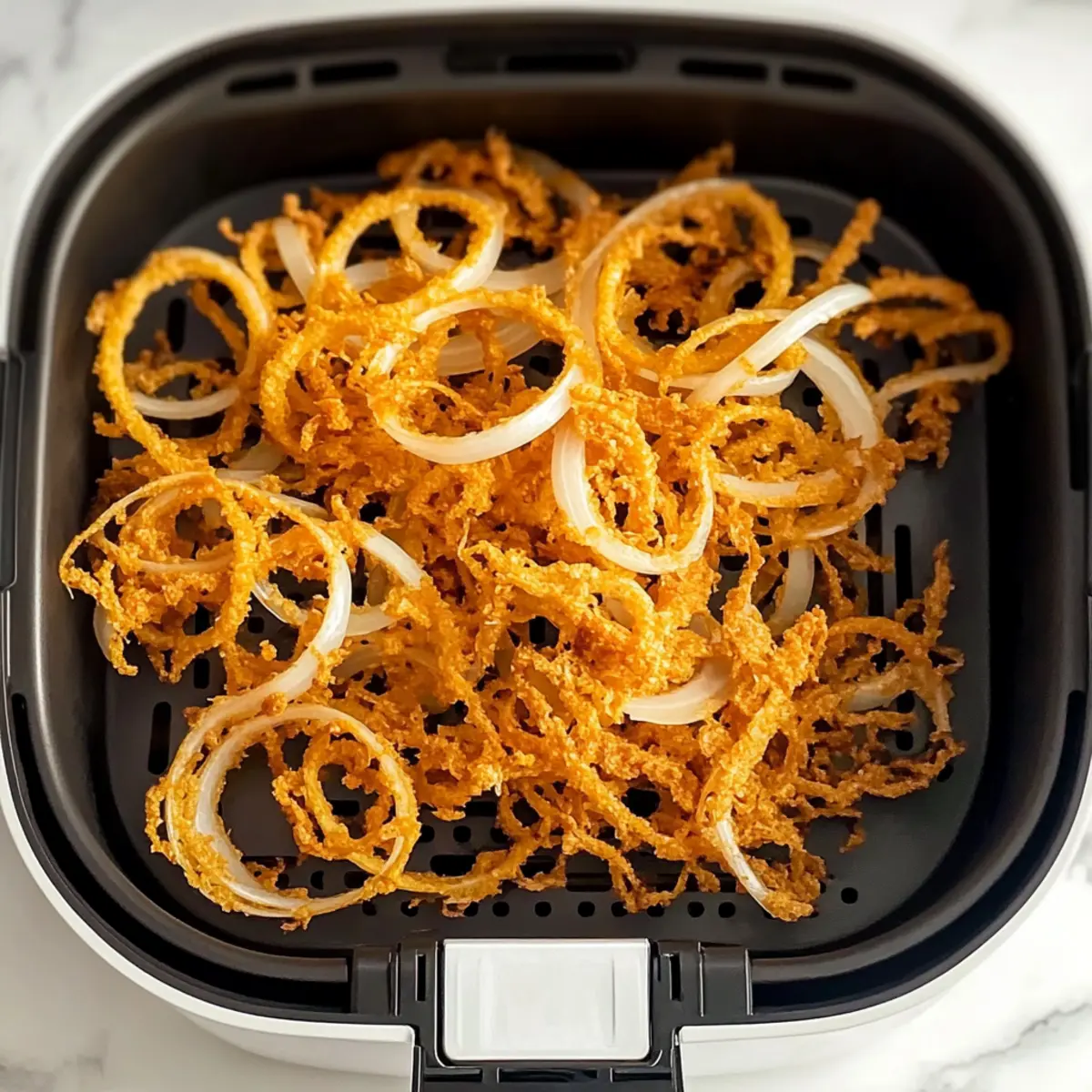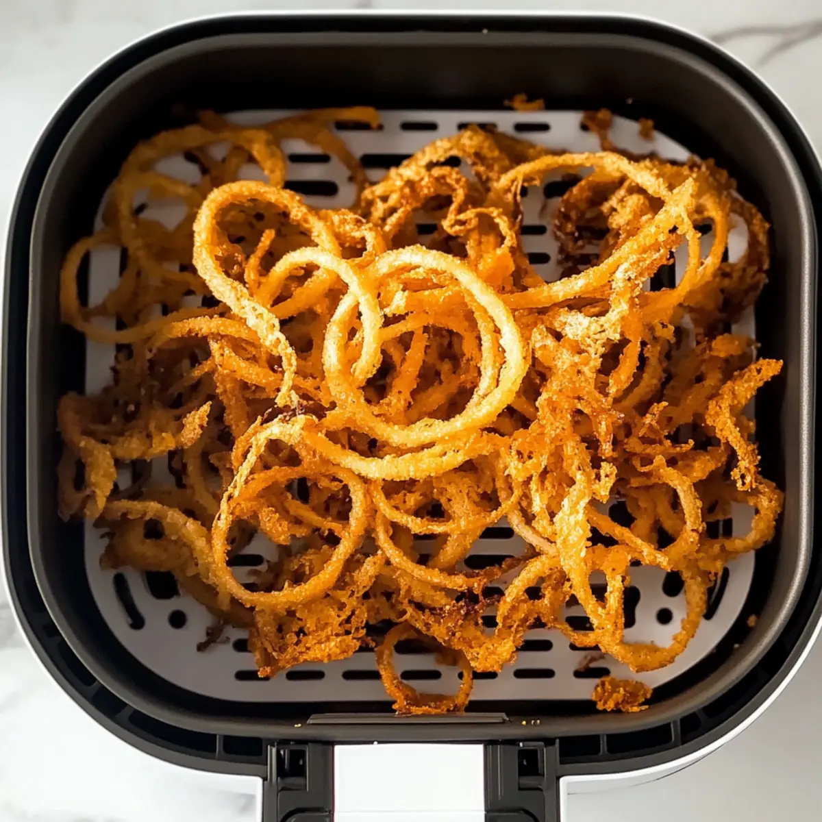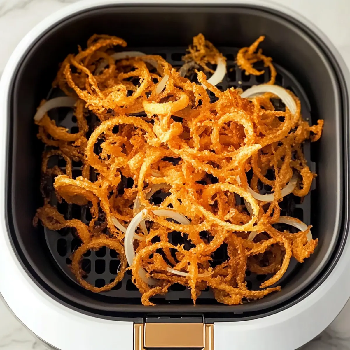 Jump to Recipe Print RecipeStrolling through the bustling aisles of my local market, I stumbled upon the most perfect yellow onions, their earthy aroma immediately captivating me. Fast-forward to today, I’m thrilled to share my recipe for Air Fryer Crispy Onions—a delightful twist on a classic that transforms humble onions into perfectly crunchy bites that can elevate any meal. This dish not only satisfies your craving for that crispy texture we all adore, but it also offers a healthier option without skimping on flavor, making it a win-win for everyone. Whether tossed onto a vibrant salad, layered on a juicy burger, or enjoyed as a fantastic snack, these Air Fryer Crispy Onions are bound to become a staple in your kitchen. Curious how to create these golden gems? Let’s dive in! Why Are Air Fryer Crispy Onions a Must-Try? Crispy Perfection: The air fryer brings out a satisfying crunch without excess oil, making these onions a guilt-free indulgence. Flavor Versatility: With suggestions for spices or cheese, you can tailor the flavor to your taste! Whether you prefer the classic onion taste or something spiced up, these versatile bites cater to everyone. Healthy Alternative: Unlike traditional frying methods, air frying significantly reduces calories while retaining that irresistible golden goodness. Quick and Easy: This recipe is simple and speedy, letting you whip up a delicious snack or side in no time—perfect for those busy weeknights! Plus, if you love adding layers of flavor to your dishes, consider pairing these crispy onions with Lollipop Chicken Legs or using them in a salad alongside some Bang Bang Salmon. Air Fryer Crispy Onions Ingredients For the Onions • Yellow Onions – Choose medium to large-sized for the ideal balance of sweetness and texture. • Cooking Oil – Opt for canola or avocado oil for a healthier, crispy finish. For Flavor Enhancements • Paprika/Cayenne Pepper – A sprinkle can elevate the kick and warmth of your crispy onions! • Grated Parmesan – Adding this before frying introduces a luxurious, cheesy flavor that complements the onions beautifully. Optional Fresh Herbs • Thyme – Infuse a fresh, aromatic taste by adding thyme before air frying. • Red Onions – Swap yellow onions for red for a deeper, sharper flavor profile if desired. Dive into this delightful recipe and check out how crispy, healthy Air Fryer Crispy Onions can transform your meals! Step‑by‑Step Instructions for Air Fryer Crispy Onions Step 1: Prep the Onions Begin by peeling and slicing 2 medium to large yellow onions into thin rings, aiming for around ¼ inch thick for even cooking. Lay the onion rings flat on a cutting board, ensuring they are separated and ready for seasoning. This initial step is crucial for achieving that perfect crunch later on! Step 2: Oil Addition Next, drizzle 1 tablespoon of cooking oil, such as canola or avocado oil, over the sliced onion rings. Gently toss and separate the rings to ensure a thorough coating of oil. This will help them develop a beautiful golden-brown exterior when air frying, enhancing the texture of your Air Fryer Crispy Onions. Step 3: Initial Fry Place the oiled onions in your air fryer basket in a single layer, avoiding overcrowding for optimal airflow. Set the temperature to 300°F (150°C) and cook for 10 minutes. Halfway through, gently shake or stir the onions for even cooking. They should start to soften and turn slightly translucent at this stage. Step 4: Lower Temperature After the initial frying, reduce the temperature to 240°F (120°C), and continue cooking for another 15 to 18 minutes. Make sure to mix the onions every 5 minutes, ensuring they cook evenly and don’t stick together. You’ll know they’re ready when they turn a gorgeous golden brown, indicating that your Air Fryer Crispy Onions are about to reach that delightful crunch! Step 5: Cooling & Serving Once they reach that desirable color and crispiness, carefully remove the onions from the air fryer and allow them to cool slightly on a paper towel. This cooling period will help them become even crunchier. Use these delicious Air Fryer Crispy Onions as a topping on burgers, salads, or simply savor them as a satisfying snack! Expert Tips for Air Fryer Crispy Onions Uniform Slices: Ensure your onion rings are evenly sliced to guarantee uniform cooking. Thicker rings may take longer to crisp up properly. Temperature Control: Preheating your air fryer helps achieve optimal crispiness. Don’t skip this step for the best Air Fryer Crispy Onions! Oil Balance: Use just enough oil to coat the onions without soaking them. Too much oil can lead to soggy results rather than delightful crunch. Creative Seasoning: Don’t hesitate to experiment with different spices like garlic powder or Italian herbs. This adds exciting flavors to your crispy onions. Avoid Overcrowding: Ensure there’s enough space in the air fryer basket for air circulation. Overcrowding leads to uneven cooking and less crispy results. Air Fryer Crispy Onions Variations Get ready to explore exciting twists on your Air Fryer Crispy Onions, allowing your taste buds to dance with delight! Spicy Kick: Add a pinch of cayenne or chili powder for a fiery twist. Perfect for those who love a little heat with their crunch! Cheesy Delight: Sprinkle grated Parmesan cheese on the onions before air frying. The melted cheese forms an irresistible crust that enhances flavor. Herb Infusion: Toss in fresh herbs like rosemary or thyme for an aromatic lift. These fragrant additions bring a delightful freshness to your crispy bites. Garlic Flavor: Mix in garlic powder with your oil before coating the onions for a savory punch that complements the onion’s natural sweetness. Vegan Version: Replace Parmesan with nutritional yeast to create a dairy-free cheesy flavor without sacrificing taste. It’s a great option for vegan households! Sweet Surprise: Drizzle with a touch of honey or maple syrup (before air 