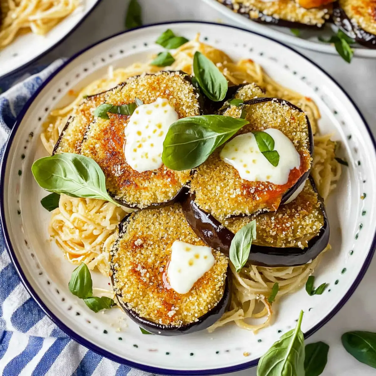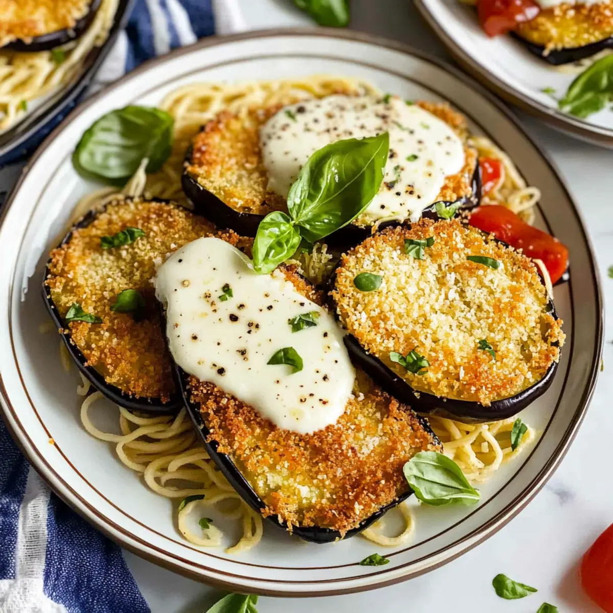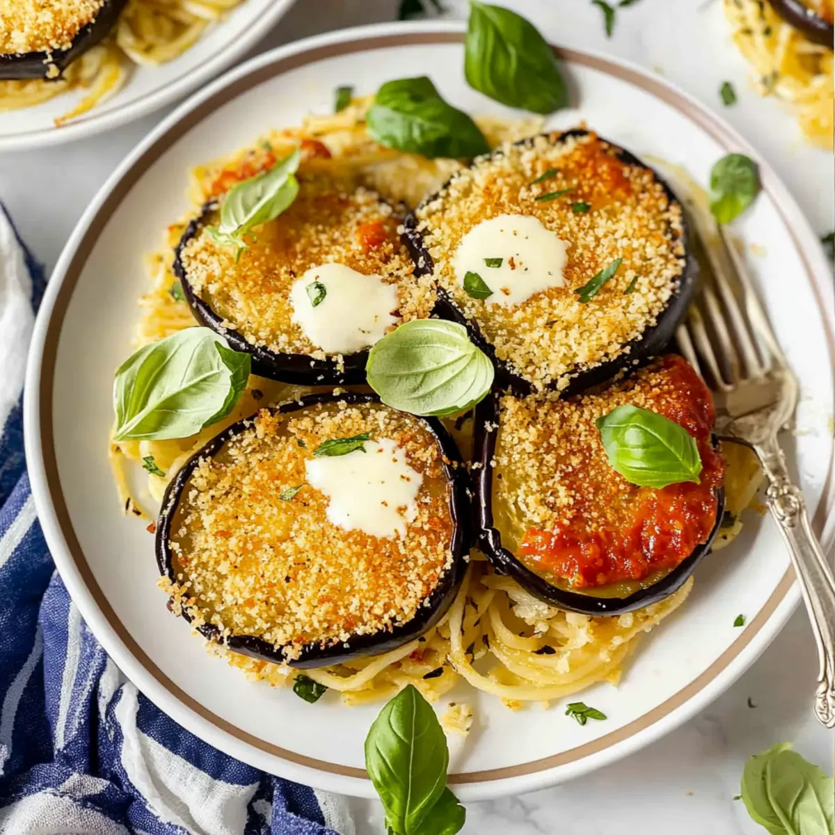 Jump to Recipe Print RecipeAs I stood in my kitchen, the aroma of sizzling eggplant wafted through the air, whispering promises of flavor and crunch. My latest creation? Crispy Air Fryer Eggplant with Parmesan Crust—an effortless dish that brilliantly marries a delightful crunchy exterior with a soft, tender inside. Not only is this recipe gluten-free and adaptable for vegan diets, but it also comes together in a mere fraction of the time it takes to make traditional versions. Perfect as a side dish or a satisfying stand-alone meal, this eggplant will impress even the pickiest eaters at your table. Intrigued by how something so simple can transform your dinner routine? Let’s dive into this delicious journey! Why is Air Fryer Eggplant a Must-Try? Irresistible Crunch: The crispy, panko-coated exterior creates a satisfying crunch that will keep you coming back for more. Quick Preparation: With minimal prep time, this recipe allows you to whip up a tasty dish in no time. Versatile Dish: Whether served as a side or the star of your meal, it adapts beautifully—try it with pasta, or enjoy it on its own! Diet-Friendly: This version is gluten-free and easily adaptable to vegan diets by swapping out a few ingredients. Crowd-Pleasing Flavor: Rich in savory notes from the Parmesan or your choice of cheese, this eggplant will be a hit with everyone at your table. Ready to get started? Check out my ingredient breakdown for every detail you need! Air Fryer Eggplant Ingredients For the Eggplant • Eggplant – Use large globe eggplant sliced into ¼-inch rounds for the perfect texture. • Sea Salt – Aiding in moisture extraction, this will give your eggplant a smooth texture and enhance flavor. For the Coating • Egg – Acts as a binder; swap for a mixture of nut milk and flaxseed for a vegan option. • Panko Bread Crumbs – Provides that irresistible crunch; choose gluten-free if needed. • Almond Flour – Offers a nutty flavor and helps the coating adhere; can be replaced with all-purpose flour if required. • Parmesan Cheese – Adds a savory depth to the dish; feel free to use pecorino or vegan Parmesan for alternate diets. • Pepper – Seasoning to taste; fresh cracked black pepper works wonders here. For Air Frying • Olive Oil – Essential for drizzling to achieve that golden crunch while air frying. Optional Serving Ingredients • Cooked Pasta – For a hearty meal when paired with the eggplant. • Tomato Sauce – Adds juiciness and flavor, elevating your dish. • Cashew Cream – A delightful creamy drizzle to complement the eggplant. • Fresh Basil/Parsley – A pop of fresh flavor that brightens the dish beautifully. • Red Pepper Flakes – For those who like a kick of heat to their air fryer eggplant! With these ingredients, you’ll be well on your way to whipping up an unforgettable Air Fryer Eggplant dish that ticks all the boxes for flavor, texture, and dietary preferences. Step‑by‑Step Instructions for Crispy Air Fryer Eggplant with Parmesan Crust Step 1: Preheat the Air Fryer Begin by preheating your air fryer to 370°F (188°C). This step is crucial as it ensures that your air fryer eggplant will cook evenly, achieving the perfect golden, crispy outside and tender inside. Allow about 5 minutes for the air fryer to reach the desired temperature, giving you time to prepare the eggplant while it heats up. Step 2: Salt the Eggplant Slice the large globe eggplant into ¼-inch rounds and generously sprinkle sea salt over the slices. Place them in a colander to drain for about 30 minutes. This process helps to draw out moisture, making your eggplant less bitter and allowing for a smoother texture after cooking. You’ll know it’s ready when the slices look slightly wilted and have released some water. Step 3: Prepare the Coating While the eggplant drains, whisk one egg in a shallow bowl. In a separate bowl, combine panko bread crumbs, almond flour, freshly grated Parmesan cheese, salt, and pepper to create your crispy coating mix. This flavorful blend is essential for that delightful crunch on your air fryer eggplant. Make sure everything is mixed well for even coating. Step 4: Dredge the Eggplant Once the eggplant has drained, pat the slices dry with paper towels to remove excess moisture. Dip each slice first into the egg and then coat it in the panko mixture, ensuring each piece is fully covered. This two-step process is key to achieving a perfectly crispy exterior for your air fryer eggplant. Step 5: Drizzle with Olive Oil After breading all the eggplant slices, lightly drizzle olive oil over the coated pieces on both sides. This oil is vital for achieving that golden brown color while air frying. Place the breaded eggplant slices in a single layer in the air fryer basket, making sure they aren’t overcrowded to allow for proper air circulation. Step 6: Air Fry the Eggplant Air fry the breaded eggplant at 370°F (188°C) for 17-20 minutes. Halfway through, carefully flip the slices to ensure they cook evenly on both sides. You’ll know they are done when they turn a beautiful golden brown and become crispy to the touch. Depending on your air fryer model, cooking times might vary slightly, so keep a close eye. Step 7: Serve and Enjoy Once your air fryer eggplant is crispy and golden, carefully remove it from the basket. Serve immediately as a side dish, or over cooked pasta, drizzled with marinara sauce and a splash of cashew cream for a hearty meal. Top with fresh herbs like basil or parsley for a burst of flavor. Enjoy this delightful dish as it’s meant to be—fresh and warm! Air Fryer Eggplant Variations & Substitutions Feel free to make this crispy air fryer eggplant your own with these tempting twists and swaps that enhance flavor and cater to dietary needs. Vegan Swap: Replace the egg with a mixture of nut milk and flaxseed to keep it plant-based and just as delicious. This keeps the coating intact while ensuring a crispy finish. Gluten-Free Op