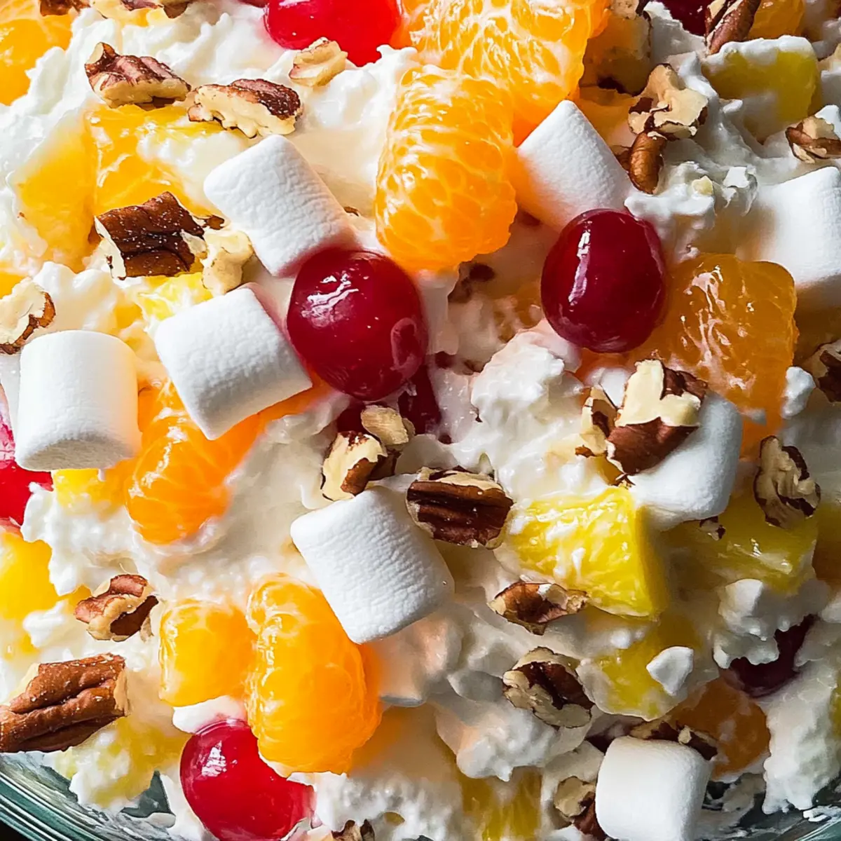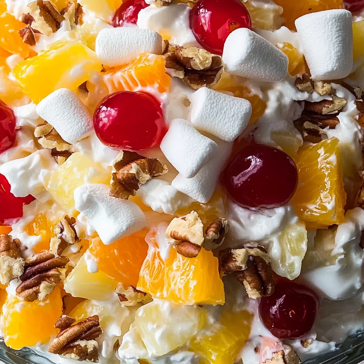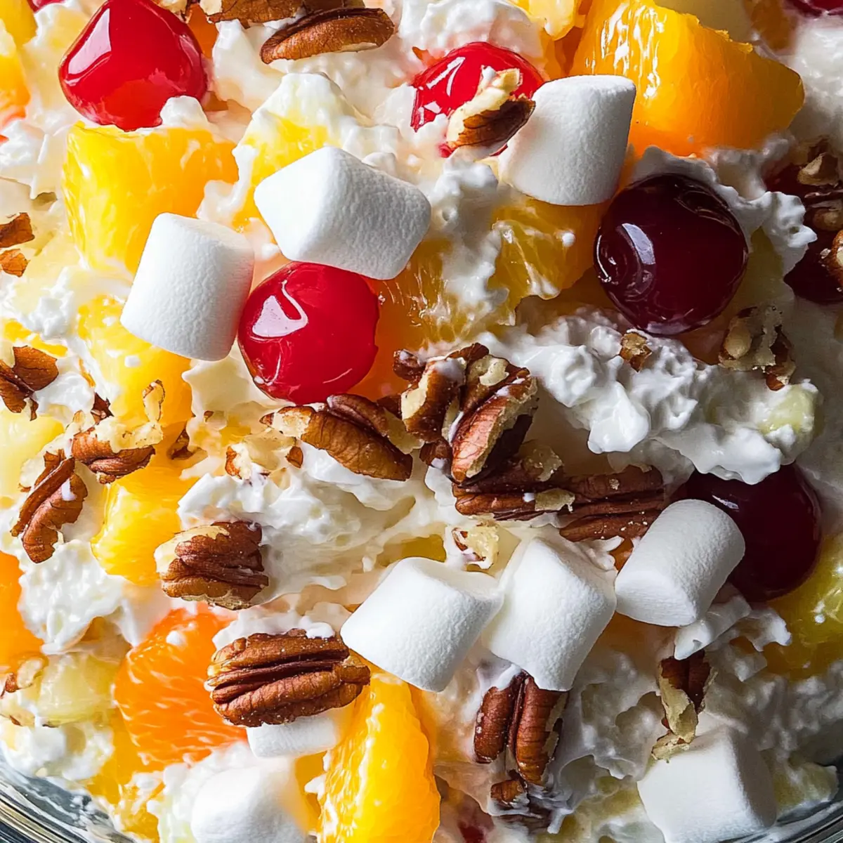 Jump to Recipe Print RecipeSpring has a way of stirring up delightful memories, and one that always takes me back is the first bite of a classic Southern Ambrosia Salad. This creamy fruit salad marries juicy mandarin oranges, fresh pineapple, and crunchy pecans with a cloud-like dressing that feels like a warm hug from the past. Not only is it a fantastic make-ahead dish, perfect for potlucks and gatherings, but it’s also easily adaptable, allowing you to experiment with your favorite fruits or even try a lighter twist with Greek yogurt. The perfect mix of sweetness and crunch brings a refreshing harmony to any table, making it a quintessential part of Southern cuisine. Are you ready to recreate this nostalgic treat that’s sure to impress friends and family alike? Why is Ambrosia Salad a Must-Try? Heavenly taste: This cream-filled delight brings together a mix of fruits and nuts, creating layers of flavor that dance on your palate. Versatile ingredients: Adapt to your favorites or create a healthier version using Greek yogurt instead of Cool Whip. Make-ahead convenience: Easily prepare this salad a day in advance, making it perfect for busy gatherings or potlucks. Crowd-pleaser appeal: Its nostalgic charm makes it a hit at any gathering, whether it’s family dinners or summer barbecues. Pair it with refreshing options like a Cucumber Strawberry Salad for a delightful spread! Southern tradition: Embrace a dish that’s beloved in Southern cuisine and reflects rich culinary history. With each bite, you’re sure to transport yourself to those warm days of springtime joy. Ambrosia Salad Ingredients For the Creamy Base Cool Whip – Adds sweetness and creaminess; for a fresher taste, you can substitute with homemade whipped cream. Sour Cream – Provides tanginess to balance the sweetness; Greek yogurt is a great healthier alternative. For the Fruit Mini Marshmallows – Contribute chewy texture and sweetness; replace with diced apples for a healthier twist. Mandarin Oranges (15-oz. can, drained) – Offers juicy pops of flavor; fresh oranges can be substituted for a vibrant, natural taste. Chopped Fresh Pineapple – Adds tropical sweetness and juiciness; if fresh isn’t available, canned pineapple works well. Maraschino Cherries (halved, stems removed, drained) – Enhance sweetness and visual appeal; swap for fresh cherries for a gourmet touch. For the Texture Shredded Coconut – Contributes chewiness and flavor; using unsweetened coconut can create a less sugary salad. Toasted Pecans – Add crunch and nuttiness; you can replace with walnuts or omit for nut allergies. This classic Ambrosia Salad marries textures and flavors effortlessly, making it a staple for any gathering! Step‑by‑Step Instructions for Ambrosia Salad Step 1: Prepare the Creamy Base In a large mixing bowl, combine 2 cups of Cool Whip and 1 cup of sour cream. Using a spatula, carefully mix until fully blended, creating a smooth and creamy base. The texture should be light and fluffy, invitingly sweet with a touch of tanginess. This creamy base is essential for your Ambrosia Salad, so make sure it’s uniform and well combined. Step 2: Add the Fruits Gently fold in 1 cup of mini marshmallows, 1 can of drained mandarin oranges, and 1 cup of chopped fresh pineapple into the creamy mixture. Use a spatula to ensure that the fruits maintain their shape while evenly distributing throughout the base. You’ll notice the vibrant colors and textures come together beautifully, making your Ambrosia Salad visually appealing right from the start. Step 3: Incorporate Coconut and Nuts Next, stir in 1 cup of shredded coconut and 1 cup of toasted pecans. Mix carefully to incorporate these ingredients without breaking the fruit pieces. The coconut adds chewiness, while the pecans provide a delightful crunch. Together, they enhance the textures in your Ambrosia Salad, contributing to its overall charm and taste. Step 4: Add Maraschino Cherries Now, fold in 1 cup of halved maraschino cherries, making sure they are evenly distributed in the salad. Their bright red color brings a cheerful touch to the dish, and their sweetness elevates the overall flavor profile. Be gentle to maintain the integrity of the cherries, ensuring your Ambrosia Salad will look as good as it tastes. Step 5: Chill and Meld Cover the mixing bowl with plastic wrap, ensuring a tight seal, and refrigerate the Ambrosia Salad for at least 2 hours, preferably overnight. Chilling allows the flavors to meld beautifully, creating a harmonious blend that enhances every bite. You’ll know it’s ready when it’s cool, creamy, and the colors have blended beautifully together. Step 6: Serve and Enjoy Once chilled, give the Ambrosia Salad a gentle stir before serving. Use a large spoon to scoop it into individual dessert bowls or a lovely serving dish. The vibrant colors and creamy texture will be sure to impress your guests. This delightful treat can be served as a dessert or side dish at any gathering or potluck, bringing a refreshing taste of nostalgia to the table. What to Serve with Classic Southern Ambrosia Salad Spring gatherings become even more special when you complement a creamy, sweet delight with dishes that bring freshness and balance to the table. Grilled Chicken: Juicy and smoky, grilled chicken complements the sweetness of the Ambrosia Salad, creating a satisfying meal. Crispy Green Salad: The crunch from a mixed green salad offers a refreshing contrast, enhancing the overall dining experience. Pasta Salad: A chilled pasta salad adds a filling and hearty option; its savory elements pair beautifully with the sugary fruit medley. Deviled Eggs: Classic deviled eggs add a creamy texture that matches the Ambrosia while introducing a savory flavor profile to your spread. Their rich taste balances the sweet notes perfectly. Fresh Fruit Platter: An assortment of seasonal fruits brightens the table, echoing the Ambrosia’s flavors while offering guests a lighter