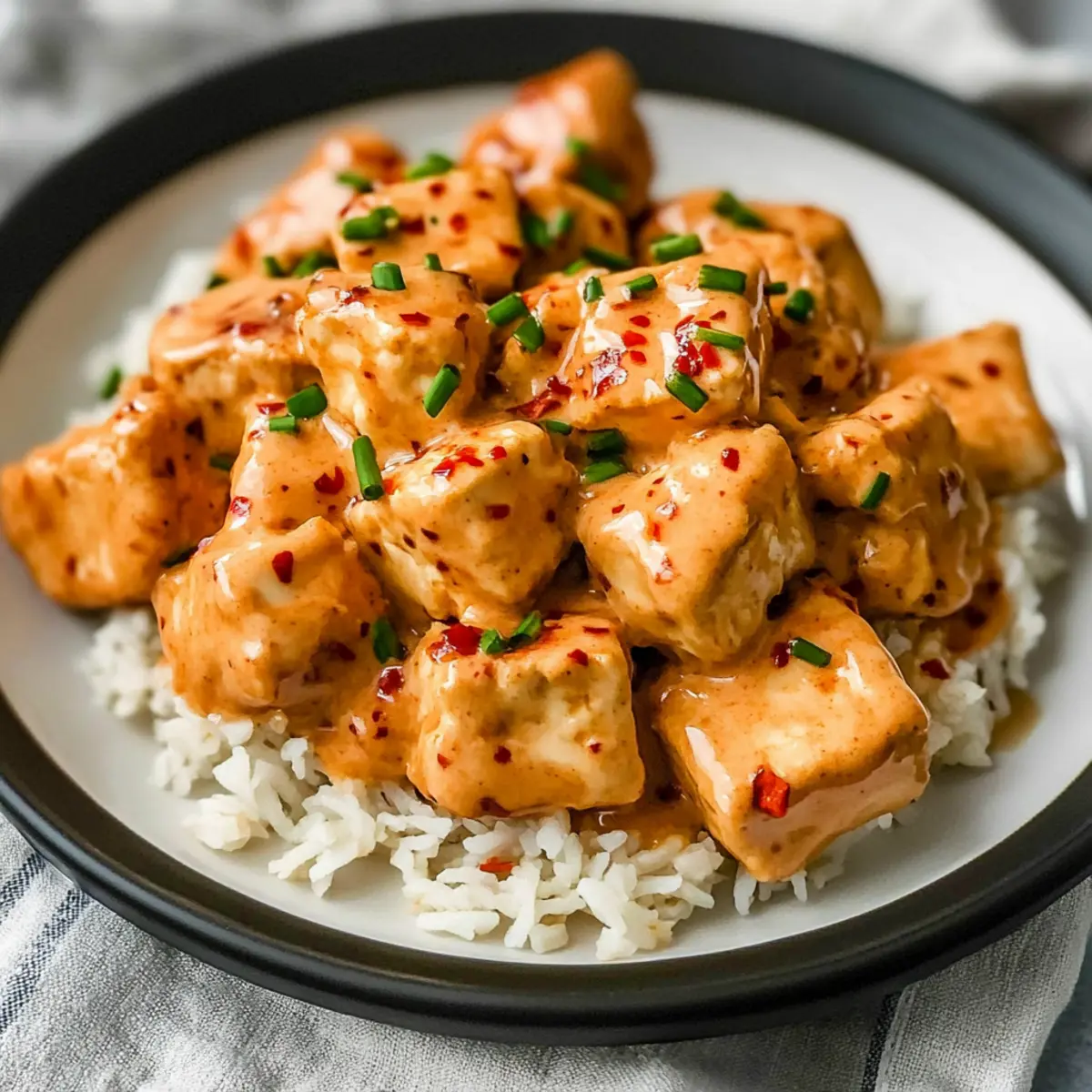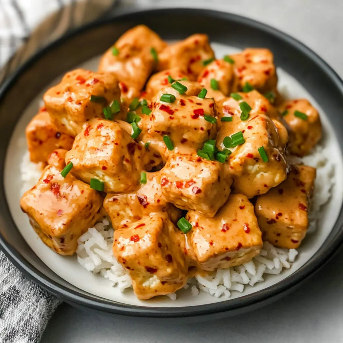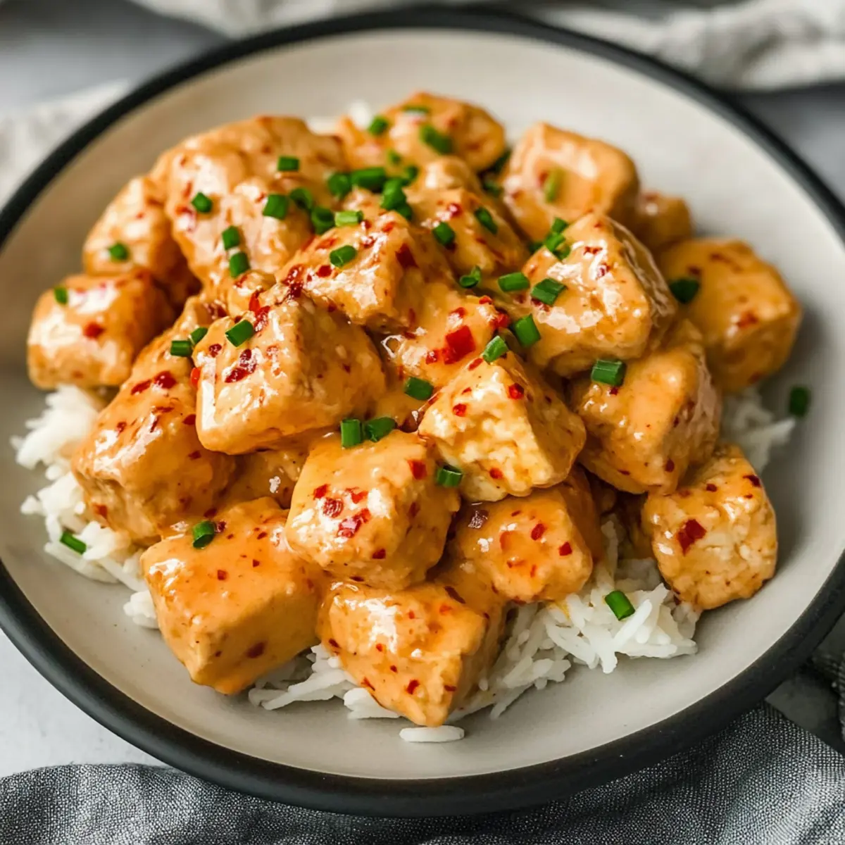 Jump to Recipe Print RecipeAs I stood in my kitchen, the irresistible aroma of sizzling tofu enveloped me, transporting me to a vibrant street market bustling with flavor. My latest obsession? Crispy Bang Bang Tofu with Sweet and Spicy Sauce! This dish is not just a meal; it’s a delightful culinary adventure packed with zesty notes and a satisfying crunch. With just 8 simple ingredients, it’s a breeze to prepare, making it perfect for those busy weeknights or when you’re hosting friends. Plus, it’s entirely plant-based, so everyone can enjoy this crispy masterpiece that proves vegan food can be both indulgent and healthy. Want to discover how to elevate your cooking with this easy recipe? Let’s dive in! Why is Bang Bang Tofu a Must-Try? Simplicity: You’ll love how effortless this recipe is with just 8 ingredients, making it perfect for both novice cooks and seasoned chefs. Crispy Perfection: The extra-firm tofu achieves an irresistible crunchy exterior that perfectly contrasts the creamy, zesty sauce. Versatile Dish: Serve it over rice, quinoa, or salads for a delightful twist on your favorite meals. Try pairing it with Coconut Cilantro Rice for an exotic flair! Crowd-Pleaser: Whether it’s a weeknight dinner or a gathering with friends, Bang Bang Tofu impresses and satisfies every palate. Flavor Explosion: The bold, sweet, and spicy sauce will leave your taste buds dancing with delight, making this vegan dish feel like a restaurant-quality experience at home! Bang Bang Tofu Ingredients For the Tofu • Extra-Firm Tofu – Use extra-firm tofu for best results; avoid softer varieties as they won’t crisp up well. • Cornstarch – This coating agent helps create a crispy exterior; arrowroot starch can be substituted if needed. • Panko Breadcrumbs – Adds that delightful crunch; you can use regular breadcrumbs if panko is unavailable, but the texture may vary. • Garlic Powder – Infuses flavor and aroma; adjust quantity to taste, or opt for fresh garlic for a stronger kick. For the Bang Bang Sauce • Vegan Mayonnaise – A creamy base for the sauce; regular mayonnaise can be used if you’re not concerned about vegan options. • Sriracha – Delivers heat and tanginess; sweet chili sauce can be a milder alternative. • White Sugar – Balances the spiciness of the dish; you can reduce or omit based on your sweetness preference. • Salt – Enhances the overall flavors; feel free to substitute with sea salt or table salt as needed. Step‑by‑Step Instructions for Bang Bang Tofu Step 1: Press Tofu Remove the extra-firm tofu from its packaging and drain it well. Wrap the tofu in clean towels or paper towels, then place a heavy object on top, such as a cast iron skillet, for 5 minutes. This helps eliminate excess moisture, ensuring your Bang Bang Tofu will become perfectly crispy. Step 2: Cube Tofu Once pressed, carefully unwrap the tofu and slice it into approximately 1-inch cubes, aiming for about 32 pieces in total. Use a sharp knife for clean cuts, ensuring each piece is uniform to cook evenly. Set the cubed tofu aside, ready for coating. Step 3: Preheat Oven Preheat your oven to 400ºF (200ºC) so it’s hot and ready for baking. This temperature is ideal for achieving that golden, crispy exterior on your Bang Bang Tofu. While the oven heats up, you can prepare your coating mixture. Step 4: Prepare Coating In a mixing bowl, combine cornstarch, panko breadcrumbs, and garlic powder. Stir well to ensure the dry ingredients are evenly mixed. This coating will give your Bang Bang Tofu its desirable crunchy texture. Step 5: Coat Tofu Add the cubed tofu to the bowl with the coating mixture. Gently toss the cubes until they are evenly coated on all sides. Be careful not to break the tofu pieces. Each piece should be generously coated to maximize that crispy texture. Step 6: Bake Carefully spread the coated tofu in a single layer on a parchment-lined baking sheet. Place it in the oven and bake for 40 minutes, flipping the tofu halfway through. It should be golden brown and crispy when finished, making it irresistibly delicious. Step 7: Make Bang Bang Sauce While the tofu is baking, whisk together vegan mayonnaise, Sriracha, sugar, and salt in a separate bowl. If you prefer a thinner consistency, add a little water until you reach the desired texture. This sauce is what gives Bang Bang Tofu its signature flavor. Step 8: Toss Tofu in Sauce Once the tofu is thoroughly baked, remove it from the oven and transfer it to the bowl with your Bang Bang sauce. Using a rubber spatula, gently fold the tofu into the sauce until all pieces are well coated, creating that creamy, spicy goodness. Step 9: Serve Plate the Bang Bang Tofu over your choice of rice or enjoy it on its own as a snack. For an extra touch, garnish with red pepper flakes and freshly chopped chives or scallions for a burst of color and flavor. Enjoy this delightful dish! Bang Bang Tofu Variations & Substitutions Feel free to tweak this recipe to suit your taste preferences and dietary needs—your kitchen is your creative playground! Gluten-Free: Use gluten-free panko breadcrumbs or crushed rice crackers in place of regular panko for a crunchy coating. Spicy Heat: If you love a kick, add fresh chopped jalapeños or a sprinkle of cayenne pepper to the sauce for extra heat. You could also try using the spicy version of Bang Bang Salmon that has a fiery twist! Herb-Infused: Mix in fresh herbs like cilantro or basil into the sauce for a fresh pop of flavor. It brightens up each bite and pairs beautifully with the crispy tofu. Nutty Twist: Drizzle with tahini or a sprinkle of sesame seeds after tossing with the sauce for a nutty touch and additional texture. Vegetable Additions: Toss in colorful vegetables like carrots or zucchini on the baking sheet for a nutritious boost. Their flavors meld nicely with the tofu and sauce. Sweet Substitute: For a less sweet sauce, reduce the sugar or replace it with maple syrup for a lov