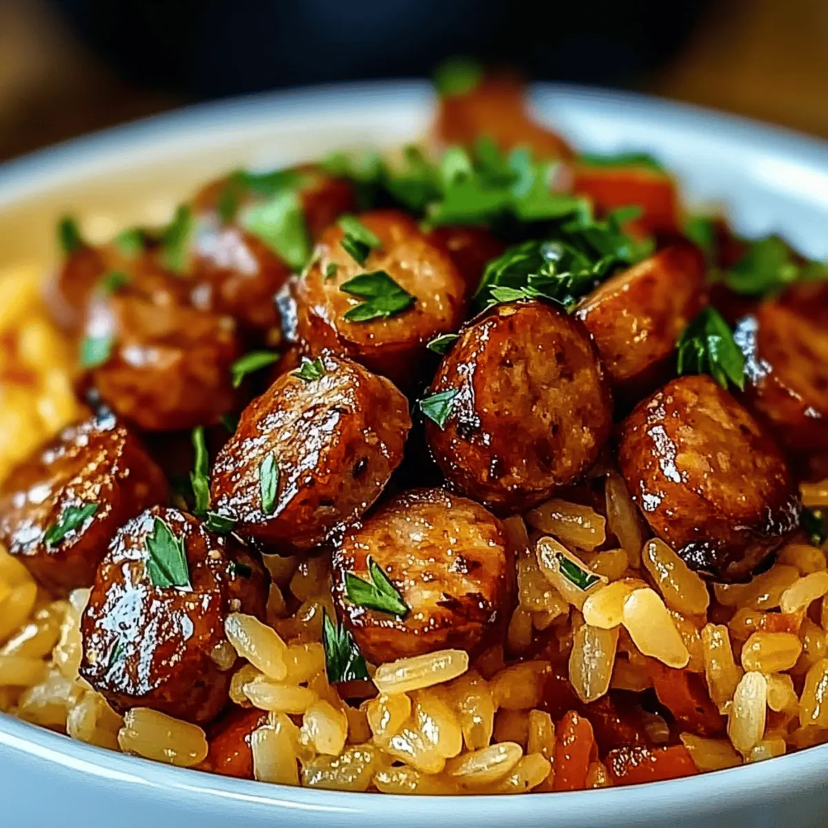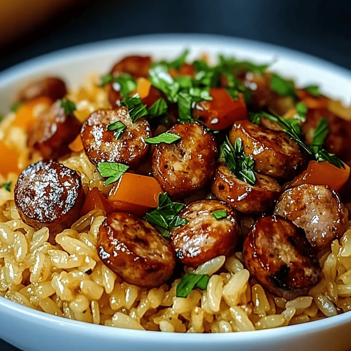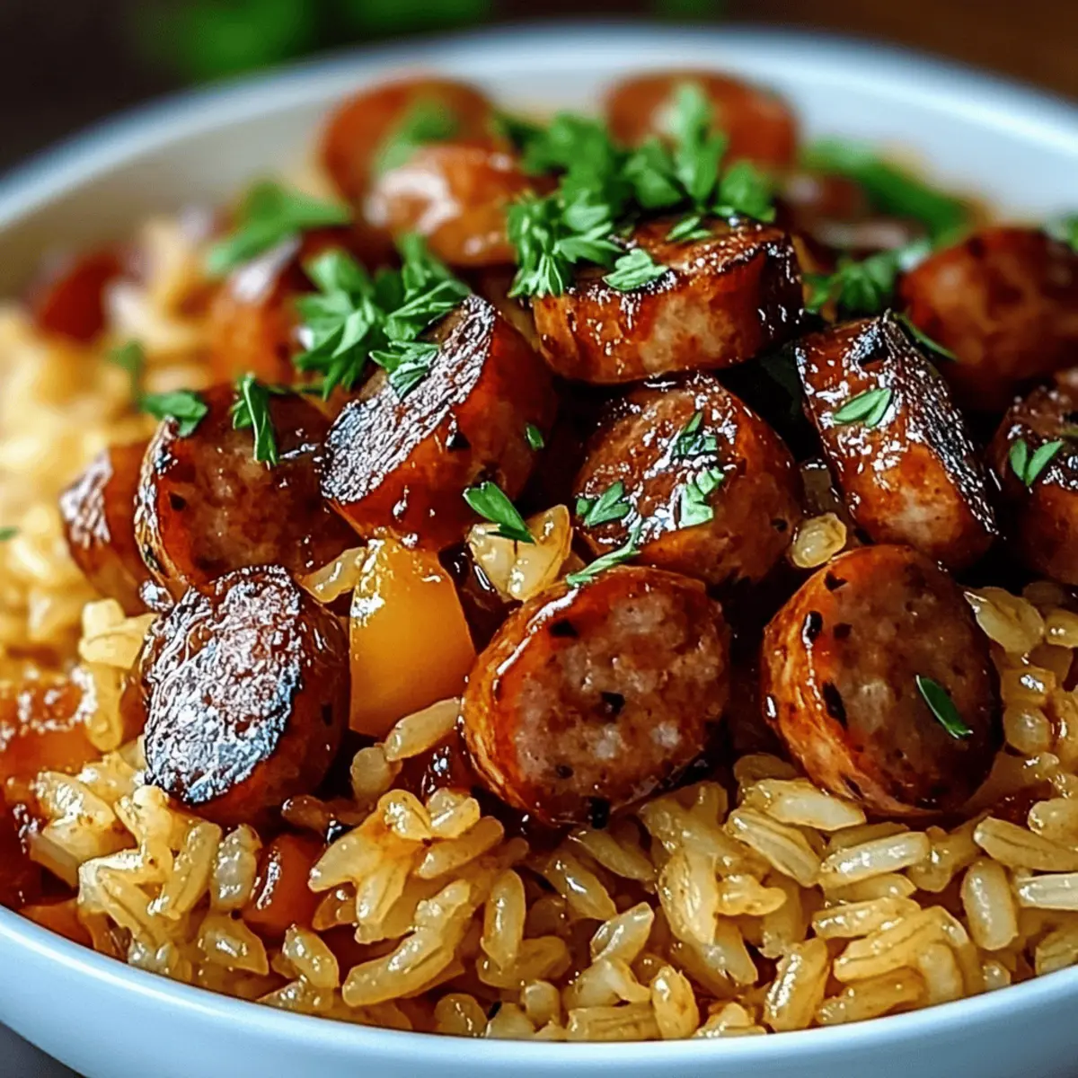 Jump to Recipe Print RecipeThere’s something incredibly satisfying about a warm, hearty dish that brings the family together, and BBQ Sausage Rice does just that. This one-pot meal is a true lifesaver for those busy weeknights when you crave comfort without spending hours in the kitchen. With smoky sausage and perfectly cooked rice soaking up all the delicious barbecue flavors, it’s an adaptable dish that can easily cater to everyone’s tastes—whether you like it spicy, cheesy, or even plant-based. Plus, it’s a fantastic way to introduce kids to the joys of homemade cooking, creating moments that linger at the dinner table. Are you ready to dive into this flavorful culinary adventure? Let’s get cooking! Why is BBQ Sausage Rice Perfect? Comforting Flavors: BBQ Sausage Rice merges smoky sausage flavors with tender rice, offering a warm hug in bowl form. One-Pot Wonder: This recipe is all about simplicity—minimal cleanup and quick prep make it ideal for busy weeknights. Versatile Options: Spice it up with cayenne, throw in some cheese, or make it vegetarian with plant-based sausage— the possibilities are endless! Family-Friendly: Kids love this dish, making it a perfect way to introduce them to home cooking. Whether you’re managing a hectic schedule or just looking for new dinner ideas, BBQ Sausage Rice is sure to please everyone at the table! Pair with some steamed broccoli or a fresh salad for a balanced meal. BBQ Sausage Rice Ingredients For the Base Olive Oil – Adds healthy fats and helps sauté the vegetables; can substitute with vegetable oil for a different flavor. Onion – Provides sweetness and umami; use yellow or sweet onion for milder flavors. Garlic – Essential for aromatics, enhancing overall flavor; fresh garlic is preferred, but garlic powder can work in a pinch. Red Bell Pepper – Offers sweetness and vibrant color; can substitute with yellow or orange bell peppers. Green Bell Pepper – Adds a slightly bitter contrast to the sweetness; any color bell pepper can work. Smoked Sausage – Main protein source that adds smokiness; Andouille or Kielbasa is recommended, or use plant-based sausage for variations. Diced Tomatoes – Contributes acidity and moisture; can substitute with fresh tomatoes if preferred. Tomato Sauce – Enhances richness; substitute with canned crushed tomatoes for a chunkier texture. Long-Grain Rice – Absorbs flavors beautifully and acts as the dish’s base; ensure it’s rinsed well before cooking. Chicken Broth – Adds depth of flavor; vegetable broth can be used for a vegetarian option. For the Seasoning Smoked Paprika – Infuses a deep smoky flavor; sweet paprika can be an alternative. Dried Thyme – Brings earthiness; Italian seasoning can serve as a substitute. Cayenne Pepper (optional) – Adds heat; can be omitted if desired. Salt and Black Pepper – Essential seasonings to enhance overall flavor; adjust to taste. For Garnishing Fresh Parsley (optional) – Adds a fresh touch when garnishing; can substitute with green onions for a sharper flavor. Hot Sauce (optional) – Provides extra spice when serving; perfect for those who like a kick! BBQ Sausage Rice is not just a meal; it’s a delightful celebration of flavors that brings everyone together. Step‑by‑Step Instructions for BBQ Sausage Rice Step 1: Sauté Aromatics In a large skillet, heat 2 tablespoons of olive oil over medium heat. Add 1 chopped onion and cook for 5-7 minutes, stirring occasionally, until softened and translucent. To this, add 3 minced garlic cloves and stir for an additional minute until fragrant. Incorporate 1 chopped red bell pepper and 1 chopped green bell pepper, cooking them for about 5-7 minutes until they are tender yet still vibrant. Step 2: Cook Sausage Next, add 12 ounces of sliced smoked sausage to the skillet, browning them for about 5-7 minutes. As the sausage sizzles and develops a golden crust, stir in 1 can (15 ounces) of undrained diced tomatoes and 1 cup of tomato sauce. Allow this mixture to simmer for approximately 10 minutes, stirring occasionally, so the flavors meld beautifully into the BBQ Sausage Rice. Step 3: Add Rice and Broth Now, it’s time to bring in the main component. Stir in 1 cup of rinsed long-grain rice, ensuring it’s well combined with the sausage mixture. Pour in 2 cups of chicken broth, then season with 1 teaspoon of smoked paprika, 1 teaspoon of dried thyme, and salt and black pepper to taste. Give it a gentle stir to evenly distribute all the flavors. Step 4: Simmer Bring the mixture to a boiling point, then immediately cover it with a tight-fitting lid. Reduce the heat to low and let it simmer for 20-25 minutes, without lifting the lid during cooking. You’ll know it’s ready when the rice is tender and has absorbed all the liquid, puffing up beautifully as part of the BBQ Sausage Rice. Step 5: Rest and Fluff Once the cooking time is up, remove the skillet from heat but keep it covered for an additional 5-10 minutes. This resting period allows the rice to finish cooking and absorb any remaining moisture. After resting, use a fork to gently fluff the rice, mixing in the sausage and veggies evenly for a perfect BBQ Sausage Rice texture. Step 6: Serve To serve, optionally garnish your BBQ Sausage Rice with freshly chopped parsley for a burst of color and flavor. For those who enjoy some extra heat, provide hot sauce on the side. Spoon the hearty mixture into bowls while it’s still hot and enjoy this comforting dish that the whole family will love! How to Store and Freeze BBQ Sausage Rice Fridge: Store leftover BBQ Sausage Rice in an airtight container for up to 3-4 days. Reheat in the microwave or on the stove, adding a splash of broth or water to help revive the moisture. Freezer: For longer storage, freeze BBQ Sausage Rice in portions in freezer-safe containers for up to 3 months. Thaw overnight in the fridge before reheating. Reheating: When reheating, ensure the rice is heated through to 