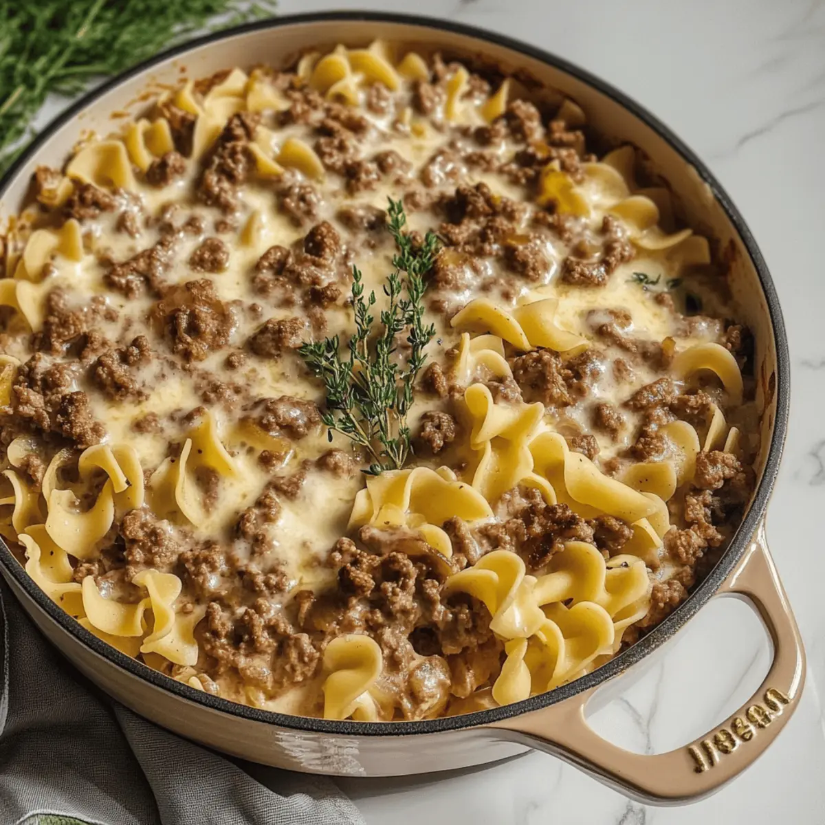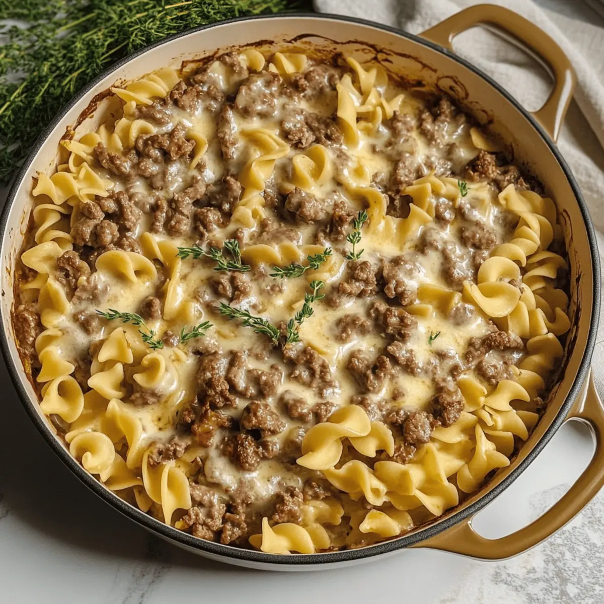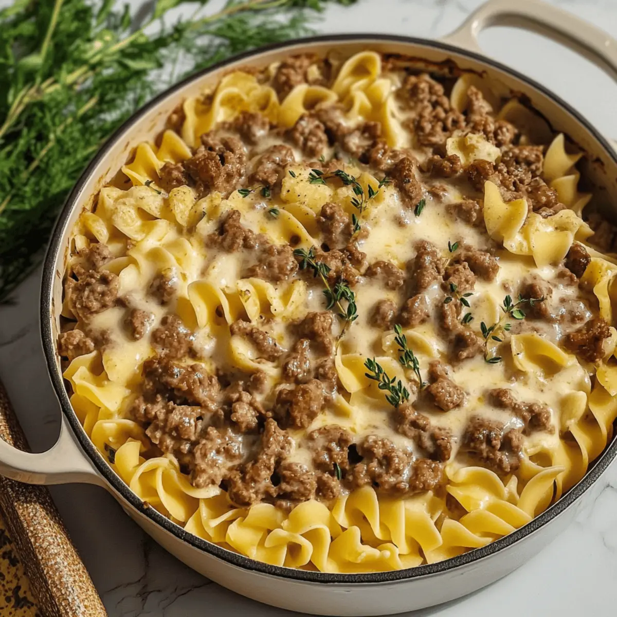 Jump to Recipe Print RecipeAs I stood in the kitchen the other evening, the aroma of sizzling ground beef and garlic wafted through the air, wrapping me in warmth and nostalgia. When I’m short on time but still want a hearty meal that feels like a hug in a dish, there’s nothing more comforting than this Beef Stroganoff Casserole Bake. It’s the perfect blend of tender beef, creamy sauce, and cozy egg noodles, making it an ideal choice for those busy weeknights. Not only is it easy to whip up, but it’s also a crowd-pleaser that the whole family will adore. Imagine cozying up with a dish that delivers satisfaction with every warm bite—sounds delightful, doesn’t it? Are you ready to bring this comforting classic to your dinner table? Why is Beef Stroganoff Casserole a Must-Try? Comforting Warmth: This hearty dish wraps you in a delicious embrace, perfect for chilly nights or family gatherings. Effortless Preparation: With minimal steps and simple ingredients, you can have it ready in no time, making it ideal for busy weeknights. Flavorful Harmony: The rich combination of tender beef, creamy sauce, and perfectly cooked noodles ensures every bite is bursting with deliciousness. Crowd-Pleasing: Family and friends will rave about this casserole, making it a go-to for potlucks or dinner parties. Versatile Options: Feel free to swap out proteins or sneak in veggies to cater to your dietary needs. Enjoy it alongside a refreshing salad like a Creamy Vegetable Casserole Cozy for a balanced meal. Get ready to fall in love with this nostalgic dish—your taste buds will thank you! Beef Stroganoff Casserole Bake Ingredients For the Casserole • Ground Beef – Provides the main protein and heartiness; you can substitute with ground turkey for a leaner alternative. • Cream of Mushroom Soup – Adds creaminess and depth of flavor; try homemade or gluten-free versions if preferred. • Egg Noodles – Form the base of the casserole; feel free to use gluten-free pasta if needed. • Onion – Enhances flavor with its sweetness; leeks can serve as a milder substitute. • Garlic – Provides aromatic depth; minced garlic or garlic powder works well as alternatives. • Beef Broth – Adds moisture and richness; vegetable broth can lighten the dish for a different flavor. • Sour Cream – For creaminess and a tangy kick; Greek yogurt or cottage cheese could be healthier substitutes. • Cheese (optional) – Adds extra creaminess and flavor; consider sprinkling cheddar or mozzarella on top. Get ready to create a cozy dinner with this Beef Stroganoff Casserole Bake that will surely warm the hearts of everyone at your table! Step‑by‑Step Instructions for Beef Stroganoff Casserole Bake Step 1: Preheat the Oven Begin by preheating your oven to 350°F (175°C). This ensures the perfect baking environment for your Beef Stroganoff Casserole Bake, achieving a golden and bubbly top. While the oven warms, gather all your ingredients and prepare your baking dish by lightly greasing it with cooking spray or butter. Step 2: Cook the Ground Beef In a large skillet over medium heat, add one pound of ground beef. Sauté it until fully browned, which should take about 6-8 minutes. Use a wooden spoon to break it apart as it cooks, ensuring it’s cooked through with no pink remaining. Once browned, drain any excess fat from the skillet to keep the dish light and flavorful. Step 3: Sauté Onions and Garlic To the skillet with the cooked beef, add one chopped onion and 2 minced garlic cloves. Stir them together and let cook for about 3-4 minutes or until the onions become translucent and fragrant. This step infuses the Beef Stroganoff Casserole Bake with aromatic flavors and builds the base of the dish. Step 4: Mix in the Creamy Ingredients Now, stir in a can of cream of mushroom soup, one cup of beef broth, and one cup of sour cream into the skillet. Combine these ingredients well until you have a smooth and creamy mixture. This rich sauce is what makes your Beef Stroganoff Casserole Bake so deliciously comforting. Step 5: Incorporate the Egg Noodles Incorporate your cooked egg noodles into the mixture, folding them gently to ensure each noodle is evenly coated with the creamy sauce. This should take about 2 minutes—be careful not to overmix, as we want to keep the texture pleasant. The noodles will bring a hearty element to your casserole. Step 6: Transfer to Casserole Dish Pour the beef and noodle mixture into your prepared greased casserole dish, spreading it out evenly. Use a spatula to smooth the top and make sure everything is well distributed. This allows for even cooking and helps the flavors meld during baking, creating a beautifully cohesive Beef Stroganoff Casserole Bake. Step 7: Cheese Topping If you decided to use cheese, sprinkle a generous amount of shredded cheese on top of the casserole. Cheddar or mozzarella work wonderfully here, adding a layer of creamy richness. This melty topping will create a delightful contrast against the creamy filling and enhance the overall comfort food experience. Step 8: Bake the Casserole Place the casserole dish in the preheated oven and bake for 25-30 minutes. You’ll know it’s ready when the top is golden and bubbly, and the edges begin to bubble slightly. This crucial step allows the flavors to blend beautifully and gives your Beef Stroganoff Casserole Bake that homemade touch of warmth. Step 9: Cool and Serve Once baked, remove the casserole from the oven and allow it to cool for about 5-10 minutes. This will help it set slightly, making it easier to serve. Scoop generous portions onto plates and pair it with a light green salad or your favorite steamed vegetables for a balanced meal that everyone will love. How to Store and Freeze Beef Stroganoff Casserole Bake Fridge: Store the casserole in an airtight container for up to 3 days. Ensure it cools to room temperature before sealing to prevent condensation and sogginess. Freezer: If you want to enjoy 