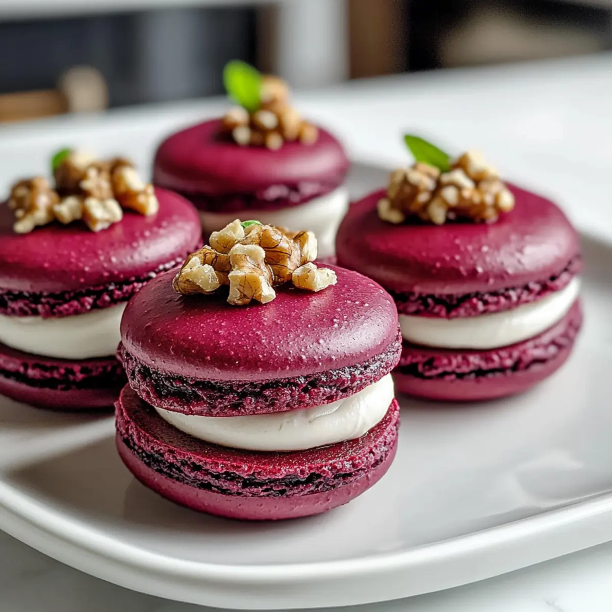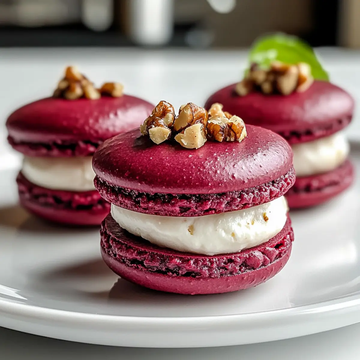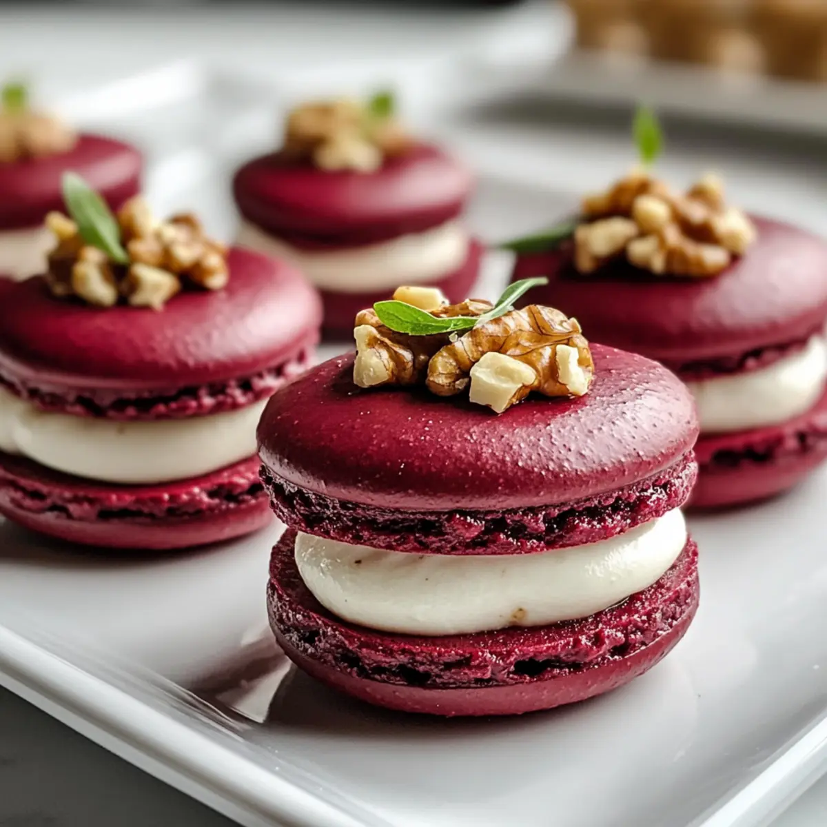 Jump to Recipe Print RecipeAs I stood in my kitchen, the rich, earthy aroma of roasted beets wafting through the air, inspiration struck. The result? These Elegant Savory Beet Macarons with Goat Cheese and Walnut Crunch—an extraordinary twist on a French classic. Imagine vibrant jewel-toned shells that break open to reveal a creamy filling, perfectly melding the tanginess of goat cheese with a delightful crunch from toasted walnuts. The best part? These little beauties are not only vegetarian but also gluten-free, making them an elegant option for any gathering. Whether you’re hosting a cocktail party or simply want to impress your loved ones, these macarons are a guaranteed crowd-pleaser. Is there a more irresistible way to elevate your appetizer game? Let’s dive into the intricacies of creating these savory masterpieces! Why choose Beet Macarons with Goat Cheese? Unique Flavor Profile: These macarons perfectly combine the earthy taste of beets with the tangy creaminess of goat cheese, creating an appetizer that surprises and delights. Gluten-Free Delight: Made with almond flour, these macarons are not only vegetarian but also gluten-free, making them suitable for a variety of diets. Impressive Presentation: With their vibrant, jewel-toned shells, these macarons offer an aesthetic appeal that will make any event feel upscale and special. Versatile Variations: Feel free to experiment with different cheese combinations, like feta or ricotta, to personalize your filling. You could even add herbs for seasonal flair, ensuring there’s always something new to try. Perfect for Any Occasion: Whether it’s a fancy cocktail hour or a casual get-together, these macarons make an elegant choice that appeals to all tastes. Pair them with your favorite sparkling wine for a truly delicious experience! Not quite sure you want macarons yet? You can always whip up something comforting like Baked Mac Cheese or the hearty Chili Cheese Dog if you’re in the mood for something different. Beet Macarons with Goat Cheese Ingredients • Get ready to create a dazzling appetizer! For the Macaron Shells Almond Flour – Provides structure and a nutty flavor. Substitution: Can be replaced with hazelnut flour for a different taste. Powdered Sugar – Adds sweetness and helps achieve a smooth macaron shell. No substitutes recommended for texture. Beetroot Powder – Used for vibrant color and slight earthiness. Substitution: Freeze-dried beet finely ground for color without excess moisture. Aged Egg Whites – Essential for creating stiff peaks in meringue. Whisk until slightly frothy and aged for best results. Granulated Sugar – Stabilizes the meringue and provides sweetness. No substitutes. Cream of Tartar – Helps stabilize egg whites. Optional; lemon juice can be used as a substitute. Salt – Enhances the flavors. Use a pinch; can be omitted if sodium-sensitive. For the Goat Cheese Filling Fresh Goat Cheese – The base for the filling, providing creaminess and tartness. Cream cheese can be added for extra richness. Heavy Cream – Adjusts the texture of the filling. Skip or use less if a denser filling is desired. Toasted Walnuts – Add crunch and depth to the filling. Substitution: Pecans or other nuts can be used. For Garnish Extra Walnut Crumbs – For garnish to enhance presentation. Optional but recommended for visual appeal. Micro Herbs or Beet Powder – Adds a decorative touch. Optional for final styling. With these ingredients in hand, you’re well on your way to impressing your guests with these show-stopping Beet Macarons with Goat Cheese & Walnut Crunch! Happy cooking! Step‑by‑Step Instructions for Beet Macarons with Goat Cheese & Walnut Crunch Step 1: Prepare the Dry Ingredients Start by sifting together almond flour, powdered sugar, and beetroot powder into a bowl. This process ensures the dry ingredients are well combined and free of lumps, resulting in smooth macaron shells. Set the mixture aside while you work on the meringue, which is crucial for achieving that light, airy texture characteristic of Beet Macarons with Goat Cheese & Walnut Crunch. Step 2: Make the Meringue In a clean mixing bowl, begin whipping aged egg whites with cream of tartar and a pinch of salt. Continue whisking until the mixture becomes foamy, then gradually add granulated sugar. Whip until the egg whites form stiff peaks, appearing glossy and firm. This stable meringue base is essential for your macaron shells, creating a perfect contrast against the creamy goat cheese filling. Step 3: Combine Mixtures Gently fold the sifted dry ingredients into the whipped meringue using a spatula. Use a figure-eight motion, taking care not to deflate the airy mixture. Keep mixing until you achieve a smooth batter that flows like lava. This step is critical to ensure your Beet Macarons hold their shape and develop the right texture once baked. Step 4: Pipe the Shells Prepare a piping bag fitted with a round tip and fill it with the macaron batter. On parchment-lined baking trays, pipe 3 cm rounds, leaving enough space between each to allow for spreading. After piping, tap the trays gently on a countertop to release any air bubbles, which helps in achieving smooth, even shells for your savory beet macarons. Step 5: Rest the Shells Let the piped macaron shells sit at room temperature for 30-45 minutes, or until a skin forms on the surface, which will help them rise and maintain structure while baking. You’ll know they’re ready when a gentle touch doesn’t leave a fingerprint. This crucial step is key to achieving the perfect texture for your Beet Macarons with Goat Cheese & Walnut Crunch. Step 6: Bake Preheat your oven to 150°C (300°F) while the shells rest. Once ready, bake the macarons for 14-16 minutes, rotating the trays halfway through to ensure even baking. Watch for slight puffing and a dry surface that lifts easily from the parchment. Once baked, allow the shells to cool completely before attempting to rem