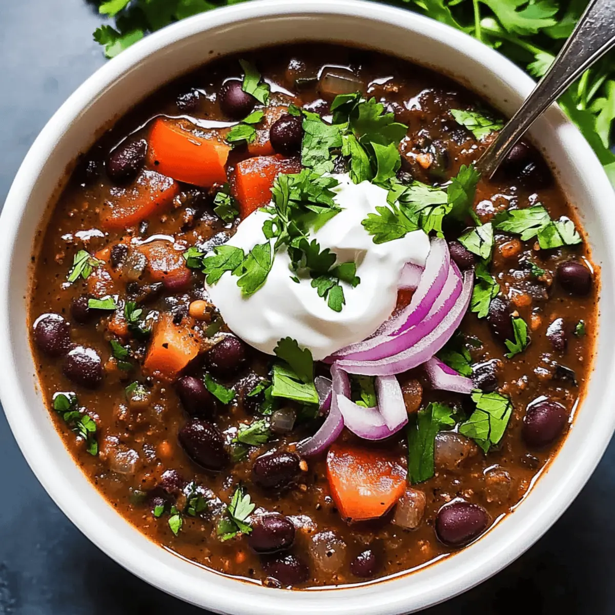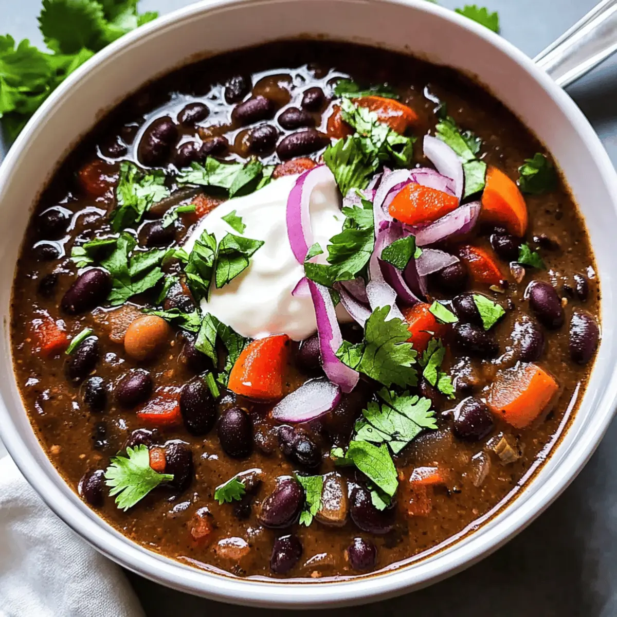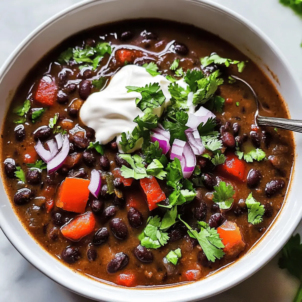 Jump to Recipe Print RecipeAs I stood by the kitchen counter, the heavenly aroma of sautéing garlic and spices enveloped me, instantly lifting my spirits. This Smoky Black Bean Soup has become my go-to recipe for busy weeknights, delivering both warmth and comfort in a single bowl. Packed with protein and vibrant veggies, it’s an easy, hearty meal that can be on your table in no time. Whether you’re eager to impress with a nutritious dish or simply need to satisfy your craving for something cozy, this soup also offers a delightful vegetarian option if you skip the sausage. Curious how a few simple ingredients can transform into such a fulfilling delight? Let’s dive into the details! Why is Black Bean Soup a Must-Try? Quick and Easy: This recipe comes together in just 30 minutes, making it perfect for those busy weeknights. Hearty Comfort: The blend of black beans and spices creates a warming dish that will leave you feeling satisfied. Versatile Options: Whether you’re in the mood for a vegetarian delight or want to add smoky sausage, this soup adapts to your cravings effortlessly. Nutritious Benefits: With 23g of protein and plenty of fiber, this soup is not only delicious but also nourishing. Perfect Pairing: Enjoy it alongside some warm homemade cornbread or rice for a complete meal that brings everyone to the table. Crowd-Pleasing Flavor: The rich, smoky taste ensures this dish is a hit, whether it’s family dinner or a gathering with friends. Black Bean Soup Ingredients This hearty dish is loaded with flavor and goodness! For the Soup Base • Olive oil – Adds richness and depth; can substitute with avocado oil for a neutral flavor. • Red onion – Provides sweetness and depth of flavor; yellow onion can work as a substitute. • Garlic – Infuses aromatic flavor; fresh garlic is recommended for the best results. • Bell peppers – Contributes texture and sweetness; any color works, but green is slightly more bitter. • Chicken stock – Forms the flavorful base of the soup; switch to vegetable stock for a vegetarian option. • Black beans – The star ingredient, packed with protein and texture; using canned beans saves time—just drain and rinse. For the Flavor Enhancers • Ground cumin – Adds warmth and earthiness to the soup. • Garlic powder – Boosts the garlic flavor for extra oomph. • Dried oregano – Imparts herbal notes that balance the richness. • Chili powder – Provides heat and depth; adjust according to your spice preference. • Kosher salt & freshly cracked black pepper – Essential for enhancing overall taste. For the Heartiness • Smoked sausage – Introduces smokiness and heartiness to each bowl; fully cooked sausage can be added without further cooking. This Black Bean Soup is not only quick and easy to prepare but also a delightful way to warm your soul! Step‑by‑Step Instructions for Smoky Black Bean Soup Step 1: Sauté Vegetables Heat 2 tablespoons of olive oil in a large pot over medium-high heat. Once hot, add 1 diced red onion and 1 chopped bell pepper, stirring frequently for about 4 minutes until they begin to soften. Next, stir in 2 minced garlic cloves, allowing them to cook for an additional 2-3 minutes until fragrant, filling your kitchen with delicious aromas. Step 2: Combine and Boil Pour in 4 cups of chicken stock along with 2 cans of drained and rinsed black beans. Add 1 teaspoon ground cumin, 1 teaspoon garlic powder, 1 teaspoon dried oregano, 1 tablespoon chili powder, and salt and pepper to taste. Stir well, bringing the mixture to a boil over high heat. Once boiling, reduce the heat to medium-low and let it simmer for 10-15 minutes until flavors meld beautifully. Step 3: Blend Soup Using an immersion blender, purée about one-third of the soup until smooth, ensuring a creamy texture while leaving some beans and veggies whole for heartiness. If you don’t have an immersion blender, carefully transfer the soup in batches to a standing blender. Once blended, return the luscious mixture back to the pot, enhancing the depth of the smoky black bean soup. Step 4: Add Sausage Slice 8 ounces of smoked sausage and stir it into the soup. Heat on medium for an additional 5 minutes, allowing the sausage to warm through and infuse its rich, smoky flavor into the black bean soup. Ensure the soup is bubbling gently as the components meld together, creating a comforting and hearty dish. Step 5: Serve Ladle the smoky black bean soup into bowls, and consider garnishing with fresh cilantro, a dollop of sour cream, and a sprinkle of diced red onion for added color and flavor. This step not only elevates the presentation but also enhances the overall taste, providing a delightful finish to your comforting meal. What to Serve with Smoky Black Bean Soup Dive into a world of flavors as you create a delightful meal around this smoky black bean soup, packed with warmth and comfort. Warm Cornbread: Soft and buttery, cornbread complements the soup’s smokiness while adding a touch of sweetness to each bite. It’s perfect for soaking up every drop of the hearty broth. White Rice: Fluffy and mild, rice acts as a neutral base that balances the rich, spicy notes of the soup. Consider mixing in a few lime zest or cilantro for a fresh twist! Guacamole: Creamy and zesty, this dip adds a refreshing layer to your meal, while the avocado’s richness pairs perfectly with the bold flavors in the soup. Serve with crispy tortilla chips for that satisfying crunch. Crispy Tortilla Chips: Perfect for dipping or adding a crunchy texture, these chips bring a delightful contrast to the soup’s creamy consistency. Enjoy them alongside or crumbled on top for extra flair! Mixed Green Salad: A light salad with crisp veggies and a tangy vinaigrette can cleanse the palate, offering a refreshing contrast to the hearty soup. Include slices of avocado or citrus for an added burst of flavor. Lime Wedges: A simple but effective addition, squeezing lime over the