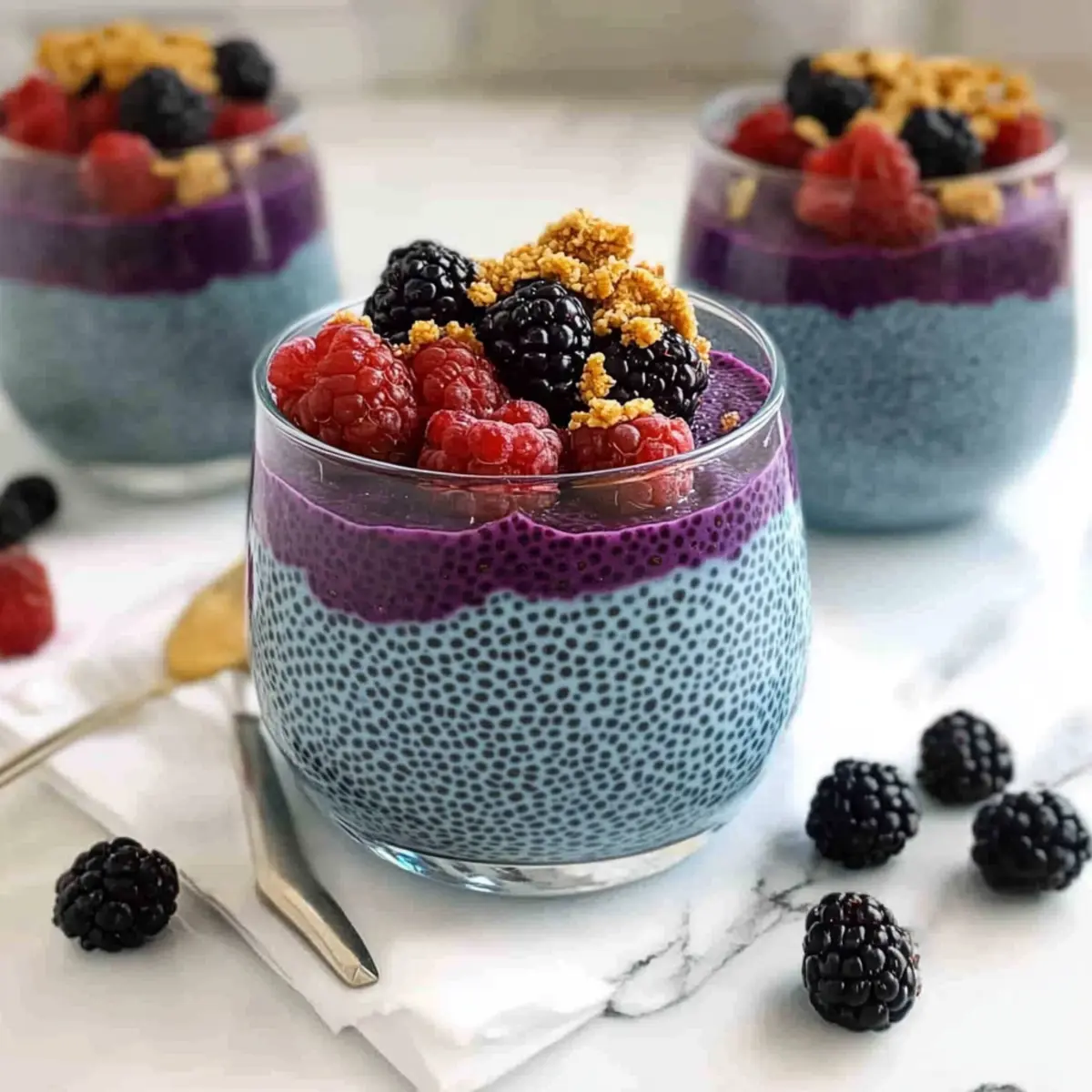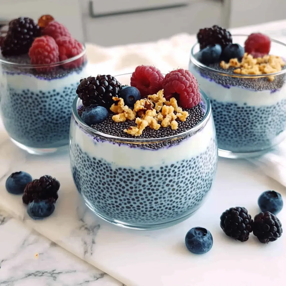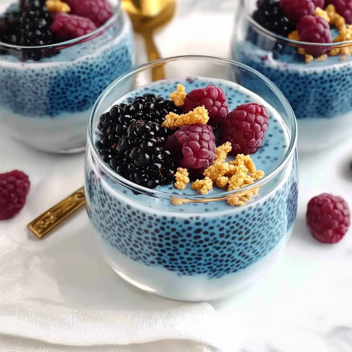 Jump to Recipe Print RecipeHave you ever stumbled upon a dish that makes your heart skip a beat? Enter the enchanting world of Blue Chia Pudding—a vibrant, nutritious delight that can transform any meal into a celebration. Made from wholesome chia seeds and infused with either butterfly pea flower powder or blue spirulina, this beautiful pudding isn’t just a feast for the eyes; it’s packed with antioxidants that your body will love. It’s perfect for meal prep, whether as a quick breakfast, a midday snack, or a fancy dessert. Plus, it’s vegan and gluten-free for those mindful of their dietary choices! Who knew that creating something so stunningly blue could be so simple? Ready to dive into this colorful treat? Let’s uncover the magic behind every creamy spoonful! Why is Blue Chia Pudding a Must-Try? Vibrant, Eye-Catching Color: This pudding’s stunning blue hue, powered by butterfly pea flower or blue spirulina, makes it a showstopper at any table. Nutritious and Wholesome: Packed with omega-3s, protein, and fiber from chia seeds, it’s a guilt-free indulgence. Versatile Treat: Enjoy it as breakfast, a snack, or dessert – it adapts to any mealtime! Quick and Easy: Simply mix, chill, and savor; perfect for busy individuals! Meal Prep-Friendly: Make it ahead and keep it in your fridge for a week, just like those delicious Blueberry Cinnamon Rolls! Customizable Flavors: Add toppings like fruits or nuts, or layer with yogurt for an even more delightful experience. You’ll love how fun and tasty healthy eating can be! Blue Chia Pudding Ingredients For the Pudding • Chia Seeds – These tiny powerhouses provide the pudding’s structure and creamy texture, brimming with omega-3s, protein, and fiber. • Butterfly Pea Flower Powder – This captivating blue ingredient adds vibrant color and a mild, slightly sweet flavor; swap it for blue spirulina if you desire a different taste and extra antioxidants. • Plant-Based Milk – Your base liquid for the pudding; oat milk is great, but any plant-based option works beautifully. • Maple Syrup – Adds delightful sweetness; feel free to adjust the amount or substitute with agave syrup or other plant-based sweeteners. • Vanilla Extract – Enhances the flavor profile, adding a warm, sweet aroma that perfectly complements the pudding. Optional Toppings • Fresh Fruits – Elevate your pudding with berries, bananas, or mango for a refreshing burst of flavor. • Nuts and Seeds – Sprinkle chopped nuts or seeds on top for an added crunch and nutritious boost. • Granola – Layer it with granola for a delightful texture contrast and an energy-packed addition. • Vegan Vanilla Cashew Yogurt – Layer this creamy yogurt for an indulgent parfait experience, enhancing both taste and visual appeal. This irresistible blue chia pudding is sure to be a hit! Enjoy each vibrant, nutritious spoonful as a perfect complement to your healthy eating journey. Step‑by‑Step Instructions for Blue Chia Pudding Step 1: Whisk Together Ingredients In a glass storage container, combine 1/4 cup of chia seeds, 1 tablespoon of butterfly pea flower powder (or blue spirulina), 1 cup of plant-based milk, 2 tablespoons of maple syrup, and 1 teaspoon of vanilla extract. Whisk the mixture thoroughly until all ingredients are well incorporated, ensuring there are no clumps of chia seeds. This vibrant blend will set the foundation for your delicious Blue Chia Pudding! Step 2: Rest and Whisk Again Allow the mixture to sit for about 10 minutes, which will give the chia seeds time to absorb the liquid. After this initial resting period, whisk again to break up any clumps that may have formed. You’ll notice the mixture beginning to thicken slightly as the chia seeds begin to gel, creating that delightful pudding-like consistency. Step 3: Chill in the Refrigerator Seal the container with a lid and place it in the refrigerator for at least 1 to 2 hours, allowing the pudding to set fully. During this time, the chia seeds will swell and absorb the liquid, transforming the mixture into a creamy and thick gel-like texture, perfect for your Blue Chia Pudding treat. Step 4: Adjust Consistency if Needed When you’re ready to serve, take the Blue Chia Pudding out of the refrigerator and give it a gentle stir. If you find it too thick for your liking, feel free to add a splash of additional plant-based milk to reach your desired consistency, mixing until smooth. This will ensure that your pudding stays creamy and enjoyable. Step 5: Serve and Enjoy Pour the Blue Chia Pudding into bowls or jars and, if desired, layer it with vegan vanilla cashew yogurt for a delightful parfait presentation. For an extra touch, top with your favorite toppings like fresh fruits, nuts, or granola. This vibrant and nutritious pudding is ready to brighten your day! What to Serve with Blue Chia Pudding Transform your vibrant blue chia pudding into a complete meal with these delightful pairings. Fresh Fruit Salad: Bright, juicy fruits enhance sweetness and provide contrasting textures, turning your pudding into a refreshing feast. A medley of berries and citrus can brighten your breakfast or snack time. Nutty Granola: Crunchy granola sprinkled on top gives a wonderful texture contrast, adding a satisfying crunch that complements the creamy pudding beautifully. It’s a match made in healthy heaven! Almond Butter Toast: Savory, nutty almond butter spread on whole grain toast adds more protein and healthy fats, making your meal heartier and truly satisfying. A drizzle of honey can enhance the toast’s natural sweetness. Coconut Yogurt Parfait: Layer blue chia pudding with creamy coconut yogurt for a decadent yet healthy parfait that tastes as good as it looks. A sprinkle of shredded coconut elevates the tropical flair! Matcha Green Tea: The earthy flavors of matcha serve as a calming and antioxidant-rich beverage that pairs beautifully with your pudding’s delightful sweetness. Sip and enjoy the