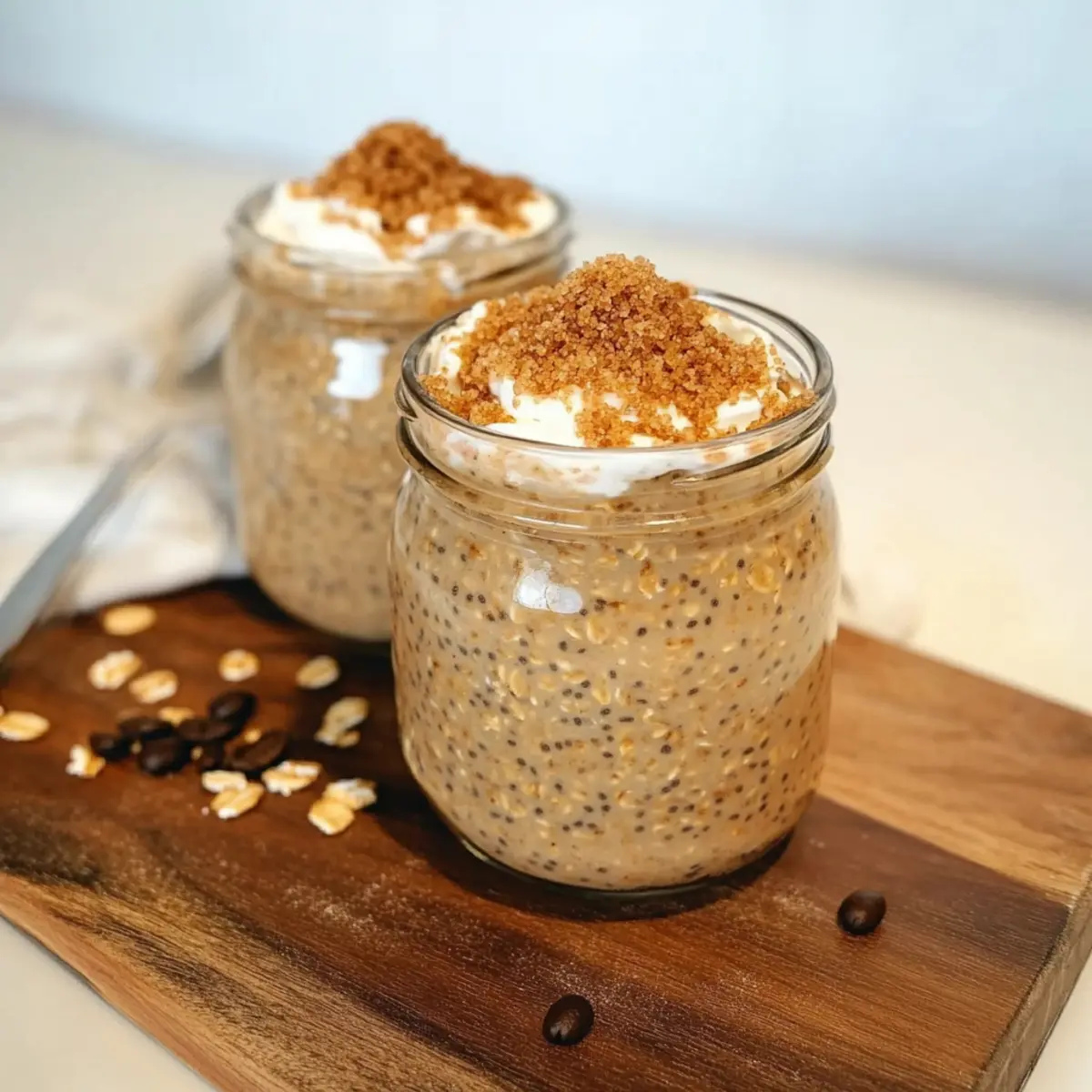 Jump to Recipe Print RecipeAs the sun peeks through my kitchen window, I can’t help but smile at the thought of starting my day with something truly special: Brown Sugar Shaken Espresso Overnight Oats. This delightful breakfast combines rich brown sugar and a cozy coffee kick, making my mornings a little less rushed and a lot more enjoyable. What I love most about these overnight oats is how effortless they are to prepare—just mix, chill, and savor a nourishing meal that fuels my busy days. Plus, with the goodness of Canadian ingredients like creamy Greek yogurt and hearty oats, I can indulge guilt-free. Are you ready to transform your mornings with a simple yet delicious breakfast that makes waking up a treat? Let’s dive into this recipe! Why Choose Brown Sugar Overnight Oats? Simplicity at Its Best: This recipe is a breeze to whip up—just combine, chill, and enjoy! Rich, Creamy Texture: The blend of Greek yogurt and oats creates a luxurious mouthfeel that you’ll look forward to each morning. Perfect Coffee Kick: The addition of espresso gives you that much-needed boost to kickstart your day. Nutritious and Wholesome: Packed with fiber and protein, these oats keep you satisfied and energized, perfect for busy mornings. Versatility at Play: Feel free to customize with your favorite toppings, whether it’s nuts, fruits, or additional sweeteners. Looking for other delicious variations? Try these Toffee Espresso Brownies for a sweet treat or indulge in some Fudgy Chocolate Brownies when you need a little chocolate fix! Brown Sugar Shaken Espresso Overnight Oats Ingredients For the Oats Mixture Brown Sugar – Adds sweetness and a rich flavor; feel free to substitute with coconut sugar for a lower glycemic option. Quick or Rolled Oats – Provides the base and texture; choose rolled oats for a chewier bite or quick oats for a softer mix. Chia Seeds – Contributes thickness and health benefits through added fiber; can be replaced with ground flaxseeds or omitted entirely. Pinch of Salt – Enhances flavor and balances the sweetness. For the Espresso Base Cold Brew Concentrate or Regular Espresso – Delivers a coffee kick; brewed coffee can work as a substitute if you don’t have espresso on hand. 100% Canadian Milk – Adds creaminess and richness; any type of milk can be replaced with plant-based options for dietary preferences. Canadian Greek Yogurt – Provides protein and creaminess; swap it for any available Greek yogurt or a dairy-free version for a vegan alternative. These Brown Sugar Shaken Espresso Overnight Oats are a delightful way to start your day, blending wholesome Canadian ingredients into a quick and nourishing breakfast! Step‑by‑Step Instructions for Brown Sugar Shaken Espresso Overnight Oats Step 1: Combine Dry Ingredients In a medium-sized meal prep container, mix together 1 cup of rolled oats, 2 tablespoons of brown sugar, 1 tablespoon of chia seeds, and a pinch of salt. Stir these dry ingredients well, ensuring that the brown sugar is evenly distributed. The oats should look fluffy and coated with the sugar as you prepare for the next step. Step 2: Add Liquid Ingredients Pour in 1 cup of cold brew espresso and 1 cup of 100% Canadian milk, followed by ½ cup of Canadian Greek yogurt. Gently stir the mixture until all ingredients are well combined and the oats are fully submerged in the liquid. You should see a creamy mixture forming, with the ingredients blending into a cohesive batter-like consistency. Step 3: Chill the Mixture Cover the container with a lid or plastic wrap and pop it into the refrigerator. Allow it to chill for at least 4 hours, or ideally overnight. This step lets the flavors meld beautifully, with the oats absorbing moisture and becoming tender, resulting in a creamy texture that’ll delight your taste buds with each bite. Step 4: Adjust Consistency Once your Brown Sugar Shaken Espresso Overnight Oats are ready, remove them from the fridge and give them a good stir. If they appear too thick for your liking, add a splash of Canadian milk and mix well until you reach your desired consistency. The oats should be creamy and slightly pourable, showcasing that coffee-infused goodness throughout. Step 5: Serve and Enjoy Spoon your delicious overnight oats into a bowl or glass and garnish with additional brown sugar and a dollop of whipped cream if desired. Serve chilled, enjoying the harmony between the rich flavors of brown sugar and espresso. This delightful breakfast is not only satisfying but also a nourishing way to jumpstart your morning. How to Store and Freeze Brown Sugar Shaken Espresso Overnight Oats Fridge: The oats can be stored in the refrigerator for up to 3 days, ensuring they remain fresh and ready for your busy mornings. Airtight Container: To maintain optimal flavor and texture, always store the overnight oats in an airtight container. This prevents them from absorbing odors from your fridge. Freezer: For longer storage, you can freeze portions of the oats for up to 2 months. Just make sure to thaw them overnight in the fridge before serving. Reheating: If preferred warm, microwave the oats for 30-60 seconds, stirring to ensure even heating; add a splash of Canadian milk to restore creaminess as needed. Expert Tips for Brown Sugar Shaken Espresso Overnight Oats Let It Sit: For maximum flavor, allow the oats to sit overnight. This ensures all ingredients meld beautifully, enhancing the overall taste. Mix Well: After adding liquids, stir vigorously to avoid clumps. This ensures a smooth, creamy consistency in your Brown Sugar Shaken Espresso Overnight Oats. Adjust Sweetness: Taste after chilling and add more brown sugar if desired. This allows for customization to your personal sweetness preference. Choose Oats Wisely: Rolled oats give a chewier texture, while quick oats offer a softer feel; select based on your texture preference for the perfect morning dish. Use Cold Brew When Possible: Cold brew coffee delivers a smoothe
