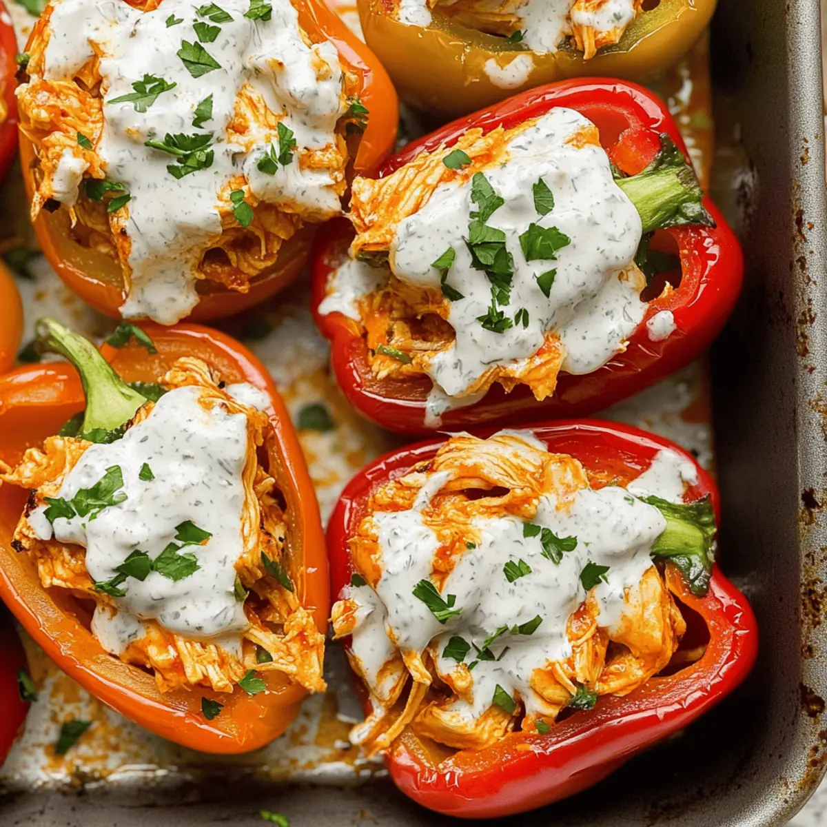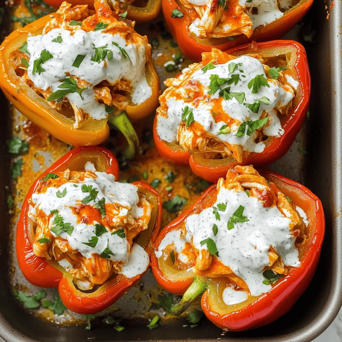 Once baked, remove the stuffed peppers from the oven and let them cool for a few minutes. Drizzle the top with dairy-free ranch dressing and sprinkle on fresh herbs like green onions or parsley. This final touch not only enhances the presentation but also adds a refreshing contrast to the heat of your buffalo chicken stuffing.