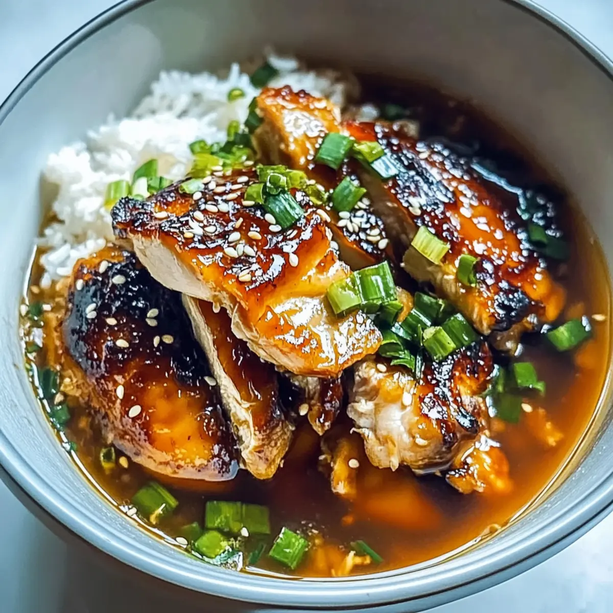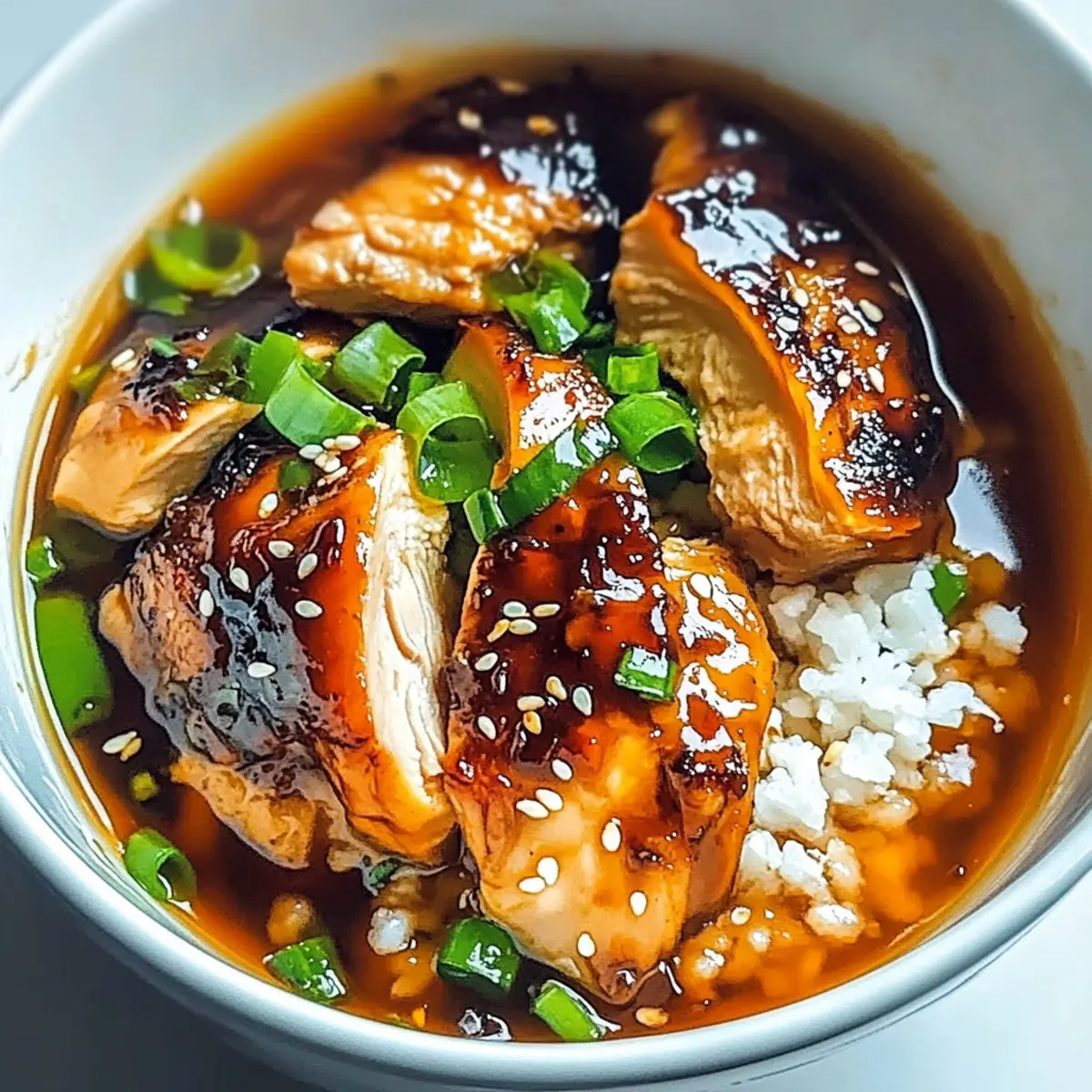 Jump to Recipe Print RecipeThe moment the chicken hits the pan, a fragrance fills the air that instantly transports me to a bustling Asian street market. My Caramelised Soy Chicken in Garlic Ginger Broth is not just another dinner; it’s a warm hug on a plate. Tender, juicy chicken thighs simmer in a rich, umami-packed broth, marrying the sweetness of honey with the sharpness of garlic and ginger. This dish is perfect for those busy weeknights when you crave something effortless yet delicious, and its versatility means you can easily adapt it to suit vegetarian tastes if you’re looking for a fun twist. Whether you’re feeding a crowd or savoring a cozy meal at home, this recipe enchants the senses and promises to create lasting memories. Are you ready to elevate your weeknight dinners? Let’s dive into the cooking bliss! Why is this Chicken Recipe a Must-Try? Flavor Explosion: The rich combination of garlic, ginger, and soy sauce creates a mouthwatering experience, ensuring every bite is packed with savory delight. Quick & Easy: With minimal prep, you can whip up this comforting meal in under 30 minutes, making it ideal for busy nights. Versatile Options: Not a chicken fan? Swap in firm tofu or seasonal veggies for a vegetarian twist that’s equally satisfying. Crowd-Pleaser: This dish is perfect for gatherings or family dinners, sure to impress even the pickiest eaters. Pair it with a side of fresh salad for a balanced meal! For more chicken recipes, check out my Cheesy Garlic Chicken or Garlic Chicken Thighs. Rich Cultural Taste: Bringing a flair of Asian cuisine into your home, this dish creates an authentic experience right in your kitchen. Caramelised Soy Chicken Ingredients • Note: Gather these essentials to whip up my delicious Caramelised Soy Chicken in Garlic Ginger Broth! For the Chicken Boneless Chicken Thighs – Use thighs with some fat for juiciness and rich flavor. Soy Sauce – Provides umami and saltiness; substitute with tamari for gluten-free. Dark Soy Sauce – Adds depth of flavor and color; can replace with more regular soy sauce if needed. Vegetable Oil – For sautéing until caramelized; can use canola or grapeseed oil. For the Broth Chicken Broth – Forms the flavorful base of the dish; use vegetable broth for a vegetarian option. Garlic (minced) – Offers robust flavor; fresh is best, but powdered can work in a pinch. Fresh Ginger (grated) – Adds warmth and spice; ground ginger can substitute, but the flavor differs. Rice Vinegar – Balances the dish with acidity; apple cider vinegar is a good alternative. Brown Sugar – Provides sweetness to balance flavors; coconut sugar is a lower glycemic alternative. Honey – Enhances sweetness and complexity; maple syrup can be used for a vegan option. Sesame Oil – Adds a nutty aroma; optional if not available. For Serving Cooked White Rice – Acts as the comforting base; brown rice can be a healthier substitute. Green Onions – Adds color and a mild onion flavor; chives work in a pinch. Sesame Seeds – Offers crunch and visual appeal; crushed peanuts can provide a different texture. Step‑by‑Step Instructions for Caramelised Soy Chicken in Garlic Ginger Broth with Rice Step 1: Prepare Marinade In a medium bowl, whisk together ¼ cup of soy sauce, 2 tablespoons of dark soy sauce, 2 tablespoons of brown sugar, and 1 tablespoon of rice vinegar until the sugar dissolves. This aromatic marinade is essential for the Caramelised Soy Chicken, balancing sweetness and umami. Set it aside while you prepare the chicken. Step 2: Marinate Chicken Coat 4 boneless chicken thighs generously with the marinade, ensuring all sides are well-covered. For the most flavorful results, allow the chicken to marinate for at least 20 minutes; however, refrigerating for up to 2 hours will deepen the flavor profile. You’ll notice the chicken soaking up the marinade beautifully as it rests. Step 3: Sear Chicken Heat 2 tablespoons of vegetable oil in a large skillet over medium-high heat until shimmering. Add the marinated chicken thighs and sear them for about 5-7 minutes on each side, or until they turn a golden brown and are thoroughly cooked. Remove the chicken from the pan and set them aside, letting their juices settle while you prepare the broth. Step 4: Sauté Aromatics In the same pan, add 2 teaspoons of minced garlic and 1 tablespoon of grated fresh ginger. Sauté these aromatics for 1-2 minutes, stirring constantly, until they become fragrant but avoid browning them to prevent bitterness. This step will infuse your broth with a robust flavor that makes the Caramelised Soy Chicken irresistible. Step 5: Make Broth Pour in 2 cups of chicken broth and 1 tablespoon of sesame oil, scraping the bottom of the pan to incorporate any flavorful bits. Bring the mixture to a gentle simmer, letting it reduce slightly for about 5 minutes. The broth should have a rich aroma as it melds with the sautéed garlic and ginger, creating a savory base for your chicken. Step 6: Serve Slice the seared chicken thighs into bite-sized pieces and return them to the simmering broth to warm through for 2-3 minutes. Prepare bowls of fluffy cooked white rice and ladle the aromatic broth with chicken over the top. Garnish generously with chopped green onions and a sprinkle of sesame seeds for a delightful crunch, making your Caramelised Soy Chicken a feast for the senses. Caramelised Soy Chicken Variations & Substitutions Feel free to customize this recipe and add your own personal touch to elevate your dish! Vegetarian Option: Substitute chicken thighs with firm tofu or diced seasonal vegetables for a delicious, meatless meal. The tofu absorbs all the lovely flavors from the marinade and broth, creating a satisfying dish that still feels hearty. Gluten-Free: Use tamari in place of soy sauce if gluten-free is a must. This simple swap keeps all the umami flavor while catering to any dietary needs. Healthier Rice: Swap white rice for brown rice to add m