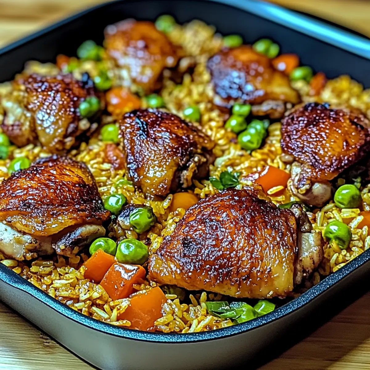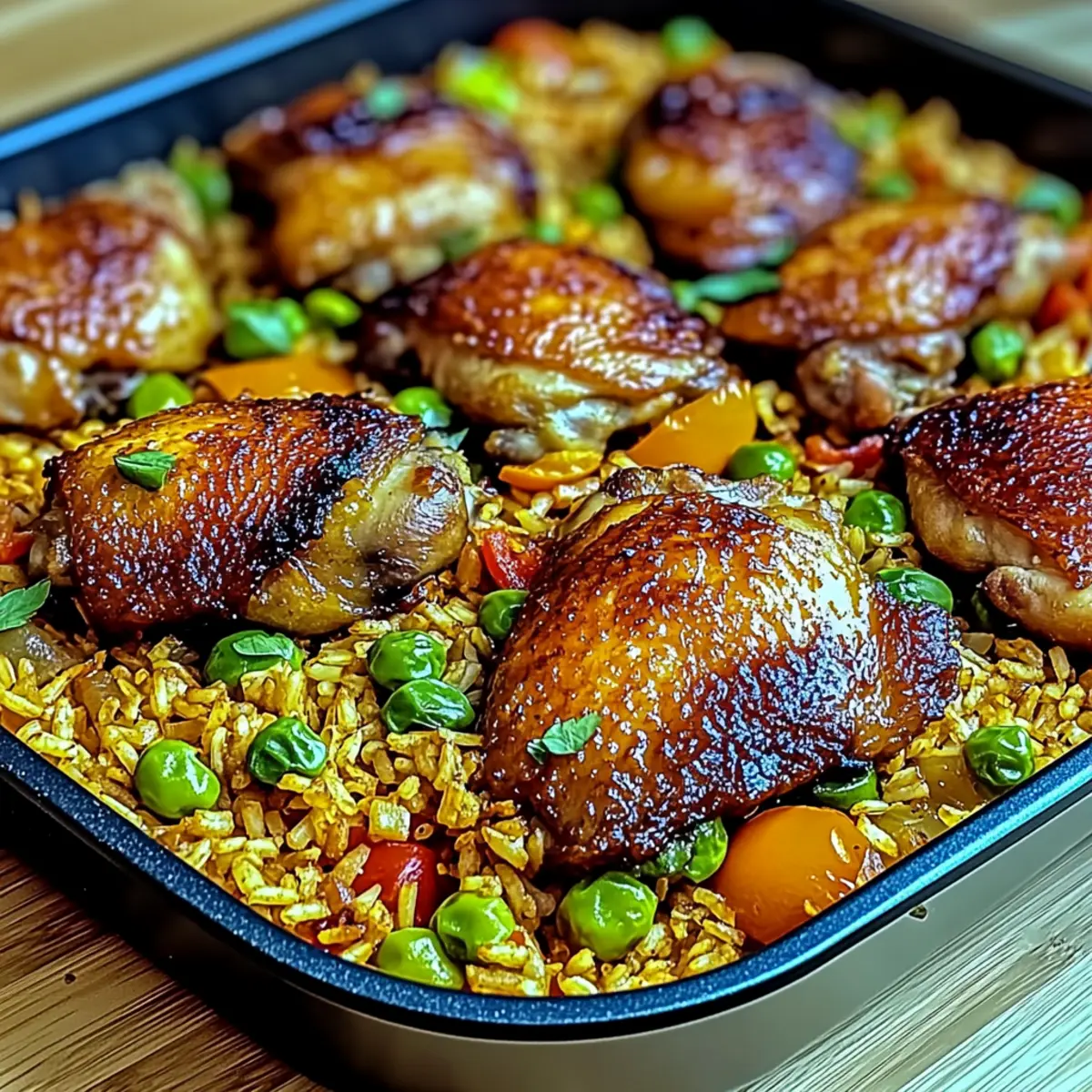 Jump to Recipe Print RecipeThe aroma of sizzling chicken and fragrant spices wafts through the kitchen, instantly transporting me to sun-drenched beaches and vibrant Caribbean markets. This One-Pan Caribbean Chicken and Rice embodies the spirit of comfort food with its rich, tropical flavors and satisfying texture. With juicy chicken thighs nestled atop creamy coconut-infused rice, this dish has become my go-to for busy weeknights and family gatherings. The best part? It’s not only ready in under an hour, but the one-pan cooking means minimal cleanup—what’s not to love? Plus, you can easily customize the level of spiciness, ensuring everyone at the table is happy. Ready to embark on this flavorful journey? Let’s dive in! Why is this Caribbean Chicken and Rice special? Quick & Easy: Perfect for busy weeknights, this dish is ready in under an hour—just one pan to cook and clean! Customizable Spiciness: Tailor the heat level to your liking, from mild to fiery, making it a hit for everyone around the table. Tropical Flavors: Enjoy a delicious blend of coconut, spices, and fresh vegetables that transports you straight to the Caribbean. Family-Friendly Appeal: Kids love it, and you can easily swap in their favorite vegetables for added nutrition. Versatile Servings: Serve it up with mango salsa or fried plantains for a complete meal that guests will rave about! This dish combines convenience and flavor to create a truly delightful dining experience, perfect for any occasion. Caribbean Chicken and Rice Ingredients For the Chicken • Chicken Thighs – Juicy and full of flavor; bone-in will add extra richness to your dish. • Olive Oil – Ideal for searing chicken; can be swapped with your favorite cooking oil. For the Rice • Long-Grain Rice – Jasmine or basmati absorbs flavors beautifully, making it perfect for this Caribbean Chicken and Rice. • Coconut Milk – Use unsweetened for a creamy texture and a subtle hint of sweetness. • Chicken Broth – Adds moisture and enhances the savory depth of the rice. For the Vegetables • Red and Green Bell Peppers – They bring color and sweetness; feel free to mix in your favorites. • Scallions – Offer a fresh, mild onion flavor; can be substituted with regular onions if needed. • Garlic – The aromatic base of the dish; if fresh isn’t available, use garlic powder. For Seasoning • Fresh Thyme – Provides an earthy flavor; substitute with 1 tsp of dried thyme if preferred. • Ground Allspice – Unique to Caribbean cooking, it adds warm, aromatic notes. • Paprika – Adds a subtle smokiness; cayenne can be used for an extra kick. • Salt and Pepper – Essential for balancing the flavors throughout the dish. Optional for Heat • Cayenne or Hot Sauce – Use to spice things up according to your heat preference. Step‑by‑Step Instructions for Caribbean Chicken and Rice Step 1: Prepare the Chicken Start by patting chicken thighs dry with paper towels, then season them generously with salt, pepper, allspice, and paprika. This step is crucial for developing flavor, so let the seasoned chicken sit for about 10 minutes at room temperature, allowing the spices to penetrate the meat. Step 2: Sear the Chicken Heat 2 tablespoons of olive oil in a large skillet over medium-high heat. Once hot, add the seasoned chicken thighs skin-side down and sear for 5-6 minutes until they achieve a golden-brown color. Flip the chicken and cook for another 2-3 minutes. The skin should be crisp, then remove the chicken from the skillet and set aside. Step 3: Sauté Vegetables In the same skillet, lower the heat slightly, and add minced garlic, sliced scallions, and diced bell peppers. Sauté these for about 2-3 minutes, stirring frequently until the vegetables soften and release their flavors, becoming aromatic and vibrant in color—this is the foundation of your One-Pan Caribbean Chicken and Rice. Step 4: Cook Rice After the vegetables are tender, stir in 1 cup of long-grain rice, followed by 1 can of coconut milk and 1 cup of chicken broth. Sprinkle in fresh thyme and a pinch of salt, then bring the mixture to a gentle simmer. Make sure to scrape up any brown bits from the bottom of the pan for added flavor. Step 5: Simmer to Perfection Once simmering, carefully nestle the seared chicken thighs back into the skillet, skin-side up. Cover the skillet with a lid and let it simmer for 20-25 minutes. During this time, the rice should absorb the coconut broth, and the chicken will cook through, reaching an internal temperature of 165°F—look for rice that is tender and fluffy. Step 6: Crisp the Chicken Skin With about 5 minutes left on the timer, remove the lid to allow the excess liquid to evaporate. This helps to crisp up the chicken skin even more, giving it that delightful crunch. You’ll know it’s ready when the rice is fully cooked and bubbly, with a hint of crisp texture on the chicken. Step 7: Garnish and Serve Remove the skillet from the heat and let it sit for a couple of minutes. Garnish your One-Pan Caribbean Chicken and Rice with sliced scallions for a pop of color and freshness. Serve it hot, and savor the vibrant flavors that make this dish a comforting favorite for any night of the week! Storage Tips for Caribbean Chicken and Rice Fridge: Store leftovers in an airtight container for up to 4 days. Reheat gently over low heat, adding a splash of broth or coconut milk to keep it moist. Freezer: Portion servings into freezer-safe containers for up to 2 months. Thaw overnight in the fridge before reheating for best results. Room Temperature: It’s best to avoid leaving Caribbean Chicken and Rice out at room temperature for longer than 2 hours to prevent any food safety issues. Reheating: When reheating, add a little liquid to restore moisture, ensuring the rice remains creamy and chicken stays juicy. What to Serve with One-Pan Caribbean Chicken and Rice Elevate your dining experience by pairing delightful sides that complement