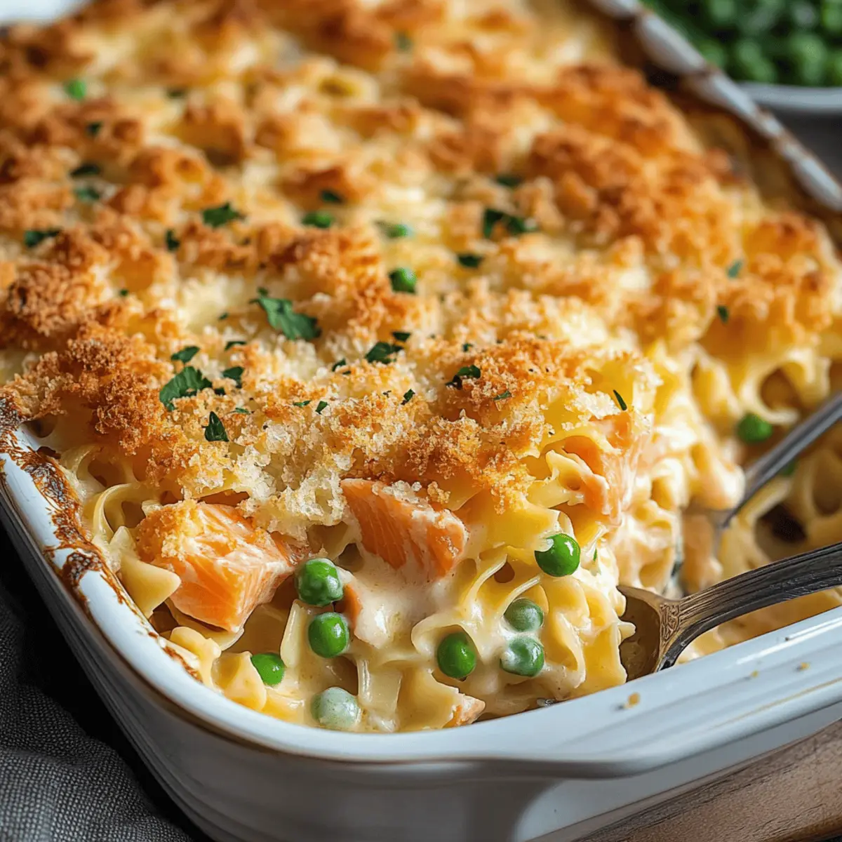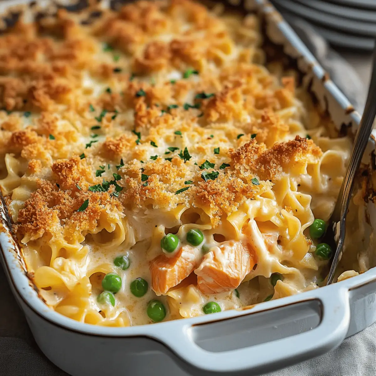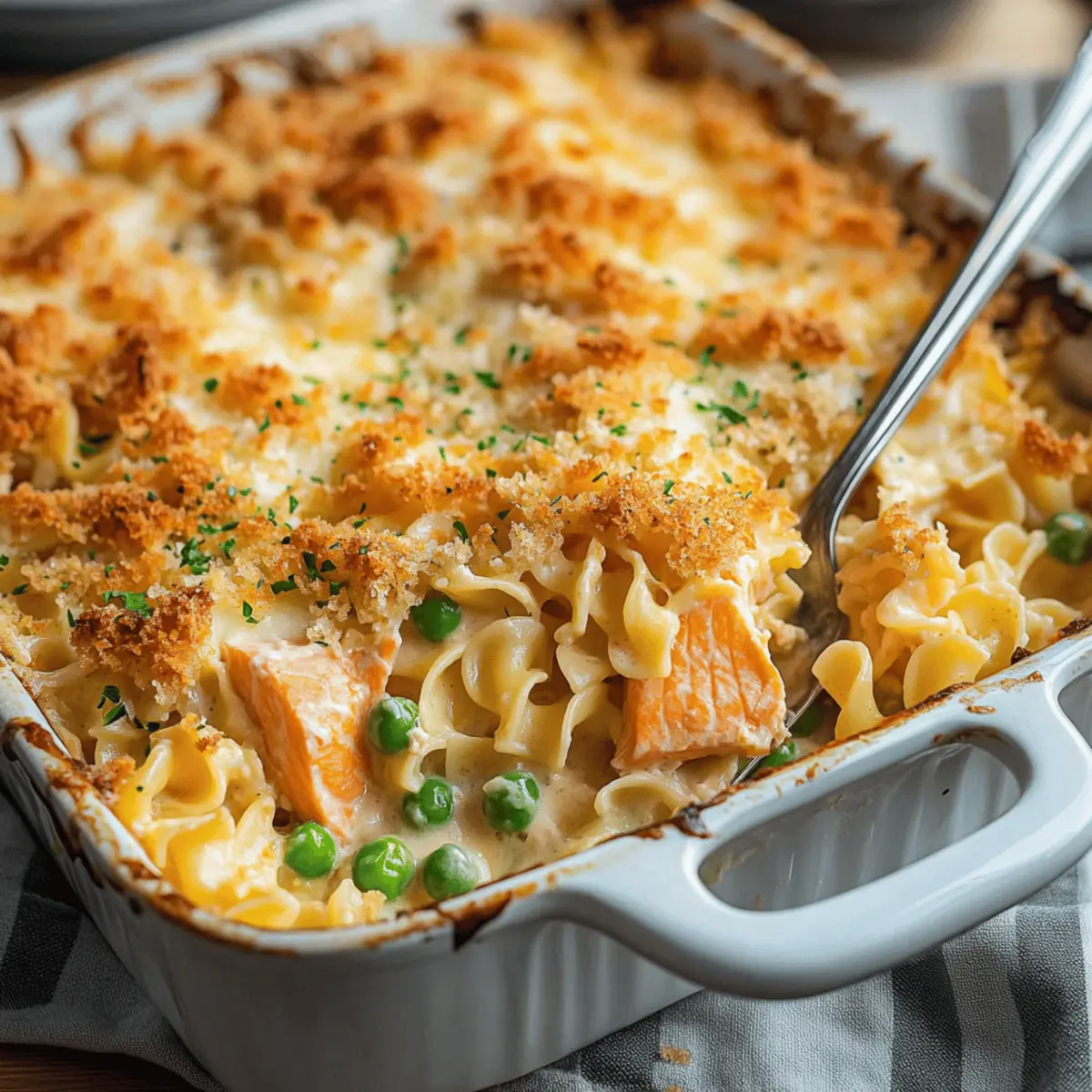 Jump to Recipe Print RecipeAs I was rummaging through my pantry one chilly evening, I stumbled upon the perfect ingredients for a quick and comforting family meal: Cheesy Salmon Noodle Casserole. This creamy delight combines tender egg noodles, luscious cheese, and a hint of nutritious veggies, making it the ultimate budget-friendly dish that even the pickiest eaters will adore. What’s better is that you can whip it up in under an hour—perfect for those busy weeknights when you still want to show your loved ones some homemade love. Whether you’re seeking a hearty meal to warm your soul or a crowd-pleasing dish that begs for seconds, this casserole checks all the boxes. Ready to dive into the creamy bliss of this irresistible recipe? Why is this casserole a must-try? Creamy Indulgence: The Cheesy Salmon Noodle Casserole is a dream come true for those craving comfort food with a twist. Kid-Friendly: Packed with flavors that appeal to both adults and children, this dish guarantees smiles around the dinner table. Budget-Friendly: Using simple, affordable ingredients, you can create a delightful meal without breaking the bank. Quick Preparation: Ready in under an hour, it’s a lifesaver for busy weeknights. Versatile Ingredients: Feel free to mix in your favorite veggies or substitute with other proteins like tuna for added variety. Crowd-Pleasing Flavor: The combination of rich cheese, flaky salmon, and tender noodles makes it a dish that invites second helpings. For more wholesome casserole ideas, check out our Cheesy Carrot Casserole or our cozy Vegetable Casserole Cozy! Cheesy Salmon Noodle Casserole Ingredients For the Casserole • Egg Noodles – The base of this casserole; cook until al dente, as they will soften further while baking. • Pink or Red Salmon – The star protein that adds flavor and texture; can easily be swapped with canned tuna or chicken for variety. • Shredded Cheddar Cheese – Provides that signature creaminess and savory flavor; experimenting with a mix like mozzarella can enhance meltiness. • Frozen Peas (or Mixed Veggies) – Adds vibrant color and nutrition; consider using fresh veggies for a freshness boost. • Cream of Mushroom Soup – Creates the rich, creamy sauce; feel free to sub in cream of chicken or a homemade white sauce. • Milk – Thins out the sauce for a smooth texture; almond or oat milk works well for a non-dairy alternative. • Sour Cream – Brings tanginess to the mix; Greek yogurt can be a lighter option that’s just as creamy. • Garlic Powder, Onion Powder, Paprika, Salt, Black Pepper – A blend of seasonings to elevate flavor; adjust them to suit your family’s taste. For the Topping • Breadcrumbs – Adds a satisfying crunch on top; panko breadcrumbs yield a lighter texture, while crushed crackers offer a different crunch. • Butter (for Topping) – Aids in browning the breadcrumbs; consider using olive oil for a healthier alternative. Delve into the creamy layers of this delicious Cheesy Salmon Noodle Casserole, and enjoy a warm, hearty meal that’s sure to make your family smile! Step‑by‑Step Instructions for Cheesy Salmon Noodle Casserole Step 1: Preheat the Oven Begin by preheating your oven to 350°F (175°C). This ensures your Cheesy Salmon Noodle Casserole bakes evenly and achieves that perfect golden finish. While the oven heats up, gather your ingredients and prepare for the next steps, creating a smooth flow to your cooking process. Step 2: Cook the Egg Noodles In a large pot of boiling salted water, cook the egg noodles according to package instructions until they are al dente, typically around 7–10 minutes. Once cooked, drain the noodles in a colander and set aside to cool slightly. This step is essential since the noodles will continue cooking in the oven, ensuring they have the right texture in the final dish. Step 3: Mix the Casserole Ingredients In a large mixing bowl, combine the flaked salmon, half of the shredded cheddar cheese, frozen peas, cream of mushroom soup, milk, sour cream, and seasonings. Use a spatula to mix everything until well combined and creamy, ensuring the salmon is evenly integrated with the other ingredients. This mixture will be the flavorful base of your Cheesy Salmon Noodle Casserole. Step 4: Combine Noodles and Mixture Gently fold the drained egg noodles into the salmon mixture until each noodle is coated with the creamy sauce. Be thorough but careful not to break the noodles. This step is crucial as it ensures each bite of your casserole is packed with delicious flavors, making the Cheesy Salmon Noodle Casserole irresistible. Step 5: Prepare for Baking Grease a 9×13 inch baking dish with cooking spray or butter to prevent sticking. Transfer the noodle and salmon mixture into the prepared dish, spreading it evenly with a spatula. This ensures that every corner gets the same delicious treatment, allowing your casserole to bake uniformly. Step 6: Add the Topping Sprinkle the remaining cheddar cheese generously over the top of the casserole. Then, mix the breadcrumbs with melted butter in a small bowl and sprinkle this mixture over the cheese layer. This will create a delightful crunchy topping, enhancing the overall texture of your Cheesy Salmon Noodle Casserole. Step 7: Bake the Casserole Place the baking dish in the preheated oven and bake the casserole for 25–30 minutes. Keep an eye on it, looking for a bubbly, golden top as an indicator that your dish is nearly done. This will create the perfect creamy interior combined with a crunchy, satisfying crust. Step 8: Cool and Serve Once baked, remove the Cheesy Salmon Noodle Casserole from the oven and let it cool for about 5–10 minutes. This resting period allows the flavors to settle, making it easier to scoop out servings. The casserole should appear golden brown and bubbly—ready to bring smiles to your family at the dinner table! Storage Tips for Cheesy Salmon Noodle Casserole Fridge: Store leftovers in an