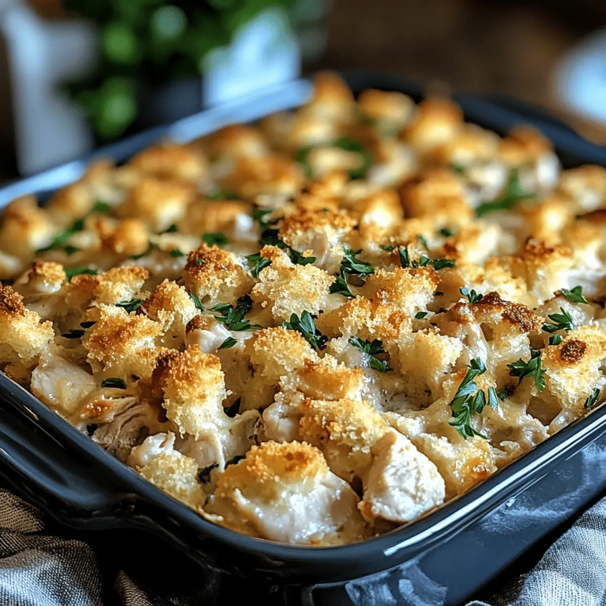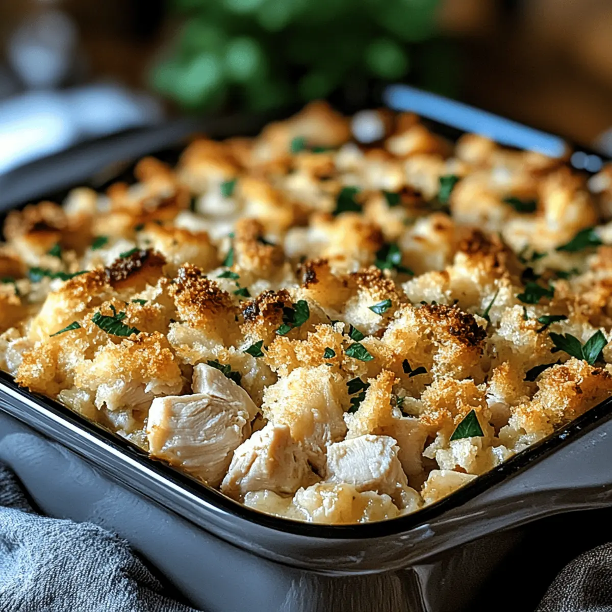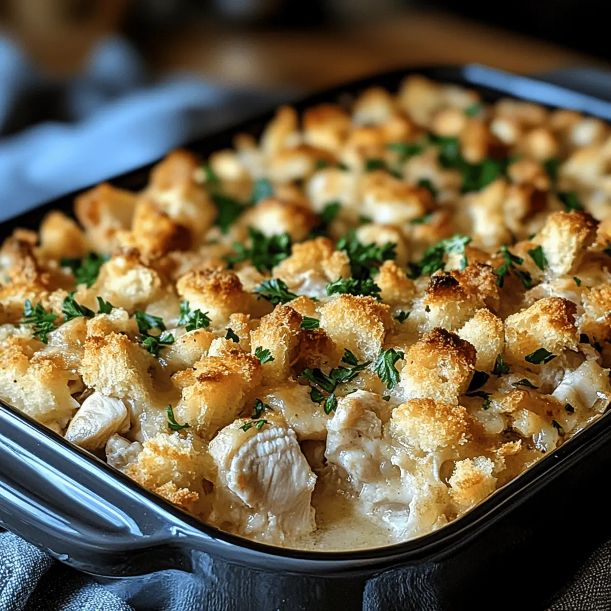 Jump to Recipe Print RecipeAs I stood in my kitchen, the warmth of the oven wrapping around me, I couldn’t help but smile at the irresistible scent of Dolly’s Chicken and Stuffing Casserole wafting through the air. This dish isn’t just a meal; it’s a comforting embrace, perfectly suited for cozy weeknight dinners or cherished family gatherings. With the ease of using rotisserie chicken, you can whip this up in no time, making it a fantastic choice for those busy evenings. But what I love most is how this casserole adapts effortlessly to fit any dietary need—whether you want a gluten-free twist or a lighter, dairy-free option, it delivers that homey, feel-good flavor every time. Ready to dive into the love and nostalgia of this Southern classic? Let’s get cooking! Why Is This Casserole a Must-Try? Comforting Warmth: Dolly’s Chicken and Stuffing Casserole wraps you in delicious nostalgia, making it perfect for family feasts or comforting weeknight meals. Versatile Options: With variations like gluten-free or dairy-free, this dish caters to everyone’s needs, ensuring no one misses out on flavor! Quick and Easy: Using rotisserie chicken means less prep time, allowing you to get dinner on the table faster while still impressing your loved ones. Crowd-Pleasing Flavor: The rich creamy sauce combined with a crunchy stuffing top creates a delightful contrast, making it an instant favorite for family gatherings. Make-Ahead Convenience: Prepare it in advance and simply pop it in the oven when it’s time to eat. It’s freezer-friendly too, making your meal prep a breeze! Check out ideas for Chicken Broccoli Alfredo or Vegetable Casserole Cozy to pair with this comforting dish! Chicken and Stuffing Casserole Ingredients For the Chicken Base Cooked Chicken – Use rotisserie chicken for convenience or opt for cooked chicken breast to keep it tender and juicy. Cream of Chicken Soup – This acts as a creamy base to bind the ingredients; for a lighter option, try Greek yogurt or low-sodium broth. Sour Cream – Adds creaminess and a tangy flavor; swap with Greek yogurt for a healthier choice. For the Stuffing Stuffing Mix – Provides texture and flavor; substitute with cornbread stuffing for a sweeter twist! Chicken Broth – Enhances moisture in the casserole; choose low-sodium broth for a healthier, less salty dish. Butter – Helps brown and crisp the stuffing for added richness; it’s optional if you prefer a lighter version. For the Seasoning Seasonings (Salt, Pepper, and Dried Herbs) – Enhance the flavor profile; customize with your favorite local herbs for a personal touch. Enjoy exploring variations to this comforting Chicken and Stuffing Casserole that bring warmth to your table! Step‑by‑Step Instructions for Chicken and Stuffing Casserole Step 1: Prepare the Creamy Base In a large mixing bowl, combine 3 cups of shredded cooked chicken, one can of cream of chicken soup, and one cup of sour cream, mixing well until everything is fully incorporated. Season with salt, pepper, and your choice of dried herbs to taste. This mixture will be the deliciously creamy base of your Chicken and Stuffing Casserole, so make sure it’s smooth and even. Step 2: Layer the Casserole Preheat your oven to 350°F (175°C). In a greased 9×13 inch baking dish, spread the creamy chicken mixture evenly across the bottom. Next, sprinkle the stuffing mix gently on top, ensuring it covers the chicken completely. For an extra layer of richness, drizzle melted butter over the stuffing before proceeding to bake. This will help create a beautifully golden crust. Step 3: Bake the Casserole Place the casserole in the preheated oven and let it bake uncovered for 35 to 40 minutes. You’ll know it’s done when the top is a gorgeous golden brown and the edges of the casserole are bubbling with a hint of creamy goodness. This baking time ensures your Chicken and Stuffing Casserole is heated through and perfectly crispy on top. Step 4: Cool before Serving Once out of the oven, allow the casserole to cool for about 5–10 minutes. This resting period helps the layers set, making it easier to slice and serve. The Chicken and Stuffing Casserole is now ready to be dished up! Enjoy the warm and comforting flavors with your loved ones. Variations & Substitutions for Chicken and Stuffing Casserole Feel free to customize this beloved Chicken and Stuffing Casserole to suit your taste preferences or dietary needs—let’s get creative in the kitchen! Cornbread Stuffing: Swap regular stuffing for cornbread stuffing to introduce a subtle sweetness that elevates the flavor profile. Gluten-Free: Use certified gluten-free stuffing and a low-sodium broth to create a delicious dish without the gluten. Dairy-Free: For a lighter version, replace sour cream and butter with dairy-free substitutes like cashew cream or olive oil. Herb Variations: Experiment with your favorite herbs, such as rosemary or thyme, to infuse the dish with seasonal flavors that speak to your palate. Vegetable Boost: Mix in some chopped spinach or sautéed mushrooms for added nutrition and texture! This little twist awakens your casserole, making it even more nutritious. Spicy Kick: Add some diced jalapeños or red pepper flakes for a spicy edge. This variation is perfect for those who crave a bit of heat in their comfort food. Make it Vegetarian: Replace the chicken with a combination of lentils and chickpeas, using vegetable broth to maintain that comforting essence. Add Crunchy Topping: Sprinkle crushed crackers or fried onion rings on top before baking for an irresistible crunch that contrasts beautifully with the creamy layers below. No matter how you choose to modify it, this casserole remains a heartwarming dish. Need more meal ideas? Try pairing it with Baked Hot Honey Chicken for a delightful sweet and savory combo, or round out your meal with a Vegetable Casserole Cozy for extra veggie goodness! What to Serve with Dolly’s Chicken and Stuffi