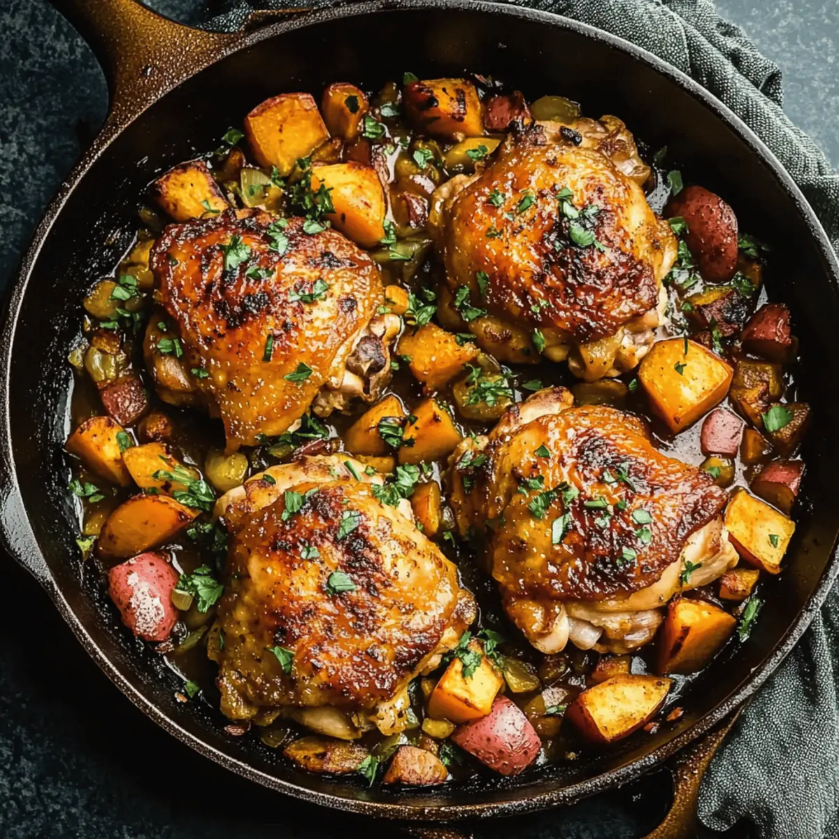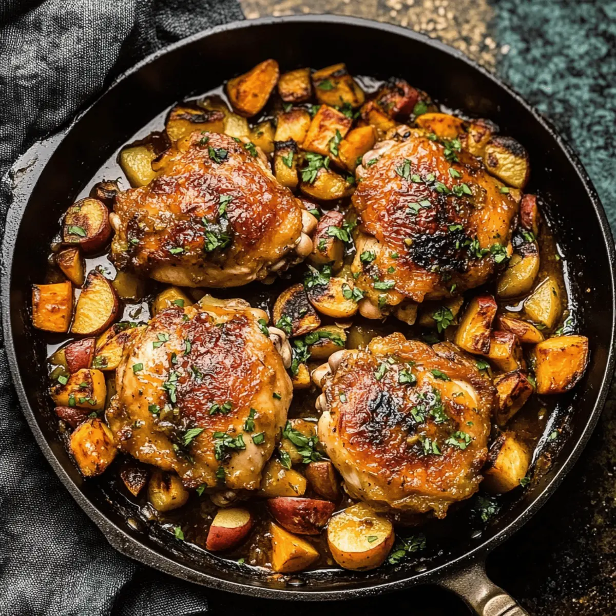 Jump to Recipe Print RecipeAs the leaves change their hues and the air grows crisp, there’s nothing quite like a nourishing meal to embrace the warmth of autumn. That’s where my Chicken and Sweet Potato Skillet with Smoky Maple-Dijon Sauce shines—bringing together tender, juicy chicken thighs, hearty sweet potatoes, and a delightful hint of apple, all drizzled with a luscious, smoky-sweet sauce. This one-pan wonder not only simplifies your weeknight cooking but also delivers comfort in every bite, embodying that perfect balance of savory and sweet. It’s ideal for those of us looking to step away from fast food and savor something homemade and heartwarming. Ready to dive into the cozy, rich flavors of fall? Let’s get cooking! Why is this recipe a must-try? Simplicity at Its Best: One-pan cooking means less cleanup and more time to enjoy your meal. Savory-Sweet Balance: The blend of maple syrup and Dijon mustard creates a uniquely delightful sauce that enhances every bite. Seasonal Goodness: Hearty sweet potatoes and crisp apples channel the comforting flavors of autumn, making it perfect for cozy evenings. Crowd-Pleasing Flavor: Whether hosting friends or enjoying family dinner, this dish is sure to impress everyone around the table. Versatility: Easy to adapt with seasonal swaps like Brussels sprouts or spices to suit your taste. Explore more comforting dishes like Garlic Chicken Thighs or Sausage Sweet Potatoes for additional inspiration! Chicken and Sweet Potato Skillet Ingredients Dive into the heartwarming flavors of the Chicken and Sweet Potato Skillet with Smoky Maple-Dijon Sauce that will make your autumn evenings feel special! For the Skillet Chicken Thighs – Provides rich flavor and moisture; substitute boneless, skinless thighs or breasts for a lighter option. Sweet Potatoes – Adds natural sweetness and heartiness; can also use diced butternut squash or pumpkin for variety. Bacon – Introduces smokiness and savory depth; render until crispy for maximum flavor impact. Apple – Contributes a hint of sweetness and tartness; any firm sweet apple variety will work beautifully. Onion – Offers aromatic sweetness; shallots can be used for a milder flavor profile. For the Sauce Smoked Paprika – Enhances the smokiness without adding sweetness and is essential for flavor balance. Dijon Mustard – Adds a tangy bite to the sauce, perfectly complementing the sweetness of maple syrup. Maple Syrup – Provides natural sweetness to balance flavors; honey can be used, though it may slightly alter the taste. Chicken Broth – Adds moisture and richness to the skillet; switch to vegetable broth for a vegetarian option. Embrace the warmth of the season with this gratifying and easy dish—perfect for cozy family dinners or entertaining guests! Step‑by‑Step Instructions for Chicken and Sweet Potato Skillet with Smoky Maple-Dijon Sauce Step 1: Cook the Bacon In a large skillet over medium heat, cook chopped bacon until crispy, roughly 5–7 minutes. Stir occasionally to ensure even cooking, and once golden brown, transfer the bacon to a plate, leaving the rendered fat in the skillet for flavor. This savory base is essential for your Chicken and Sweet Potato Skillet with Smoky Maple-Dijon Sauce. Step 2: Sear the Chicken Increase the heat to medium-high and add chicken thighs skin-side down into the reserved bacon fat. Sear for about 6–8 minutes until the skin is golden and crispy. Flip the chicken and cook for an additional 5–7 minutes until cooked through and the internal temperature reaches 165°F. This step locks in the juicy flavor that will shine through the dish. Step 3: Sauté the Vegetables Reduce the heat to medium and add diced onions and sweet potatoes to the skillet. Sauté for about 5–7 minutes, stirring often, until the sweet potatoes begin to soften and the onions become translucent. This creates a fragrant base for the Chicken and Sweet Potato Skillet, allowing the natural sweetness of the veggies to emerge. Step 4: Combine Ingredients Stir in the chopped apples, reserved bacon, smoked paprika, and Dijon mustard into the skillet with the chicken and vegetables. Mix until everything is well coated and cook for an additional 2–3 minutes. This will help combine the rich flavors, making your Smoky Maple-Dijon Sauce vibrant and full of character. Step 5: Add Liquid Pour in the chicken broth and maple syrup, stirring to combine all the ingredients. Bring the mixture to a gentle boil over medium-high heat, allowing the flavors to meld for about 2–3 minutes. This step helps to create the delicious sauce that will envelop the chicken and veggies, enriching the slice of autumn in your meal. Step 6: Simmer Reduce the heat to low and let the skillet simmer for 10–15 minutes, uncovered, until the sauce thickens slightly and the sweet potatoes are tender. Stir occasionally, ensuring nothing sticks to the bottom of the skillet. You’ll know it’s ready when the vibrant colors deepen, and the aroma fills your kitchen with that inviting fall essence. Step 7: Finish & Serve (Optional) For a bright finish, squeeze fresh lemon juice over the skillet just before serving. Serve warm, spooning the Chicken and Sweet Potato Skillet with Smoky Maple-Dijon Sauce directly from the pan, letting everyone enjoy the rustic charm. Pair with crusty bread for an extra touch of comfort! Make Ahead Options These Chicken and Sweet Potato Skillet with Smoky Maple-Dijon Sauce is an ideal dish for meal prep, allowing you to save time on busy weeknights! You can marinate the chicken thighs in the Smoky Maple-Dijon Sauce up to 24 hours in advance, ensuring they soak in all those delicious flavors. Additionally, you can chop the sweet potatoes, apples, and onions up to 3 days ahead, storing them in airtight containers in the refrigerator to maintain freshness. When you’re ready to cook, simply follow the step-by-step instructions by sautéing and combining the prepped ingredients, and you