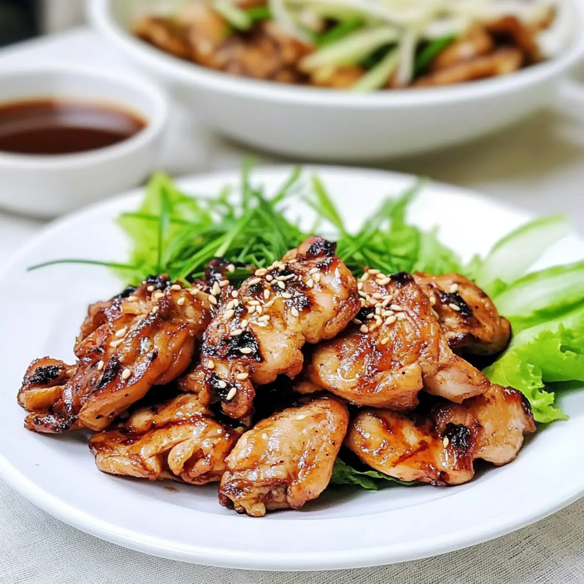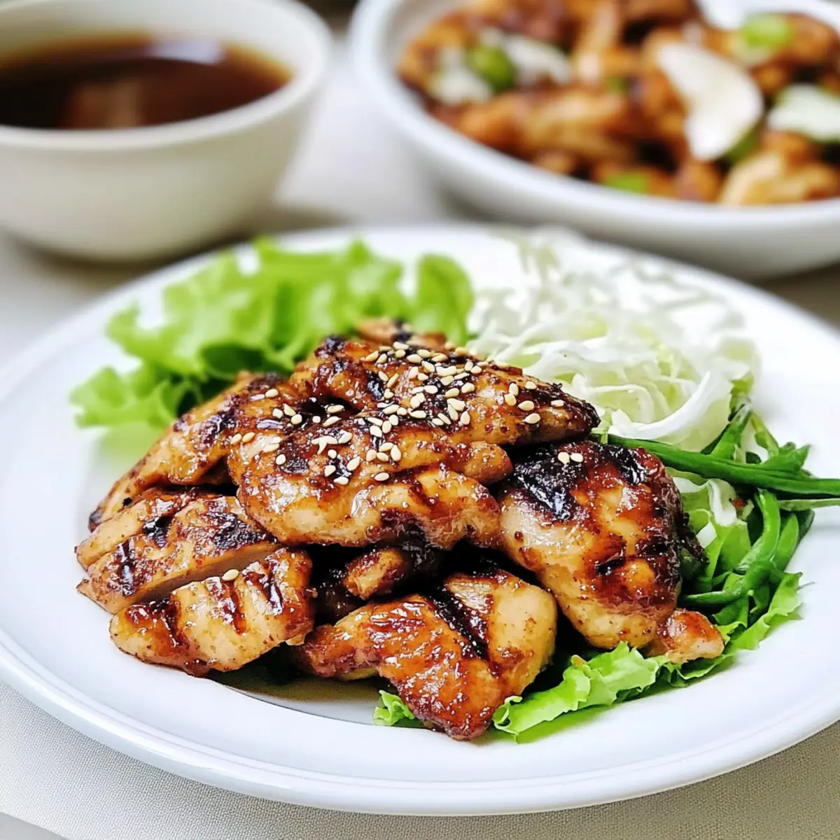 Jump to Recipe Print RecipeThe aroma of sizzling chicken wafts through the air, transporting me back to evenings spent sharing meals with family. This Easy Dak Bulgogi recipe is my go-to for weeknight dinners when time is tight but flavor cannot be compromised. The tender marinated chicken thighs come together in a matter of minutes, making it a quick meal ideal for those busy nights. With its delightful balance of sweetness from brown sugar and a kick of savory umami from soy sauce, this dish excites the palate, all while being easy to prepare. Plus, it can effortlessly be tailored for the grill, turned gluten-free, or served with fresh veggies for an even healthier twist. Are you ready to embrace the joy of homemade Korean BBQ chicken? Let’s dive in! Why is Dak Bulgogi a must-try? Quick and Easy: This Chicken Bulgogi recipe is designed for busy nights, ready in minutes without sacrificing flavor. Versatile Cooking Options: Whether you sauté it on the stove or fire up the grill, the choice is yours! Flavorful Balance: Enjoy the perfect harmony of sweet and savory notes that make every bite memorable. Healthier Alternative: Choose skinless chicken for a lighter meal that still satisfies your cravings. Catering to Everyone: Great for gluten-free diets with easy substitutions—everyone at the table can indulge! Crowd-Pleasing Dish: Serve it in lettuce wraps or alongside colorful veggies for a delightful family dinner. Experience the joy of Korean BBQ with this simple yet scrumptious dish! Chicken Bulgogi Recipe Ingredients For the Marinade • Boneless Chicken Thigh &/or Breast – Use skinless for a lighter version or bone-in for added flavor. • Soy Sauce – Provides that essential umami flavor; substitute with tamari for a gluten-free option. • Lemon Juice – Adds brightness and acidity; fresh is best, but bottled is fine in a pinch. • Brown Sugar – Encourages caramelization and sweetness; regular sugar can work if you’re out. • Honey – For extra sweetness; agave syrup makes a great vegan substitute. For Cooking • Rice Wine (or Mirin or White Wine) – Enriches the flavors; omit if avoiding alcohol, adding more lemon juice instead. • Minced Garlic – Fresh garlic adds aromatic depth; using jarred minced garlic is convenient if you’re short on time. • Grated Ginger – Offers a warm spice note; fresh is encouraged, but powdered ginger can substitute in a pinch. • Sesame Oil – Provides a nutty flavor; opt for toasted sesame oil if you want a richer taste. • Black Pepper – Enhances overall flavor; freshly ground is the best choice for seasoning. For Garnish • Sesame Seeds – These add a delightful crunch and authenticity; they’re optional but recommended for presentation. This Chicken Bulgogi Recipe is perfect for a quick meal any night of the week! Step‑by‑Step Instructions for Chicken Bulgogi Recipe (Dak Bulgogi) Step 1: Prepare the Chicken Start by rinsing and trimming the boneless chicken thighs or breasts, removing any excess fat. Cut the chicken into bite-sized pieces, approximately 2 inches each, ensuring they are uniform for even cooking. Place the pieces in a bowl, ready to soak up all the delightful flavors from the marinade. Step 2: Make the Marinade In a separate bowl, whisk together soy sauce, lemon juice, brown sugar, honey, rice wine, minced garlic, grated ginger, sesame oil, and freshly ground black pepper. Continue whisking until the sugar completely dissolves and the mixture is well combined. The marinade will have a glossy, rich appearance, signaling it’s ready to coat the chicken. Step 3: Marinate the Chicken Pour the marinade over the chicken pieces, ensuring they are generously coated. Cover the bowl with plastic wrap or transfer everything into a resealable bag. Refrigerate for at least 30 minutes to let the flavors penetrate the chicken; for best results, marinate for several hours or overnight if you have the time. Step 4: Preheat the Skillet Heat a large skillet over medium-high heat, allowing it to get hot before adding any ingredients. Lightly grease the skillet or use a non-stick option to prevent sticking. When the skillet is shimmering yet not smoking, you’re ready to cook the chicken. Step 5: Cook the Chicken Add the marinated chicken to the hot skillet, reserving any leftover marinade for basting. Let the chicken cook for about 2-3 minutes on one side until it develops a nice caramelized color. Using tongs, flip the pieces to cook for another 2-3 minutes on the other side, ensuring they are cooked through and golden brown. Step 6: Baste for Flavor As the chicken continues to cook, take the reserved marinade and drizzle it over the chicken. This will add an extra layer of flavor while helping to keep the chicken moist. Continue cooking until the chicken reaches an internal temperature of 165°F, ensuring it’s thoroughly cooked but still juicy. Step 7: Serve and Enjoy Once cooked, remove the chicken from the skillet and let it rest for a couple of minutes. Serve your delicious Chicken Bulgogi in lettuce wraps or alongside rice and your favorite vegetable sides, like oi muchim. Garnish with sesame seeds for an authentic finish, ready to delight your family! Make Ahead Options These Easy Dak Bulgogi chicken pieces are perfect for meal prep, making weeknight dinners a breeze! You can marinate the chicken in the flavorful blend of soy sauce and spices up to 24 hours in advance—just store it in an airtight container in the refrigerator to keep it fresh and delicious. Additionally, you can prepare the marinade itself and refrigerate it for up to a week. When you’re ready to serve, simply cook the marinated chicken in your skillet over medium-high heat for about 5-6 minutes until it’s juicy and caramelized, ensuring a comforting, homemade meal that tastes just as good as fresh! Chicken Bulgogi Recipe Variations Feel free to explore these variations and make this Chicken Bulgogi recipe your own! Vegetarian Deli
