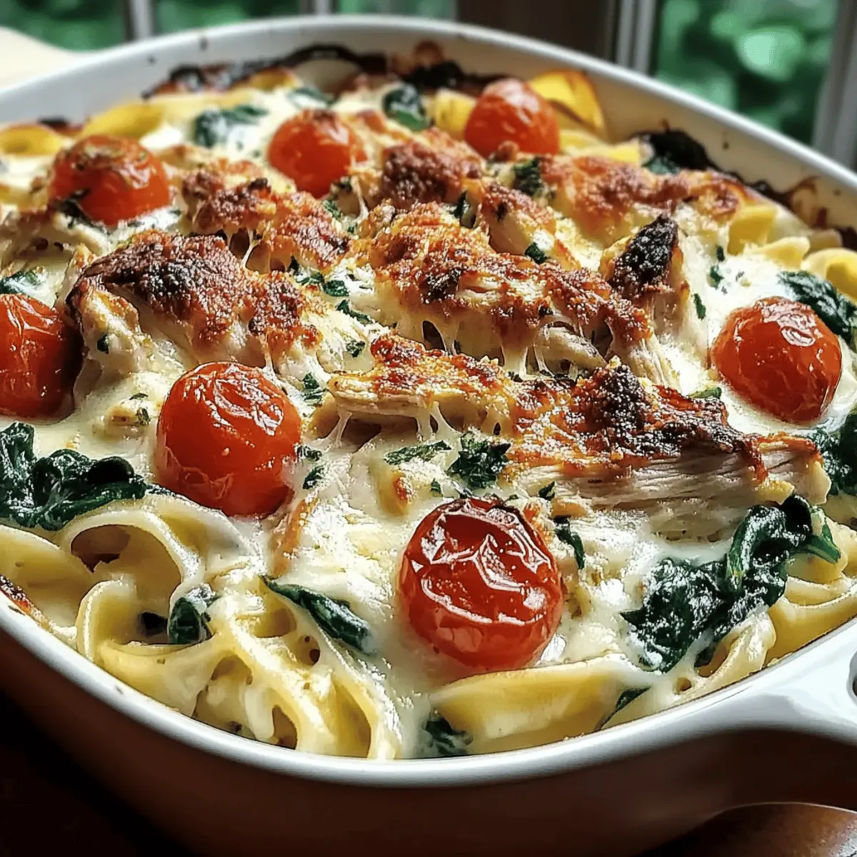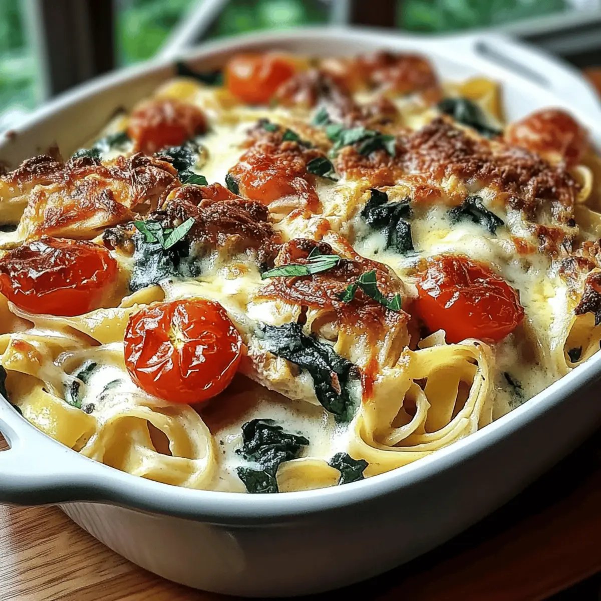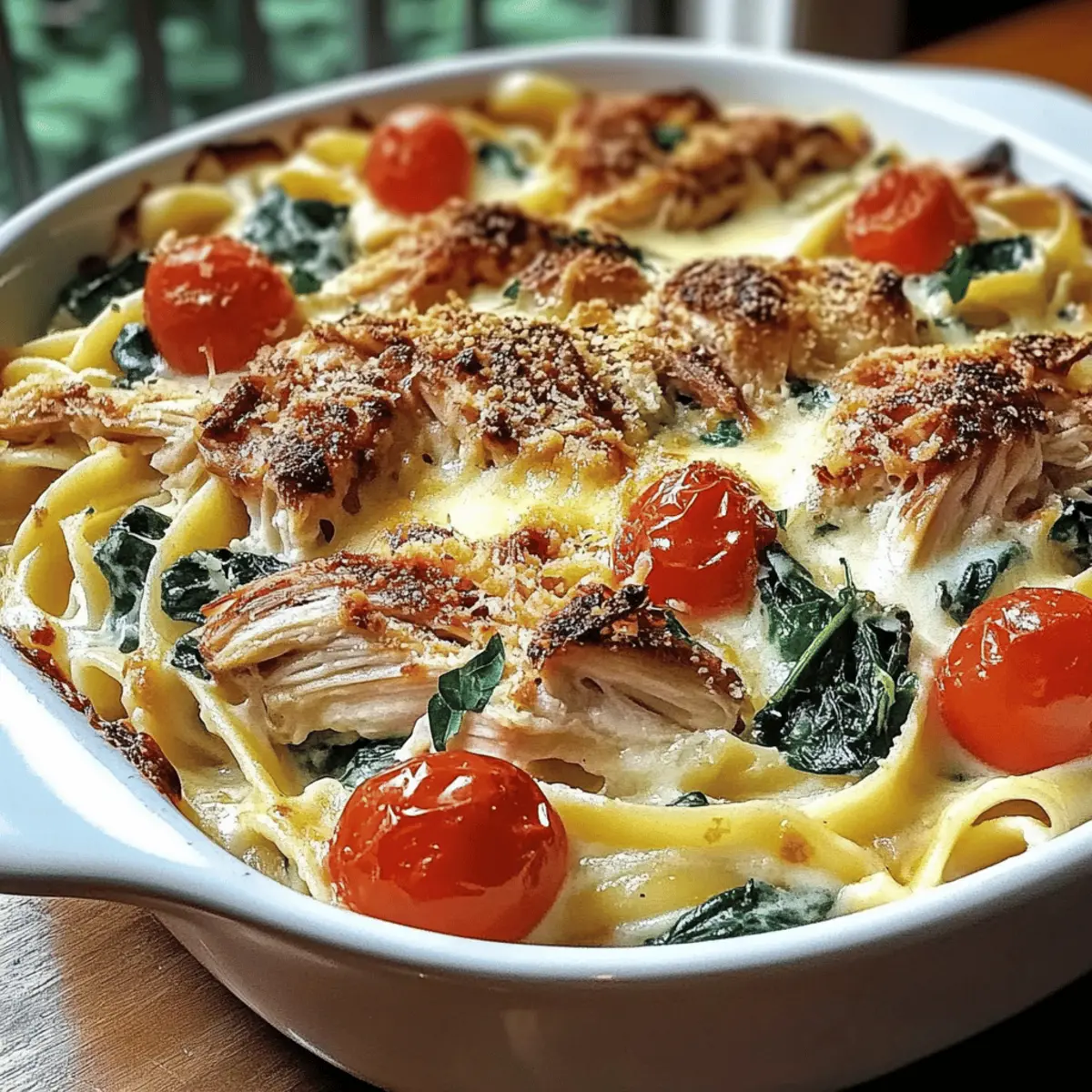 Jump to Recipe Print RecipeAs I pulled that golden, cheesy masterpiece from the oven, I could hardly contain my excitement. The Savory Chicken Fettuccine Bake was the perfect culmination of a busy day, inviting me to dive into a warm embrace of comfort food. With tender rotisserie chicken mingling with creamy Alfredo sauce, vibrant cherry tomatoes, and nutritious spinach, this dish has quickly become my go-to for easy weeknight dinners that the whole family devours. Not only is it a cinch to prepare, but it also transforms simple ingredients into a delightful meal that brings everyone together. Curious how you can whip up this scrumptious bake in your own kitchen? Let’s get started! Why is Chicken Fettuccine Bake irresistible? Comforting Culinary Experience: This Chicken Fettuccine Bake wraps you in a warm embrace with its rich, creamy sauce and melted cheese. Family Favorite: With flavor that appeals to all ages, it’s sure to be a hit at your dinner table. Time-Saving: Easy to assemble, especially with rotisserie chicken, this dish can be on your table in under an hour. Customizable: Feel free to mix in your favorite veggies or swap proteins to match your family’s tastes. If you enjoy this comforting meal, you might also love Oven Baked Chicken for another twist on quick dinners. Chicken Fettuccine Bake Ingredients Discover the simple yet delightful ingredients that make up this comforting dish! For the Pasta Fettuccine Pasta – Its broad shape holds the creamy sauce perfectly; penne or rotini can be used as substitutions. For the Filling Cooked, Shredded Chicken – Provides a hearty protein base; using rotisserie chicken saves you time and effort. Cherry Tomatoes – Their sweetness brightens the dish; grape tomatoes serve as a great alternative. Fresh Spinach – Adds a boost of nutrition and vibrant color; feel free to swap for kale or Swiss chard. For the Sauce Alfredo Sauce – The heart of the dish; store-bought for ease, or homemade for the ultimate flavor experience. For the Toppings Mozzarella Cheese – Melts beautifully, creating a gooey top layer; consider provolone for a different twist or a dairy-free option. Parmesan Cheese – Adds a sharp, salty bite; Pecorino Romano works well as a substitute. Seasonings Garlic Powder – Enhances every bite’s flavor; fresh garlic is a lovely alternative if you prefer freshness. Italian Seasoning – A blend of herbs that elevates the dish; fresh basil or oregano can enhance the taste. Salt and Pepper – Essential for bringing all the flavors together; adjust according to your palate. For Cooking Olive Oil – Ideal for sautéing the tomatoes; avocado oil can be used for a lighter option. Fresh Basil (optional) – A lovely garnish that adds freshness and color; omit if not available. This delicious Chicken Fettuccine Bake is set to become your family’s favorite comfort food! Step‑by‑Step Instructions for Chicken Fettuccine Bake Step 1: Preheat the Oven Begin by preheating your oven to 350°F (175°C). This ensures that your Chicken Fettuccine Bake cooks evenly as soon as it’s ready to go in. While the oven heats up, prepare your baking dish by greasing it generously with olive oil or cooking spray to prevent sticking. Step 2: Cook the Fettuccine In a large pot, bring salted water to a rolling boil. Add the fettuccine and cook according to package instructions until just al dente, usually around 8-10 minutes. Once cooked, drain the pasta well and set it aside, allowing it to steam off a bit while you prepare the rest of the dish. Step 3: Sauté the Vegetables Heat a tablespoon of olive oil in a large skillet over medium heat. Add the cherry tomatoes and sauté for 3-4 minutes, until they start to blister and release their juices. Next, stir in the fresh spinach, cooking until it wilts, which should take about 2 minutes. Remove from heat and set aside to cool slightly. Step 4: Combine the Filling In a large mixing bowl, combine the cooked fettuccine, shredded rotisserie chicken, and the sautéed cherry tomatoes and spinach. Pour in the creamy Alfredo sauce, sprinkle in the garlic powder and Italian seasoning, and mix thoroughly until every ingredient is well coated and combined. Step 5: Assemble the Bake Transfer the flavorful mixture into the greased 9×13-inch baking dish, spreading it out evenly to ensure consistent cooking. The Chicken Fettuccine Bake should have a nice, even layer, ready to be topped off. Step 6: Add the Cheese Toppings Sprinkle the top with the remaining mozzarella cheese and Parmesan cheese, ensuring an even coverage for a beautifully melted and bubbly crust. The cheese will create a deliciously gooey topping that’s hard to resist once baked. Step 7: Bake the Dish Place the assembled Chicken Fettuccine Bake in the preheated oven for 25-30 minutes. You’ll want to bake it until the cheese is melted, bubbly, and golden brown on top. Keep an eye on it towards the end to prevent over-browning. Step 8: Rest Before Serving Once out of the oven, let the Chicken Fettuccine Bake rest for 5-10 minutes. This allows the flavors to meld and makes it easier to cut into squares. Optionally, garnish with fresh basil for a burst of color and flavor before serving warm to your delighted family. What to Serve with Savory Chicken Fettuccine Bake As you prepare to gather your loved ones around the table, consider these delightful pairings that will elevate your cozy dinner experience. Garlic Bread: Freshly baked with a buttery garlic spread, this staple is perfect for soaking up the creamy sauce. It adds a crunchy texture that complements the softness of the bake. Green Salad: A crisp salad filled with mixed greens, cucumbers, and a light vinaigrette introduces freshness, balancing the richness of the Chicken Fettuccine Bake. Toss in some nuts or berries for added texture! Roasted Vegetables: Vibrant seasonal vegetables roasted until tender add a splash of color and nutrients. Their caramelized sweetness provide