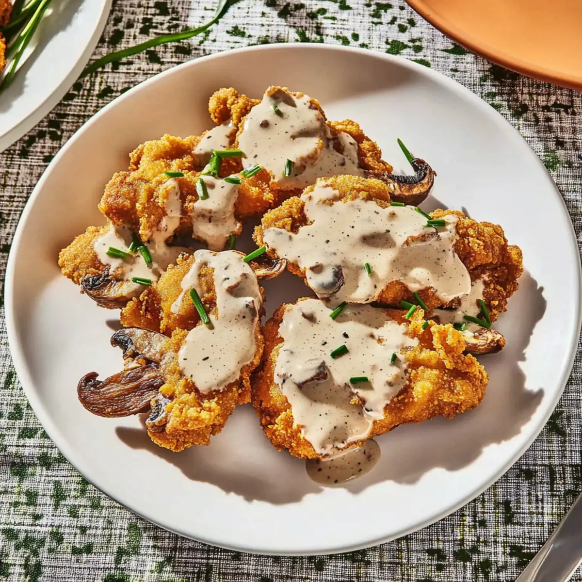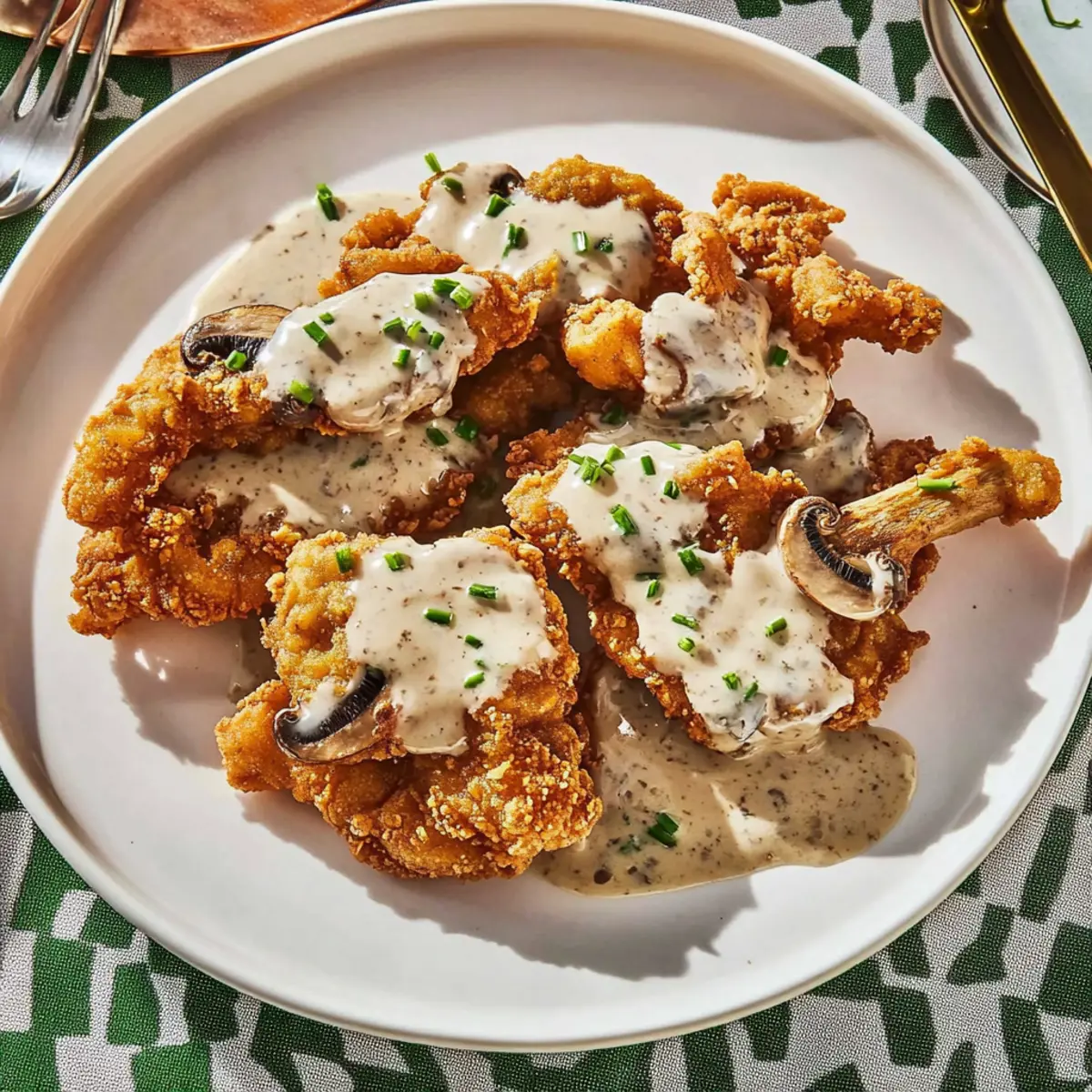 Jump to Recipe Print RecipeThe aroma of savory frying fills the kitchen, wrapping around me like a cozy blanket on a chilly evening. There’s something undeniably comforting about Chicken-Fried Mushrooms & Gravy, especially when you realize they provide a plant-based twist on a beloved classic. These satisfying oyster mushrooms boast a crunchy exterior that mimics fried chicken perfectly, and when smothered in creamy, homemade gravy, they’re simply irresistible. Not only is this dish quick to whip up in just 30 minutes, but it also transforms simple ingredients into a scrumptious comfort food that everyone will adore. Whether you’re looking for a weeknight meal or a delightful indulgence, this recipe has got you covered! What will you serve alongside this mouthwatering dish? Why Are Chicken-Fried Mushrooms so Irresistible? Indulgent flavors abound in this dish, offering a perfect comfort food experience. Crispy texture: The golden-brown coating on the oyster mushrooms mimics traditional fried chicken, delivering that satisfying crunch. Quick and easy: Ready in just 30 minutes, it’s ideal for busy evenings without sacrificing taste. Vegan-friendly: Enjoy a plant-based twist that everyone can love, making it a hit for all dietary preferences. Versatile options: Consider pairing with Chicken Stuffed Mushrooms for a delectable side or serve alongside classic mashed potatoes for a comforting Southern meal. Get ready to impress your family and friends! Chicken-Fried Mushrooms & Gravy Ingredients For the Mushrooms Oyster Mushrooms – Main ingredient mimicking chicken; offers a hearty texture. Substitute with portobello mushrooms for a firmer bite. All-Purpose Flour – Provides the coating for frying; creates crispiness. Gluten-free flour can be used for a gluten-free option. Cornstarch – Aids in achieving extra crispiness in the coating. No direct substitute; increases fry texture. Sweet Paprika – Adds depth and color to the batter. Smoked paprika can offer a different flavor dimension. Garlic Powder – Enhances flavor profile. Fresh garlic can be substituted, but may alter texture. Onion Powder – Adds savory notes to the batter. Optional if desiring a less intense onion flavor. Turmeric – Gives a warm color and subtle earthiness. Can be omitted if not available. Kosher Salt – Enhances overall flavor. Table salt can be used, but reduce the quantity slightly. Black Pepper – Adds a touch of heat. Adjust according to taste preferences. For the Buttermilk Unsweetened Almond Milk – Base for buttermilk; provides moisture. Regular milk or any plant-based milk could be substituted. Apple Cider Vinegar – Combines with almond milk to create a buttermilk substitute. Lemon juice can serve as an alternative. For Frying and Gravy Vegetable Oil – Used for frying; contributes to the crispy texture. Canola oil is a good substitute. Vegan Butter – Adds richness to the gravy. Regular butter can be substituted if not vegan. Cremini Mushrooms – Additional texture and flavor for gravy. Button mushrooms can be a good alternative. Garlic (minced) – Fresh flavor for the gravy; can be omitted for simplicity. Chopped Chives – For garnish, providing freshness and color. Green onions can be used instead. Finishing Touch Flaky Sea Salt – For finishing touch; enhances flavor contrast. This delightful blend of ingredients ensures that your Chicken-Fried Mushrooms & Gravy not only looks appealing but also tastes like a warm hug on a plate! Enjoy cooking and savor the delightful comfort it brings! Step‑by‑Step Instructions for Chicken-Fried Mushrooms & Gravy Step 1: Prepare the Buttermilk In a mixing bowl, whisk together 1 cup of unsweetened almond milk and 1 tablespoon of apple cider vinegar, letting it sit for about 5 minutes until it thickens slightly. This homemade buttermilk base adds moisture and tang to the Chicken-Fried Mushrooms, making their coating stick beautifully. Step 2: Make the Coating Mixture Combine 1 cup of all-purpose flour, ¼ cup of cornstarch, and your spices in a large bowl: 1 teaspoon each of sweet paprika, garlic powder, onion powder, turmeric, kosher salt, and black pepper. Mix thoroughly until all ingredients are evenly distributed, creating a flavorful coating for the mushrooms that’s essential for that crispy texture. Step 3: Dredge the Mushrooms Take the oyster mushrooms and dredge them first in the dry coating mixture, ensuring they are well-covered. Then, dip them into the prepared buttermilk, allowing any excess to drip off. Finally, return the mushrooms to the dry mix for a second coating that guarantees a crunchy finish when frying. Step 4: Heat the Oil for Frying In a large skillet, heat about 1 inch of vegetable oil over medium-high heat—aim for a temperature around 350°F (175°C). To test if the oil is hot enough, drop in a small piece of the coating mixture; if it sizzles and starts bubbling, you’re ready to fry the Chicken-Fried Mushrooms to a delicious golden brown. Step 5: Fry the Mushrooms Carefully place the coated oyster mushrooms in the hot oil, frying them for approximately 4-5 minutes on each side until they turn a lovely golden-brown and crispy. Keep an eye on them, flipping gently to achieve an even fry and ensure they are cooked through. Remove them from the skillet and let them drain on a paper towel-lined plate. Step 6: Prepare the Mushroom Gravy In a separate pan, melt 3 tablespoons of vegan butter over medium heat. Once melted, add 1 cup of finely chopped cremini mushrooms and sauté until they soften, about 3-4 minutes. If you’re using minced garlic, toss it in now and sauté for an additional minute until fragrant, creating a base rich in flavor for the gravy. Step 7: Make the Gravy Sprinkle ¼ cup of flour over the sautéed mushrooms and stir well to combine. Gradually pour in 1 cup of almond milk while whisking continuously to prevent lumps from forming. Cook for about 5 minutes until the mixture thickens, releasing t
