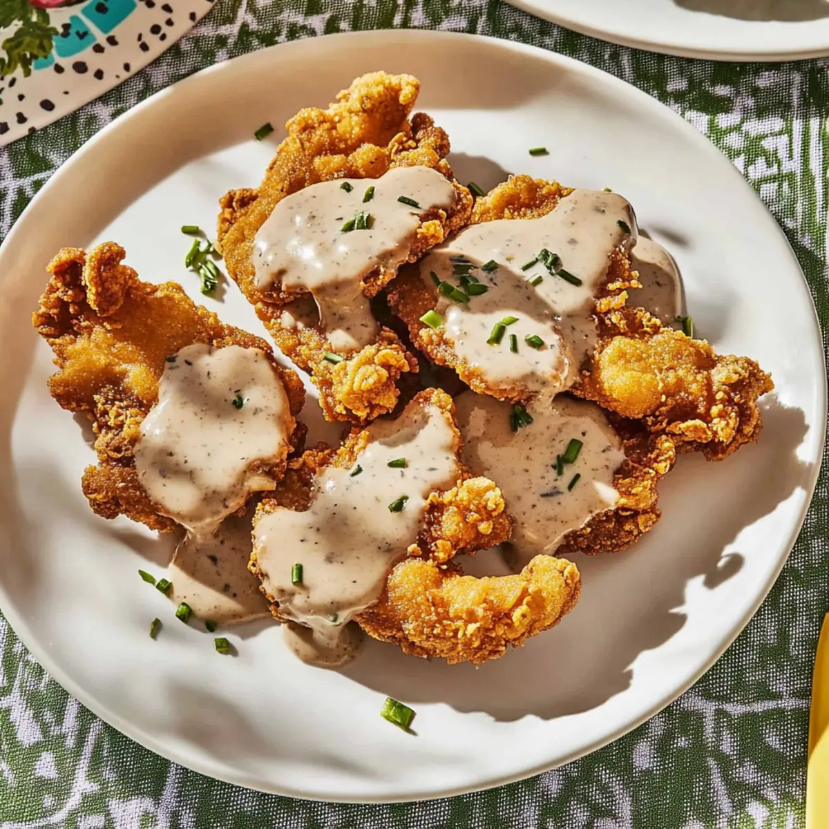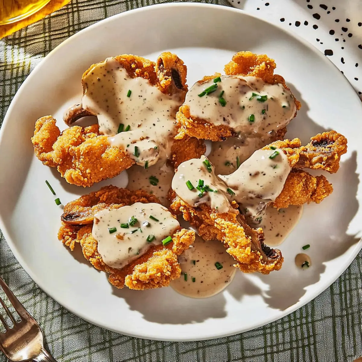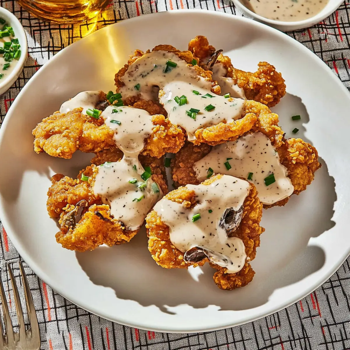 Jump to Recipe Print RecipeAs I stood at my kitchen counter, the scents of garlic and spices wafted through the air, transporting me to a Southern diner filled with warmth and laughter. That’s when I knew I had to share my beloved recipe for Chicken-Fried Oyster Mushrooms & Gravy. This vegetarian twist on a classic comfort food not only captures the satisfying crunch of fried chicken but also takes just 30 minutes to whip up—perfect for those hectic weeknights when you crave something indulgent yet quick. Each bite is a delightful embrace of flavors and textures, making it a guaranteed crowd-pleaser. Curious how you can bring this nostalgic dish to your table? Let’s dive into the recipe! Why Make Chicken-Fried Mushrooms & Gravy? Crispiness that rivals any fried chicken: The oyster mushrooms become wonderfully crunchy, satisfying your cravings for texture. Comforting gravy: This rich, creamy sauce is the perfect complement, enveloping each mushroom with savory goodness. Quick prep and cook time: In just 30 minutes, you can serve a meal that feels indulgent, making it ideal for busy evenings. Versatile variations: Swap in other mushrooms like portobello in this recipe or try Chicken Stuffed Mushrooms for a fun twist! Vegetarian-friendly and flavorful: Enjoy a delightful meat-free option that doesn’t compromise on taste, making it a hit with everyone at the table. Chicken-Fried Mushrooms & Gravy Ingredients For the Mushrooms • Oyster mushrooms (12 ounces) – Best when large and meaty, they mimic fried chicken’s texture beautifully. • All-purpose flour (2 cups) – This forms the crispy breading; swap with gluten-free flour if needed. • Cornstarch (2 Tbsp) – Adds an extra layer of crunch; no need for substitutions here. • Sweet paprika (2 tsp) – Provides vibrant flavor and color; try using smoked paprika for a deeper taste. • Garlic powder (1 tsp) – Boosts flavor; fresh garlic can be used for a punchier profile. • Onion powder (1 tsp) – Complements garlic; feel free to leave it out if you’re avoiding onions. • Turmeric (1/2 tsp) – Gives a warm hue; optional for those sensitive to its flavor. • Kosher salt – Enhances overall taste; adjust according to preference. • Freshly ground black pepper – Adds a peppery kick; freshly ground offers the best flavor. • Unsweetened almond milk (1 cup) – This acts as the base for buttermilk; any plant-based milk works well. • Apple cider vinegar (1 Tbsp) – Crucial for creating the buttermilk; substitute with lemon juice if needed. • Vegetable oil (for frying) – Essential for the frying process; choose oils like canola or peanut for high smoke points. • Flaky sea salt – A finishing touch for added flavor; optional, but highly recommended. For the Gravy • Vegan butter (2 Tbsp) – Provides richness to the gravy; regular butter can be used for non-vegan options. • Cremini mushrooms (3 large, chopped) – Enhances the gravy’s depth with their earthy flavor. • Clove of garlic (minced) – Adds a lovely garlic essence; use more for an intensified flavor. • Chopped chives – For garnish; optional, but adds a fresh finish to the dish. Enjoy whipping up this indulgent recipe for Chicken-Fried Mushrooms & Gravy, where comfort food meets vegetarian delight! Step‑by‑Step Instructions for Chicken-Fried Mushrooms & Gravy Step 1: Prepare the Buttermilk Start by creating your buttermilk for the Chicken-Fried Mushrooms & Gravy. In a mixing bowl, combine 1 cup of unsweetened almond milk with 1 tablespoon of apple cider vinegar. Whisk well and let it sit for about 5-10 minutes until it thickens and curdles slightly, mimicking traditional buttermilk. This step is crucial for a flavorful coating on our mushrooms. Step 2: Bread the Mushrooms In a separate bowl, mix together 2 cups of all-purpose flour, 2 tablespoons of cornstarch, 2 teaspoons of sweet paprika, 1 teaspoon of garlic powder, 1 teaspoon of onion powder, ½ teaspoon of turmeric, and a generous pinch of kosher salt and black pepper. Dip each oyster mushroom into the prepared buttermilk, allowing the excess to drip off. Then coat each mushroom in the dry mixture, pressing lightly to ensure they’re fully covered. Step 3: Heat the Oil In a large skillet, pour in vegetable oil, ensuring it’s at least 1 inch deep for frying. Heat the oil over medium-high heat until it reaches a temperature of about 350°F. To test the readiness, drop a small piece of batter into the oil; it should sizzle immediately. This ensures your Chicken-Fried Mushrooms will cook evenly and become crispy. Step 4: Fry the Mushrooms Carefully place the coated oyster mushrooms into the hot oil, working in batches to avoid overcrowding the pan. Fry them for about 3-4 minutes on each side or until they are golden brown and crispy. Use tongs to turn them gently, ensuring they cook evenly. Once done, transfer them to a paper towel-lined plate to drain excess oil. Step 5: Make the Gravy In another pan, melt 2 tablespoons of vegan butter over medium heat. Add 3 large chopped cremini mushrooms and 1 minced clove of garlic, stirring occasionally, and sauté for 4-5 minutes until the mushrooms are softened and the garlic is fragrant. This will form the flavorful base of your gravy, adding depth to your Chicken-Fried Mushrooms & Gravy. Step 6: Thicken the Gravy Sprinkle 2 tablespoons of flour over the sautéed mushrooms and stir for 1-2 minutes until the flour is well incorporated. Gradually whisk in 1 cup of almond milk, ensuring there are no lumps. Keep stirring until the gravy starts to thicken, which should take about 3-5 minutes. Once it reaches a creamy consistency, season with salt and pepper to taste. Step 7: Serve the Dish To serve, place the crispy Chicken-Fried Mushrooms on a plate and generously drizzle with the creamy gravy. For a touch of freshness, sprinkle with chopped chives. This indulgent Chicken-Fried Mushrooms & Gravy dish is rich, savory, and irresistibly comfortin