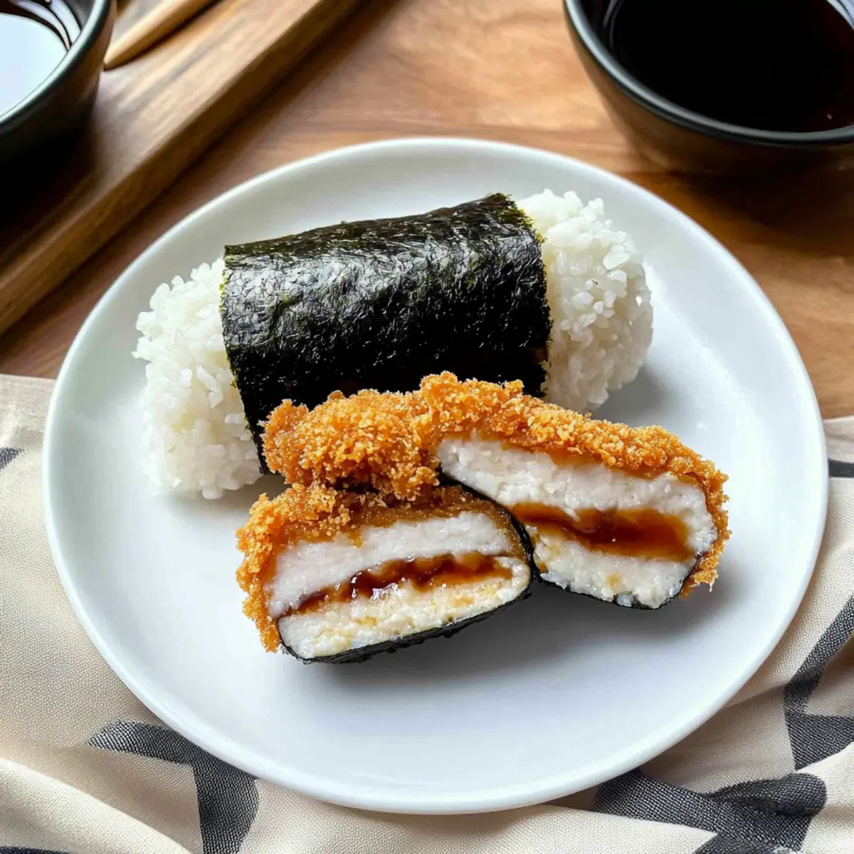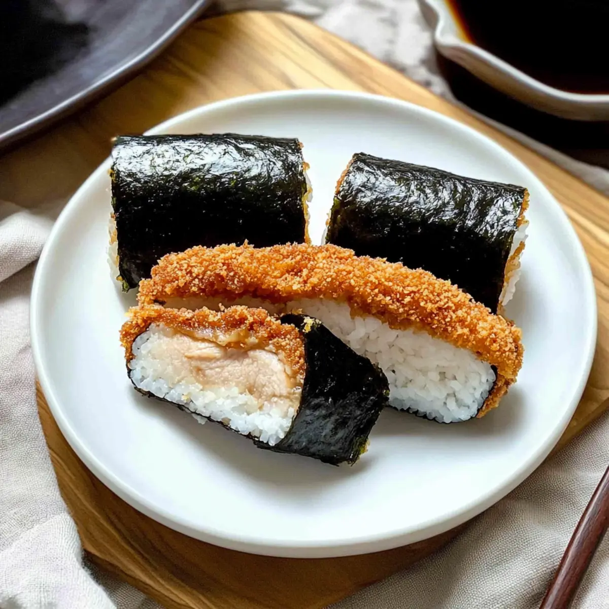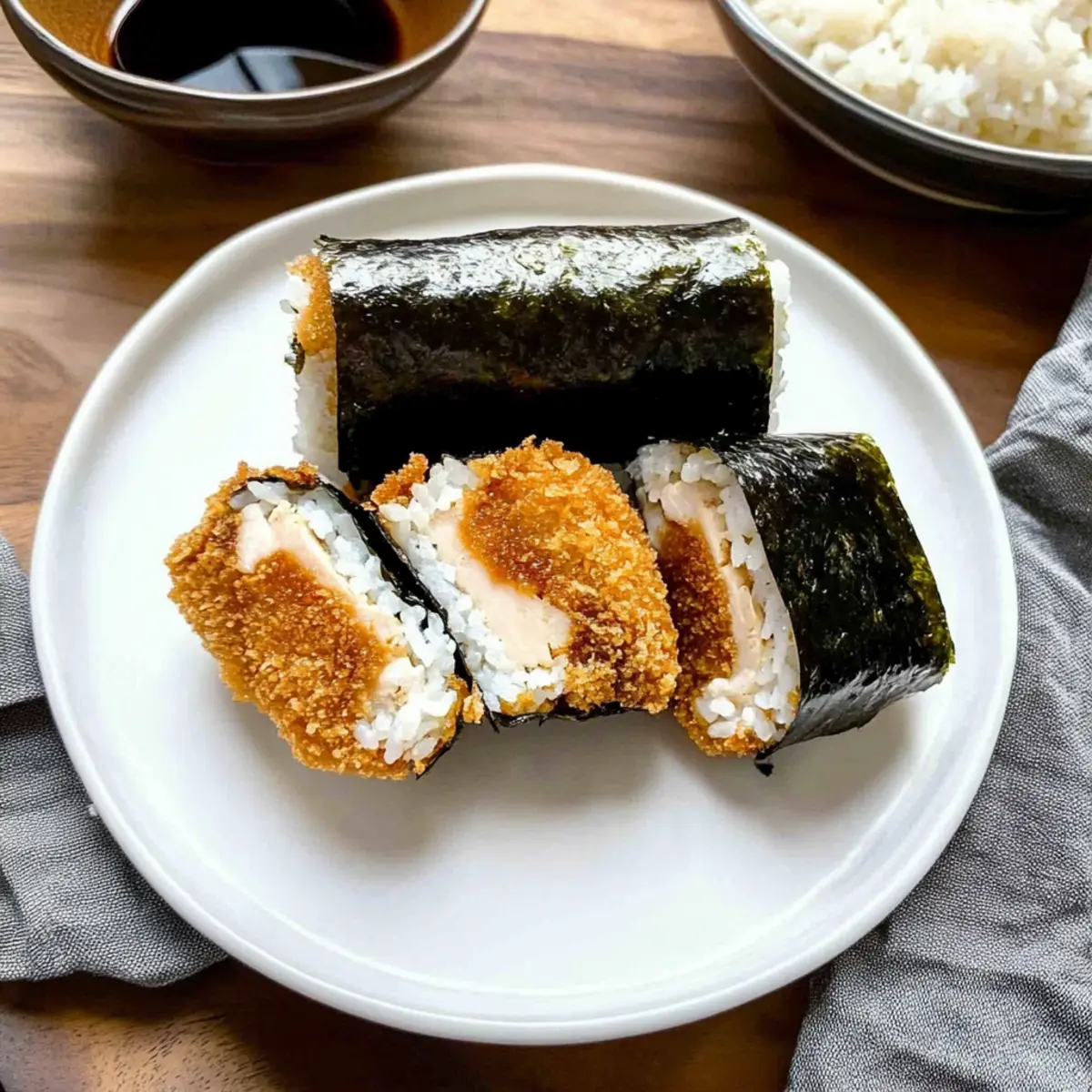 Jump to Recipe Print RecipeAs I flipped through my favorite cookbook, a mouthwatering idea struck me: what if I combined the beloved crunch of Chicken Katsu with the delightful portability of musubi? This is how my Crispy Chicken Katsu Musubi was born! With perfectly fried chicken nestled in tender sushi rice and wrapped in nori, this dish is not just a meal but a culinary adventure that turns any day into something special. Not only is it a fantastic option for lunch or snacks, but it’s also a breeze to prepare, making it perfect for busy weeknights or lunch prep. The juicy chicken and savory-sweet tonkatsu sauce create a glorious contrast that’s simply irresistible. Are you ready to dive into the joyful world of Chicken Katsu Musubi and create something magical in your kitchen? Why is Chicken Katsu Musubi a Must-Try? Simplicity: This recipe requires minimal cooking skills, making it accessible for everyone—from home cooks to seasoned chefs. Crunchy Goodness: The crispy panko crust paired with tender chicken creates a delightful texture that’s hard to resist! Flavor Overload: The rich umami from nori and the tangy sweetness of tonkatsu sauce elevate each bite. Versatility: Enjoy this musubi as a satisfying snack or a hearty lunch option. It’s also great for meal prep! Pair it with a fresh salad or some Garlic Chicken Thighs for a balanced meal. Crowd-Pleaser: Whether you’re hosting friends or enjoying a quiet meal at home, you’ll impress everyone with this unique twist on a classic dish! Chicken Katsu Musubi Ingredients For the Chicken • Chicken Thighs – Provides juicy, tender protein; chicken breasts can be used for a leaner option. • Eggs – Acts as a binding agent for the batter; adjust quantity for larger batches if needed. • All-Purpose Flour – Coats the chicken for better breadcrumb adherence; gluten-free flour works if required. • Salt – Enhances flavor of the chicken and batter; adjust based on personal taste. • Black Pepper – Adds a hint of spice; freshly ground pepper provides the best flavor. • Panko Breadcrumbs – Creates a light, crispy exterior when fried; regular breadcrumbs can be used, though they won’t be as crispy. • Neutral Oil – Used for frying the chicken; canola or vegetable oil are good options. For the Musubi • Nori Sheets – Wraps the musubi, lending a distinct umami flavor; cut into thirds for easier wrapping. • Sushi Rice – Forms the base of the musubi; its stickiness is essential for shaping, so always use short-grain rice for optimal results. • Tonkatsu Sauce – Adds a savory-sweet element, enhancing the overall flavor; BBQ sauce is a substitute if tonkatsu sauce isn’t available. This Chicken Katsu Musubi is not just a meal, it’s a culinary adventure waiting to happen! Step‑by‑Step Instructions for Chicken Katsu Musubi Step 1: Prepare Chicken Begin by placing the chicken thighs between sheets of plastic wrap or parchment paper and gently pound them to an even thickness of about ½ inch. This ensures uniform cooking. Use a meat mallet or rolling pin for this task, and take care not to tear the meat. Step 2: Make Batter In a shallow dish, combine eggs, all-purpose flour, a pinch of salt, and freshly ground black pepper. Whisk until you achieve a smooth batter consistency similar to pancake batter. This mixture will help adhere the panko breadcrumbs to the chicken, creating that perfect crispy crust for your Chicken Katsu Musubi. Step 3: Coat Chicken Carefully dredge each piece of the chicken in the batter, ensuring an even coating while allowing any excess to drip off. Next, transfer the chicken to a plate loaded with panko breadcrumbs and press lightly to coat the chicken thoroughly for an extra crispy texture when frying. Step 4: Fry Chicken Heat a generous amount of neutral oil in a large skillet over medium-high heat until it reaches 350°F. Once the oil is hot, gently add the coated chicken pieces and fry for 4-6 minutes per side, or until they turn a beautiful golden brown and reach an internal temperature of 165°F. Transfer the fried chicken to a cooling rack to let excess oil drain. Step 5: Assemble Musubi On a clean, moistened surface, lay out a sheet of nori. Utilize a musubi mold or a cleaned Spam can to shape the sushi rice. Pack the rice firmly into the mold, then lift it away carefully. This will ensure your Chicken Katsu Musubi holds its shape beautifully. Step 6: Finish Musubi Spread a layer of tangy tonkatsu sauce over the pressed rice and place a piece of crispy chicken on top. Wrap the nori around the rice and chicken tightly, using a bit of water to moisten the edges of the nori for sealing. Take care to ensure it’s snug but not overly tight, allowing the textures to shine in your Chicken Katsu Musubi. Expert Tips for Chicken Katsu Musubi Oil Temperature: Ensure your oil is at 350°F before frying to achieve that golden, crispy texture. Use a thermometer for accurate readings. Cooling Process: After frying, let the chicken rest on a wire rack to drain excess oil. This helps maintain its crispy exterior for your Chicken Katsu Musubi. Rice Sticky: Use short-grain sushi rice to ensure proper stickiness. This is crucial for holding your musubi together without falling apart. Wrapping Technique: When wrapping the nori, seal it with a bit of water. This step is essential for keeping the ingredients secure inside the musubi. Freshness Counts: For optimal taste, consume your Chicken Katsu Musubi fresh. If storing, keep in an airtight container and reheat gently to revive the crispness. What to Serve With Chicken Katsu Musubi Let your culinary creativity flourish as you craft the perfect meal to accompany this delightful musubi. Pickled Ginger: Adds a zesty kick and a refreshing crunch, cleansing the palate between bites of savory chicken. Edamame: These tender green soybeans offer a satisfying texture contrast, providing a nutty flavor that complements the musubi beautifully. Crispy Te
