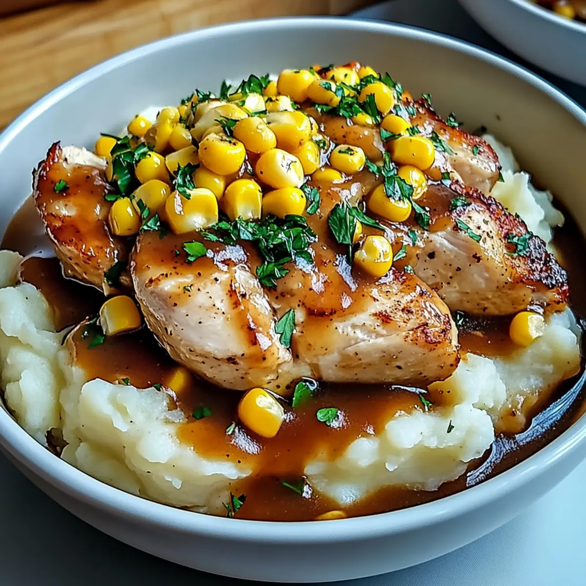 6. Assemble bowls by placing mashed potatoes at the bottom, topping with corn, and arranging sliced chicken on top.