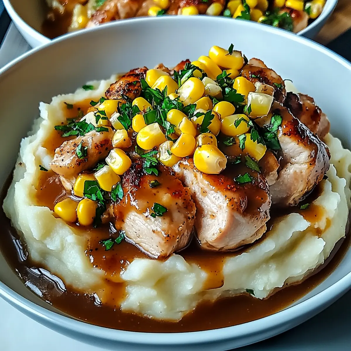 To assemble your Chicken Mashed Potato Bowls, start by placing a generous scoop of the warm mashed potatoes at the bottom of each bowl. Next, add the cooked corn on top of the mashed potatoes, ensuring an even layer. Finally, slice the seared chicken and arrange it beautifully over the corn, creating an inviting presentation.