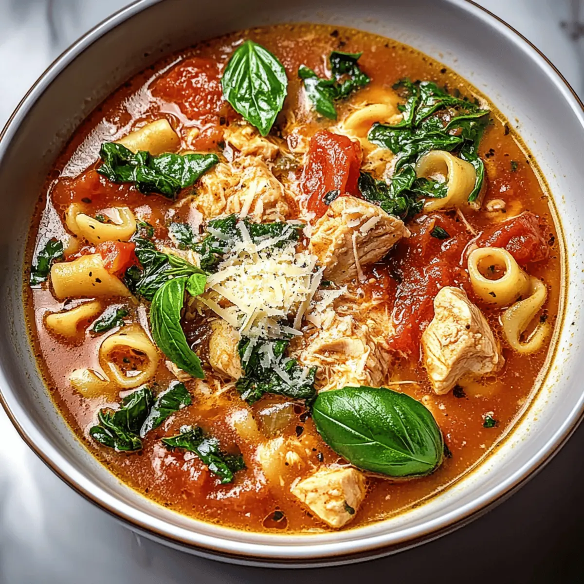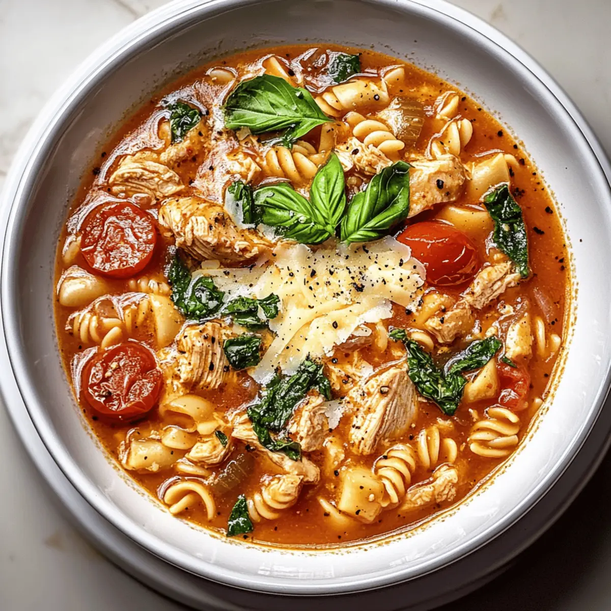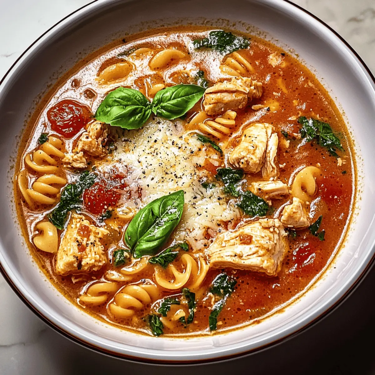 Jump to Recipe Print RecipeAs I stirred the pot, the enticing aroma of garlic and herbs wafted through my kitchen, transporting me straight to a rustic Italian trattoria. The moment I set my sights on this Chicken Parmesan Soup, I knew it was destined to become a family favorite. This recipe seamlessly combines tender chicken, savory tomatoes, and gooey melted cheese into a hearty masterpiece that’s not only comforting but also beginner-friendly—making it perfect for those busy weeknights or cozy weekends. Imagine serving up a bowl filled with soul-warming goodness in under an hour, all while keeping calories in check! Are you ready to embrace the delicious journey of cooking this nourishing soup? Let’s dive in! Why is this Chicken Parmesan Soup special? Comforting warmth: This soup is like a hug in a bowl, perfect for chilly evenings or when you need a little extra cheer. Flavor-packed: The rich combination of chicken, tomatoes, and herbs tantalizes your taste buds, making it a dish everyone will rave about. Effortless prep: From novice chefs to seasoned pros, this beginner-friendly recipe comes together in under an hour, letting you savor homecooked goodness without the hassle. Versatile ingredients: Feel free to customize with extra veggies or pasta types, just like you can with my Garlic Parmesan Chicken or Cheesy Garlic Chicken. Crowd-pleaser: Whether it’s a family dinner or a cozy night in, this soup is sure to impress and become a go-to favorite! Chicken Parmesan Soup Ingredients For the Soup • Olive oil – Adds richness and helps sauté aromatics; substitute with avocado oil for a lighter option. • Medium onion (diced) – Provides a sweet, savory base when cooked; can substitute with shallots for a milder flavor. • Garlic (minced) – Imparts warmth and aromatic complexity; fresh garlic is recommended for best flavor. • Boneless, skinless chicken breasts – The main protein source, cut into bite-sized pieces; substitute with rotisserie chicken for a quicker option. • Dried oregano – Contributes earthy Mediterranean flavor; fresh oregano can be used in three times the amount. • Dried basil – Enhances the soup’s Italian essence; fresh basil is a great substitute. • Crushed red pepper flakes – Provide a gentle heat to balance the richness; omit for a milder flavor. • Salt and pepper – Essential for seasoning; adjust to taste for a balanced flavor profile. • Chicken broth – The primary liquid base for the soup; vegetable broth works well for a lighter option. • Diced tomatoes (canned) – Adds acidity and texture, mimicking the warmth of tomato sauce; fresh tomatoes can be substituted when in season. • Tomato paste – Deepens the tomato flavor; pureed sundried tomatoes serve as a similar substitute. • Small pasta (e.g., ditalini, elbow macaroni) – Adds chewiness and heartiness; any small pasta shape will work. • Freshly grated Parmesan cheese – Offers savory and nutty notes that melt smoothly into the soup; Pecorino Romano can replace it for a sharper taste. • Chopped fresh spinach or kale – Introduces nutrition and color while wilting into the soup; Swiss chard is another great option. For Garnish and Serving • Fresh basil leaves (for garnish) – Brighten the final presentation; parsley can add a different flavor. • Grated mozzarella cheese (for serving) – Enhances cheesiness; cheddar or a vegan alternative can be used for variety. • Crusty bread (for serving) – Perfect for dipping, adding delightful texture; consider ciabatta or a French baguette. Each ingredient plays a crucial role in creating this delightful Chicken Parmesan Soup, ensuring that every spoonful is filled with comforting flavors and warmth. Enjoy the process of cooking and the joy of sharing this beloved dish! Step‑by‑Step Instructions for Chicken Parmesan Soup Step 1: Sauté Aromatics In a large pot over medium heat, warm 2 tablespoons of olive oil. Add the diced medium onion and sauté for 4-5 minutes until it turns translucent and fragrant. Then, stir in 3 cloves of minced garlic and cook for an additional minute, allowing the garlic to become aromatic and golden. Step 2: Cook the Chicken Next, add the cut bite-sized pieces of boneless, skinless chicken breasts to the pot. Cook the chicken for about 6-8 minutes, stirring occasionally, until it’s lightly browned and cooked through. The chicken should no longer be pink in the center, giving your Chicken Parmesan Soup a hearty protein base. Step 3: Add Herbs and Seasonings Sprinkle in 1 teaspoon each of dried oregano and dried basil, along with red pepper flakes, salt, and pepper to taste. Stir the mixture well, allowing the herbs to bloom and coat the chicken, enhancing the flavors in your Chicken Parmesan Soup for a few minutes. Step 4: Incorporate Liquids Pour in 4 cups of chicken broth, followed by a can of diced tomatoes and 2 tablespoons of tomato paste. Stir everything together and bring the mixture to a gentle boil over medium-high heat, watching for bubbles to form around the edges of the pot—this will deepen the flavors as it cooks. Step 5: Add Pasta Once boiling, add your small pasta (like ditalini or elbow macaroni) into the simmering broth. Cook according to the package instructions, approximately 8-10 minutes, stirring occasionally until the pasta reaches al dente texture, absorbing the rich flavors of the Chicken Parmesan Soup. Step 6: Stir in Greens and Cheese After the pasta is cooked, reduce the heat to low and add in 1 cup of freshly grated Parmesan cheese and a handful of chopped fresh spinach or kale. Stir for about 2-3 minutes until the greens wilt and the cheese melts, creating a creamy and comforting texture in your Chicken Parmesan Soup. Step 7: Final Seasoning Adjustment Taste the soup and adjust seasoning with more salt and pepper as desired. This step is crucial to ensuring your Chicken Parmesan Soup is seasoned just right, allowing all the wonderful flavors to 