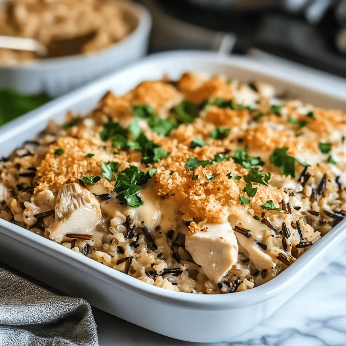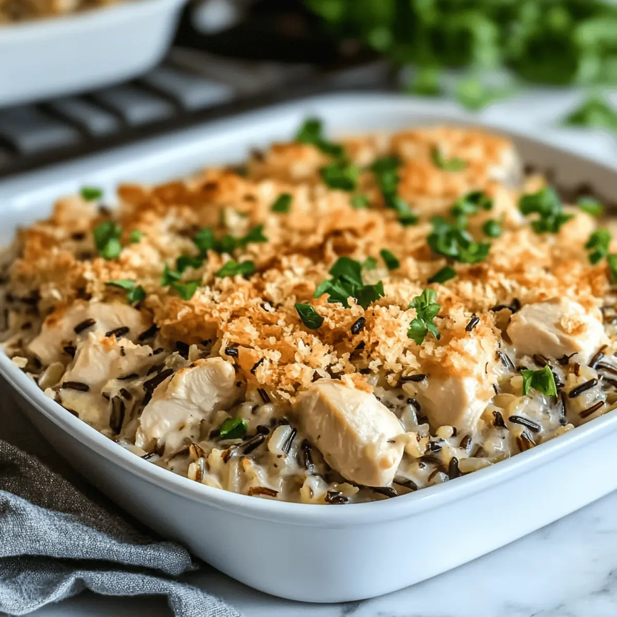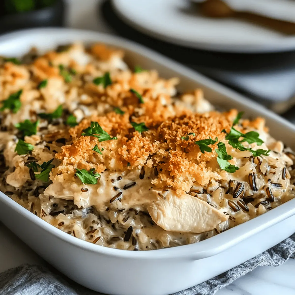 Jump to Recipe Print RecipeAs the oven hums gently, a delightful pairing of nostalgia and hunger fills the air, reminding me of cozy family gatherings. This Chicken Wild Rice Casserole marries creamy textures with a cheesy, crispy topping, creating a dish that not only warms the stomach but also the heart. Among its many virtues, this recipe shines due to its quick prep time and the ability to be tailored for gluten-free diets with a simple swap of ingredients. It’s more than just comfort food; it’s a family-friendly hug in a casserole dish, perfect for making memories around the dinner table. Ready to discover how to make this delightful meal that brings everyone together? Let’s dive in! Why is Chicken Wild Rice Casserole a Must-Try? Comforting and Nostalgic: This Chicken Wild Rice Casserole brings warmth and familiarity to your dinner table, evoking memories of family gatherings. Quick Preparation: With minimal effort, you’ll have a hearty meal ready in no time, perfect for busy weeknights. Versatile Options: Easily switch out ingredients for dietary needs or personal preferences, like trying a gluten-free blend or experimenting with different vegetables. Crowd Pleaser: It’s a surefire hit at family dinners, making it the ultimate main dish alongside a fresh salad or steamed veggies. One-Pan Wonder: Less cleanup means more time enjoying your delicious creation, making this casserole both practical and delightful! If you’re looking for more cozy options, check out our Vegetable Casserole Cozy or Cheesy Garlic Chicken. Chicken Wild Rice Casserole Ingredients Discover the key ingredients required to prepare this comforting dish. For the Base Wild Rice Blend – Provides the hearty base; consider using a gluten-free blend for dietary needs. Unsalted Butter – Adds richness and flavor; can substitute with olive oil for a dairy-free option. Cooked Chicken Breasts – Supply protein; rotisserie chicken can be a convenient alternative. For the Vegetables Celery – Adds crunch and subtle flavor; fresh or frozen works well; finely chopped for even cooking. Onion – Enhances flavor depth; yellow or white onions are best; shallots can be used for a milder taste. Portabella Mushrooms – Provide a meaty texture and earthy flavor; replace with button mushrooms if unavailable. For the Sauce All-Purpose Flour – Thicken the sauce; a gluten-free flour blend can be used as a substitute. Chicken Stock – Adds moisture and flavor; homemade stock is preferred, but store-bought works fine. Whole Milk – Contributes creaminess; can substitute with plant-based milk for a dairy-free version. Salt and Pepper – Season to taste; adjust according to dietary preferences. For the Cheesy Topping Shredded Cheddar Cheese – Adds creamy texture and richness; use sharp cheddar for more flavor; vegan cheese can be used as an alternative. Panko Bread Crumbs – Creates a crunchy topping; gluten-free panko is a suitable substitute. Parmesan Cheese – Provides salty depth; can use nutritional yeast for a vegan option; reduce amount if using salty substitutes. Step‑by‑Step Instructions for Chicken Wild Rice Casserole Step 1: Prepare Wild Rice Start by bringing a saucepan of water to a boil, then add the wild rice blend. Cover the pot and let it simmer for about 25–30 minutes, or until the rice is slightly firm—this is crucial for the perfect Chicken Wild Rice Casserole. Once done, drain any excess water and set it aside while you prep the rest of the dish. Step 2: Preheat Oven Preheat your oven to 350°F (175°C) to ensure it’s hot and ready. This temperature is perfect for creating a beautifully cooked Chicken Wild Rice Casserole with a crispy topping. While the oven heats, you can proceed with prepping your other ingredients. Step 3: Sauté Vegetables In a large skillet, melt 3 tablespoons of unsalted butter over medium-low heat. Add finely chopped celery and onion, cooking them until they are soft and translucent—roughly 3 to 5 minutes. The aroma of these sautéed vegetables will begin to fill your kitchen, setting the stage for your comforting casserole. Step 4: Cook Mushrooms Once the vegetables are soft, stir in sliced portabella mushrooms and increase the heat to medium-high. Sauté the mixture for about 3 minutes until the mushrooms are nicely softened and golden brown. This step adds depth and a savory element to your Chicken Wild Rice Casserole. Step 5: Create Roux Next, sprinkle in ¼ cup of all-purpose flour, stirring to combine and create a roux. Gradually pour in 2 cups of chicken stock and 1 cup of whole milk, whisking continuously until the mixture thickens—about 5 minutes. You want a smooth, creamy consistency that will envelop the chicken and rice perfectly. Step 6: Combine Ingredients Remove the skillet from heat and fold in the cooked chicken and both shredded cheddar and parmesan cheese. Season the filling generously with salt and pepper to taste, stirring until the mixture is well combined and cheesy. This is what makes your Chicken Wild Rice Casserole so delightfully creamy. Step 7: Assemble Casserole In a greased casserole dish, gently fold the cooked wild rice into the cheesy chicken mixture. Use a spatula to ensure everything is evenly distributed. The colorful blend of ingredients promises a hearty meal that will be a hit at your family table. Step 8: Prepare Topping In a small bowl, combine 1 cup of panko bread crumbs with 2 tablespoons of melted butter and an additional ¼ cup of grated parmesan cheese. Mix well, then sprinkle this crunchy topping evenly over your casserole. This step gives it that golden perfection we all love. Step 9: Bake Finally, place the casserole in your preheated oven and bake for 35 to 40 minutes. You’ll know it’s ready when the top is golden brown and the whole dish is bubbling with deliciousness. Allow it to cool slightly before serving, and enjoy the warmth of this Chicken Wild Rice Casserole with your loved ones. Expert Tips for