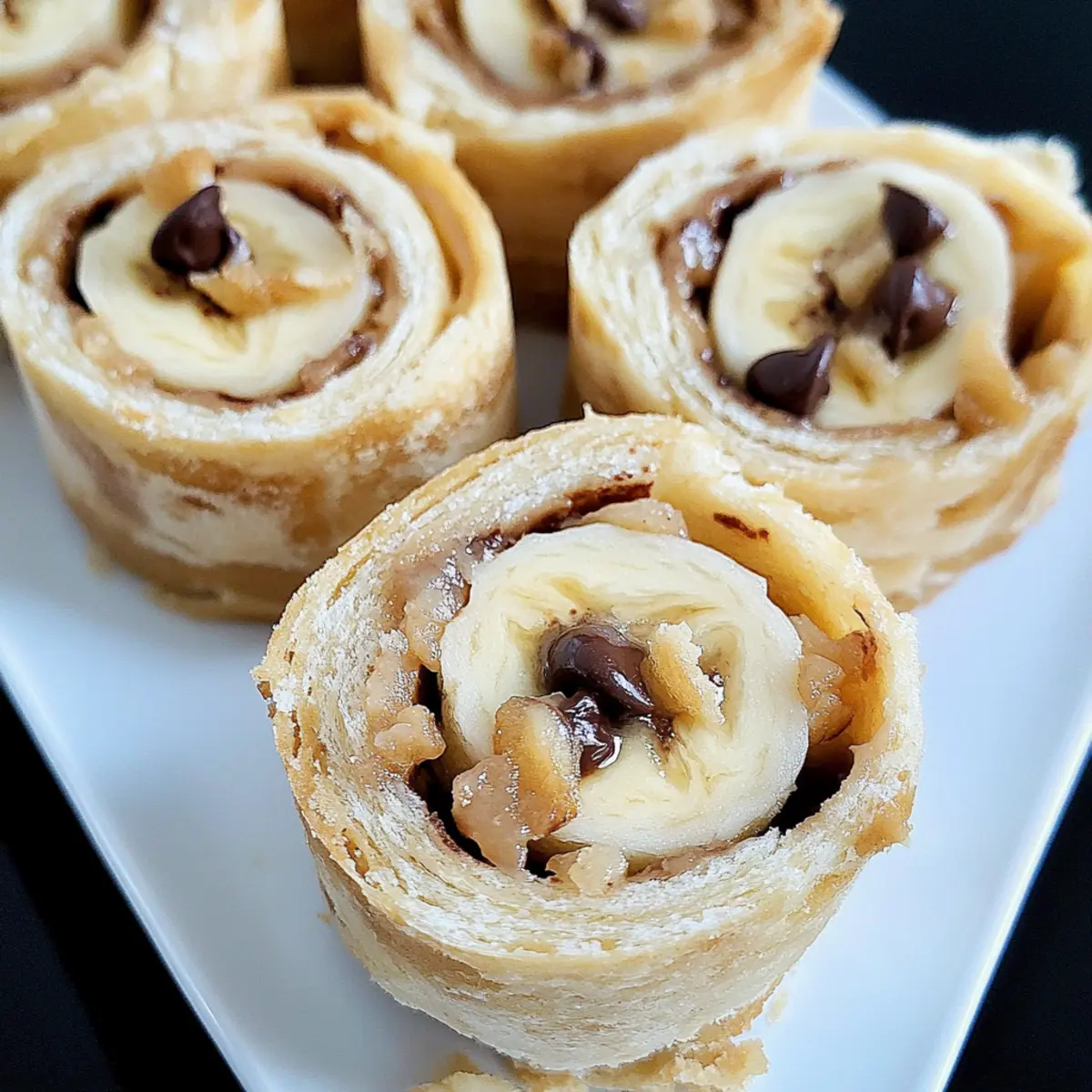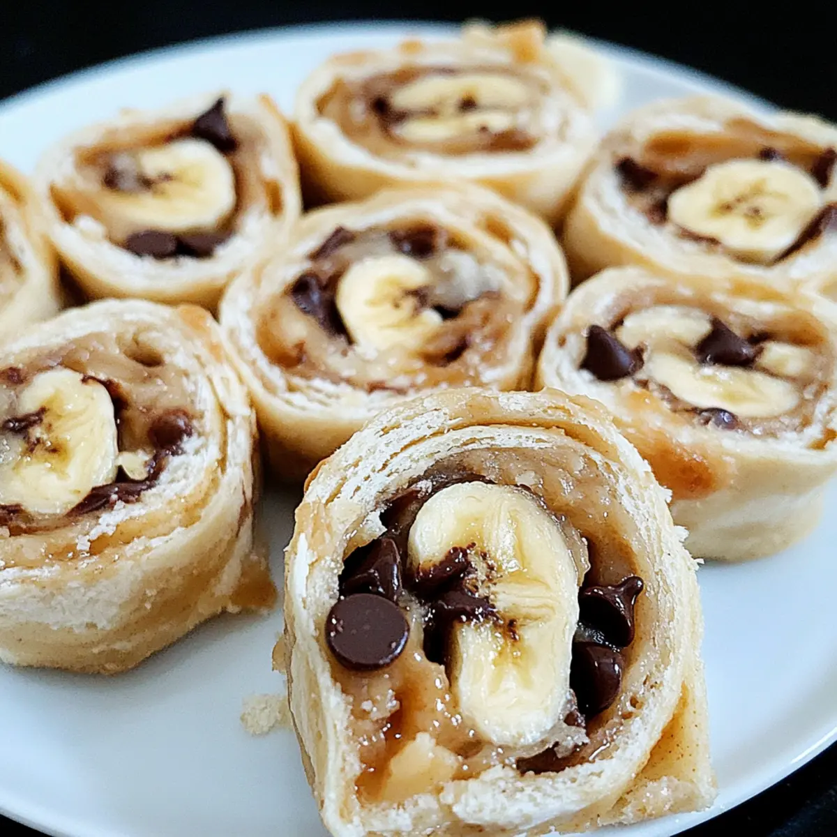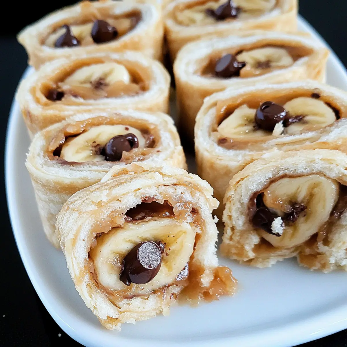 Jump to Recipe Print RecipeIn the midst of a hectic week, I stumbled upon a delightful snack that ticked all the boxes: the Chocolate Chip Peanut Butter Banana Roll Ups. You wouldn’t believe how quickly they come together—just five minutes and a few simple ingredients to create a tasty treat that kids and adults alike will adore! Packed with protein from creamy peanut butter and a natural sweetness from ripe bananas, these no-bake roll-ups are perfect for a quick snack or a light dessert. Plus, they’re easy to customize for any taste, whether you’re swapping out chocolate chips for dried fruit or adding a sprinkle of cinnamon. Curious about how this simple yet satisfying snack comes to life? Let’s dive in! Why are these roll ups a game changer? Quick Preparation: In just five minutes, you can whip up these delicious Chocolate Chip Peanut Butter Banana Roll Ups, making them a perfect solution for busy days. Nutritious Ingredients: Packed with protein and vitamins, they’re a guilt-free treat that satisfies your sweet cravings in a healthy way. Customizable Delight: Whether you want to swap chocolate chips for dried fruit or use almond butter for a nut-free option, these roll ups cater to any preference. Kid-Approved: Kids love them! They’re a fun and engaging snack that’s both tasty and pleasing to the eyes. No-Bake Convenience: Forget about turning on the oven; these roll ups are ideal for warm weather or anytime you seek a hassle-free dessert. Make-Ahead Friendly: Prepare them in advance, and you have a delicious snack ready to go whenever hunger strikes! Chocolate Chip Peanut Butter Banana Roll Ups Ingredients For the Roll Ups • Tortilla – A versatile base for the roll-ups; feel free to use whole wheat or gluten-free tortillas for a healthier twist. • Peanut Butter – Adds creamy texture and protein; almond butter makes a great nut-free substitute. • Banana – Provides natural sweetness and moisture; choose ripe bananas for maximum flavor. • Chocolate Chips – Enhances sweetness with a delightful chocolate flavor; dark chocolate chips can offer a richer option. • Chopped Pecans – Introduces a satisfying crunch; walnuts are a perfect alternative or you can opt to omit them entirely. • Honey – Adds a touch of sweetness and gooiness; replace with agave syrup for a vegan-friendly choice. Get ready to enjoy these Chocolate Chip Peanut Butter Banana Roll Ups—a snack that brings joy in every bite! Step‑by‑Step Instructions for Chocolate Chip Peanut Butter Banana Roll Ups Step 1: Prepare Your Tortilla Start by laying a tortilla flat on a clean surface. Use a spatula to spread 2.5 tablespoons of creamy peanut butter evenly across the tortilla, leaving a small border around the edges. This step is crucial for ensuring that the peanut butter adheres well when you roll it up, providing a delicious foundation for your Chocolate Chip Peanut Butter Banana Roll Ups. Step 2: Add the Banana Next, peel a ripe banana and slice it into thin rounds. Arrange the banana slices evenly on top of the peanut butter layer, making sure to cover it completely. The banana adds natural sweetness and moisture, which balances the richness of the peanut butter. This colorful layer creates a visually appealing layer in your roll-ups. Step 3: Sprinkle with Sweetness Sprinkle approximately ½ tablespoon each of chocolate chips and chopped pecans evenly over the banana slices. The chocolate chips will melt slightly when the roll-up is refrigerated, creating gooey pockets of goodness, while the pecans add a delightful crunch. This combination elevates your Chocolate Chip Peanut Butter Banana Roll Ups to a whole new level of deliciousness. Step 4: Drizzle with Honey For an extra touch of sweetness, take ½ teaspoon of honey and drizzle it over the chocolate chips and nuts. This step enhances the flavor and binds the ingredients together, ensuring every bite of the roll-up is sweet and satisfying. If you’re looking for a vegan option, agave syrup is a great substitute here. Step 5: Roll It Up Tight Carefully begin rolling the tortilla from one end, keeping everything tightly packed as you go. Aim to keep the roll snug without squeezing too hard, as you don’t want the filling to burst out. Once you reach the other end, press it lightly to seal the roll-up, creating a beautiful Chocolate Chip Peanut Butter Banana Roll Up. Step 6: Chill Before Slicing Wrap the rolled tortilla in plastic foil and place it in the refrigerator for about 15 minutes. This chilling time allows the roll-up to firm up, making it easier to slice without falling apart. The flavors will meld beautifully during this time, readying your treat for a delightful experience. Step 7: Slice and Serve Once chilled, unwrap the roll-up and use a sharp knife to slice it into pinwheels, about 1-inch thick. Arrange the sliced pieces on a serving plate, showcasing the vibrant colors and enticing layers. These Chocolate Chip Peanut Butter Banana Roll Ups are now ready to be enjoyed as a quick snack or dessert! Make Ahead Options These Chocolate Chip Peanut Butter Banana Roll Ups are perfect for busy home cooks looking to save time! You can prep the roll-ups up to 24 hours in advance by following a few simple steps. Start by spreading the peanut butter and layering the banana, chocolate chips, and pecans on the tortilla, but avoid drizzling with honey until just before serving to maintain their freshness. Wrap each roll tightly in plastic foil and refrigerate. When you’re ready to enjoy, simply unwrap, drizzle with honey, slice into pinwheels, and serve. This ensures your roll-ups are just as delicious and satisfying on-the-go! Expert Tips for Chocolate Chip Peanut Butter Banana Roll Ups Banana Freshness: To keep bananas from browning, brush them lightly with lemon juice if you’re not serving them right away. This helps retain their vibrant color and freshness. Tightly Roll Up: Ensure you tightly roll the tortilla to maintain