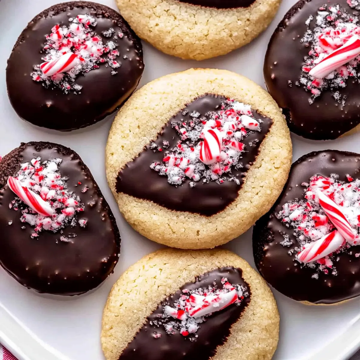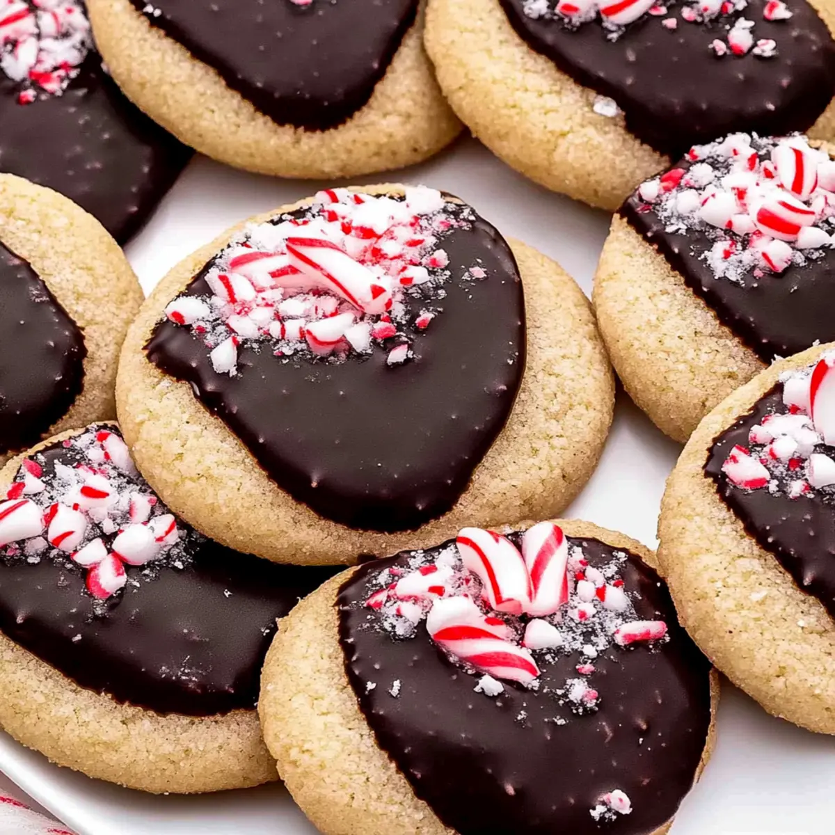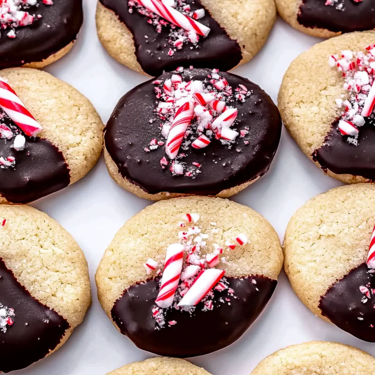 Jump to Recipe Print RecipeAs I whisked together the ingredients, a wave of nostalgia washed over me—those familiar aromas whisked me back to cozy evenings spent baking with family during the holidays. The star of this festive moment? My favorite Chocolate Dipped Peppermint Sugar Cookies! This delightful recipe brings together the perfect balance of chewy, buttery goodness enveloped in rich dark chocolate, adorned with crunchy candy cane pieces. Not only do these cookies make a stunning centerpiece for any holiday gathering, but they’re also incredibly easy to whip up, ensuring you spend less time in the kitchen and more time creating memories. Are you ready to fill your home with that irresistible peppermint scent? Let’s get baking! Why Are These Cookies a Must-Bake? Chewy Delight: The soft, buttery texture of these cookies makes each bite a delightful experience, perfectly complemented by the rich chocolate coating. Festive Flavor: Infused with refreshing peppermint, these cookies capture the essence of the holiday spirit, making them a festive favorite for gatherings and cookie swaps. Quick and Easy: With straightforward instructions, you can have these delicious treats ready in no time—ideal for busy holiday schedules. Versatile Toppings: While crushed candy canes add the perfect crunch, feel free to get creative with toppings or even try variations like Fudgy Chocolate Brownies for a different twist. Seasonal Appeal: These Chocolate Dipped Peppermint Sugar Cookies are sure to impress friends and family, becoming a highlight of your holiday baking! Chocolate Dipped Peppermint Sugar Cookies Ingredients Get ready to whip up these festive delights with the following essential ingredients! For the Cookie Dough All-Purpose Flour – Provides structure to the cookies; be sure to spoon and level for the best results. Baking Powder – Acts as a leavening agent, ensuring the cookies rise to buttery perfection. Salt – Enhances sweetness and balances the delicious flavors in each bite. Unsalted Butter – Adds richness and moisture; remember to soften it for easy mixing. Granulated Sugar – Sweetens the cookies and contributes to their delightful chewy texture. Egg – Binds everything together while adding moisture, ensuring a tender bite. Peppermint Extract – Imparts that refreshing, signature peppermint flavor; adjust to taste for a personalized touch. Vanilla Extract – Balances the sweetness while complementing the peppermint nicely. For the Chocolate Coating Semi-Sweet Chocolate Chips – Creates a rich chocolatey coat; milk chocolate can be used for those with a sweeter tooth. Coconut Oil – Helps the chocolate melt smoothly and set softer; you can omit this, but it may impact the texture. For the Toppings Crushed Candy Canes – Adds a festive crunch and peppermint flavor; make sure they are finely crushed for even distribution. These Chocolate Dipped Peppermint Sugar Cookies are not just tasty—they’re a classic treat that will become a cherished part of your holiday baking traditions! Step‑by‑Step Instructions for Chocolate Dipped Peppermint Sugar Cookies Step 1: Preheat the Oven Begin by preheating your oven to 350°F (175°C). While the oven heats up, line two baking sheets with parchment paper, ensuring the surfaces are ready to receive your delightful Chocolate Dipped Peppermint Sugar Cookies. Step 2: Mix the Dry Ingredients In a medium bowl, combine 2 cups of all-purpose flour, 1 teaspoon of baking powder, and ½ teaspoon of salt. Whisk these ingredients together until they are well blended. Setting aside this dry mixture prepares your cookies for the next step. Step 3: Cream the Butter and Sugar In a large bowl, cream together ¾ cup of softened unsalted butter and 1 cup of granulated sugar using an electric mixer on medium speed. Mix them for about 2 minutes until the mixture appears pale and fluffy, which creates the perfect base for your cookies. Step 4: Add the Wet Ingredients Next, add in 1 large egg, 1 teaspoon of peppermint extract, and 1 teaspoon of vanilla extract to the butter-sugar mixture. Beat everything together on medium speed for about 1 minute, or until the mixture is light and fluffy, enhancing the flavors of your Chocolate Dipped Peppermint Sugar Cookies. Step 5: Combine Dry and Wet Ingredients Gradually mix in the reserved dry ingredients until everything is just combined. Avoid over-mixing to keep your cookies soft. You should see a cohesive dough forming, ready to become delightful holiday treats. Step 6: Shape the Cookie Dough Using a cookie scoop or spoon, portion out 36 balls of dough, and roll them into smooth balls. Place each ball on the prepared baking sheets, spacing them about 2 inches apart. Press down slightly on each ball to flatten them just a tad for even baking. Step 7: Bake the Cookies Place the baking sheets in your preheated oven and bake for 9 to 11 minutes, or until the edges are slightly golden. Keep an eye on them, as you want a soft, chewy center! Once done, allow the cookies to cool on the baking sheets for a few minutes before transferring them to a cooling rack. Step 8: Melt the Chocolate While the cookies cool, melt 1 cup of semi-sweet chocolate chips and 1 tablespoon of coconut oil in a microwave-safe bowl. Heat in 30-second intervals, stirring after each session until the mixture is thoroughly smooth and melted, ready for dipping your cookies. Step 9: Dip the Cookies After the cookies have fully cooled, dip each one halfway into the melted chocolate. Let any excess chocolate drip off, then sprinkle the top with crushed candy canes for a festive touch. This step elevates your Chocolate Dipped Peppermint Sugar Cookies to a new level! Step 10: Set the Chocolate To allow the chocolate to set, place the dipped cookies on a wire rack or parchment paper and pop them into the refrigerator for about 10 minutes. This quick chill will ensure the chocolate hardens perfectly, completing your delightful holiday treat. S