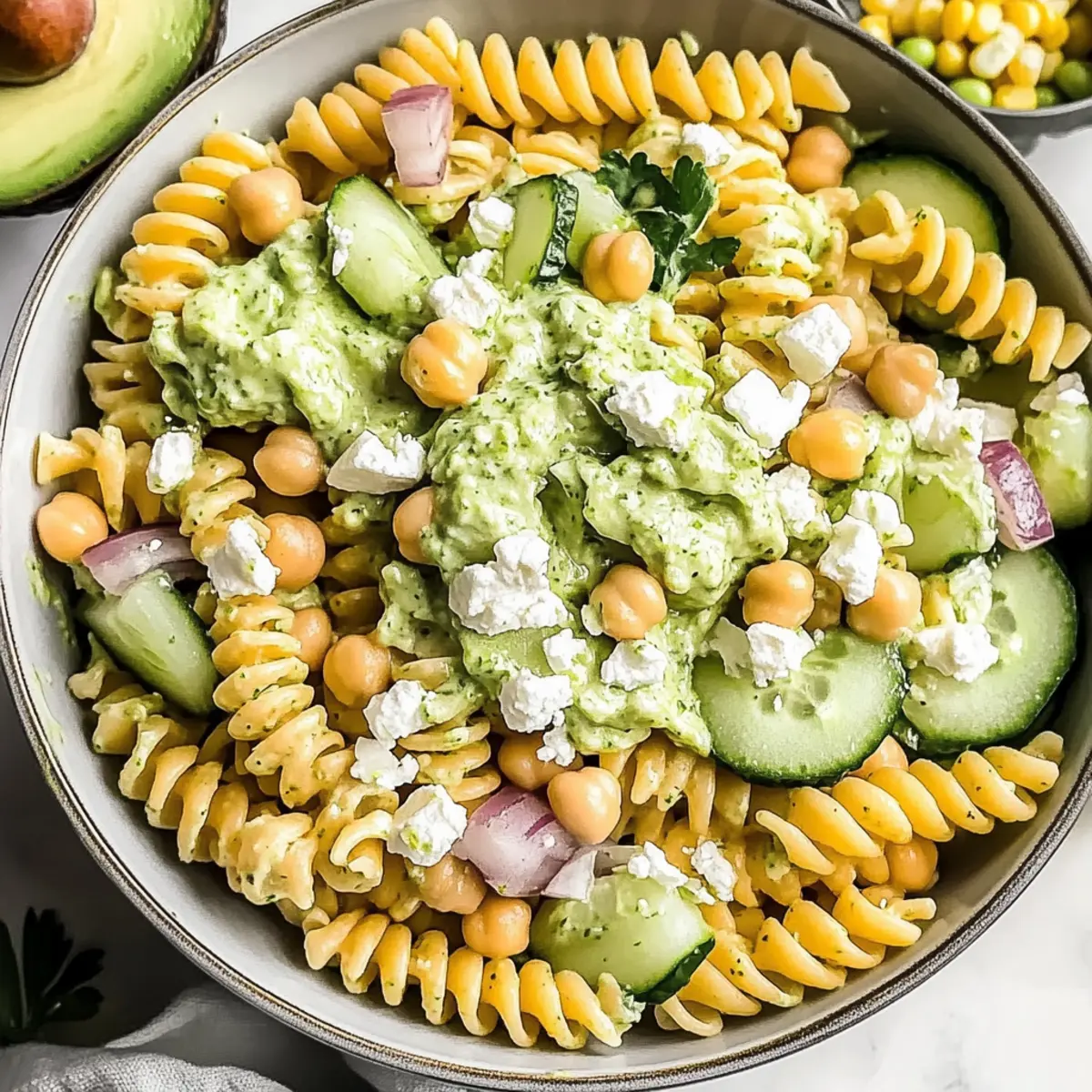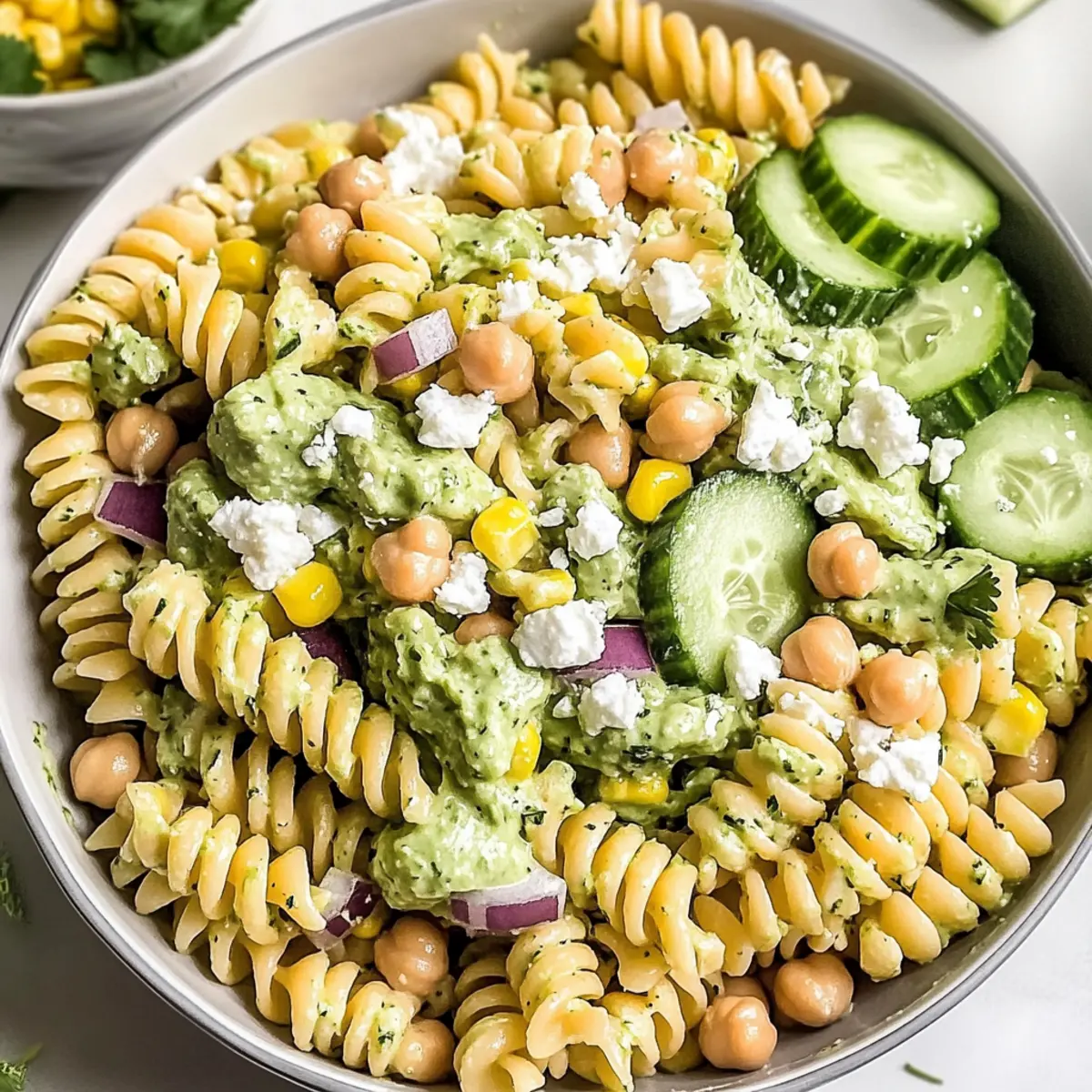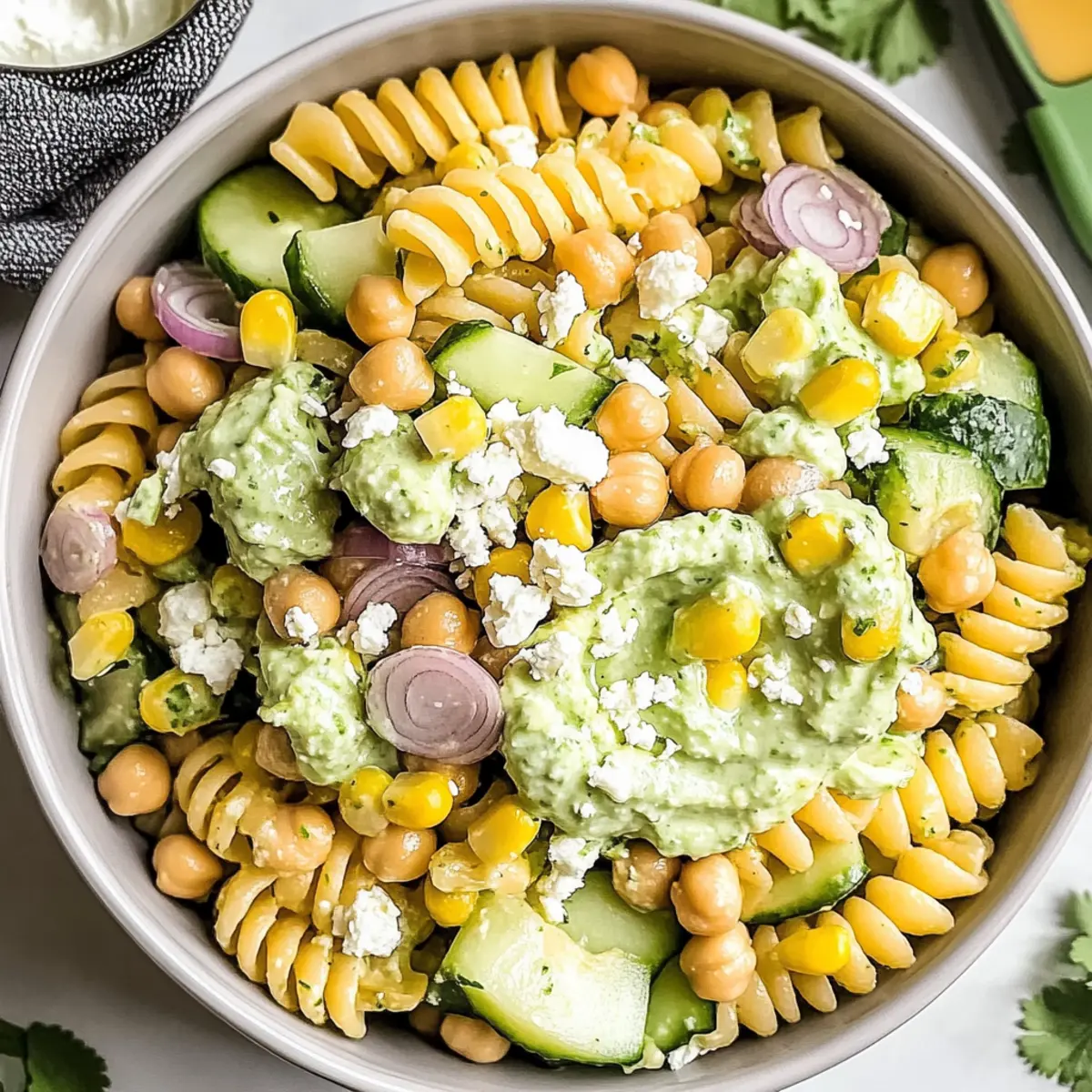 Jump to Recipe Print RecipeAs I whisked together the dressing for this Creamy Cilantro Lime Pasta Salad, I couldn’t help but feel a wave of satisfaction. With each zesty splash of lime and fragrant handful of cilantro, the anticipation grew for this high-protein delight bursting with freshness. This recipe isn’t just a bright, colorful dish—it’s also a lifesaver for busy weeknights. You can easily whip it up in under an hour, and it keeps well, making it perfect for meal prep or a delightful party snack. The creamy texture from Greek yogurt mingling with the crunch of cucumbers and the heartiness of chickpeas creates a memorable experience, ensuring everyone at your table feels nourished and satisfied. Are you ready to dive into a bowl of vibrant flavors? Let’s get cooking! Why is This Salad So Appealing? Vibrant Flavors: The tangy lime and fresh cilantro create a refreshing and uplifting taste that’s perfect for any occasion. Creamy Texture: Using Greek yogurt makes the dressing not only creamy but also a healthier alternative to traditional dressings. Protein-Packed: The addition of chickpeas ensures this dish keeps you full and satisfied, making it an ideal choice for vegetarians and health-conscious eaters alike. Meal Prep Friendly: Easily prepare ahead for busy weeks; it stays flavorful in the fridge for days! For a quick side, check out my Cucumber Strawberry Salad. Customizable: Feel free to swap ingredients—try black beans for a twist or add your favorite protein. With all these options, there’s a version for everyone! Cilantro Lime Pasta Salad Ingredients For the Dressing • Greek Yogurt – Forms the creamy base of the dressing; substitute with regular yogurt for a similar taste. • Avocado – Adds richness and creamy texture; ensure it’s ripe or omit if not available. • Lime Juice – Provides the signature tang; use fresh lime for the best flavor. For the Salad • Pasta (short varieties like rotini, fusilli, or penne) – Serves as the main structure, cooked al dente; swap with quinoa for a gluten-free option. • Chickpeas (1 can, drained and rinsed) – Boosts protein and fiber content; can be replaced with black beans for diversity. • Corn (1 can, drained and rinsed) – Adds sweetness and crunch; fresh corn is ideal in summer. • Cucumber (1 medium, chopped) – Provides a refreshing crunch; use English cucumbers to minimize seeds. • Red Onion (1 small, diced) – Introduces sharpness and color; substitute with sweet onion for a milder taste. • Feta Cheese or Cotija Cheese (½ cup, crumbled) – Enhances creaminess and adds a salty kick; omit for a dairy-free version. For Garnish • Fresh Cilantro (optional) – Elevates flavor and presentation; omit if you’re not a fan. • Optional extra lime juice – Brightens the finished dish; adjust to taste. This Cilantro Lime Pasta Salad is not just a meal; it’s a canvas of flavors waiting for your creative touch! Step‑by‑Step Instructions for Cilantro Lime Pasta Salad Step 1: Prepare the Dressing In a blender, combine the Greek yogurt, ripe avocado, fresh lime juice, and a pinch of salt. Blend the mixture until it becomes smooth and creamy, taking about 1-2 minutes. Once blended, set the dressing aside for 10-15 minutes to allow the flavors to meld beautifully while you prepare the salad ingredients. Step 2: Cook the Pasta Bring a large pot of salted water to a boil over medium-high heat. Add your choice of short pasta, such as rotini or fusilli, and cook according to package instructions until al dente, usually about 8-10 minutes. Once cooked, drain the pasta and rinse under cold water until cool, preventing further cooking and helping to maintain its texture. Step 3: Combine Ingredients In a large mixing bowl, combine the cooled, drained pasta with the chickpeas, drained corn, chopped cucumber, and diced red onion. Gently mix everything together with a spatula or wooden spoon until the ingredients are evenly distributed, creating a colorful base for your cilantro lime pasta salad. Step 4: Dress the Salad Pour the creamy dressing over the salad mixture, ensuring everything is well coated. Use your spatula to gently toss the ingredients together, incorporating the dressing without breaking up the pasta or chickpeas. You’re creating a zesty and creamy mixture that brings the flavors of the Cilantro Lime Pasta Salad to life! Step 5: Fold in Cheese Add the crumbled feta or Cotija cheese into the bowl and squeeze extra lime juice over the top, if desired. Stir everything together once more, gently folding the cheese into the salad to add creaminess and a salty kick, enhancing the flavor profile of your dish. Step 6: Chill and Garnish Transfer the finished salad into a serving dish and, for presentation, garnish with fresh cilantro if using. Cover with plastic wrap or a lid and refrigerate for at least 30 minutes; this chilling time enhances the flavors, making every bite of your cilantro lime pasta salad even more delightful! Expert Tips for Cilantro Lime Pasta Salad Chill for Flavor: Letting the salad chill for at least 30 minutes before serving enhances the flavors, making it even more delicious. Rinse the Pasta: After cooking, rinse the pasta with cold water to stop the cooking process and maintain that perfect al dente texture. Customize Ingredients: Don’t hesitate to swap chickpeas for black beans or adjust veggies to suit your taste; the cilantro lime pasta salad is all about personalization. Store Dressing Separately: To keep the salad fresh, store the dressing separately and combine it just before serving to maintain crispness in the veggies. Use Fresh Lime Juice: For the brightest flavor, opt for freshly squeezed lime juice over bottled; it really makes a difference in the overall taste! Cilantro Lime Pasta Salad Variations Feel free to play with this recipe to suit your taste and dietary preferences! Chickpea Swap: Use black beans or kidney beans for varied flavor. Each option br