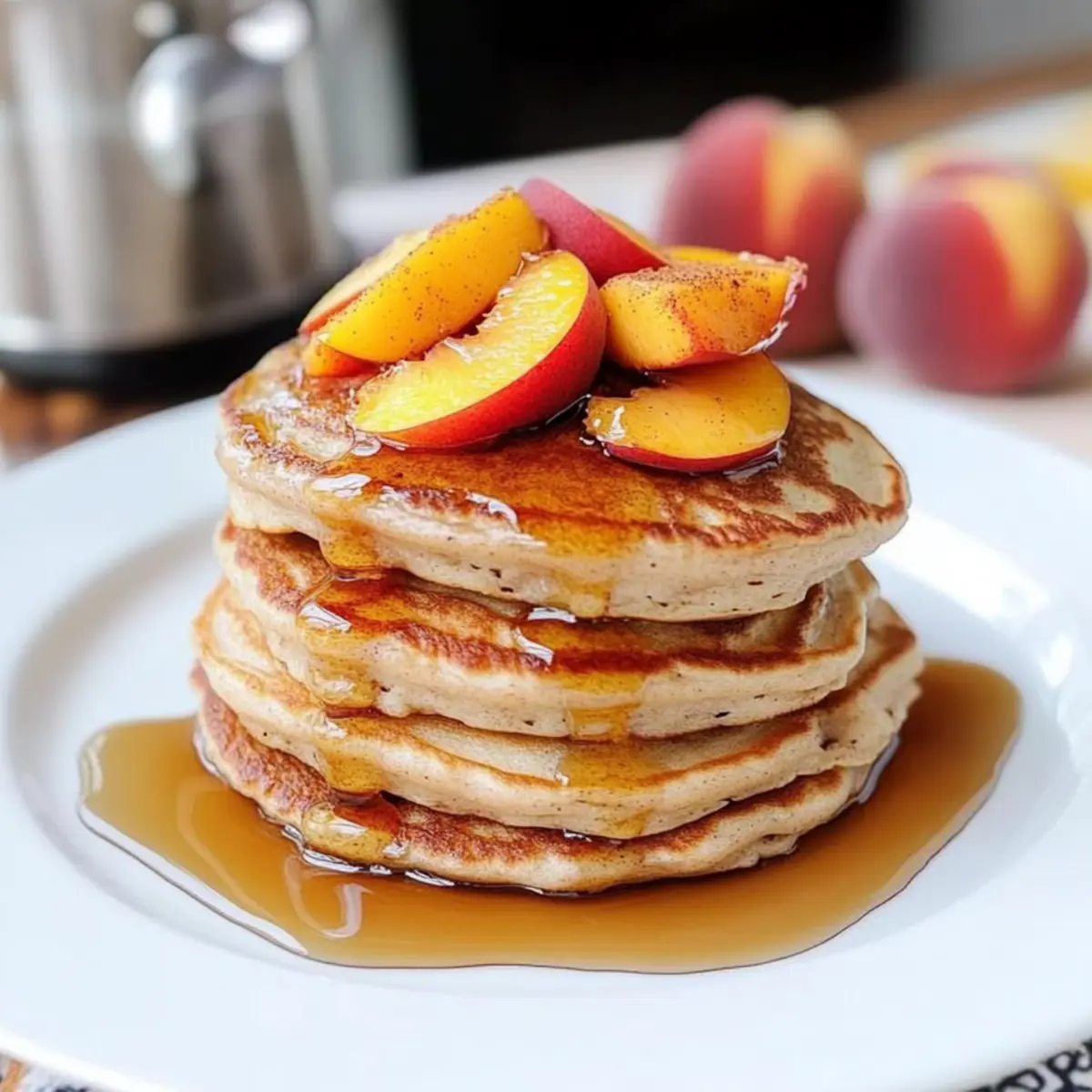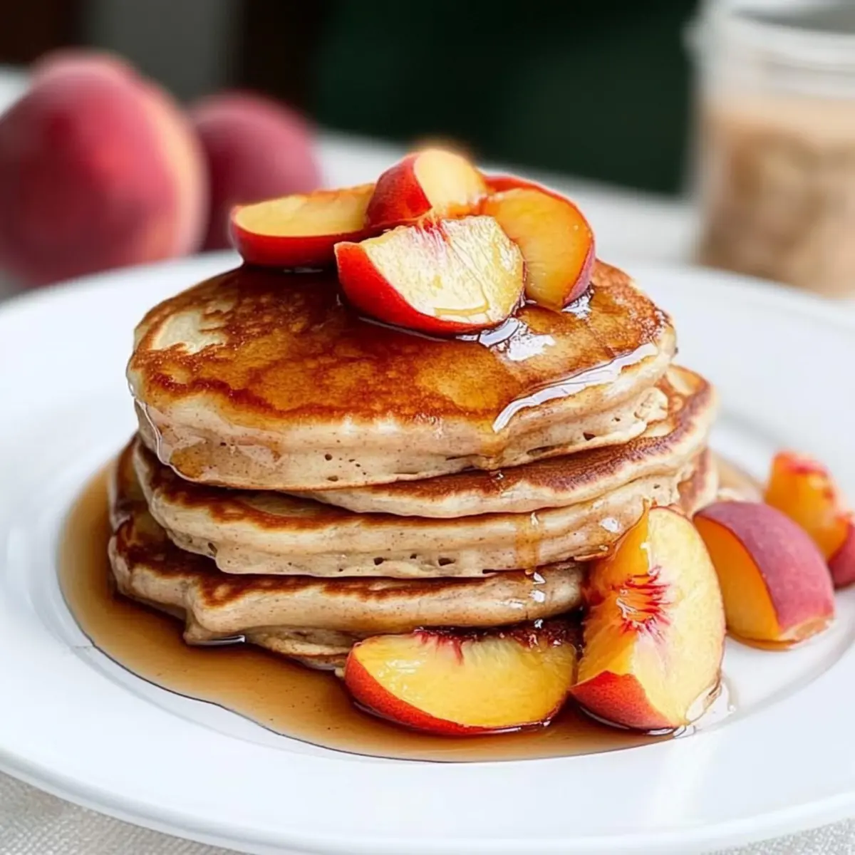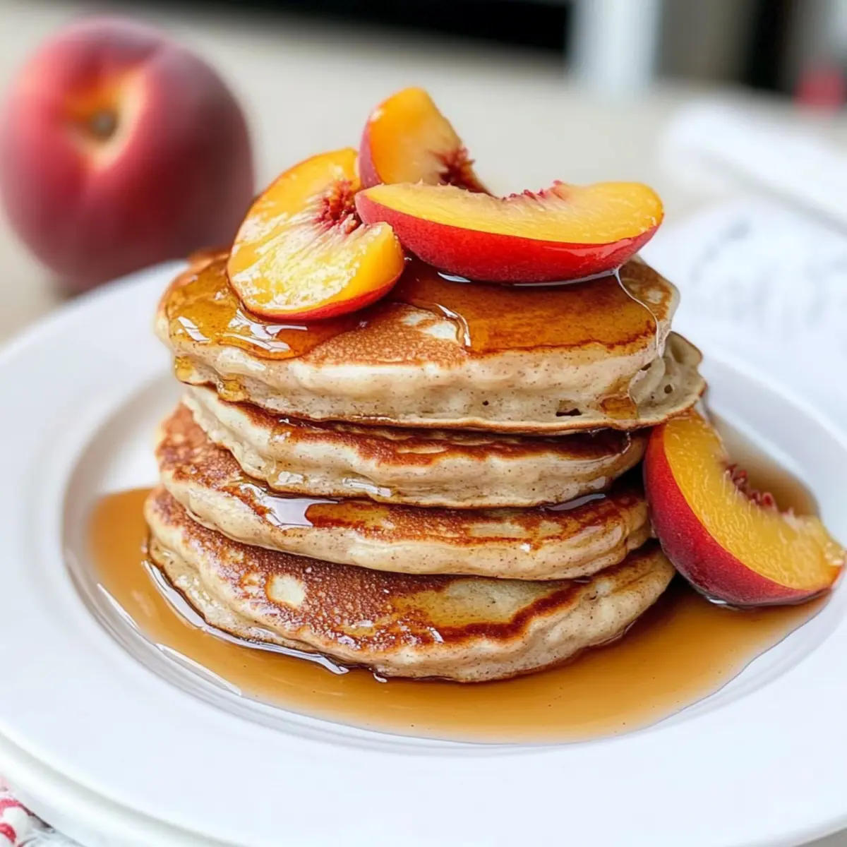 Jump to Recipe Print RecipeThe golden rays of morning sun filtered through my kitchen window as I flipped my first Cinnamon Peach Pancake, sending a sweet, spicy aroma wafting through the air. There’s something magical about the pairing of warm cinnamon and juicy peaches that transforms this breakfast staple into a delightful experience, perfect for lazy summer mornings. These fluffy pancakes are not just incredibly easy to whip up, but they are also a guaranteed crowd-pleaser, making any day feel special. Whether you’re starting your weekend brunch or treating your family on a weekday, these pancakes bring a comforting, homemade touch that will have everyone asking for seconds. Curious how to bring this deliciousness to your table? Let’s dive into the recipe! Why are Cinnamon Peach Pancakes special? Simplicity, These pancakes require minimal effort and basic cooking skills, making them perfect for both busy mornings and leisurely weekends. Fluffy Texture, With a balance of buttermilk and baking powder, they promise light, airy pancakes that melt in your mouth. Fresh Flavor, Bursting with juicy peaches and a hint of cinnamon, they evoke the sweetness of summer in every bite. Versatility, Whether served with maple syrup or a dollop of yogurt, you can easily customize these pancakes to fit your taste. For an even more delightful breakfast option, consider pairing them with Blueberry Cinnamon Rolls. Crowd-Pleaser, These pancakes are sure to impress family and friends, making them a go-to option for brunch gatherings. Cinnamon Peach Pancakes Ingredients Dive into the delightful ingredients that make these pancakes a summer favorite! For the Pancake Batter • All-Purpose Flour – Acts as the structure base; consider substituting with whole wheat flour for a nuttier flavor. • Sugar – This sweetener enhances flavor; substitute with honey or a sugar alternative for a healthier twist. • Salt – Balances flavors and brings out the sweetness; it’s an essential ingredient. • Baking Soda – Provides leavening for fluffy pancakes; do not replace unless you adjust with baking powder. • Cinnamon – Adds a comforting warmth to the pancakes; you can vary with nutmeg or pumpkin spice for an exciting twist. • Baking Powder – Helps with leavening; make sure it’s fresh for the best results. • Eggs – Binds the ingredients and adds richness; for a vegan option, consider flax eggs (1 tablespoon flaxseed meal + 2.5 tablespoons water). • Buttermilk – Ensures moisture and tenderness; you can substitute with a milk and vinegar mix (1 cup milk + 1 tablespoon vinegar). • Melted Butter – Adds richness and moisture; coconut oil can be a great dairy-free alternative. • Vanilla Extract – Enhances the flavor; opt for pure vanilla for the best taste. • Diced Fresh Peaches – The star of the dish, offering sweetness and flavor; you can switch to blueberries or bananas if desired. For Serving • Maple Syrup – A classic topping that brings added sweetness; serve with fresh peach slices for a delightful presentation. Step‑by‑Step Instructions for Cinnamon Peach Pancakes Step 1: Prepare Dry Mixture In a medium mixing bowl, whisk together 1 cup of all-purpose flour, 2 tablespoons of sugar, a pinch of salt, 1 teaspoon of baking soda, 1 teaspoon of baking powder, and 1 teaspoon of cinnamon until well combined and fluffy. This dry mixture lays the foundation for your Cinnamon Peach Pancakes, so ensure there are no lumps before proceeding. Step 2: Add Peaches Gently fold in 1 cup of diced fresh peaches into the dry mixture, making sure each peach piece gets a light coating of flour. This step not only prepares the peaches for incorporation but also prevents them from sinking to the bottom of the batter, ensuring a peachy bite in every pancake. Step 3: Mix Wet Ingredients In a large bowl, beat 1 large egg, then add 1 cup of buttermilk, 2 tablespoons of melted butter, and 1 teaspoon of vanilla extract. Mix gently with a whisk until just combined, avoiding overmixing. These wet ingredients create a rich, flavorful batter that will complement the spiced peaches perfectly. Step 4: Combine Mixtures Carefully add the dry flour mixture to the wet ingredients, stirring just until they are mixed together – be cautious not to overmix, as this can result in dense pancakes. The batter should be slightly lumpy, signaling it’s time to move on to cooking your Cinnamon Peach Pancakes. Step 5: Preheat Heat Source Place a griddle or large skillet on medium heat and allow it to warm up for a few minutes. Grease the surface with a little melted butter or cooking spray to prevent sticking. Properly preheating ensures that your pancakes will cook evenly, developing that delightful golden-brown crust. Step 6: Cook Pancakes Pour approximately ¼ cup of batter onto the hot griddle for each pancake. Cook until bubbles form on the surface and the edges appear set, about 4-5 minutes. Flip the pancakes carefully and cook for another 3-5 minutes until they are golden brown on both sides, ensuring a fluffy interior with a crisp exterior. Step 7: Serve Warm Transfer your beautifully cooked Cinnamon Peach Pancakes onto a plate, stacking them high for an enticing presentation. Garnish with additional fresh peach slices and drizzle generously with maple syrup for a deliciously sweet finish. These pancakes are best enjoyed warm, fresh off the griddle! What to Serve with Cinnamon Peach Pancakes These light and fluffy pancakes create a delightful breakfast experience, best enjoyed with complementary flavors and textures. Crispy Bacon: The savory saltiness of crispy bacon contrasts beautifully with the sweetness of the pancakes, providing a delicious balance. The smoky flavor enhances the meal, making each bite more satisfying. Fresh Fruit Salad: A colorful medley of seasonal fruits adds refreshing sweetness and vibrant colors to your breakfast table, lifting the flavors of the pancakes. Combine berries, melons, an