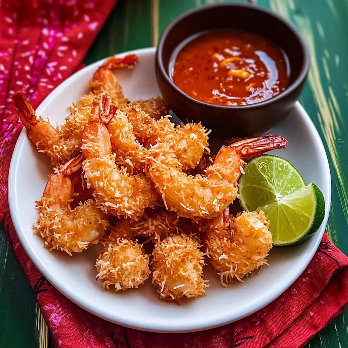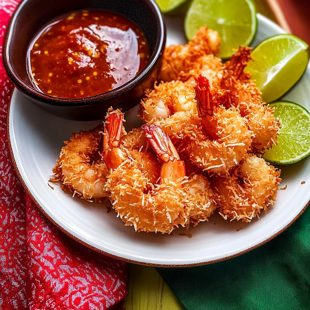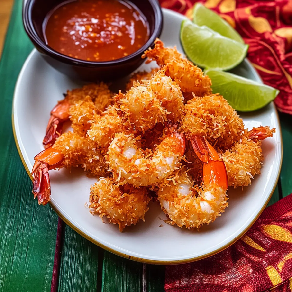 Jump to Recipe Print RecipeAs the sun sets and the ocean breeze flows, the thought of indulging in Crispy Coconut Shrimp fills my heart with joy. This delightful tropical appetizer transforms any gathering into a mini seaside escape, featuring crunchy coconut-crusted shrimp paired with a zesty chili orange dipping sauce. What I adore about this easy recipe is how quickly it comes together, making it perfect for parties or a cozy night in. Plus, it’s easily adaptable to fit gluten-free diets, so everyone can join in on the deliciousness. Are you ready to dive into a taste of paradise with every crunchy bite? Let’s get cooking! Why Is This Coconut Shrimp Irresistible? Simplicity: This delightful recipe is quick and easy, perfect for both novice and experienced cooks. Tropical Crunch: Each shrimp is enveloped in golden, crispy coconut, providing a satisfying crunch that transports you to a beachside paradise. Versatile Options: You can easily make this dish gluten-free by swapping in rice flour, ensuring everyone can enjoy it. Unforgettable Flavor: The pairing with a sweet and tangy spicy chili orange dipping sauce elevates the overall experience, making it a crowd-pleaser. Perfect for Gatherings: Ideal as an appetizer or served alongside light salads, this coconut shrimp is a standout at any gathering. Whether it’s game day or a cozy get-together, it’s sure to impress! Coconut Shrimp Ingredients For the Shrimp • Raw Shrimp – Use jumbo size (21/25) for a meaty bite; firm fish like tofu can be a great vegetarian alternative. • Salt – Enhances flavor and is essential for the brining process. • Egg – Acts as a binder, ensuring the coconut adheres nicely for that perfect crunch. • Water – Helps thin and smooth the batter for even coating. For the Breading • All-Purpose Flour – Adds structure to the batter; swap with gluten-free flour for dietary preferences. • Shredded Dried Unsweetened Coconut – Brings that irresistible tropical flavor and crunch; always choose unsweetened for the best taste! For Frying • Vegetable Oil – Essential for frying; select an oil with a high smoke point to achieve the best results. Enjoy creating this delicious coconut shrimp recipe that will tantalize your taste buds and impress your guests! Step‑by‑Step Instructions for Crispy Coconut Shrimp Step 1: Prepare the Dipping Sauce In a small bowl, combine 3 tablespoons of orange marmalade, 3 tablespoons of Thai sweet chili sauce, and 2 teaspoons of fresh lemon juice. Mix these ingredients well until the sauce is smooth and evenly combined. Set the bowl aside as the flavors meld together, creating a delectable dipping sauce for your crispy coconut shrimp. Step 2: Brine the Shrimp In a medium bowl, dissolve 2 teaspoons of salt in 1 cup of water. Peel and devein the jumbo shrimp, making sure they are clean and ready for cooking. Once prepared, immerse the shrimp in the saline brine for 10 to 15 minutes. This step will enhance the flavor and firmness of the shrimp, setting the stage for the crispy coconut crust. Step 3: Make the Batter In a shallow bowl, whisk together 1 large egg and 2 tablespoons of water until the mixture is smooth and combined. Gradually stir in 40 grams of all-purpose flour, mixing continuously until the batter is free of lumps. The batter should have a creamy consistency; this will help the coconut adhere to the shrimp beautifully during the next step. Step 4: Coat the Shrimp After brining, rinse the shrimp under cold water and pat them dry with paper towels. Working one at a time, dip each shrimp into the batter, ensuring they are evenly coated. Allow any excess batter to drip off, then roll the shrimp in the shredded coconut, pressing gently to help it stick. Lay the coated shrimp on a plate, ready for frying. Step 5: Fry the Shrimp In a deep pot, heat around 1 inch of vegetable oil to 360°F (180°C). Carefully place the coated shrimp in the oil, frying them in batches to avoid overcrowding. Cook for 2 to 3 minutes or until they turn a beautiful golden brown. Flip the shrimp halfway through to ensure even cooking, watching closely to avoid burning the coconut. Step 6: Drain and Serve Once the shrimp are crispy and golden, use a slotted spoon to transfer them to a wire rack lined with paper towels. This will allow any excess oil to drain off, keeping your coconut shrimp light and crispy. Serve the shrimp immediately alongside your flavorful dipping sauce, and enjoy this tropical treat with friends and family! What to Serve with Crispy Coconut Shrimp? Pairing your crispy coconut shrimp with complementary sides and drinks can elevate your tropical feast into an unforgettable dining experience. Fresh Tropical Salad: Light and refreshing, a tropical salad with mango and avocado balances the shrimp’s crunchiness. The sweetness and creaminess enhance every bite. Cilantro Lime Rice: This zesty rice dish adds a burst of flavor and complements the shrimp’s sweetness while providing a satisfying backdrop to each crunchy morsel. Grilled Asparagus: Roasted or grilled asparagus yields a tender crunch that contrasts beautifully with the crispy coconut shrimp, contributing both color and a slight earthiness to the meal. Coconut Rice: For an added tropical twist, serve the shrimp over coconut rice. The creamy texture and hint of sweetness harmonize perfectly with the shrimp’s flavors. Sliced Lime Wedges: A sprinkle of fresh lime juice adds a zesty brightness to your plate, cutting through the richness of the batter while enhancing the tropical vibe. Cold White Wine: A chilled, dry white wine, like Sauvignon Blanc, pairs beautifully, complementing the sweetness of the coconut while refreshing your palate with every sip. Each pairing not only enhances the enjoyment of your crispy coconut shrimp but also transports you to your own paradise with every mouthful. Coconut Shrimp Variations & Substitutions Feel free to explore these delightful twists on your coconut shrimp exper