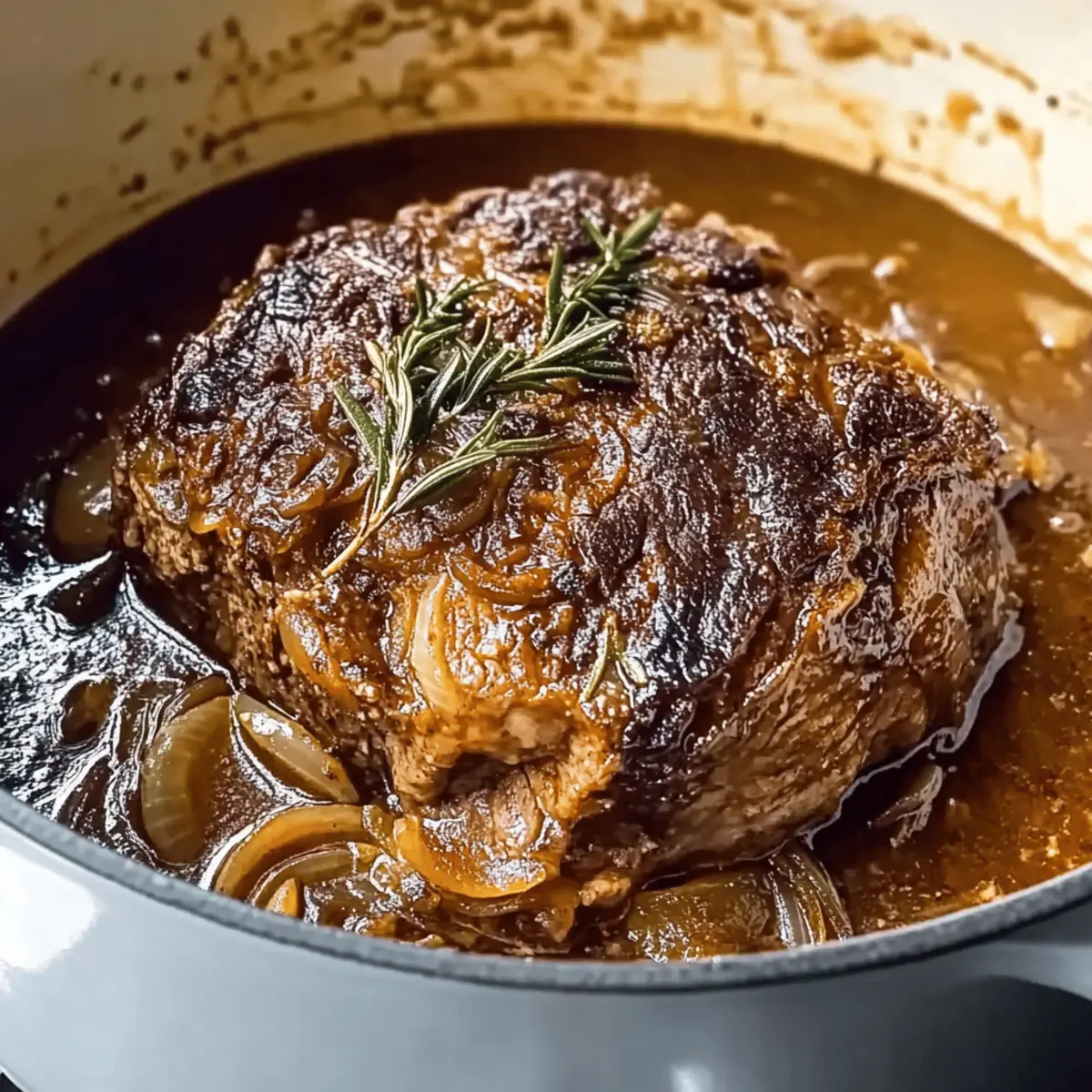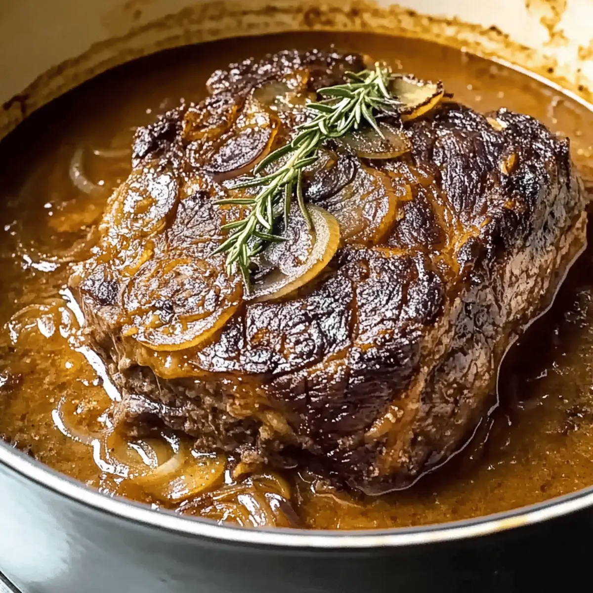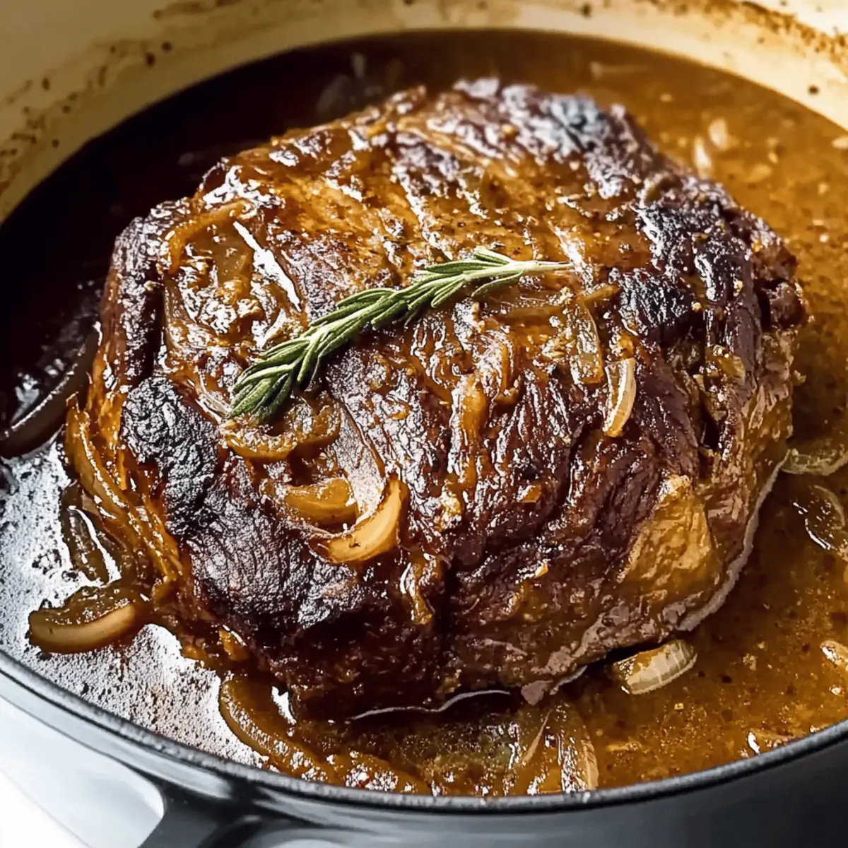 Jump to Recipe Print RecipeAs I stood in my kitchen, the rich aroma of savory beef and sweet, caramelized onions wafted around me, instantly transforming the chaos of the day into a moment of tranquil comfort. This Comforting French Onion Pot Roast is my go-to for those evenings when I crave something hearty yet simple. Imagine a tender cut of chuck roast, surrounded by luscious gravy that echoes the beloved flavors of classic French onion soup, all while requiring minimal hands-on time. Not only is this dish family-friendly and a true crowd-pleaser, but it also makes for a fantastic make-ahead meal that only gets better with time. So, are you ready to elevate your weeknight dinners with a dish that will have everyone asking for seconds? Let’s dive into this heartwarming recipe! Why Is This Pot Roast So Special? Unmatched Flavor: The rich combination of savory beef and sweet, caramelized onions creates a mouthwatering taste that will have your family asking for more. One-Pot Wonder: With minimal cleanup, this recipe only requires your Dutch oven, making it a time-saver for busy evenings or gatherings. Flexibility: Easily adapt this comfort food by adding vegetables like carrots or swapping out the beef for a different roast cut, ensuring it suits your family’s preferences. Make-Ahead Magic: Perfect for meal prep, it’s a dish that tastes even better the next day, just like my Chicken Pot Pie Soup that’s full of delectable flavors. Crowd-Pleasing Delight: Whether you’re serving it at a cozy family dinner or entertaining friends, this pot roast is sure to impress everyone at the table! Comforting French Onion Pot Roast Ingredients For the Roast • Chuck Roast – A flavorful cut with good marbling that becomes melt-in-your-mouth tender. • Fine Sea Salt – Essential for enhancing flavor; season the meat generously for the best results. • Freshly Ground Black Pepper – Offers a fresher, more complex flavor; don’t skip this step! For the Onions • Extra Virgin Olive Oil – Used for searing and caramelizing; can swap with another cooking oil if needed. • Yellow Onions – The primary flavor base that caramelizes beautifully to add sweetness to your dish. • Garlic – Infuses the pot roast with delightful aroma; garlic powder can substitute in a pinch. For the Sauce • Maple Syrup/Brown Sugar – Optional, for a hint of sweetness in the onions; reduce or omit for less sweetness. • All-Purpose Flour/Gluten-Free Flour – Thickens the sauce; perfect to ensure a silky texture. • Red Wine – Adds depth when deglazing; replace with beef broth for an alcohol-free version. • Beef Stock – Forms the savory braising liquid; vegetable broth can lighten the dish if desired. For Flavoring • Rosemary – This aromatic herb brings a lovely fragrance; thyme can be used as an alternative. • Bay Leaf – Adds a layer of complexity; remember to remove it before serving for a clean taste. Step‑by‑Step Instructions for Comforting French Onion Pot Roast Step 1: Preheat the Dutch Oven Begin by preheating your Dutch oven over medium heat for about 3 minutes. Once hot, add a drizzle of extra virgin olive oil and let it shimmer to indicate it’s ready for searing. This step is crucial for creating a delicious caramelization on your beef and will set the stage for the flavors of your Comforting French Onion Pot Roast. Step 2: Sear the Chuck Roast Season your chuck roast generously with fine sea salt and freshly ground black pepper. Place the seasoned roast in the hot oil and sear for 10-12 minutes, turning occasionally until it’s beautifully browned on all sides. This caramelization not only enhances flavor but also creates a lovely crust that infuses the pot roast with richness. Step 3: Remove and Set Aside After achieving a lovely brown crust, carefully remove the roast from the Dutch oven and set it aside on a plate. This step allows the juices to redistribute while you prepare the onions, ensuring your Comforting French Onion Pot Roast remains juicy and flavorful throughout the cooking process. Step 4: Sauté the Onions Slice your yellow onions thinly and add them back into the Dutch oven, along with a bit more olive oil if needed. Sauté the onions over medium heat for about 5 minutes, stirring occasionally until they become translucent. This initial cooking phase builds the foundation of sweet, caramelized goodness that will elevate your pot roast. Step 5: Caramelize the Onions Reduce the heat to medium-low and continue to cook the onions for another 20 minutes. Stir them occasionally, allowing them to caramelize gradually until they turn a rich golden color. Patience is key here, as this step develops the deep, robust flavor that’s synonymous with a classic French onion dish. Step 6: Add Garlic and Sweetener Stir in minced garlic and your choice of maple syrup or brown sugar, cooking for 7-8 minutes. This addition further enhances the sweetness of the onions and enriches the overall flavor profile of your Comforting French Onion Pot Roast. You’ll know it’s done when the onions are beautifully caramelized and fragrant. Step 7: Prepare the Sauce Sprinkle all-purpose flour over the caramelized onions and stir well to combine, allowing the flour to cook for a minute. Then, pour in red wine to deglaze the pot, scraping up any flavorful bits stuck to the bottom. Follow up by adding beef stock, stirring until everything is well blended and the sauce thickens slightly. Step 8: Combine Ingredients Return the seared chuck roast to the pot, ensuring it is mostly submerged in the liquid mixture. Add sprigs of rosemary and a bay leaf for aromatic depth. This step immerses the meat in flavors that will meld beautifully during the braising process, resulting in your Comforting French Onion Pot Roast being tender and infused with taste. Step 9: Braise in the Oven Bring the mixture to a gentle simmer on the stovetop, then cover the pot with a lid. Transfer it to a preheated oven a