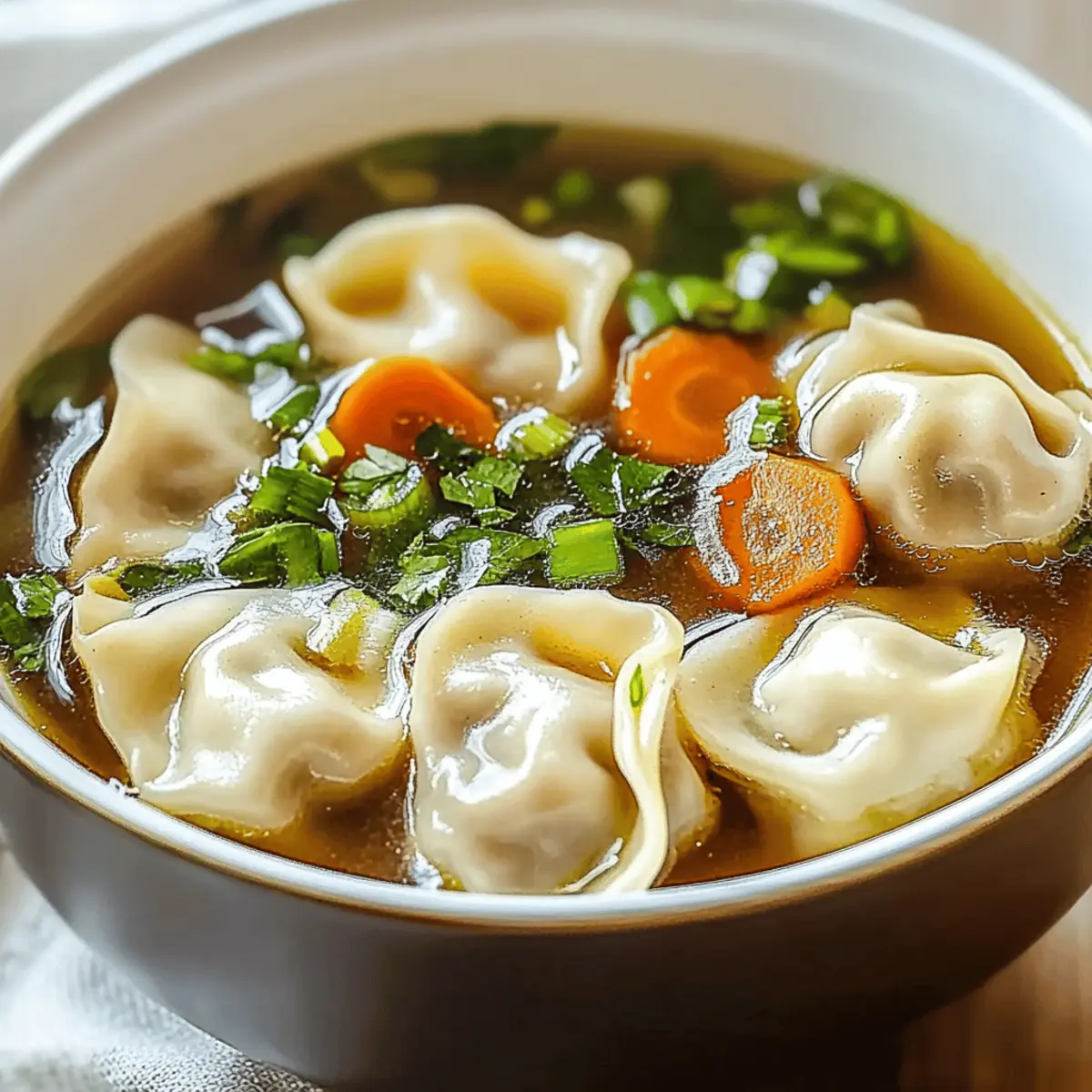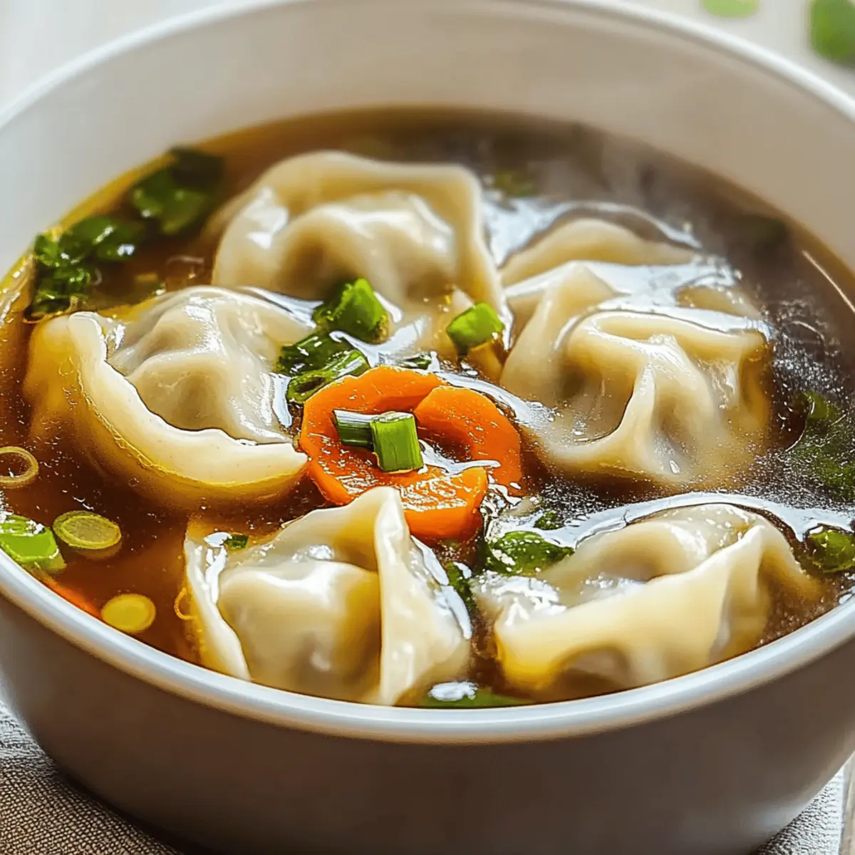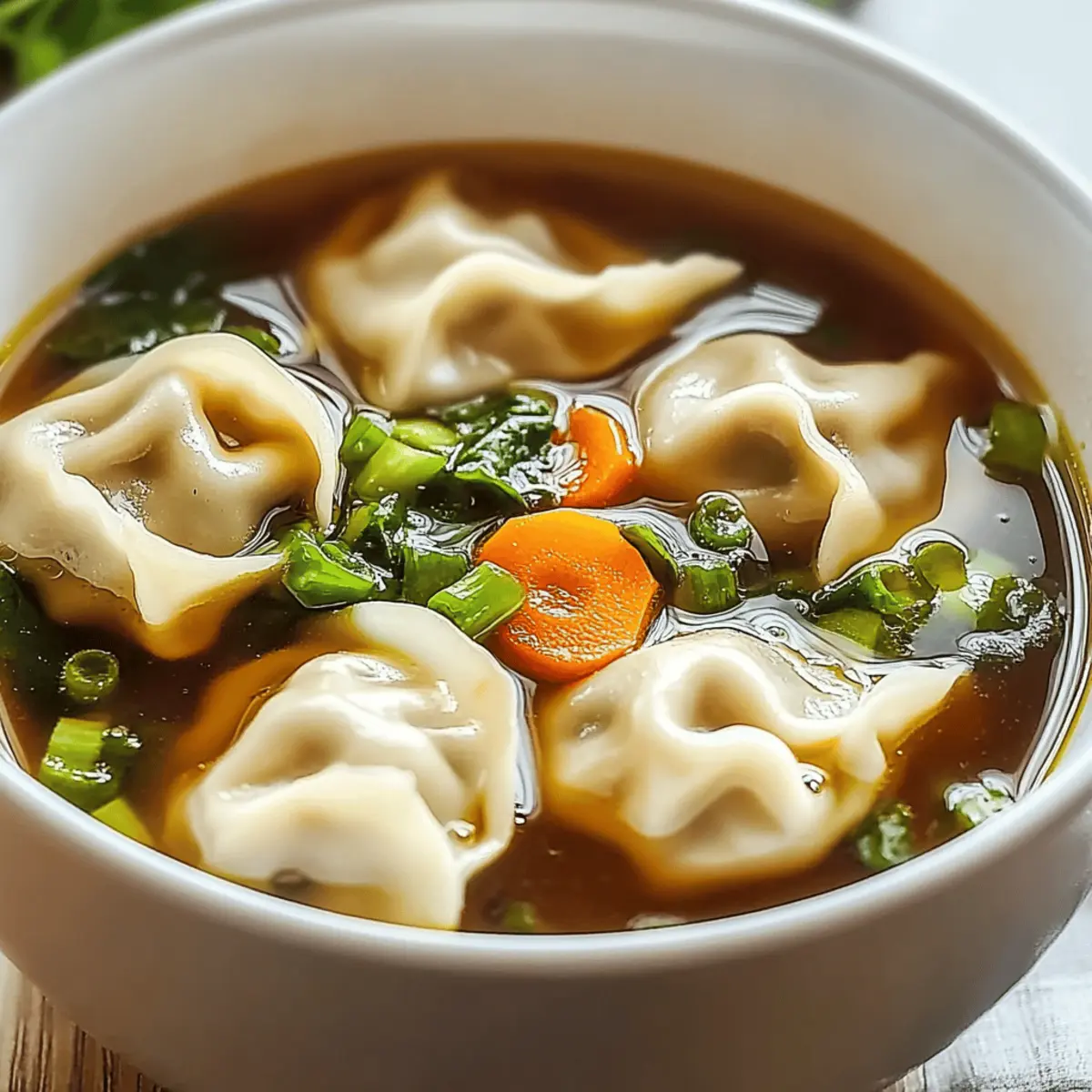 Jump to Recipe Print RecipeThere’s something magical about the aroma of garlic and ginger wafting through the kitchen, instantly lifting my spirits. As the weather turns chilly, my thoughts drift to a comforting bowl of potsticker soup, where plump dumplings dance in a savory broth alongside vibrant greens. This recipe for Comforting Potsticker Soup is not just a meal; it’s a quick and delightful escape from the chaos of fast food, offering a hearty, nutritious option that warms both body and soul. Whether you’re huddled on the couch after a long day or hosting friends for a weeknight dinner, this customizable soup is the perfect way to bring everyone together. Are you ready to fill your home with mouthwatering scents and create a dish that feels like a warm hug? Let’s dive in! Why Is This Soup So Comforting? Warmth, there’s nothing quite like a steaming bowl that envelops you in cozy vibes. Nutritious ingredients like fresh greens and wholesome dumplings make this soup a guilt-free comfort food. Quick to prepare, it’s perfect for busy weeknight dinners or rainy afternoons. Customizable to your taste, you can easily swap proteins or veggies based on what you have on hand. And let’s not forget the crowd-pleaser aspect—this dish will have your family and friends gathering around the table, excited for a bowl of joy. For more warming recipes, try out my Miso Soup Comforting or Pot Pie Soup. Comforting Potsticker Soup Ingredients • Ready to embrace the warmth of this delicious dish? Here’s what you’ll need! For the Dumplings Pork or Chicken Dumplings – The heart of the soup; opt for store-bought for ease or make your own for a special touch. For the Broth Low-Sodium Chicken Broth – Provides a rich base without overpowering saltiness, perfect for enhancing flavor. Fresh Ginger – Grate it finely; its aromatic essence boosts the overall taste of the soup. Garlic Cloves – Use fresh for depth and warmth; minced cloves add an irresistible burst of flavor. Soy Sauce – Infuses authentic umami flavors, bringing the broth to life with its savory notes. For the Greens Fresh Spinach or Bok Choy – Choose your favorite leafy green to add vibrant color and essential nutrients. Green Onions – Finely chopped, these add a refreshing finish and a pop of color to each bowl. For the Finishing Touch Sesame Oil – A little drizzle right before serving enhances richness; use sparingly for the best effect. With each ingredient thoughtfully selected, your potsticker soup will become the epitome of comfort, a true Comforting Potsticker Soup ready to warm hearts and homes! Step‑by‑Step Instructions for Comforting Potsticker Soup Step 1: Gather Your Ingredients Begin by collecting all ingredients for your Comforting Potsticker Soup. This includes pork or chicken dumplings, low-sodium chicken broth, fresh ginger, garlic cloves, green onions, spinach or bok choy, soy sauce, and sesame oil. Having everything ready will streamline your cooking process and ensure a smoother experience. Step 2: Sauté Aromatics In a large pot, heat a tablespoon of oil over medium heat. Add minced garlic and finely grated ginger, sautéing for about 1 minute until they’re fragrant and slightly golden. This step is crucial as it lays the aromatic foundation for your soup, infusing the broth with delightful flavors. Step 3: Create the Broth Pour in the low-sodium chicken broth and increase the heat to bring it to a gentle boil. Once boiling, carefully add the frozen or fresh dumplings into the pot. Allow them to cook for about 5 minutes; they should float to indicate doneness while absorbing the broth’s savory essence. Step 4: Incorporate the Greens After simmering the dumplings, stir in your choice of fresh spinach or bok choy along with soy sauce. Cook for an additional 2-3 minutes until the greens are just wilted and vibrant. This addition enhances not only the nutrition but also the visual appeal of your Comforting Potsticker Soup. Step 5: Add Finishing Touches Before serving, drizzle a small amount of sesame oil into the pot to elevate the dish’s richness. Give the soup a gentle stir, tasting to adjust seasonings if necessary. This final touch brings all the flavors together, creating a luscious broth that embraces the dumplings. Step 6: Serve and Garnish Ladle the hot soup into bowls, ensuring each serving is filled with dumplings and greens. Finish with a sprinkle of finely chopped green onions for a fresh hit of flavor and color. Your Comforting Potsticker Soup is now ready to be shared—serve it hot and enjoy a nourishing meal! How to Store and Freeze Comforting Potsticker Soup Fridge: Store leftover soup in an airtight container for up to 3 days to keep it fresh. Always let it cool to room temperature before sealing. Freezer: For longer storage, freeze the soup in a freezer-safe container for up to 2 months. Consider omitting the dumplings if you plan to freeze; this keeps them from becoming mushy. Reheating: Reheat gently on the stove over low heat to preserve the texture of the dumplings; add a splash of broth or water if it thickens too much. Separation Tip: If possible, store dumplings separately when refrigerating or freezing the soup; this helps retain their delicious texture for later enjoyment in your comforting potsticker soup. What to Serve with Comforting Potsticker Soup When you’re ready to elevate your potsticker soup experience, these delightful pairings will create a full meal bursting with flavor. Crusty Bread: Perfect for dipping and soaking up the savory broth; a warm baguette adds comforting texture to each bite. Steamed Rice: This simple side balances the heartiness of the soup, making it a filling and satisfying meal option. Fresh Salad: A crisp, green salad with a tangy vinaigrette complements the warm soup beautifully, bringing a refreshing crunch to each bite. Roasted Vegetables: Seasoned root vegetables add depth and sweetness; their caramelized edges contrast w