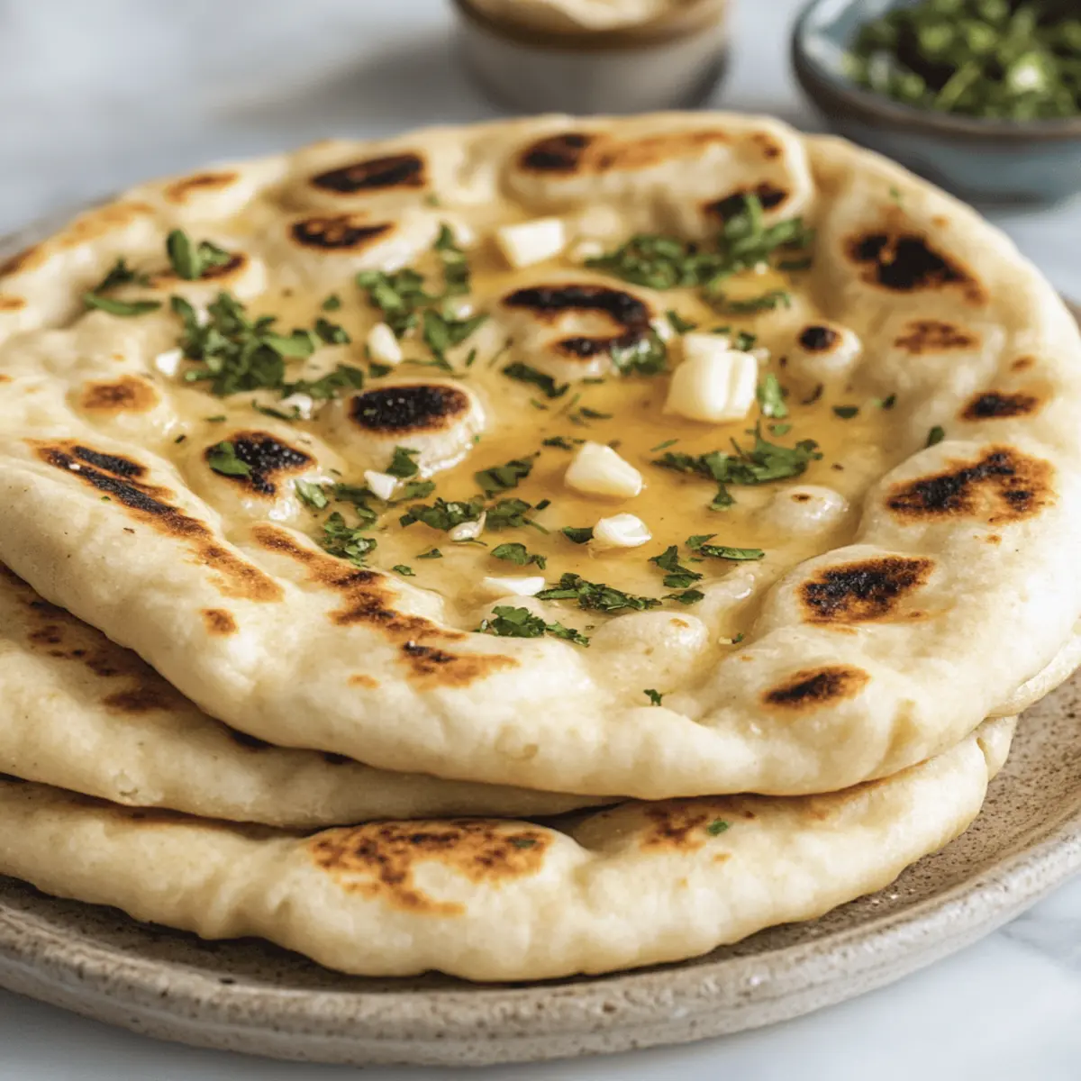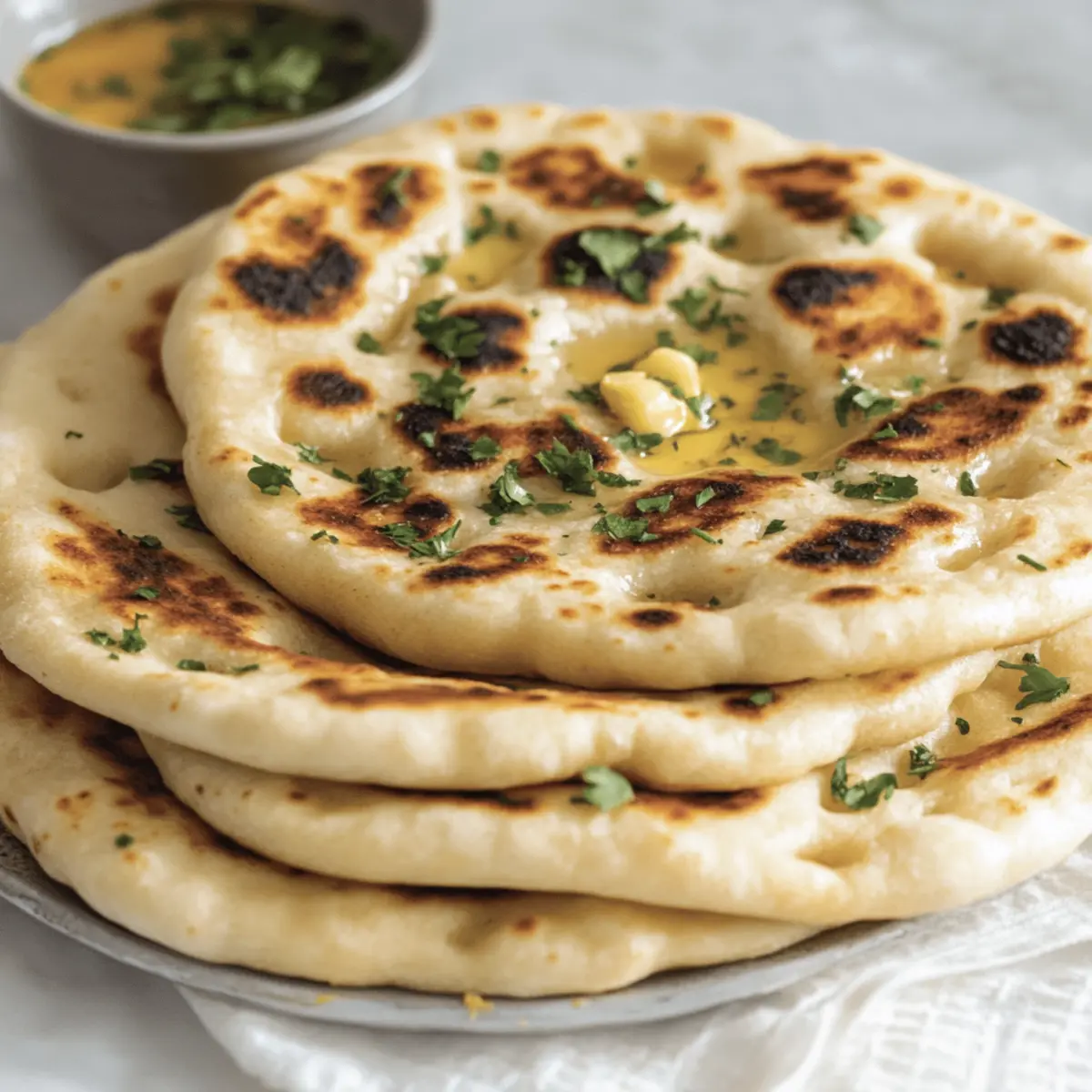 Jump to Recipe Print RecipeThere’s something special about discovering a delightful dish that’s both comforting and surprisingly simple to make. Enter my Easy High-Protein Cottage Cheese Garlic Naan—a recipe that takes just 30 minutes and brings a delicious twist to your meals. With no yeast involved, this naan is a fantastic guilt-free addition to your kitchen repertoire. Not only is it high in protein, making it a great choice for a nourishing snack, but it also lends itself beautifully to variations like Cheesy Garlic Naan or a spicy kick for those who crave bold flavors. Picture it warm and fluffy, ready to accompany your favorite curries or wrap up savory fillings. Are you ready to unlock the secrets of this easy, homemade flatbread? Why Is Cottage Cheese Garlic Naan a Must-Try? Quick to Prepare: Whipping up this naan takes only 30 minutes, making it an ideal option for weeknight meals or impromptu gatherings. Nutritious Boost: Packed with high protein from cottage cheese, it’s a wholesome alternative to conventional naan that keeps you satisfied. Endless Variations: Customize it to your taste—try the Cheesy Garlic Naan or spice things up with a spicy version! Guilt-Free Indulgence: With no yeast, it’s easier to digest without sacrificing flavor, so you can relish every bite without worry. Perfect for Pairing: This naan complements a variety of dishes, whether you’re enjoying it with your favorite curry or using it as a wrap for a savory filling. Cottage Cheese Garlic Naan Ingredients For the Dough Cottage Cheese – Adds moisture and protein; use full-fat for the best flavor. Eggs – Acts as a binder and adds richness; optional for a vegan version. All-Purpose Flour – Creates the naan’s structure; can be swapped with gluten-free flour for a lighter option. Almond Flour – Provides a nutty flavor and maintains moisture; additional all-purpose flour can substitute if needed. Baking Powder – Aids the naan’s slight rise, giving it fluffiness. Salt – Enhances the naan’s overall flavor. For the Flavor Garlic – Offers aromatic flavor; freshly minced garlic is highly recommended for the best result. Butter – Used for brushing, adding richness and gloss; olive oil can replace it for a vegan-friendly version. Parsley/Cilantro – For garnishing, adding a burst of fresh flavor; optional but recommended for a beautiful presentation. This Cottage Cheese Garlic Naan is not only easy to make, but it’s also a delicious way to enjoy flatbread that complements any meal! Step‑by‑Step Instructions for Cottage Cheese Garlic Naan Step 1: Mix the Dough In a mixing bowl, combine one cup of cottage cheese, one egg, one cup of all-purpose flour, and half a cup of almond flour. Add two teaspoons of baking powder and a pinch of salt. Mix gently until a cohesive dough forms—make sure it’s not too sticky. This should take about 5 minutes. You want a smooth texture that holds together without being overly worked. Step 2: Add Flavor Fold in four cloves of freshly minced garlic into the dough and mix until evenly distributed. This adds a delightful aromatic flavor to your Cottage Cheese Garlic Naan. At this point, the mixture should smell incredible, and the dough will begin to hold its shape. Allow it to rest for about 5 minutes while you prepare the cooking surface. Step 3: Shape the Naan Divide the dough into equal portions; typically, this yields about five naans. Lightly flour your work surface and roll each portion into a round flat shape about half an inch thick. Use your hands or a rolling pin, ensuring the surface remains dusted with flour to prevent sticking. Each naan should be circular and even, showcasing the delicious garlic within. Step 4: Heat the Pan Place a non-stick skillet over medium heat, allowing it to warm for about 2 minutes. Add a tablespoon of butter and let it melt, swirling it around to coat the base of the pan. The butter should sizzle lightly, creating a rich foundation for cooking your naan. This step is crucial for obtaining that lovely golden-brown crust. Step 5: Cook the Naan Carefully place the rolled naan into the skillet and cook for 2-3 minutes on one side. You’ll know it’s ready to flip when you see bubbles forming on the surface and the bottom turns golden brown. Flip it over and cook for an additional 2-3 minutes until both sides are crispy and golden. Repeat this process for the remaining naans. Step 6: Add Finishing Touches Once each Cottage Cheese Garlic Naan is cooked, remove it from the skillet and brush with melted butter for added flavor. If desired, sprinkle some chopped parsley or cilantro on top for a burst of freshness. Allow the naans to rest on a plate, stacked to keep them warm and soft as you finish cooking the rest. Step 7: Serve and Enjoy Serve your warm Cottage Cheese Garlic Naan with your favorite curry or use it as a delightful wrap for herbs and vegetables. These can be enjoyed fresh, and if needed, store any leftovers in an airtight container in the fridge for up to three days. Reheat on a skillet to bring back their fluffy goodness before serving again! Expert Tips for Cottage Cheese Garlic Naan Gentle Mixing: Be careful not to overwork the dough while mixing; this helps ensure the naan remains tender and soft. Perfect Cooking: Keep an eye on the cooking time, as it can vary by stove; aim for a golden-brown color for optimal texture. Gluten-Free Handling: If using the gluten-free option, remember that the dough may be more fragile, so handle it with love and care. Flour Dusting: Keep your work surface lightly floured when rolling out the naan to prevent sticking and maintain shape. Extra Flavor: For added taste, consider boosting the garlic amount or adding your favorite herbs directly into the dough for a flavor explosion! What to Serve with Cottage Cheese Garlic Naan Experience the delightful convenience of creating a full meal around this versatile naan that awakens the senses. Creamy Butter Chicken: T