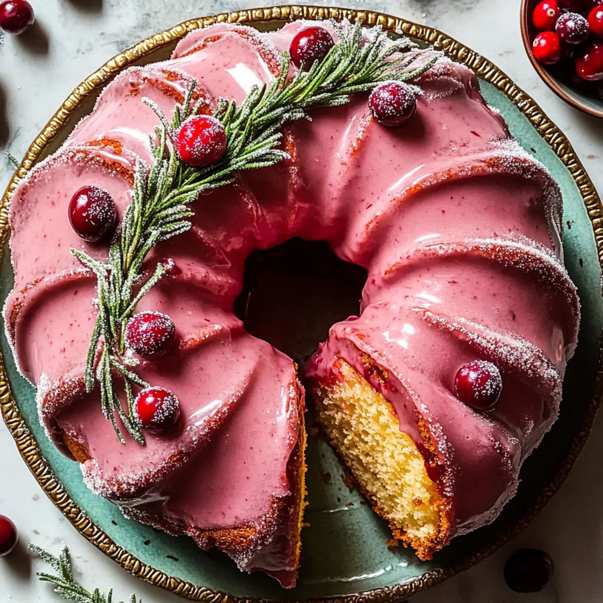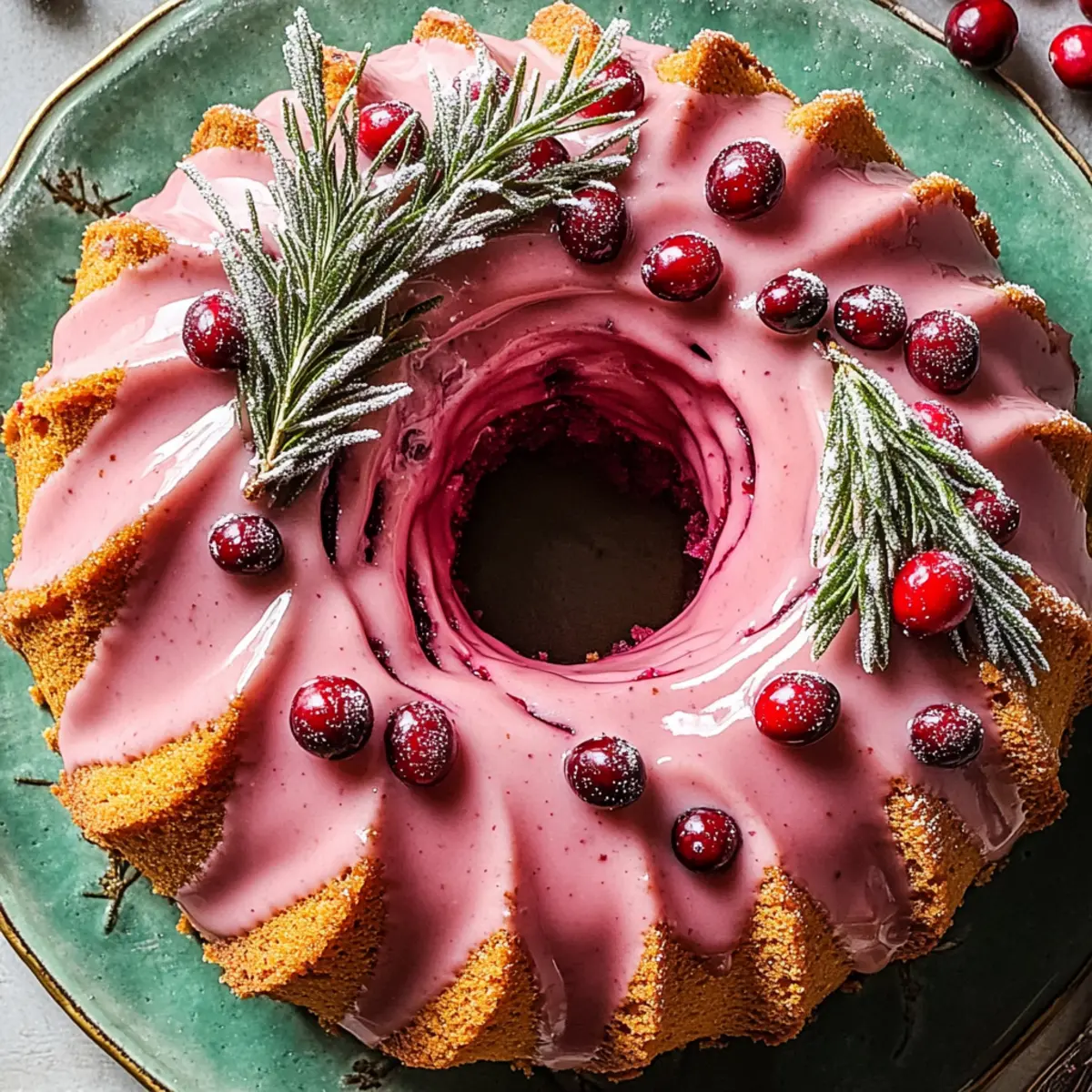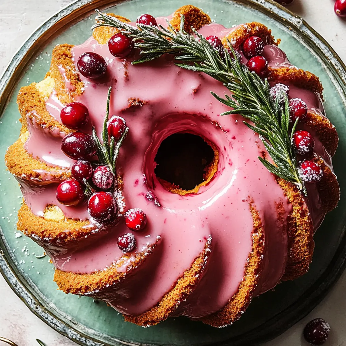 Jump to Recipe Print RecipeThe aroma of freshly baked cakes wafting through the house can whisk you back to heartwarming holiday gatherings. That’s exactly what my Festive Cranberry Glaze Bundt Cake brings to the table—an elegant dessert that’s sure to become the star of your celebration. With a moist, fluffy texture enriched by tart cranberries and a delightful blend of warm spices, this cake perfectly balances sweet and tart flavors. Not only is it a stunning centerpiece for your holiday spread, but it’s also quick to whip up and freezer-friendly, making your festive season stress-free. Are you ready to create a dessert that will have everyone talking as they savor every scrumptious bite? Why is this Bundt Cake a Must-Try? Irresistible Flavor: This Cranberry Glaze Bundt Cake combines tart cranberries with warm spices, creating a deliciously festive treat. Quick and Easy: With simple steps and common ingredients, you’ll have this beauty whipped up in no time! Gorgeous Presentation: The stunning glaze and optional garnishes, like sugared cranberries and rosemary, make it a showstopper at any gathering. Versatile Delight: Perfect with a cup of hot cocoa or coffee, it complements any holiday beverage beautifully. Freezer-Friendly: Bake ahead and store; it keeps well, ensuring you always have a sweet surprise at hand. If you’re looking for more holiday inspirations, check out my Strawberry Cheesecake Cinnabon and Orange Glazed Salmon for your festive feasts! Cranberry Glaze Bundt Cake Ingredients For the Cake • Unsalted Butter – Provides moisture and richness. Note: Allow to soften before using for ease of mixing. • All-Purpose Flour – Serves as the backbone for the cake’s structure. Note: Be sure to measure accurately for best results. • Granulated Sugar – Sweetens the cake while helping to create a tender crumb. Substitute with coconut sugar for a healthier option. • Orange Zest – Adds brightness and a citrus aroma. Use a fresh orange for optimal flavor. • Light Brown Sugar – Contributes moisture and depth of flavor. Can be substituted with dark brown sugar for a richer taste. • Vegetable Oil – Enhances moisture and tenderness. Can be replaced with melted coconut oil. • Large Eggs – Binds ingredients and provides structure. Ensure eggs are at room temperature for better incorporation. • Pure Vanilla Extract – Adds warmth and enhances sweetness. Use high-quality vanilla for best flavor. • Baking Powder – Helps the cake rise. Ensure it’s fresh for effective leavening. • Ground Cardamom, Cinnamon, Salt, Baking Soda, Ground Ginger, Ground Nutmeg – Spice blend that creates a warm, festive flavor profile. • Buttermilk – Adds moisture and tenderness to the cake. Can be substituted with milk plus lemon juice or vinegar. • Fresh or Frozen Cranberries – Provide tartness and visual appeal. Do not thaw if using frozen. For the Sugared Cranberries • Water – Used for making sugared cranberries. • Granulated Sugar (for sugared cranberries) – Sweetens and coats the cranberries. Use extra for more cranberries if desired. For the Glaze • Confectioners’ Sugar – Used in the glaze for sweetness and texture. Additional cranberry juice may be added for a thinner consistency. • Cranberry Juice – Provides a tart flavor for the glaze. Use unsweetened juice for balance. Optional Garnish • Rosemary Sprigs – Optional garnish providing a hint of herbal flavor and decoration. Step‑by‑Step Instructions for Cranberry Glaze Bundt Cake Step 1: Prepare Pans Begin by thoroughly greasing your Bundt pan with unsalted butter, making sure to cover all the intricate designs to prevent sticking. Preheat your oven to 350°F (175°C) and have a toothpick handy for testing the cake’s doneness later. The right preparation is crucial for a flawless Cranberry Glaze Bundt Cake. Step 2: Mix Dry Ingredients In a large mixing bowl, whisk together the all-purpose flour, baking powder, ground cardamom, cinnamon, salt, baking soda, ground ginger, and ground nutmeg. This blend of spices will create that warm, festive flavor that complements the tart cranberries beautifully. Set this mixture aside to let the flavors meld while you prepare the wet ingredients. Step 3: Cream Butter and Sugars In a separate bowl, beat the softened unsalted butter, granulated sugar, and light brown sugar together until the mixture becomes fluffy and pale—about 3-5 minutes using an electric mixer. This step incorporates air into your batter, ensuring a moist and tender Cranberry Glaze Bundt Cake. Step 4: Combine Wet Ingredients Add the large eggs, pure vanilla extract, vegetable oil, and buttermilk to the butter and sugar mixture. Mix everything until smooth and well-combined, scraping down the sides of the bowl as necessary. The creamy texture at this stage sets the perfect foundation for a rich cake. Step 5: Incorporate Dry Ingredients Gradually add the dry flour mixture to the wet ingredients, stirring gently until just combined. Avoid overmixing, as this can lead to a dense cake. Once combined, carefully fold in the fresh or frozen cranberries, ensuring each one is coated with the batter for a beautiful distribution of tartness throughout the cake. Step 6: Bake Pour the luscious batter into the prepared Bundt pan, smoothing the top with a spatula. Place it in the preheated oven and bake for 50-60 minutes, or until a toothpick inserted into the center comes out clean. Keep an eye on the cake—it should be golden brown and spring back when gently pressed. Step 7: Cool and Remove After baking, allow the cake to cool in the Bundt pan for about 10 minutes. This will help it set and makes it easier to remove. Carefully invert the pan onto a wire rack, gently tapping if needed, to release your beautiful Cranberry Glaze Bundt Cake. Let it cool completely before glazing. Step 8: Prepare Glaze In a small bowl, whisk together the confectioners’ sugar and cranberry juice until sm