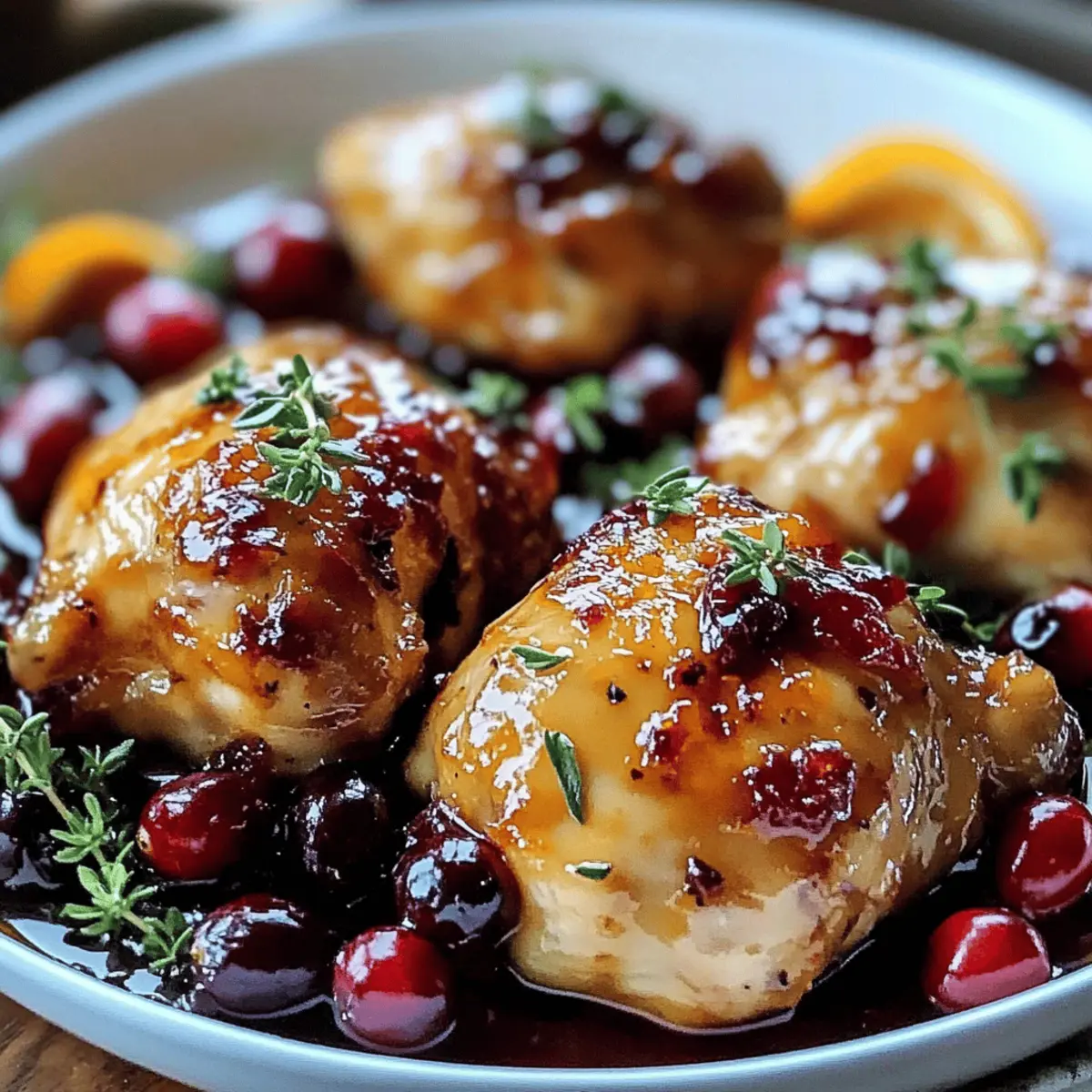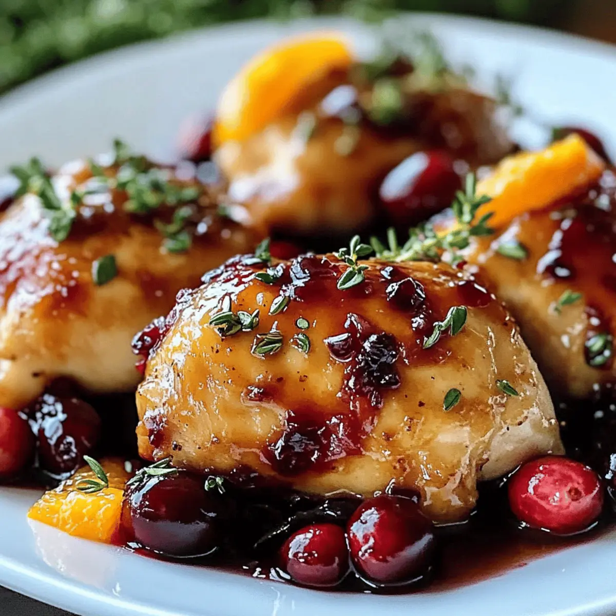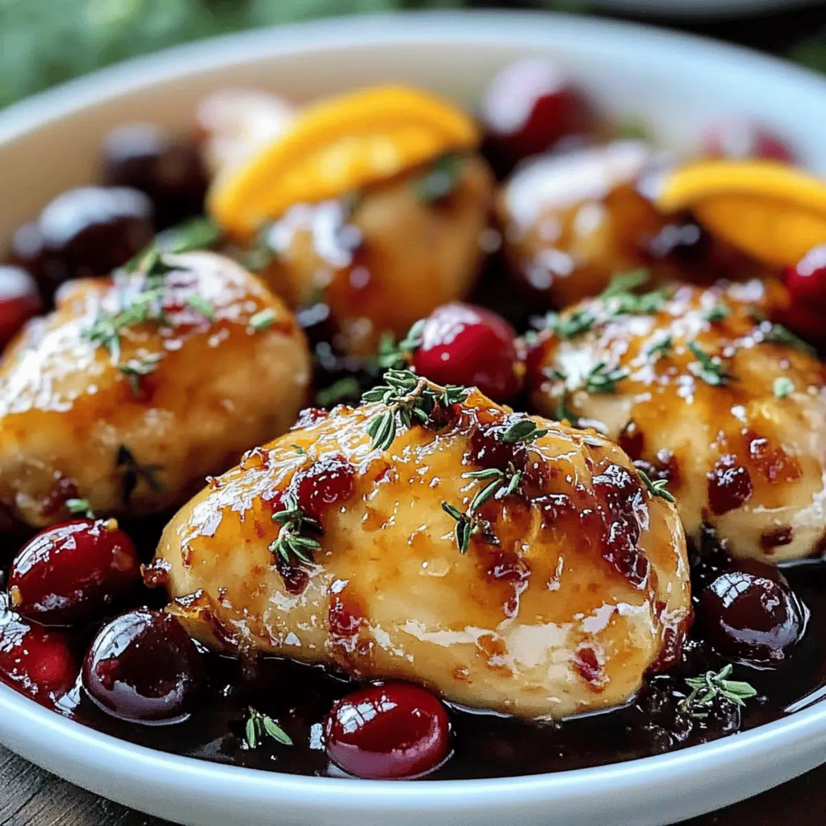 Jump to Recipe Print RecipeAs I stood in my kitchen, the aroma of citrus and berries began to mingle, instantly transporting me to cozy holiday gatherings with family. The recipe for Cranberry Orange Chicken is my go-to for those nights when I crave something hearty yet refreshing—perfect for a festive family dinner without the fuss. What I love most about this dish is its beautiful balance of sweet and tangy flavors, which is not only irresistible but also low-carb and gluten-free, making it a winner for everyone at the table. The tender chicken is bathed in a luscious, vibrant sauce that feels special enough for celebrations but quick enough for any weeknight. It’s the kind of dish that keeps everyone coming back for seconds! Curious how to bring this symphony of flavors to your own table? Let’s dive into the recipe! Why Is Cranberry Orange Chicken a Must-Try? Irresistible Flavor Combination: The harmonious blend of tangy cranberries and zesty orange creates a vibrant sauce that makes your taste buds dance. Quick and Easy: With straightforward steps, this recipe is perfect for busy weeknights or last-minute gatherings. Versatile Dish: Whether enjoyed with roasted vegetables or served alongside wild rice, it’s a delightful meal for families. Health-Conscious: Low-carb and gluten-free, it caters to various dietary preferences while remaining satisfying. Crowd-Pleaser: This dish captures the essence of holiday flavors, ensuring everyone around the table will adore it—just like they would love our Garlic Chicken Thighs with Mushrooms or BBQ Chicken Mac and Cheese. Easy Make-Ahead: The sauce can be prepared in advance, making dinner hassle-free and perfect for any occasion! Cranberry Orange Chicken Ingredients For the Chicken • Chicken breasts or thighs – Choose boneless and skinless for easy and quick cooking. For the Sauce • Fresh cranberries – Use fresh for the best flavor; frozen can be a substitute but may change the texture. • Orange (zested and juiced) – Zest before juicing to make the process simpler and capture more flavor. • Honey or maple syrup – This sweetener perfectly balances the tartness of the cranberries; maple syrup makes it vegan-friendly. • Olive oil – Ideal for searing the chicken; you may substitute with another oil if needed. • Garlic – Fresh is best for an aromatic punch, but jarred minced garlic works in a pinch. • Fresh thyme or rosemary – Provides depth and aroma; dried herbs can replace fresh but might require an adjustment in quantity. • Salt and black pepper – Essential for flavor enhancement, adjust to personal taste. • Chicken broth or water – While water is suitable, using broth greatly enhances the sauce’s flavor. • Balsamic vinegar (optional) – Adds a layer of complexity to the dish; a delightful touch if you want to elevate the flavors. • Dijon mustard (optional) – Introduces a tangy note to the sauce, which you can skip if it’s not your preference. Feel inspired? You’ll adore how this Cranberry Orange Chicken comes together into not just a meal but a warm gathering around the family table! Step‑by‑Step Instructions for Cranberry Orange Chicken Step 1: Prepare the Chicken Begin by patting the chicken breasts or thighs dry with paper towels to ensure a nice sear. Season generously with salt, black pepper, and your choice of fresh thyme or rosemary, allowing the herbs to adhere well. Let the seasoned chicken rest at room temperature for about 15 minutes while you gather your other ingredients—this helps enhance the flavors in the Cranberry Orange Chicken. Step 2: Cook Chicken In a large skillet, heat 2 tablespoons of olive oil over medium-high heat until shimmering but not smoking, about 2 minutes. Carefully add the seasoned chicken to the pan, allowing it to sear undisturbed for 4-6 minutes or until golden brown. Flip the chicken and cook for another 4-6 minutes until cooked through and juices run clear. Remove the chicken from the skillet and set aside on a plate; this leaves behind flavorful drippings for your sauce. Step 3: Make Sauce Using the same skillet, reduce the heat to medium and add 3 cloves of minced garlic, sautéing for 30 seconds until fragrant but not browned. Stir in 2 cups of fresh cranberries, the freshly squeezed juice and zest of one orange, and ¼ cup of honey (or maple syrup). Bring this mixture to a gentle simmer and cook for 5-7 minutes, stirring occasionally, until the cranberries start to burst and the sauce thickens beautifully. Step 4: Combine Chicken and Sauce Once the cranberries have burst, return the seared chicken to the pan, nestling it into the sauce. Pour in ½ cup of chicken broth, scraping the bottom of the skillet to deglaze and incorporate all those tasty bits. Cover the skillet and simmer for 10-12 minutes, or until the chicken has reached an internal temperature of 165°F and is tender, soaking in all the flavors of the Cranberry Orange Chicken sauce. Step 5: Serve After cooking, remove the lid and check the sauce—add salt and pepper to taste. Plate the chicken and generously spoon the aromatic cranberry-orange sauce over the top. You can garnish with fresh herbs or an extra sprinkle of orange zest for a vibrant presentation. This delightful Cranberry Orange Chicken is now ready to be served, bringing holiday joy to your dinner table! Make Ahead Options These Cranberry Orange Chicken are perfect for busy home cooks looking to simplify meal prep! You can prepare the sauce up to 3 days in advance—just sauté the garlic and add the cranberries, orange juice, zest, and honey, then simmer until the cranberries burst. Once cooled, refrigerate it in an airtight container. For the chicken, season and sear it in advance, then refrigerate for up to 24 hours. When you’re ready to serve, simply reheat the sauce, add the chicken, pour in the broth, cover, and cook until the chicken is heated through. This way, you’ll have a hassle-free, delicious dinne