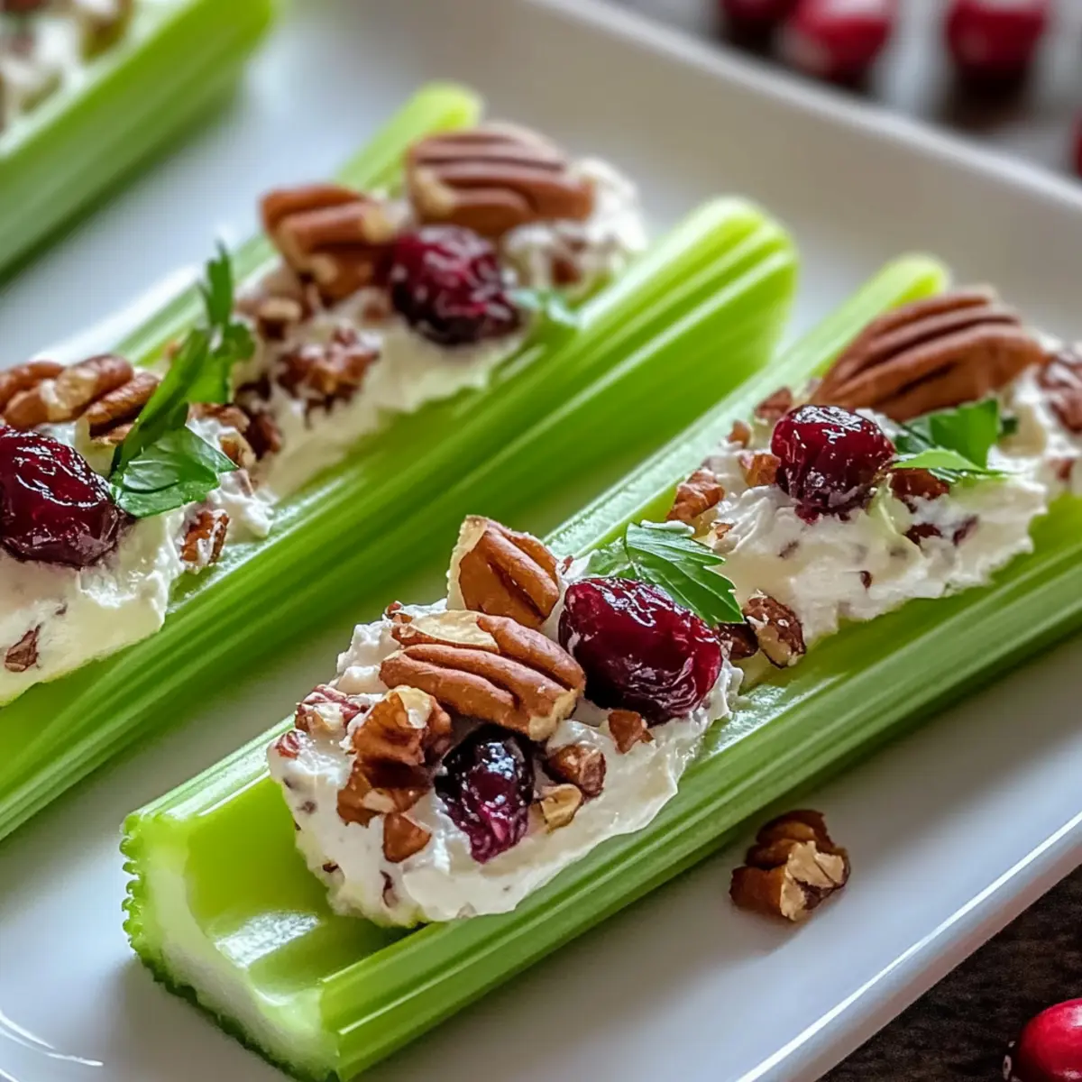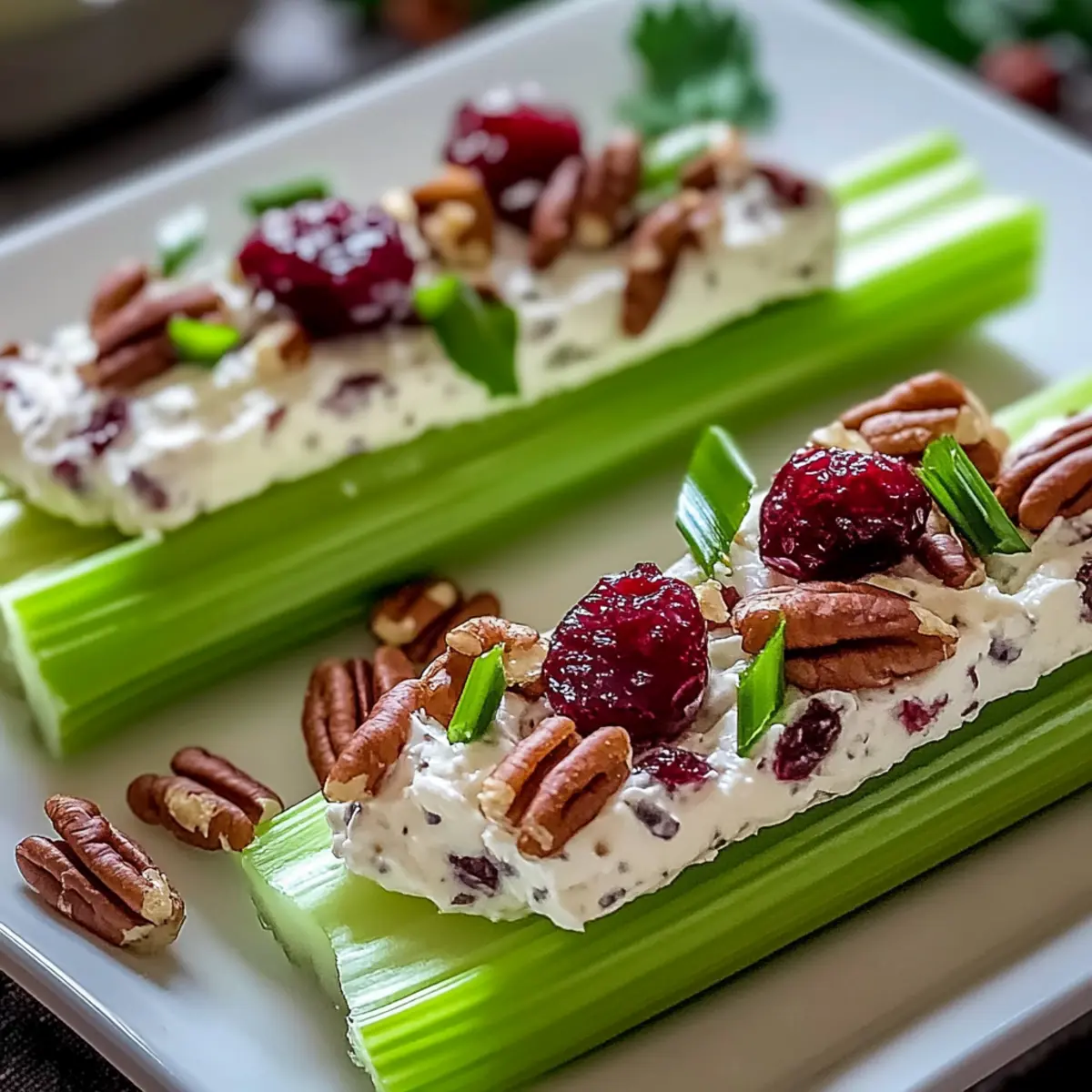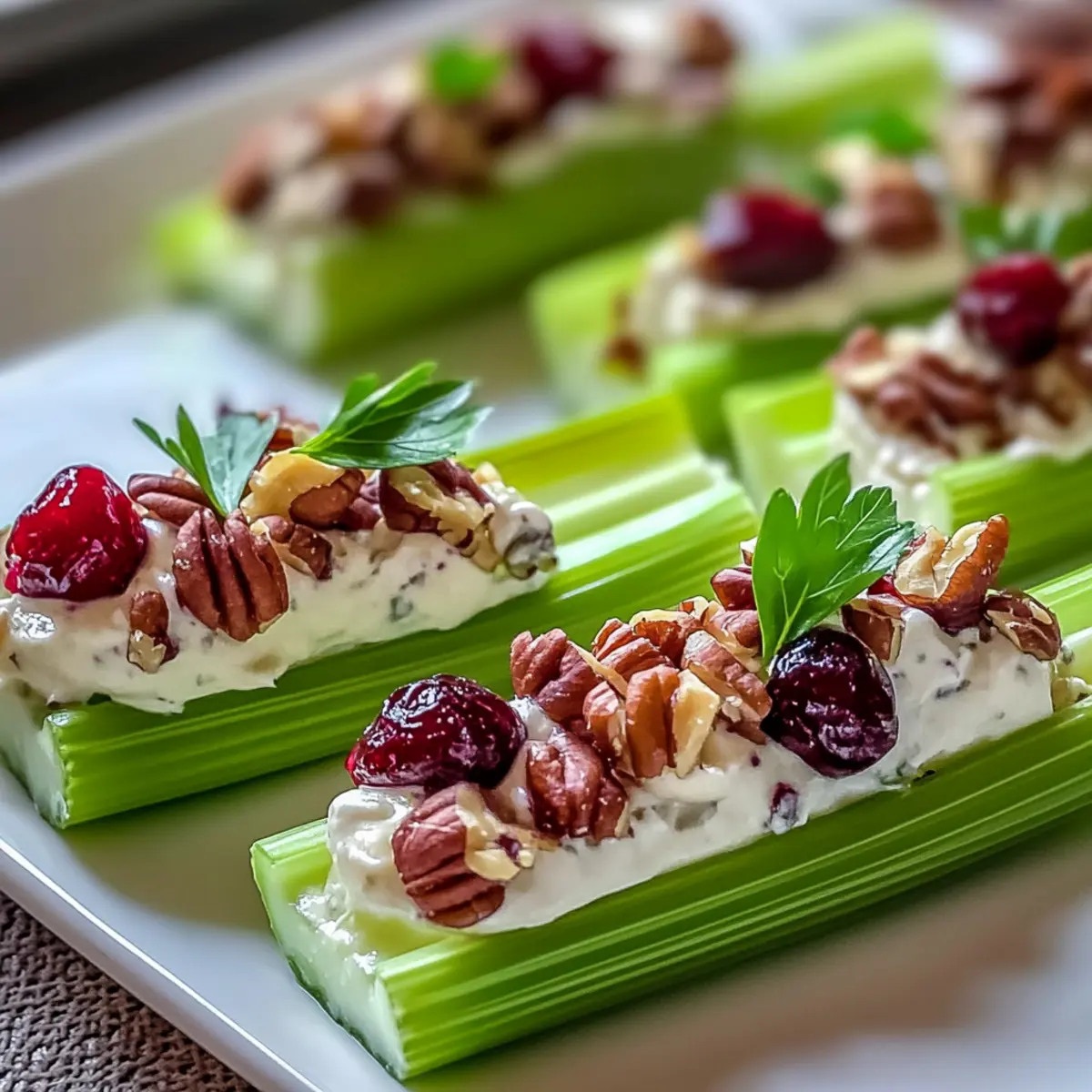 Jump to Recipe Print RecipeWhile prepping dinner one evening, I realized something: I had ingredients for a delightful appetizer just sitting in my fridge. Enter the Cranberry Pecan Cream Cheese Stuffed Celery—a quick and easy gluten-free option that’s destined to impress. In just 15 minutes, you can transform crisp celery sticks into a creamy, nutty delight that perfectly blends tangy cream cheese with the chewiness of cranberries and the crunch of pecans. Not only is this no-cook recipe a time-saver for busy weeknights, but it also makes an elegant addition to any gathering, offering a refreshing contrast to heavier dishes. So, why not take a break from your usual routine and whip up this vibrant appetizer? Your friends and family will be asking for seconds! Are you ready to elevate your appetizer game? Why choose Cranberry Pecan Stuffed Celery? Unmatched Convenience: This recipe is a true no-cook wonder that takes just 15 minutes to prepare, making it ideal for busy home cooks or last-minute gatherings. Festive Appeal: With its vibrant colors and textures, this dish makes a stunning addition to your appetizer table, guaranteed to catch the eye and lift spirits at any party. Flavorful Fusion: The delightful mix of creaminess, sweet-tart cranberries, and crunchy pecans creates a unique taste experience that’s both satisfying and refreshing. Diet-Friendly: Perfect for your gluten-free guests, this dish ensures everyone gets to indulge without worry, much like my popular Ham Cheese Croissant. Easily Adaptable: Customize it to your preference by substituting nuts or using Greek yogurt for a healthier twist, allowing you to achieve a flavor that speaks to you! Cranberry Pecan Cream Cheese Stuffed Celery Ingredients For the Filling • Cream Cheese – Offers a creamy texture that beautifully binds the filling; opt for room temperature for easy mixing. • Cranberries – Adds a sweet-tart flavor that elevates the dish; consider using chopped apricots or raisins for a sweet twist. • Pecans – Provides a delightful crunch and nutty taste; swap with walnuts or almonds to switch things up. • Vanilla Extract – Adds a hint of sweetness and aromatic warmth; it’s optional but enhances the overall flavor profile. • Powdered Sugar (optional) – Adjusts the sweetness of the filling; omit if you prefer a less sweet stuffing. For the Celery • Celery Sticks – The crisp and refreshing base for all that delicious filling; cut into 3-inch sticks for easy snacking. Feel free to mix and match these ingredients to create your own version of Cranberry Pecan Cream Cheese Stuffed Celery! Step‑by‑Step Instructions for Cranberry Pecan Cream Cheese Stuffed Celery Step 1: Prep the Celery Begin by thoroughly washing the celery stalks under cold running water. Pat them dry with a clean kitchen towel. Next, cut the celery into 3-inch sticks, aiming for uniform sizes to ensure even stuffing. Lay the celery sticks on a clean cutting board, ready for their flavorful filling. The crispness of the celery will serve as the perfect contrast to the creamy filling. Step 2: Prepare the Filling In a medium mixing bowl, combine the room temperature cream cheese, chopped cranberries, and pecans. Add in a splash of vanilla extract for a hint of sweetness. Using a fork or a hand mixer, blend the ingredients together until the mixture is smooth and fully combined. This will create a delightful and creamy filling to stuff into your celery sticks. Step 3: Stuff the Celery Take a small spoon or a piping bag, and generously fill each celery stick with the cranberry pecan cream cheese mixture. Press the filling in gently to ensure the sticks are well-stuffed and overflowing slightly for an appealing presentation. The vibrant colors of the filling will make this Cranberry Pecan Cream Cheese Stuffed Celery truly eye-catching. Step 4: Chill for Flavor Once all the celery sticks are stuffed, place them on a serving platter or in an airtight container. Refrigerate for at least 30 minutes to allow the flavors to meld beautifully. The chill will enhance the creaminess of the filling and ensure every bite is refreshing and satisfying. Step 5: Serve and Enjoy When ready to serve, arrange the stuffed celery on a festive platter. You can garnish them with a sprinkle of chopped pecans or fresh herbs to add a touch of elegance. This Cranberry Pecan Cream Cheese Stuffed Celery appetizer is now ready to impress your guests, providing a delightful nibble alongside your main dishes. Tips for the Best Stuffed Celery Room Temperature Cream Cheese: Use cream cheese that’s at room temperature for the smoothest filling. This helps ensure it blends well with other ingredients in your Cranberry Pecan Cream Cheese Stuffed Celery. Prep Ahead: Consider preparing the filling a day prior. This not only saves you time but also allows the flavors to develop, making for an even tastier appetizer. Taste and Adjust: Don’t hesitate to taste the filling before stuffing. You can easily adjust sweetness by varying the cranberries or using powdered sugar for a perfect balance. Freshness is Key: Keep the stuffed celery in the fridge until serving to maintain their crunch. Celery softens if left out too long, which can detract from the delightful texture. Garnish Wisely: Garnishing with a sprinkle of pecans or fresh herbs not only elevates the appearance but also adds a subtle crunch and flavor that complements the creamy filling. What to Serve with Cranberry Pecan Cream Cheese Stuffed Celery Elevate your appetizer experience with delightful pairings that complement the vibrant flavors and textures of this creamy, crunchy delight. Creamy Mashed Potatoes: These soft, buttery potatoes provide a smooth contrast that balances the crispness of the celery. They’re a comforting addition, adding heartiness to your spread. Herb Salad: A fresh herb salad tossed with a zesty vinaigrette brightens the palate, enhancing the savory notes of the cream cheese while