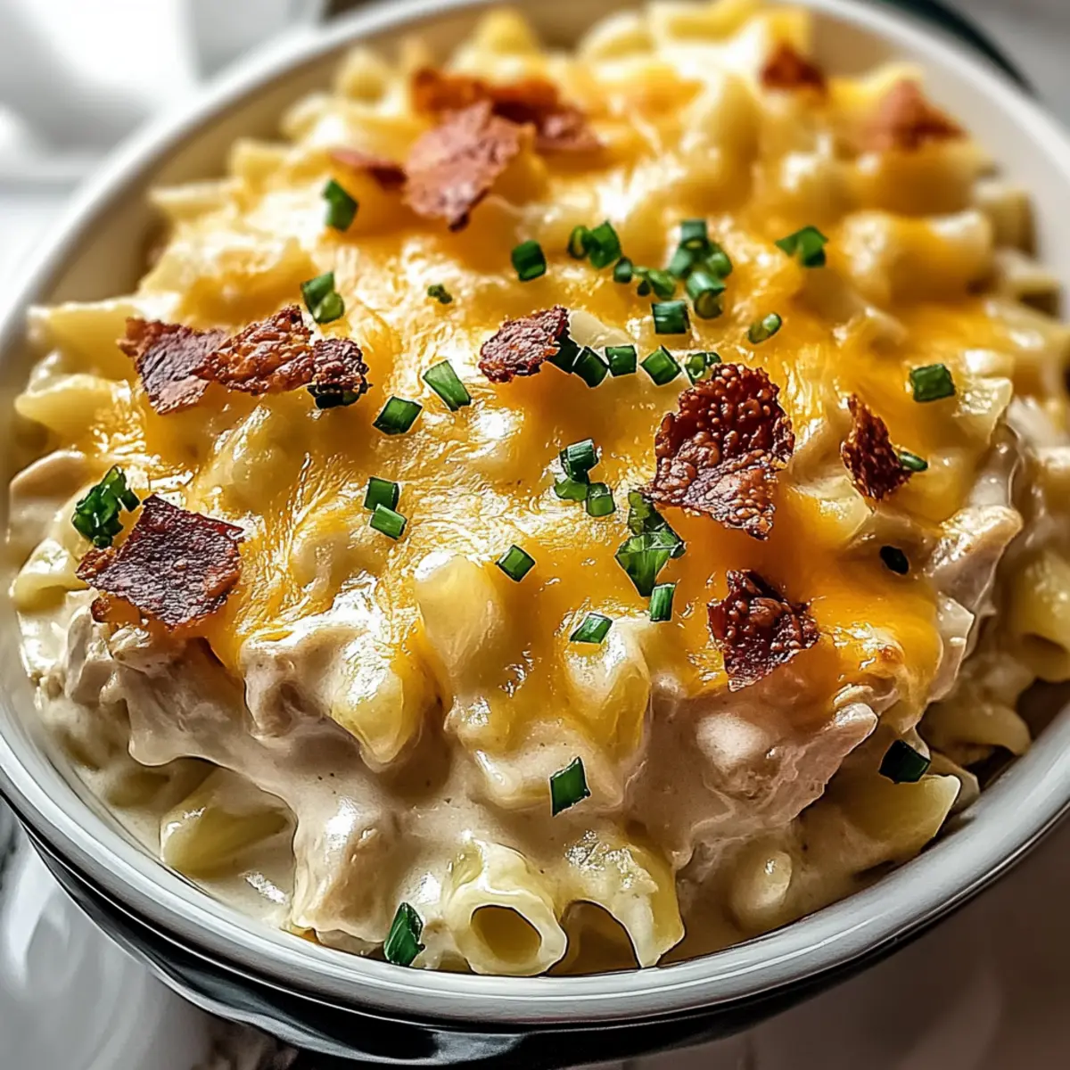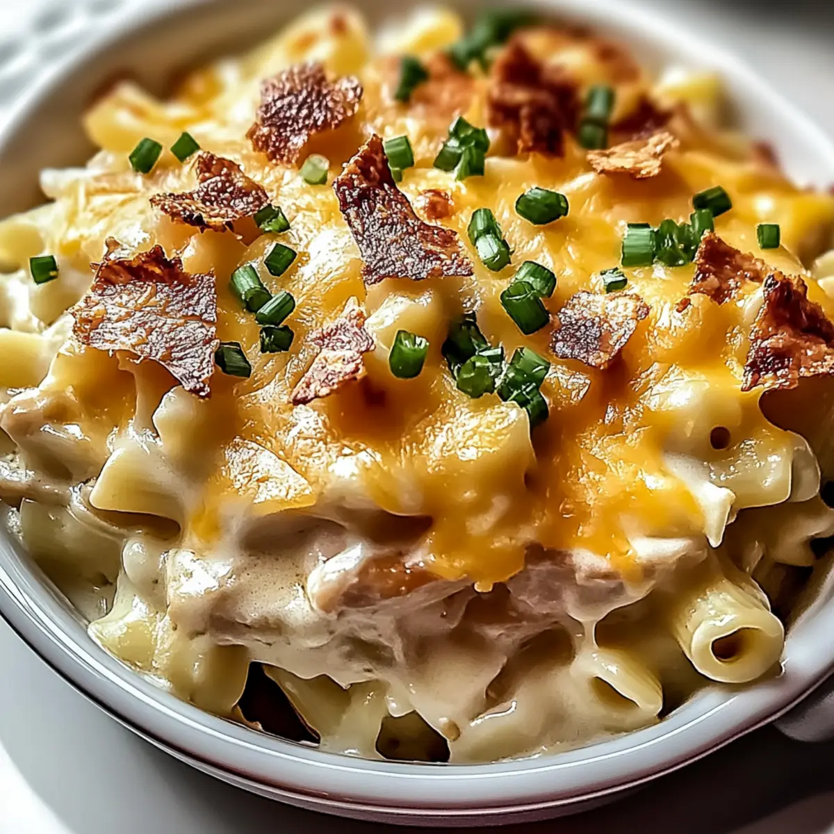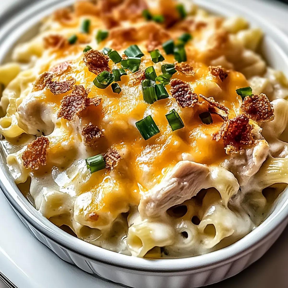 Jump to Recipe Print RecipeAs I rummaged through my pantry one evening, I stumbled upon a treasure trove of creamy goodness just waiting to be transformed into the ultimate comfort food: Crazy Good Casserole. With its tender shredded chicken and egg noodles enveloped in a luscious sauce, this dish is a true game-changer for busy weeknights. What I love most about this casserole is its infinite adaptability; you can easily swap in turkey, use cream of mushroom instead of chicken, or toss in your favorite veggies for a personalized touch. Plus, it boasts quick prep time and only one dish to clean, making it a lifesaver for the tired home chef. Ready to see how easy it is to whip up this family-friendly favorite? Let’s dive into the recipe that will have everyone asking for seconds! Why Is This Casserole So Irresistible? Endless Customization: This Crazy Good Casserole is your canvas! You can easily swap proteins, like chicken for turkey, or even add veggies such as broccoli to suit your taste and dietary needs. Time-Saver: With just one dish to prepare, you’ll appreciate the minimal cleanup while still enjoying a rich, homey flavor. Rich, Creamy Texture: The perfect combination of creamy ingredients like sour cream and cheese creates a luscious sauce that comforts both the belly and the soul. Family-Friendly: Everyone will gather around for this dish; it’s a guaranteed crowd-pleaser! Serve it along with a side salad or garlic bread for a complete meal. Make-Ahead Marvel: Get ahead of the game by prepping this casserole in advance. It’s a fantastic option for busy weeknights, ensuring you have a delightful dinner at hand. Whether you’re looking for an easy meal on a hectic night or want to impress your family with a delicious homemade dinner, this recipe won’t disappoint! If you’re in the mood for more cozy options, check out our Vegetable Casserole Cozy and Cheesy Carrot Casserole for additional inspiration! Crazy Good Casserole Ingredients Here’s everything you need to whip up this delightful dish! For the Casserole Cooked Chicken – Provides protein and heartiness; rotisserie chicken is a great time-saver. Egg Noodles – Serve as the base for the casserole; substitutes include penne or rotini. Cream of Chicken Soup – Adds creaminess and flavor; cream of mushroom can be used for a different taste. Sour Cream – Contributes to creaminess and tang; Greek yogurt can be used for a lighter option. Cheddar Cheese – Offers a rich, cheesy flavor and melts beautifully; a blend of different cheeses adds variety! Milk – Helps to create a smooth and pourable sauce; use whole milk for best results. Garlic Powder – Enhances flavor; adjust as desired, or use fresh garlic for a bolder taste. Onion Powder – Adds savory depth; adjust according to preference. Black Pepper & Salt – Essential for seasoning; adjust salt levels according to taste. Cooked Bacon – Adds smoky flavor and crunch; highly recommended for bacon lovers! Chopped Green Onions – Provides a garnish with a fresh bite; optional but recommended for added color and flavor. Prepare to be amazed by this Crazy Good Casserole that not only satisfies your taste buds but also makes your cooking experience easy and joyful! Step‑by‑Step Instructions for Crazy Good Casserole Step 1: Preheat the Oven Begin your journey to deliciousness by preheating your oven to 350°F (175°C). While the oven warms up, grab your trusty 9×13-inch baking dish and generously grease it with cooking spray or a little butter, ensuring a non-stick surface for your Crazy Good Casserole. Step 2: Cook the Noodles Bring a large pot of salted water to a rolling boil. Once bubbling, add the egg noodles and cook for 6-8 minutes until al dente, tender yet firm. Drain the noodles carefully and set them aside, letting the steam escape as you prepare for the next delicious step. Step 3: Prepare the Creamy Sauce In a medium mixing bowl, whisk together the cream of chicken soup, sour cream, milk, garlic powder, onion powder, salt, and black pepper. Keep whisking until the mixture is smooth and creamy, creating the perfect velvety sauce that will envelop the ingredients in your Crazy Good Casserole. Step 4: Combine Ingredients In a large mixing bowl, combine the cooked noodles, shredded chicken, half of the cheddar cheese, and half of the crispy bacon. Pour the creamy sauce over the noodle mixture and gently fold everything together until well combined, ensuring that every noodle is coated in deliciousness. Step 5: Assemble the Casserole Transfer the noodle mixture into the greased baking dish, spreading it evenly with a spatula. Top your Crazy Good Casserole with the remaining cheddar cheese and bacon, creating a tempting golden layer that promises a delightful melt and crunch once baked. Step 6: Bake the Casserole Cover the baking dish with foil, taking care to create a loose tent that won’t touch the cheese. Bake in the preheated oven for 20 minutes. After the time is up, remove the foil and continue baking for an additional 10-15 minutes until the cheese is melted, bubbly, and has developed a gorgeous golden top. Step 7: Rest and Garnish Once you’ve reached the perfect bubbly state, remove the casserole from the oven and allow it to rest for 5 minutes. This helps the flavors settle. For an extra touch, garnish your Crazy Good Casserole with fresh chopped green onions for a pop of color and a burst of flavor before serving. Crazy Good Casserole Variations Feel free to let your culinary creativity run wild as you make this casserole your own! Turkey Twist: Swap out chicken for cooked turkey for a delightful year-round dish. Perfect for post-holiday meals, turkey adds a unique flavor that’s equally comforting. Mushroom Magic: Use cream of mushroom soup in place of cream of chicken for an earthy twist. This variation brings a new depth of flavor that mushroom lovers will absolutely cherish. Veggie Lover’s Delight: Toss in colorful veggies like