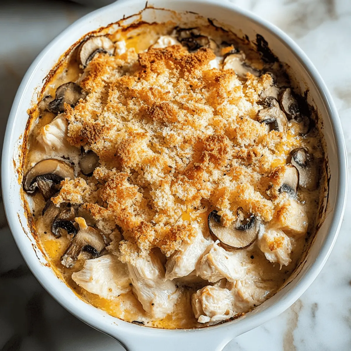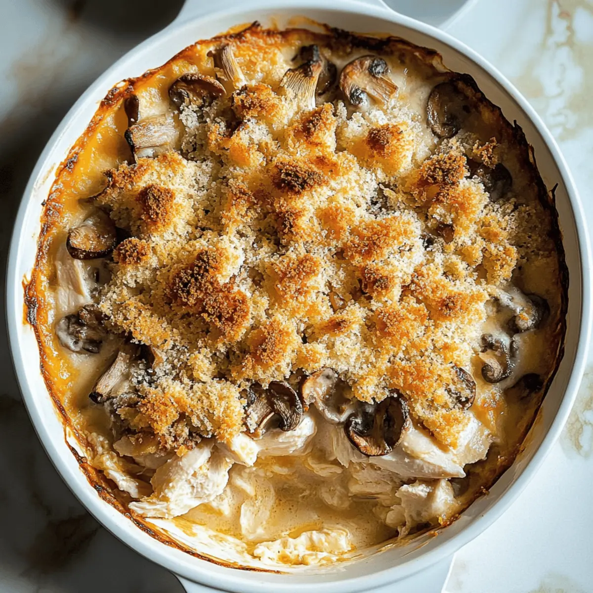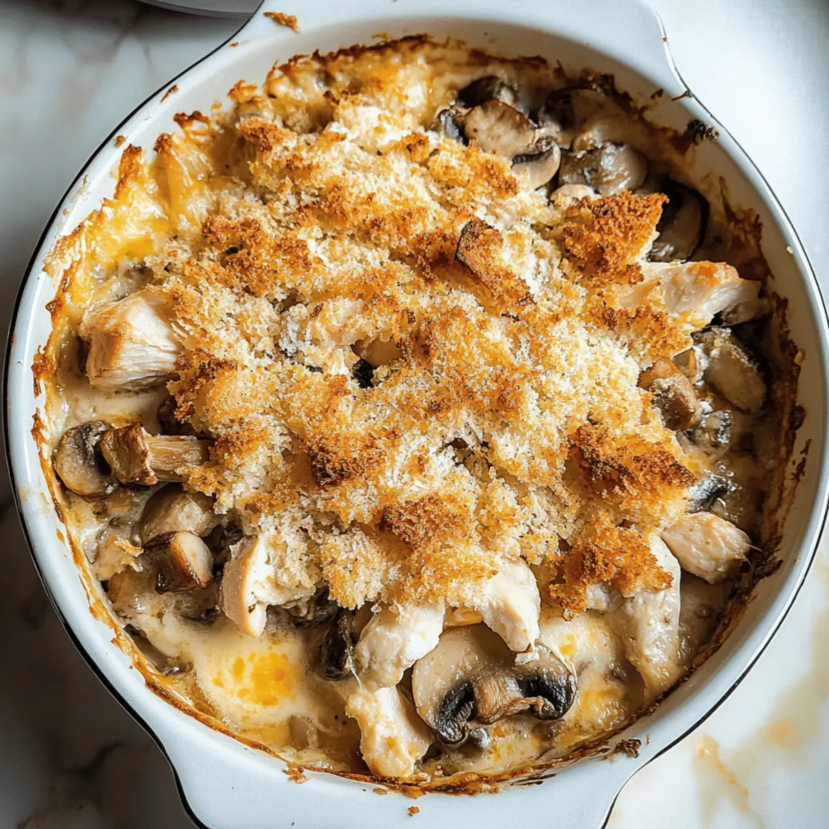 Jump to Recipe Print RecipeAs I stood in my kitchen surrounded by the familiar aroma of sautéed mushrooms and tender chicken, I couldn’t help but feel a warm sense of nostalgia wash over me. This Creamy Chicken and Mushroom Casserole has become my go-to comfort food, perfect for busy weeknights when I crave something hearty yet effortless. With its creamy sauce and crispy breadcrumb topping, this dish not only satisfies hunger but also warms the soul. Plus, it’s a fantastic make-ahead meal, allowing you to prepare it in advance and bake it when you’re ready. Whether you’re feeding a family or just treating yourself to a cozy night in, this casserole is sure to be a crowd-pleaser. Are you ready to dive into a creamy delight that will turn any ordinary evening into a special occasion? Why is this casserole so comforting? Creamy goodness: This dish wraps tender chicken and earthy mushrooms in a rich, velvety sauce that comforts like a warm hug. Quick and easy: With minimal prep time, you can have a delicious dinner ready in about 30 minutes, leaving you free to enjoy your evening. Versatile options: Whether you’re a meat lover or prefer a veggie twist with sautéed spinach and peppers, this casserole can easily adapt to your tastes. Crowd-pleaser: Perfect for family dinners or cozy gatherings, everyone will love digging into this hearty dish. Make-ahead magic: Prepare it the day before, refrigerate, and pop it in the oven when you’re ready to serve, making dinner planning a breeze. It’s a winning choice alongside a light salad or steamed vegetables, similar to my flavorful Vegetable Casserole Cozy. Whenever you’re looking for a comforting meal, this Creamy Chicken and Mushroom Casserole will always shine! Creamy Chicken and Mushroom Casserole Ingredients • Preparation is half the fun! Gather these ingredients for a truly delightful meal. For the Casserole Rotisserie Chicken – Provides convenience and flavor; a time-saver on busy nights! Sliced Mushrooms – Adds an earthy flavor and meaty texture; use cremini or button mushrooms for variety. Cream of Mushroom Soup – Acts as a creamy base and binder; swap with any cream soup for a twist. Sour Cream – Adds richness and tang; Greek yogurt can lighten up the dish deliciously. Shredded Swiss Cheese – Contributes flavor and creaminess; mozzarella or cheddar works beautifully too. Chopped Onion – Enhances depth and sweetness; shallots or leeks can be a milder option. Thyme – Offers aromatic herbal notes; dried thyme or Italian seasoning are great substitutes. Salt – Enhances flavors; adjust according to your taste preferences. Black Pepper – Adds a gentle heat; swap with white pepper for a milder taste. For the Topping Breadcrumbs – Provides a crunchy topping; try panko for extra crunch or crushed crackers as an alternative. Melted Butter – Helps brown the breadcrumbs; olive oil is a healthier choice if preferred. This Creamy Chicken and Mushroom Casserole is just the comfort food you need to warm your heart and home! Step‑by‑Step Instructions for Creamy Chicken and Mushroom Casserole Step 1: Preheat the Oven Begin by preheating your oven to 350°F (175°C). This ensures that your Creamy Chicken and Mushroom Casserole bakes evenly, achieving that perfect golden-brown topping. While the oven warms up, gather your mixing bowl and a greased 9×13 inch baking dish, which will hold all the delicious ingredients together. Step 2: Combine Ingredients In a large mixing bowl, combine shredded rotisserie chicken, sliced mushrooms, cream of mushroom soup, sour cream, shredded Swiss cheese, chopped onion, thyme, salt, and black pepper. Stir the mixture thoroughly until everything is well integrated. This rich, creamy blend is what will make your casserole comfortingly delightful, so take your time to ensure it’s evenly mixed. Step 3: Transfer to Baking Dish Pour the combined mixture into your greased 9×13 inch baking dish, spreading it out evenly with a spatula. Make sure the top is smooth and level to ensure even cooking throughout the dish. Visualize that creamy goodness ready to meld into comfort food magic as it bakes! Step 4: Prepare the Topping In a separate bowl, mix the breadcrumbs with the melted butter until they are well-coated. This step is crucial for achieving that irresistible crunchy topping. Sprinkle the breadcrumb mixture evenly over the casserole, ensuring every inch is covered. This will create a delightful contrast to the creamy filling beneath. Step 5: Bake in the Oven Place the baking dish in the preheated oven and bake for 25-30 minutes. Keep an eye on it, and look for the top to turn golden brown and bubbly. This is when your Creamy Chicken and Mushroom Casserole is at its peak, signaling that the comforting aromas are about to fill your kitchen. Step 6: Cool Slightly Before Serving Once baked, remove the casserole from the oven and let it cool slightly for about 5-10 minutes. This resting time helps the casserole set, making it easier to serve. As you prepare for serving, take in those mouthwatering scents of creamy chicken and earthy mushrooms mingling beautifully. How to Store and Freeze Creamy Chicken and Mushroom Casserole Fridge: Store leftovers in an airtight container for up to 3 days. Allow the casserole to cool completely before sealing to preserve freshness. Freezer: For longer storage, freeze the casserole before baking. Wrap tightly in foil or plastic wrap, and it can last up to 3 months. Reheating: To reheat, thaw in the fridge overnight, then bake at 350°F (175°C) for about 25-30 minutes until heated through. Make-Ahead: If preparing a day ahead, cover and refrigerate the unbaked casserole. Bake it fresh when you’re ready to serve your Creamy Chicken and Mushroom Casserole! What to Serve with Creamy Chicken and Mushroom Casserole As you prepare to enjoy this comforting dish, consider pairing it with delightful sides that enhance its creamy goodness and well-rounded flavo