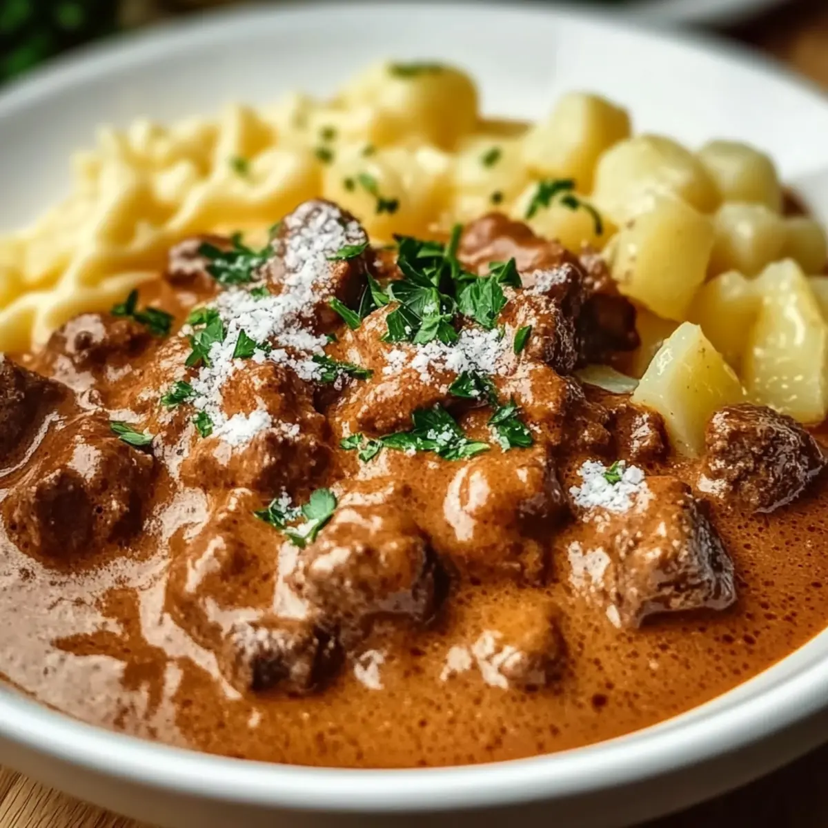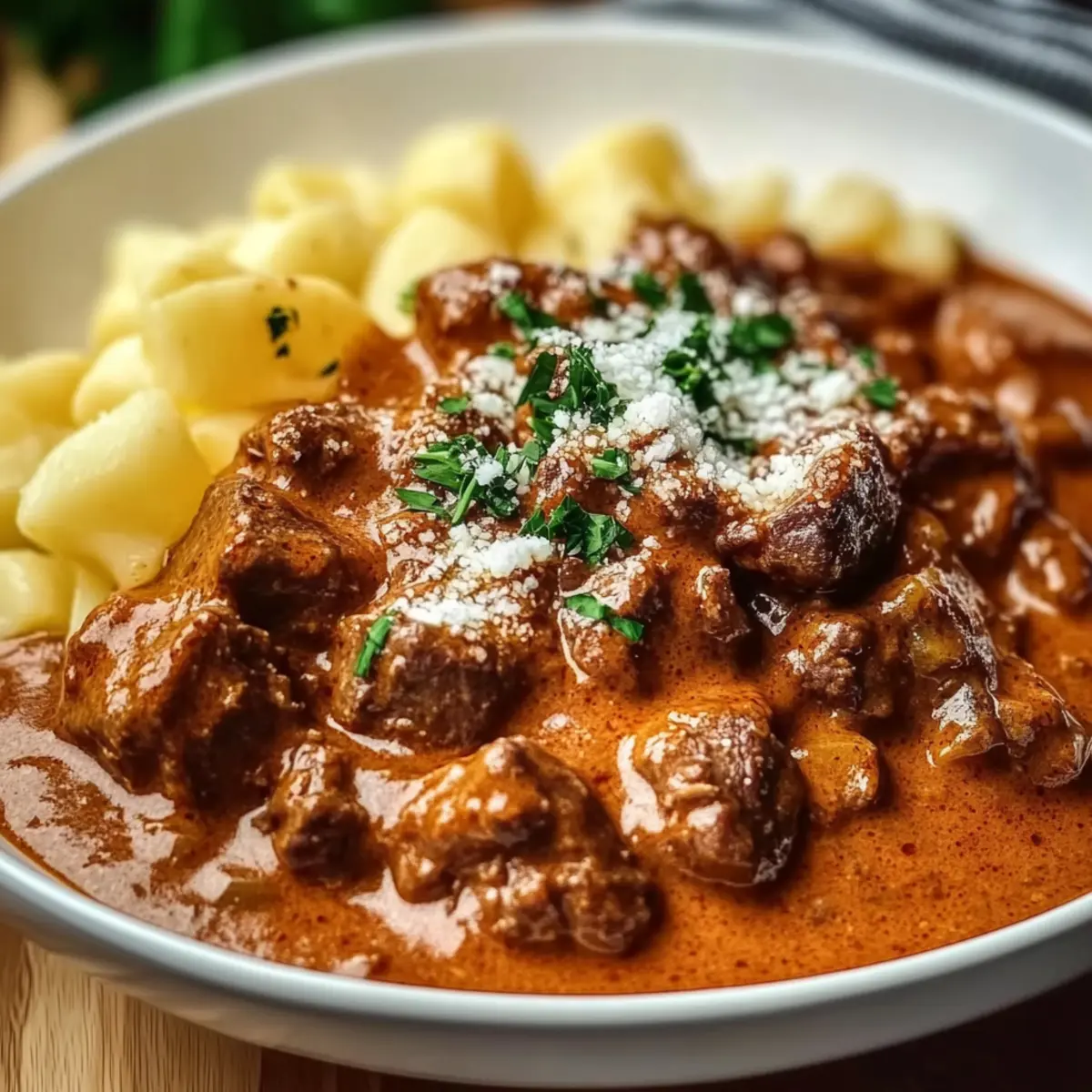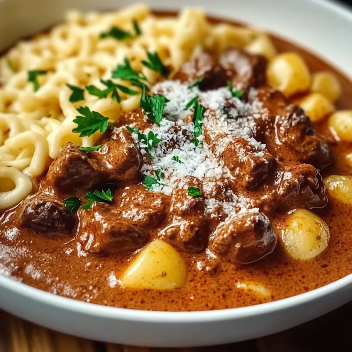 Jump to Recipe Print RecipeAs the frost settles outside, I often find myself reaching for the heartwarming embrace of creamy German goulash. This ain’t just any recipe; it’s a nostalgic hug in a bowl—perfect for cozy nights spent curled up with family. With its tender beef simmered in a velvety, paprika-spiced sauce, this easy recipe captures the essence of comfort food, leaving you satisfied without hours of labor in the kitchen. Not only does it nourish your soul, but it’s also versatile enough to adapt for vegetarian diners or those seeking a lighter option. Curious about how to elevate your weeknight dinners with this crowd-pleaser? Let’s dive into the steps to create your own deliciously comforting masterpiece! Why is German Goulash So Irresistible? Comforting warmth: Each bowl of creamy German goulash offers a nostalgic hug, perfect for chilly evenings. Easy to make: With just a few simple steps, you can whip up this delightful dish without spending hours in the kitchen. Flavor-packed goodness: The rich combination of sweet and smoked paprika, along with savory spices, creates an unforgettable taste that warms the soul. Endless versatility: Customize it for vegetarians by swapping in hearty vegetables or using vegetable broth for a lighter version. Crowd-pleasing appeal: This dish is sure to impress family and friends, making it a delicious centerpiece for any gathering! German Goulash Ingredients For the Base Beef chuck – Tender cuts provide the main protein; use flank steak for a leaner option. Onions – Add sweetness and depth; yellow onions work best for goulash flavoring. Olive oil – For browning beef and sautéing vegetables; can be replaced with vegetable oil. Sweet paprika – Essential for the goulash’s signature flavor; substitute with regular paprika as needed. Smoked paprika – Adds a delightful smoky depth; if unavailable, use extra sweet paprika with a dash of liquid smoke. Caraway seeds – Provide a unique, earthy taste; omit or replace with fennel seeds if desired. Marjoram – Enhances the classic flavor; thyme can be used as an alternative if marjoram is unavailable. Cayenne pepper – Optional heat enhancer; reduce or omit for a milder touch. Garlic – Imparts aromatic flavor; fresh is best, but garlic powder can be used in a pinch. Tomato paste – Adds concentration and umami; canned tomato sauce can be used as an alternative. Beef broth – Moisture and flavor; vegetable broth can help create a lighter version. Dry red wine – Enhances depth of flavor; optional for a non-alcoholic version—just add more broth. Diced tomatoes – Contributes acidity and moisture; fresh tomatoes can also work beautifully. Bell peppers – Adds freshness and color; substitute with green peppers for a different taste. Potatoes – Provides heartiness; Yukon gold potatoes are ideal but any sturdy variety will do. For the Creamy Finish Sour cream – Provides a creamy finish; can be replaced with crème fraîche or omitted for a lighter dish. All-purpose flour – Thickens and stabilizes sauce; use cornstarch for a gluten-free alternative. For Garnish Fresh parsley – Adds a lovely touch of freshness; can be omitted if not available. Salt and pepper – Essential for balancing flavor; adjust to taste. Optional Accompaniments Noodles or Spätzle – Traditional accompaniments that elevate the dish; perfect for scooping up all that creamy goodness! Curious about the marvelous creation that unfolds from these ingredients? Let’s get cooking! Step‑by‑Step Instructions for Creamy German Goulash Step 1: Prepare the Beef Pat the beef chuck cubes dry with paper towels, then season generously with salt and pepper. This step ensures a flavorful crust. Using a Dutch oven over medium-high heat, add a drizzle of olive oil and allow it to heat until shimmering. Carefully add the beef in batches, browning each piece for about 3-5 minutes until a rich golden-brown crust forms. Remove the beef and set aside. Step 2: Sauté the Aromatics In the same pot, lower the heat to medium and add a bit more olive oil if needed. Toss in the chopped yellow onions and sauté them for about 5-7 minutes until they turn translucent and slightly caramelized. The aroma will fill your kitchen, hinting at the comforting Creamy German Goulash to come. Step 3: Infuse with Flavor Once the onions are softened, add minced garlic and cook for an additional minute, stirring frequently until fragrant. Next, sprinkle in the sweet and smoked paprika, caraway seeds, and marjoram. Stir the mixture well, allowing the spices to bloom in the residual oil for about 1-2 minutes, creating a flavorful base for your goulash. Step 4: Build the Sauce Add tomato paste to the pot, stirring it into the spicy onion mixture for about 2-3 minutes. This will deepen the flavors further. Afterward, pour in the beef broth and dry red wine, using a wooden spoon to scrape up any browned bits from the bottom of the pot. These bits are flavor gold that adds richness to the Creamy German Goulash. Step 5: Combine and Simmer Return the browned beef to the pot along with diced tomatoes and bell peppers. Stir gently to combine everything, then increase the heat and bring the mixture to a gentle simmer. Once it bubbles, reduce the heat to low, cover the pot, and let it simmer for 2-3 hours. This slow cooking allows the beef to become tender and absorb all the savory flavors. Step 6: Add Potatoes After 2 hours of simmering, add the cubed Yukon gold potatoes to the mixture. Stir gently, cover again, and continue simmering for another 30-45 minutes, or until the potatoes are fork-tender. This step enhances the heartiness of your Creamy German Goulash while the flavors meld beautifully. Step 7: Create the Creamy Finish In a small bowl, whisk together sour cream and all-purpose flour until smooth. To temper the mixture and prevent curdling, ladle a cup of the hot goulash liquid into the bowl slowly and whisk continuously. Then, add this c