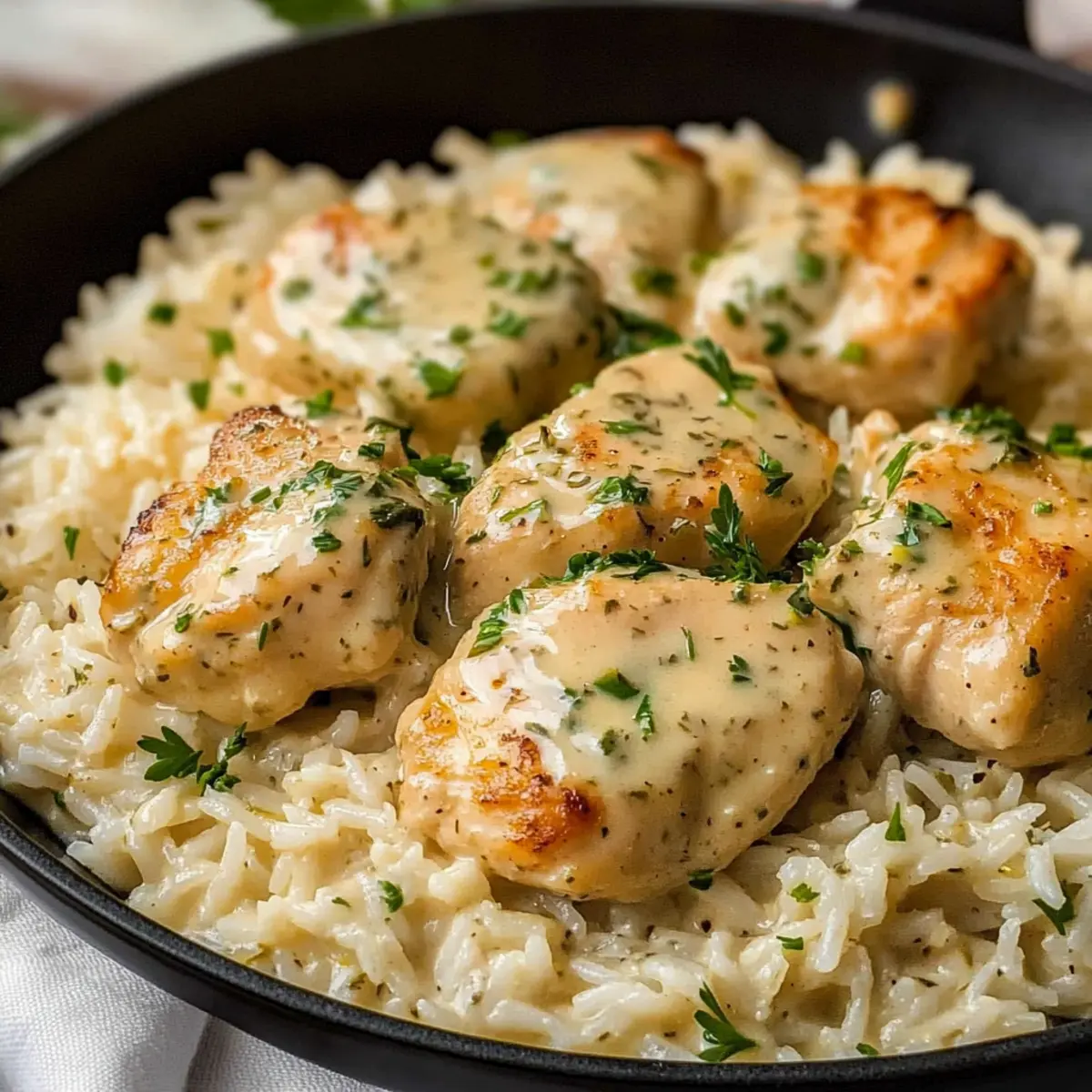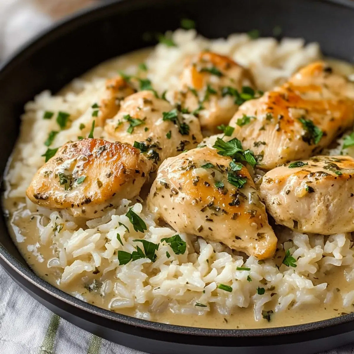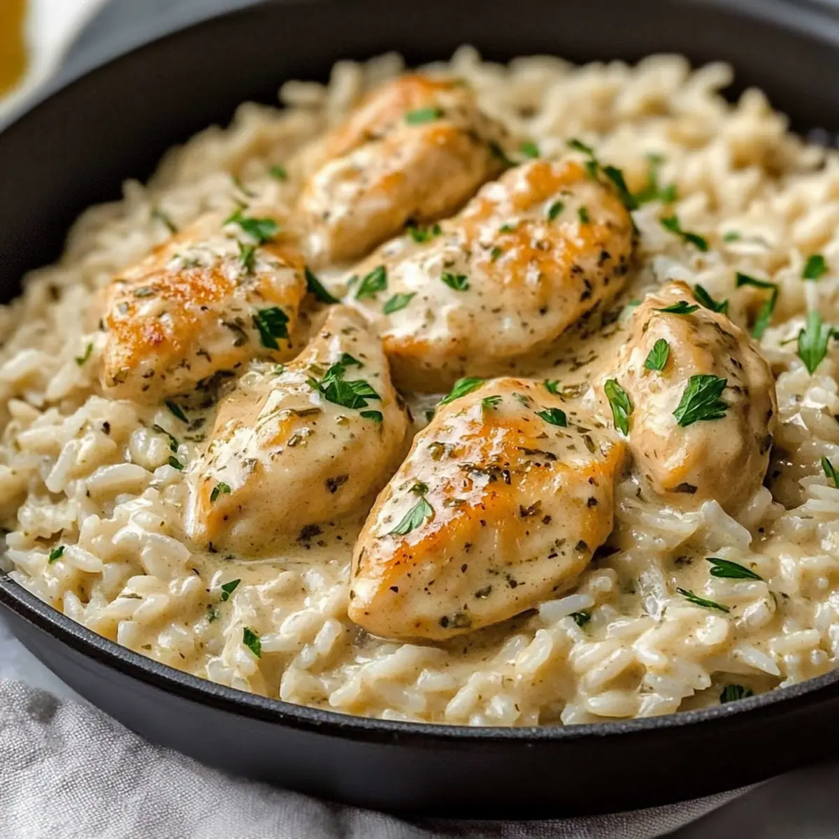 Jump to Recipe Print RecipeI once found myself standing in the kitchen, the aroma of fresh herbs and sizzling chicken filling the air, transporting me to a sunlit garden in Tuscany. This Creamy Herb Chicken & Basmati Rice captures that essence perfectly, offering a delightful one-pan meal that’s as satisfying as it is simple. With just a handful of ingredients, you can create a comforting dinner that not only pleases the palate but also cuts down on cleanup time – a win for any home chef. Whether you’re looking to impress guests or simply enjoy a cozy night in, this dish is customizable to suit any taste. Intrigued by how a humble collection of ingredients can transform into something special? Let’s dive into the recipe! Why Is This Recipe a Must-Try? Simplicity, this one-pan dish is perfect for busy weeknights, offering an effortless cooking experience with minimal cleanup. Rich Flavors from the creamy sauce and herby notes elevate the humble chicken and rice combination into a gourmet meal. Customizable, you can easily adjust ingredients to fit your dietary preferences, whether you’re opting for a dairy-free version or adding in colorful veggies. Crowd-Pleaser, this recipe is sure to impress family and friends alike, making it a staple for gatherings and casual dinners. If you love one-pan wonders like my Chicken Noodle Soup or Cheesy Garlic Chicken, this Creamy Herb Chicken & Basmati Rice will quickly become a new favorite! Creamy Herb Chicken & Basmati Rice Ingredients For the Chicken • Olive Oil – Cooking fat for searing chicken; can substitute with vegetable oil. • Boneless Skinless Chicken Breasts (or Thighs) – Main protein source; may use shrimp, salmon, or tofu as alternatives. • Garlic Powder – Adds depth and flavor; fresh garlic can be used. • Onion Powder – Enhances taste profile; can substitute with fresh onions. • Italian Seasoning – Provides herby flavor; omit or use fresh herbs for a burst of freshness. • Paprika – Adds color and a mild flavor; substitute with smoked paprika for a different aroma. • Salt – Essential for flavor; adjust to taste. • Black Pepper – For seasoning; can use white pepper for a subtler taste. For the Sauce • Butter – For sautéing aromatics; can be replaced with a dairy-free option. • Garlic – Freshly minced for flavor; can add more based on preference. • Onion – Diced for the sauce; shallots may be substituted for a milder flavor. • Heavy Cream (or Half & Half) – For a rich, creamy sauce; coconut milk for a dairy-free version. • Chicken Broth – Cooking liquid for rice; may use vegetable broth for a vegetarian option. • Dried Herbs (Thyme, Rosemary, Oregano) – Enhances the herbaceous flavor; fresh herbs can be preferred. • Parmesan Cheese – Adds creaminess and flavor; nutritional yeast can be used for a dairy-free option. For the Rice • Basmati Rice – Base of the dish, offers a nutty flavor; white rice can be an alternative. • Fresh Parsley – For garnishing; cilantro may also be a good substitute. • Lemon Zest (optional) – Adds brightness; can omit if not available. Step‑by‑Step Instructions for Creamy Herb Chicken & Basmati Rice Step 1: Season and Sear the Chicken Pat the boneless skinless chicken breasts dry and season generously with garlic powder, onion powder, Italian seasoning, paprika, salt, and pepper. In a large skillet, heat 2 tablespoons of olive oil over medium-high heat. Sear the chicken for 4-5 minutes on each side until golden brown. Once cooked through, with an internal temperature of 165°F, transfer the chicken to a plate and set aside. Step 2: Sauté Aromatics Using the same skillet, reduce the heat to medium and add 2 tablespoons of butter. Once melted, toss in the diced onion and sauté for about 3 minutes until softened and translucent. Add in 2 minced garlic cloves and cook for an additional 30 seconds until fragrant, allowing the delicious aromas to fill your kitchen. Step 3: Cook Basmati Rice Stir in 1 cup of rinsed basmati rice, toasting it lightly in the aromatic mixture for about 1 minute. This toasting step enhances the rice’s flavor. Next, pour in 2 cups of chicken broth, season with salt and pepper to taste, and mix everything together. Bring this mixture to a gentle boil. Step 4: Make Creamy Sauce Reduce the heat to low and stir in 1 cup of heavy cream, followed by dried herbs such as thyme, rosemary, and oregano. Add ½ cup of grated Parmesan cheese, stirring continuously until the cheese melts and the sauce becomes rich and creamy. This is where your Creamy Herb Chicken & Basmati Rice starts to shine! Step 5: Simmer Together Return the seared chicken to the skillet, partially immersing it in the creamy sauce and rice mixture. Cover with a lid and let it simmer on low heat for about 20 minutes. This allows the flavors to meld beautifully while the rice absorbs the liquid and the chicken finishes cooking. Step 6: Serve and Garnish After 20 minutes, check that the chicken is cooked thoroughly and the rice is tender. Remove the skillet from heat and let it rest for 5 minutes. Just before serving, garnish with freshly chopped parsley and a sprinkle of lemon zest for a pop of freshness. Your Creamy Herb Chicken & Basmati Rice is now ready to bring warmth to your dinner table! Creamy Herb Chicken & Basmati Rice Variations Feel free to play chef and add your personal touch to this delightful dish—your creativity is bound to shine through! Dairy-Free: Use coconut milk instead of heavy cream and substitute nutritional yeast for cheese for a delightful vegan twist. Vegetable Additions: Stir in fresh spinach, sautéed mushrooms, or roasted bell peppers for an extra boost of flavor and nutrition. Spicy Version: Include a pinch of red pepper flakes or a splash of your favorite hot sauce to turn up the heat on this comforting meal. Rice Options: Experiment with brown rice for added fiber; just be sure to adjust the cooking time and liquid a
