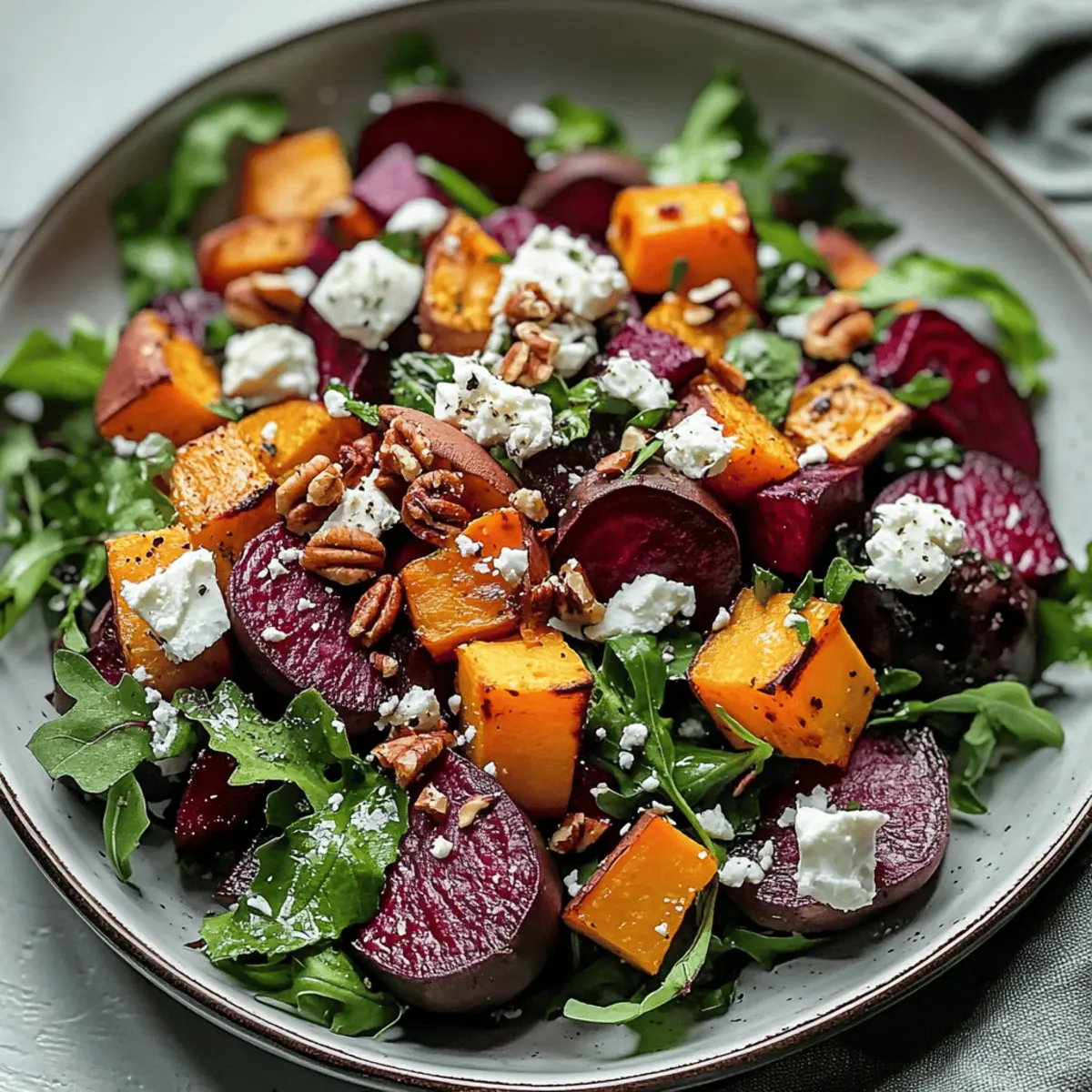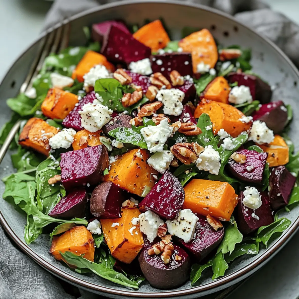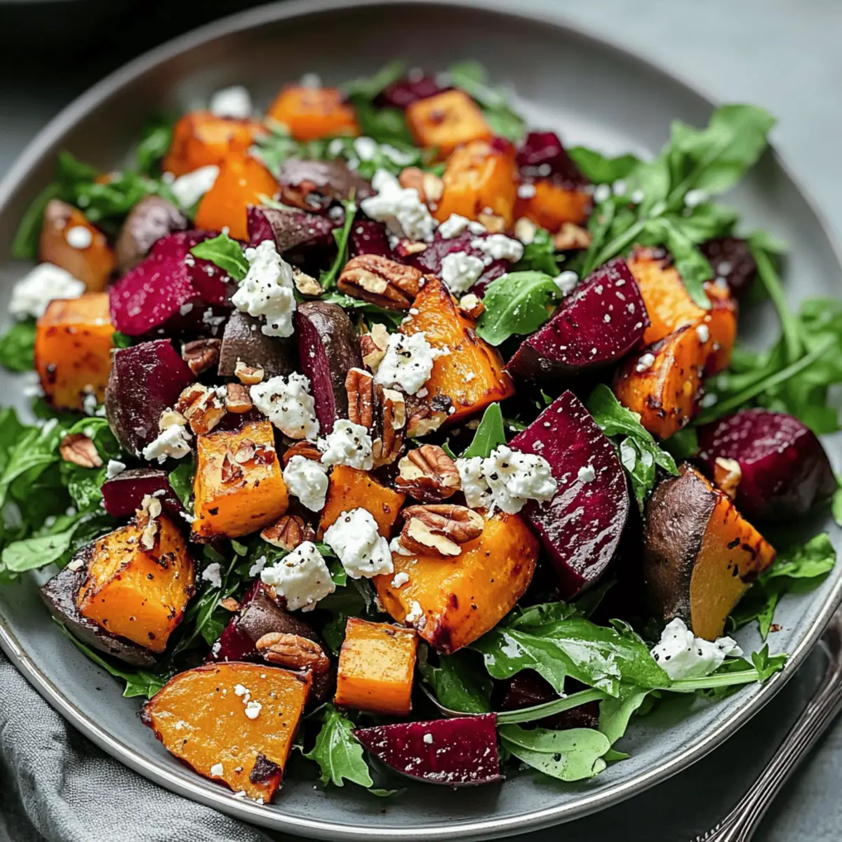 Jump to Recipe Print RecipeAs I stood in my kitchen, the aroma of roasted beets and sweet potatoes wafted through the air, instantly uplifting my mood. This Creamy Roasted Beet Salad with Sweet Potato & Feta has become my go-to meal when I crave something colorful yet nutritious. The wonderful part? It’s not only a feast for the eyes but also incredibly versatile, easily adapting to vegan and nut-free diets. Tossed with a rich, creamy dressing that balances the earthy sweetness of the vegetables, this dish is perfect as a light main course or a delightful side. Plus, it packs healthy ingredients that will keep you feeling energized and satisfied. Are you ready to elevate your salad game and impress your friends and family with this vibrant creation? Why is this salad a standout? Vibrant Colors: This Creamy Roasted Beet Salad with Sweet Potato & Feta is a showstopper, showcasing stunning hues that make every serving a feast for the eyes. Flavor Harmony: The delightful blend of earthy beets, sweet potatoes, and tangy feta creates a taste sensation that dances on your palate. Flexibility: With easy vegan and nut-free adaptations, it’s an inclusive dish for all dietary preferences, whether you’re serving guests or family. Quick Prep: A straightforward recipe that saves time, making it ideal for busy weeknights or impressive entertaining—perfect alongside grilled dishes, like Sausage Sweet Potatoes. Nutritional Powerhouse: Packed with vitamins and essential nutrients, this salad keeps you full and fueled, providing that much-needed energy boost. Discover the joy of fresh ingredients in each bite, as you elevate your meals with this deliciously creamy salad! Creamy Roasted Beet Salad Ingredients For the Salad Beets – Earthy flavor base; substitute with roasted carrots for a different sweetness. Sweet Potatoes – Adds sweetness and creamy texture; can swap for butternut squash if desired. Feta Cheese – Adds richness and tang; use vegan cheese for a dairy-free option. Baby Spinach or Arugula (optional) – Leafy greens for added nutrients; substitute with kale or mixed greens. Walnuts or Pecans (optional) – Provides crunch and flavor; omit for nut-free option or substitute with seeds. For the Dressing Greek Yogurt – Provides creaminess in the dressing; replace with silken tofu for a vegan alternative. Mayonnaise – Adds smoothness to the dressing; use vegan mayonnaise for a dairy-free version. Honey or Maple Syrup – Adds sweetness to the dressing; use agave syrup for a vegan substitute. Lemon Juice – Brightens flavor; use apple cider vinegar as an alternative. Dijon Mustard – Adds depth to the dressing; can substitute with regular mustard. Garlic – Adds aromatic flavor; adjust quantity based on preference. For Roasting Olive Oil – Essential for roasting and rich flavor; can use avocado oil as an alternative. Salt and Black Pepper – Enhances overall flavor; adjust to taste. Embrace the harmonious blend of flavors and nutritional benefits with this Creamy Roasted Beet Salad with Sweet Potato & Feta—a salad that is sure to impress! Step‑by‑Step Instructions for Creamy Roasted Beet Salad with Sweet Potato & Feta Step 1: Preheat the Oven Start by preheating your oven to 400°F (200°C). While it warms up, line a baking sheet with parchment paper. This will make clean-up a breeze and prevent the vegetables from sticking. The oven’s warm heat will perfectly roast the beets and sweet potatoes, intensifying their natural sweetness for the Creamy Roasted Beet Salad with Sweet Potato & Feta. Step 2: Prepare the Vegetables Next, peel and dice the beets and sweet potatoes into bite-sized pieces to ensure even cooking. In a large bowl, toss them gently with olive oil, salt, and black pepper until they are well coated. You can just smell how delicious these are going to be! Keep the colors vibrant and the flavors bold as they transform in the oven. Step 3: Roast the Vegetables Spread the prepared beets and sweet potatoes on the baking sheet in a single layer, ensuring they have plenty of room to roast evenly. Place the sheet in the oven and roast for 30–35 minutes, stirring halfway through. They are ready when they are tender and caramelized in color, filling your kitchen with a warm, earthy aroma. Step 4: Make the Dressing While the vegetables are roasting, whisk together the creamy dressing. In a medium bowl, combine Greek yogurt, mayonnaise, honey, lemon juice, Dijon mustard, and minced garlic. Season with salt and pepper for balance. If you prefer a thinner consistency, feel free to add a splash of water until you reach your desired creaminess, perfect for drenching the salad. Step 5: Toast Nuts (Optional) If you’re adding nuts, heat a dry skillet over medium heat. Add walnut or pecan pieces and toast them for about 5 minutes, stirring frequently until golden and fragrant. Be careful not to burn them! These toasted nuts will add a delightful crunch to your Creamy Roasted Beet Salad with Sweet Potato & Feta, enhancing both texture and flavor. Step 6: Assemble the Salad Once the vegetables have cooled slightly, transfer them to a large mixing bowl. Add crumbled feta cheese and any optional leafy greens, like baby spinach or arugula. Drizzle the creamy dressing generously over the top and toss gently to combine all the flavors, ensuring every bite captures the essence of your Creamy Roasted Beet Salad with Sweet Potato & Feta. Step 7: Serve the Salad Finally, if using, sprinkle the toasted nuts on top of the salad for added crunch. Serve immediately while warm or chill to enjoy later. This vibrant salad makes for a stunning centerpiece, pleasing both the eyes and the palates of your friends and family. Storage Tips for Creamy Roasted Beet Salad with Sweet Potato & Feta Fridge: Store leftovers in an airtight container in the refrigerator for up to 3 days to maintain freshness. Freezer: While freezing is not ideal due to texture changes, you can freeze roasted beets and