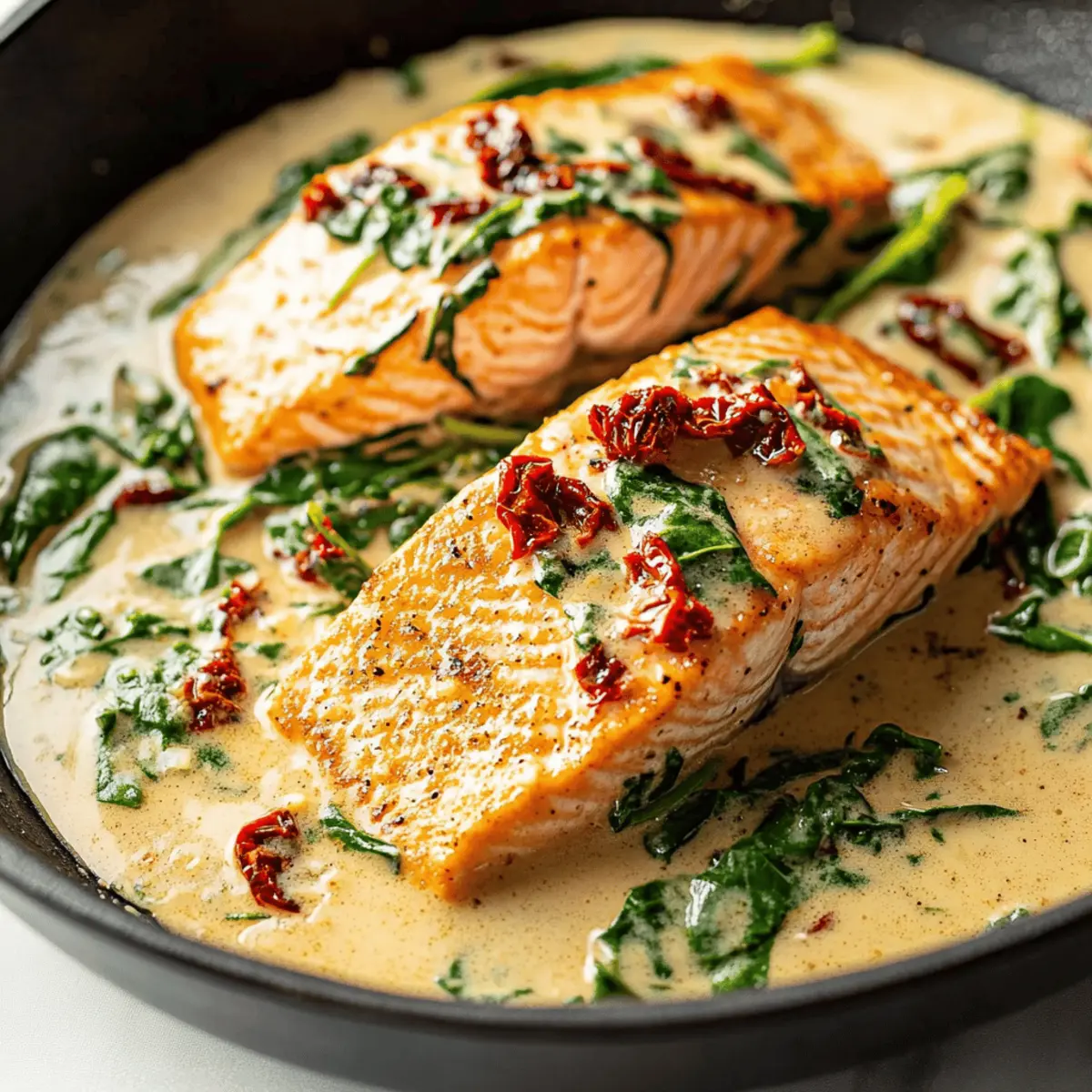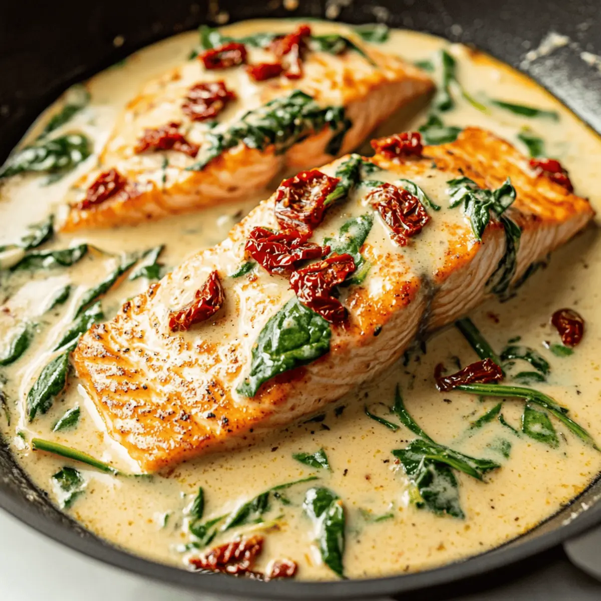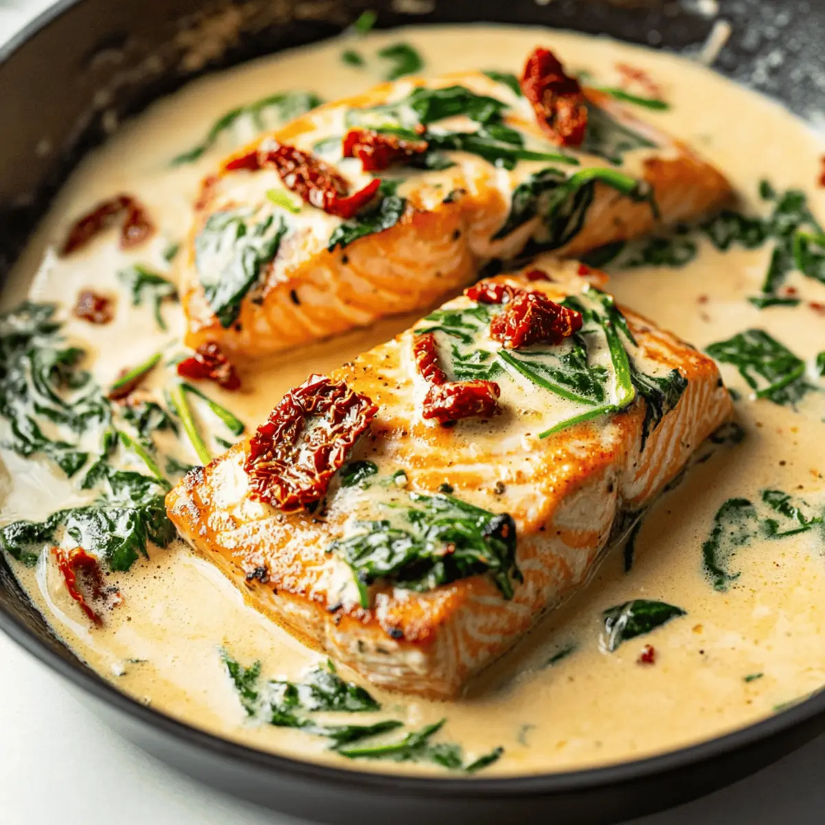Jump to Recipe Print RecipeAs I plucked sun-dried tomatoes from my pantry, a wave of inspiration hit me — what if I created a dish that effortlessly marries creamy indulgence with gourmet flair? Enter my 20-Minute Creamy Tuscan Salmon! This elegant main dish is not just a feast for the eyes; it’s remarkably quick and easy, perfect for those busy weeknights when you crave something special without the fuss. With vibrant spinach and a velvety sauce that envelops tender salmon, every bite transports you straight to the heart of Tuscany, proving that homemade food can be a delightful escape. Ready to impress your dinner guests or simply treat yourself? Let’s dive into this flavorful adventure together! Why is Creamy Tuscan Salmon a Must-Try? Quick and Easy: Whipping up this dish only takes 20 minutes, making it a perfect choice for busy weeknights. Gourmet Flavor: The rich combination of sun-dried tomatoes, spinach, and a creamy sauce elevates simple salmon to a true gourmet experience. Versatile Ingredients: Feel free to swap salmon with chicken or shrimp based on your preferences, or add your favorite greens. Impress Without Stress: Whether it’s a family dinner or a special occasion, this recipe is sure to impress your guests without the fuss. Crowd-Pleasing Delight: The vibrant colors and decadent flavors make it a hit with both adults and kids alike, ensuring everyone leaves the table satisfied. If you’re in the mood for more salmon inspiration, check out my delicious Spicy Salmon Bowls or my delightful Smoked Salmon Cottage Cheese Toast for even more enticing variations! Creamy Tuscan Salmon Ingredients For the Salmon • Fresh Salmon – Cut into portions for a tender, flaky texture. • Salt & Pepper – Season to taste; enhances the natural flavor of the salmon. • Garlic Powder – Adds an aromatic note; fresh garlic can be a tasty alternative. • Flour – Dredging for a light crust; gluten-free options like almond flour work well. For the Sauce • Olive Oil – Perfect for sautéing; adds an earthy flavor. Substitute with any cooking oil. • Butter – Richens the sauce, giving it a delightful depth. • Chicken Broth or Dry White Wine – Moistens and flavors the sauce; low-sodium broth is a healthier option. • Lemon Juice – Brightens the dish and cuts through the creaminess; fresh juice is best. • Sun-Dried Tomatoes – Sweet and textured; oil-packed for optimal flavor. • Heavy/Whipping Cream – Forms the base of the creamy sauce; half-and-half can lighten it up. • Fresh Baby Spinach – Adds color and nutrients; can swap with kale or Swiss chard. Optional Additions • Fresh Basil – Use for an aromatic lift and beautiful presentation. • Freshly Grated Parmesan Cheese – Offers a nutty finish; optional but recommended for extra depth. Discover the joy of homemade gourmet with this Creamy Tuscan Salmon that effortlessly transforms your dinner into a culinary getaway! Step‑by‑Step Instructions for Creamy Tuscan Salmon Step 1: Prepare the Salmon Begin by seasoning the fresh salmon fillets generously with salt, pepper, and garlic powder, ensuring each piece is well-coated. Next, dredge the salmon in flour to create a slight crust that will help lock in moisture during cooking. Set the prepared fish aside while you heat up the skillet. Step 2: Heat the Skillet In a large skillet, heat 2 tablespoons of olive oil and 1 tablespoon of butter over medium-high heat. Allow the butter to melt completely and foam slightly, indicating that your skillet is hot and ready. You’re aiming for a sizzle when the salmon hits the pan, so be sure to keep an eye on it as you prepare the next steps. Step 3: Sear the Salmon Carefully place the dredged salmon fillets into the hot skillet, ensuring they are not crowded. Sear each side for about 3–4 minutes until they develop a golden-brown crust. The salmon should still be slightly undercooked in the center, appearing opaque at the edges. Once ready, gently transfer the salmon to a plate and set aside while you make the sauce. Step 4: Build the Sauce In the same skillet, add ½ cup of chicken broth (or dry white wine) along with the juice of half a lemon and ½ cup of sun-dried tomatoes. Increase heat slightly and let the mixture bubble for about 2 minutes, scraping any browned bits from the skillet to enhance the sauce’s flavor. This step centers the dish around the creamy Tuscan salmon, deepening its richness. Step 5: Add Cream Lower the heat and stir in 1 cup of heavy cream into the bubbling mixture, mixing well to combine everything. Allow the sauce to cook for an additional 2 minutes until it thickens slightly. You’ll notice a luxurious, velvety texture develop, perfect for enveloping the salmon. Step 6: Incorporate Spinach Next, reduce the heat to medium-low and add 2 cups of fresh baby spinach to the creamy sauce. Stir gently until the spinach wilts down, which should take about 30 seconds. The vibrant green spinach adds both nutrition and visual appeal, harmonizing perfectly with the creamy Tuscan salmon. Step 7: Reintroduce Salmon Carefully return the seared salmon fillets to the skillet, nestling them in the creamy sauce. Cover the skillet and cook for an additional 2–3 minutes until the salmon is opaque and cooked through. It’s key that the salmon remains moist and tender, so keep an eye on it to avoid overcooking. Step 8: Final Touches Once done, remove the skillet from heat and garnish your creamy Tuscan salmon with freshly chopped basil and grated Parmesan cheese, if desired. This final touch not only enhances the flavor but also elevates presentation, making your dish irresistible and ready to serve! Creamy Tuscan Salmon: Customization Ideas Feel free to explore these exciting possibilities to elevate your creamy Tuscan salmon experience! Dairy-Free: Swap the heavy cream for coconut milk for a delicious dairy-free version that retains creaminess. Protein Swap: Replace salmon with chicken breast or 