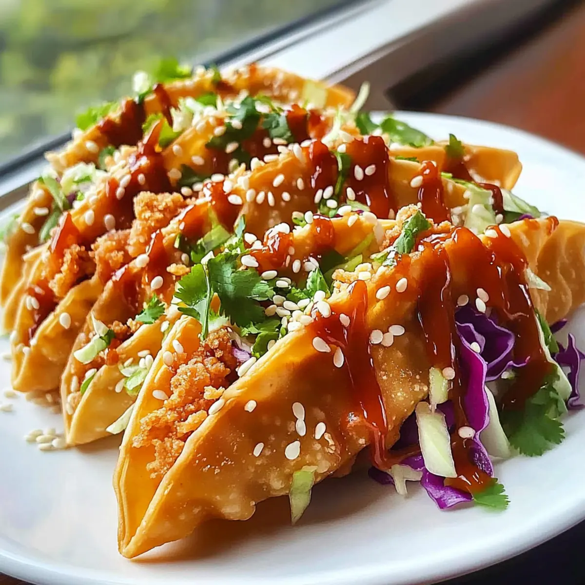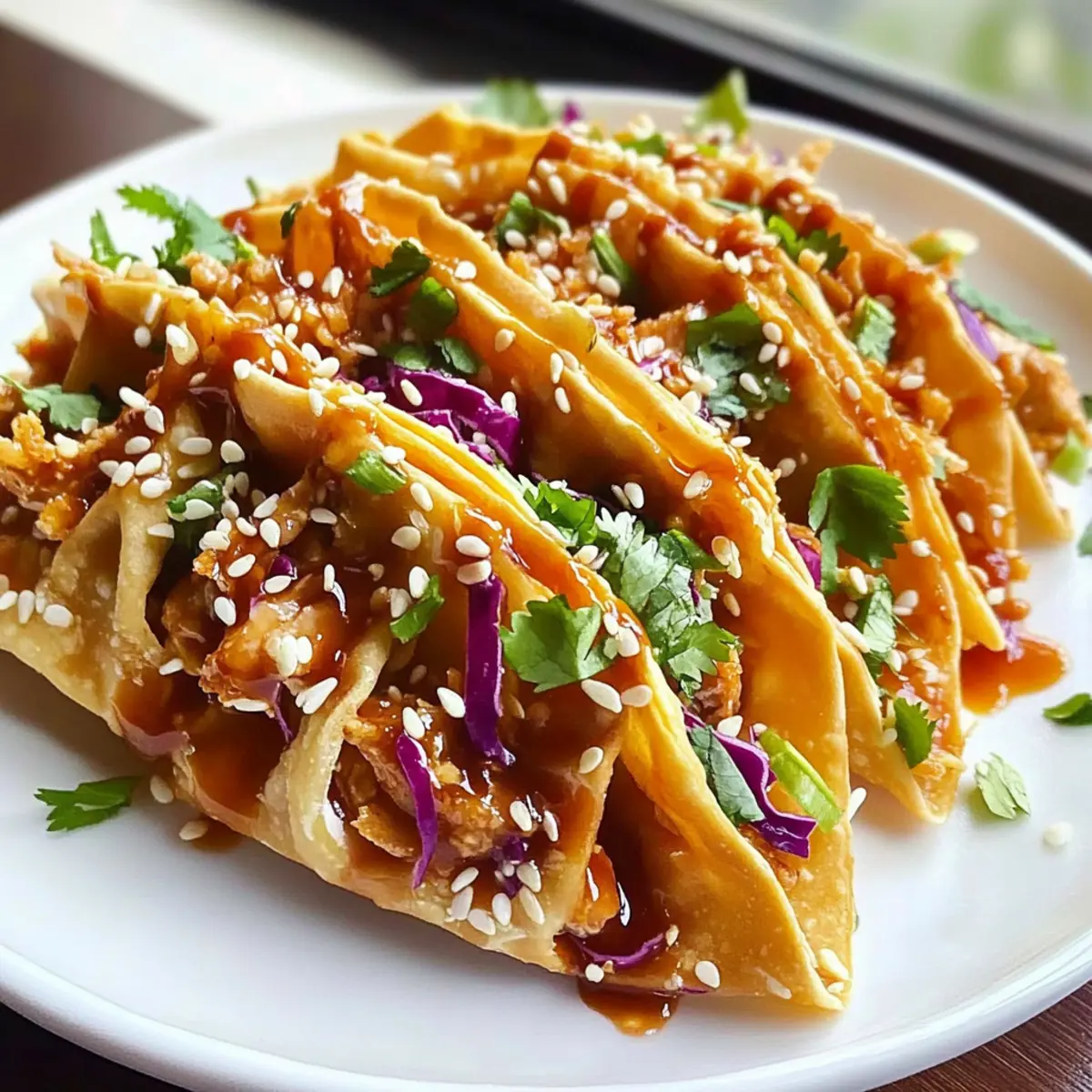 Jump to Recipe Print RecipeAs I sifted through my pantry one evening, an idea struck—why not infuse my taco night with a delightful Asian twist? Enter the Crispy Chicken Wonton Tacos! This fun and easy appetizer blends the satisfying crunch of golden-fried wontons with tender teriyaki chicken and a fresh, zesty slaw. Perfect for impressing guests or satisfying late-night cravings, these tacos can be whipped up in under 30 minutes. They bring excitement to your table while being friendly to lactose-intolerant foodies! Ready to discover how to craft these fantastic fusion bites? Let’s dive into the mouthwatering details together! Why Choose Crispy Chicken Wonton Tacos? Flavor Explosion: Each bite bursts with an incredible combination of juicy teriyaki chicken and a crunchy wonton shell. Quick and Easy: You can whip up these tantalizing tacos in under 30 minutes, making them perfect for busy weeknights. Versatile Ingredients: Substitute proteins or slaw elements effortlessly for a personalized twist on this dish. Crowd-Pleasing Appeal: Whether for game day or a cozy dinner, these tacos are sure to impress both family and friends. Check out my Garlic Parmesan Chicken for another delicious stuffed idea! Crispy Chicken Wonton Taco Ingredients • For the Chicken Chicken Breasts – Use boneless, skinless chicken for tender results. Teriyaki Sauce – Adds sweetness and umami flavor to the chicken; feel free to use a low-sodium version. Sesame Oil – Enhances flavor and aroma; substitute with vegetable oil if necessary. Soy Sauce – Provides additional saltiness and depth; opt for low-sodium soy sauce for a healthier choice. Garlic – Adds strong flavor; can be substituted with garlic powder in a pinch. Fresh Ginger – Hits the palate with a spicy kick; freshly grated yields the best flavor. • For the Slaw Coleslaw Mix – Provides crunch and freshness; pre-shredded mixes can save you time. Green Onions – For added freshness and mild onion flavor. Rice Vinegar – Brightens the slaw; can be replaced with apple cider vinegar. Honey – Balances flavors with sweetness; substitute with agave or maple syrup for a vegan option. • For the Assembly Wonton Wrappers – The main vessel for delicious fillings; fry quickly for a crispy shell. Sweet Chili Sauce – Use for drizzling and extra sweetness; adjust the amount based on your taste preference. Sesame Seeds – Adds crunch and garnishing appeal on top. Cilantro – Fresh herb garnish that brings flavor and a color contrast to the dish. Whether you’re hosting a party or treating yourself to a delightful appetizer, these crispy chicken wonton tacos will surely elevate your meal experience! Step‑by‑Step Instructions for Crispy Chicken Wonton Tacos Step 1: Marinate Chicken In a medium bowl, combine boneless, skinless chicken breasts with teriyaki sauce, ½ tablespoon sesame oil, soy sauce, minced garlic, and freshly grated ginger. Mix until the chicken is well-coated and let it marinate for about 10 minutes to allow the flavors to meld beautifully. Step 2: Cook Chicken Heat a large skillet over medium-high heat and add the marinated chicken to the pan. Cook for 5–7 minutes, stirring occasionally, until the chicken is no longer pink in the center and has a slight caramelization. Remove from heat and let it cool slightly before chopping into bite-sized pieces. Step 3: Prepare Slaw While the chicken is cooking, prepare your zesty slaw. In a large mixing bowl, combine the coleslaw mix, chopped green onions, rice vinegar, honey, and the remaining sesame oil. Toss everything together until the vegetables are evenly coated and vibrant, creating a refreshing crunch for your crispy chicken wonton tacos. Step 4: Fry Wontons Heat about one inch of vegetable oil in a deep, heavy-bottomed pan over medium heat until it reaches 350°F (175°C). Carefully add wonton wrappers, frying for 20–30 seconds per side until they turn golden and crispy. Use a slotted spoon to remove them from the oil and drain on paper towels to maintain that crunch. Step 5: Assemble Tacos Take each crispy wonton shell and fill it generously with the cooked teriyaki chicken and a spoonful of the prepared slaw. Drizzle with sweet chili sauce for an extra touch of sweetness, then sprinkle sesame seeds on top and garnish with fresh cilantro for a lovely finish. Your delightful crispy chicken wonton tacos are ready to serve! Expert Tips for Crispy Chicken Wonton Tacos Frying Technique: Use high smoke-point oils like peanut or vegetable oil to prevent burning, ensuring perfectly crispy wontons. Flavor Boost: Marinate chicken longer for added flavor; consider doubling teriyaki sauce and reserving some to drizzle after cooking for an extra umami kick. Wonton Wrapper Care: Keep wonton wrappers covered with a damp cloth while preparing to prevent them from drying out and becoming brittle. Crisp Preservation: Store fried wontons separately from the filling to maintain their crunch. Reheat chicken gently with a little water in the microwave for moisture. Customize Slaw: Feel free to add unique ingredients like bell peppers or shredded cucumbers for a colorful and crunchy twist to your crispy chicken wonton tacos. How to Store and Freeze Crispy Chicken Wonton Tacos Fridge: Store leftover chicken and slaw separately in airtight containers for up to 2 days. This helps maintain the crunch of your crispy chicken wonton tacos. Freezer: If you need to freeze, individually wrap the cooked chicken and slaw in plastic wrap, then store in a freezer-safe bag for up to 1 month. Reheating: When ready to enjoy again, thaw in the fridge overnight and reheat chicken gently in a microwave with a splash of water to keep it moist. Wonton Wrapper Preservation: Consider storing any leftover fried wonton wrappers in an airtight container at room temperature for up to 1 day, to maintain their crispiness. What to Serve with Crispy Chicken Wonton Tacos Elevate your delightful taco night with savory sides th