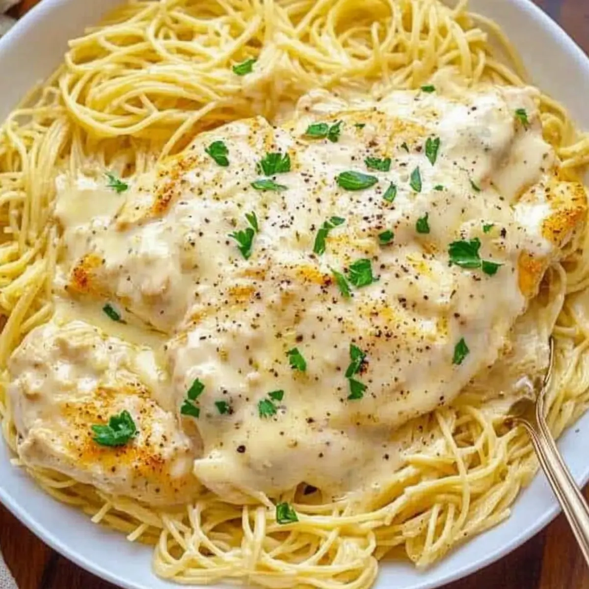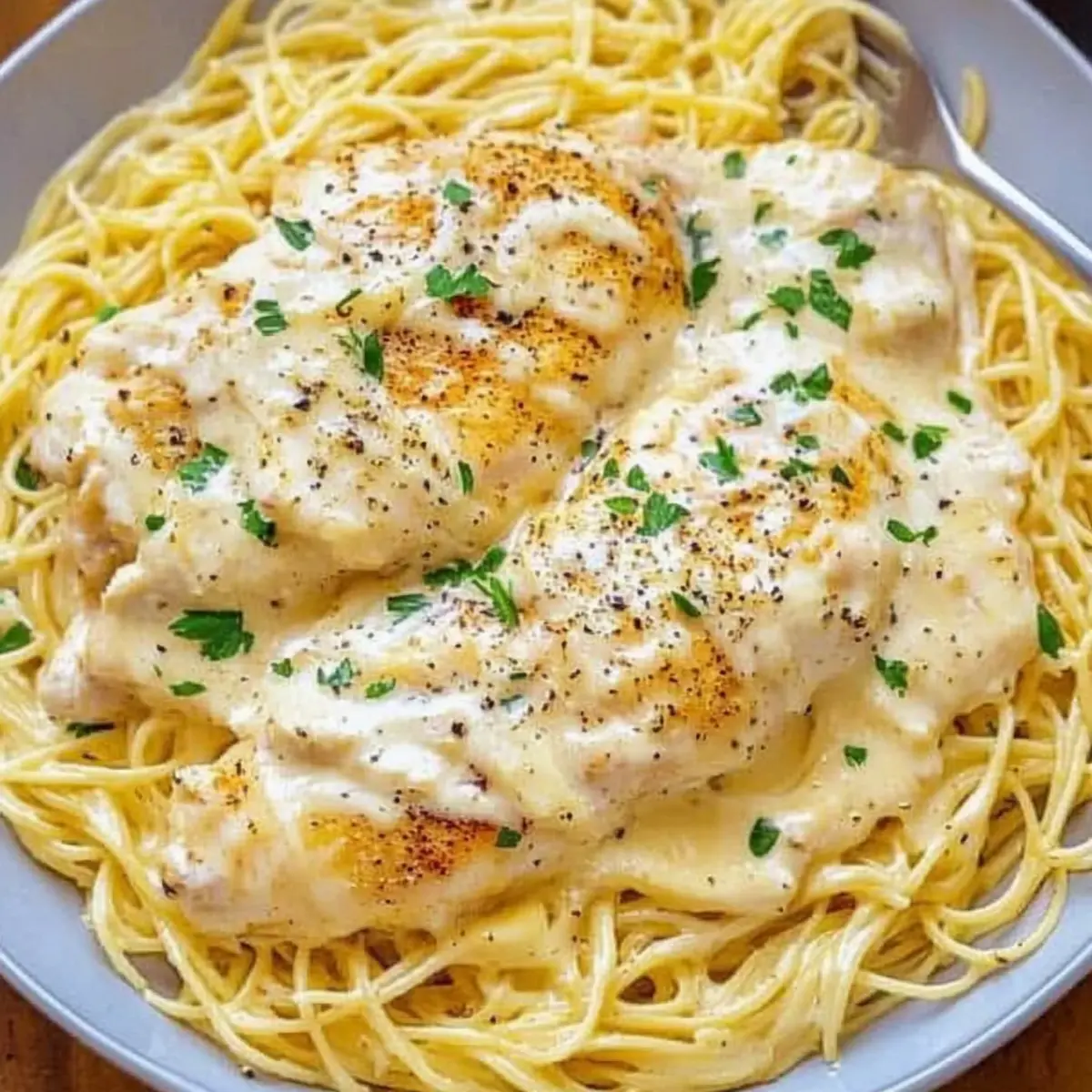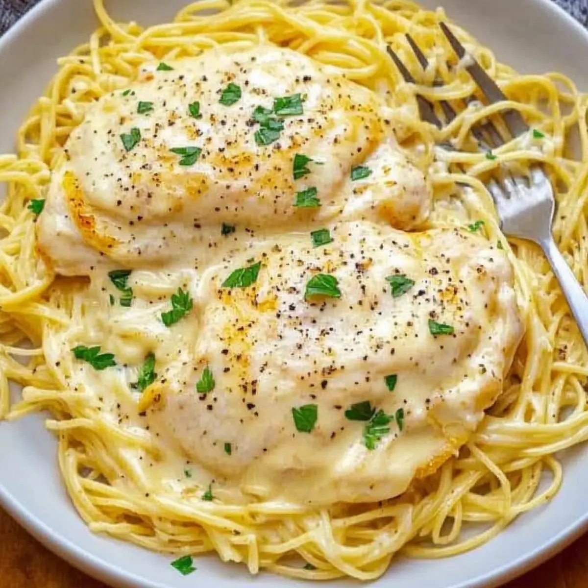 Jump to Recipe Print RecipeThe rich aroma of a slow-cooked meal enveloped the house as I prepared my favorite comforting dish: Crock Pot Angel Chicken. This creamy Italian-inspired chicken simmered in a luscious sauce is not just a dinner; it’s a heartfelt embrace on a plate. With easy prep, you can set your slow cooker and step back while it works its magic—I love how it transforms simple ingredients into a savory delight. Perfect for a busy weeknight or a cozy weekend gathering, this recipe is a go-to for both relaxation and satisfaction. With each tender piece of chicken served over angel hair pasta, you’ll experience a meal that resonates warmth and care. Ready to dive into this effortless culinary adventure? Let’s get cooking! Why is this dish irresistible? Simplicity, this Crock Pot Angel Chicken requires little effort, making it perfect for busy lives. Rich, Creamy Flavor fills your kitchen with a mouthwatering aroma, thanks to the blend of cream cheese and Italian spices. Versatile, you can easily swap in fettuccine or add veggies for a personal touch. Crowd-Pleasing Appeal makes it an excellent choice for family dinners or gatherings. Plus, it’s a true comfort food that warms not only your body but also your soul! Enjoy this alongside delicious sides like a fresh salad or some homemade garlic bread for a complete meal you’d be proud to serve. Crock Pot Angel Chicken Ingredients • Here’s what you’ll need for this creamy delight! For the Chicken Boneless, Skinless Chicken Breasts (1.5 pounds) – The main protein that absorbs the delicious sauce flavors beautifully. Salt and Pepper – Essential for basic seasoning; adjust according to your personal taste. Vegetable Oil – Use for searing chicken; it’s optional if you’re skipping the browning step. For the Creamy Sauce Cream Cheese (4 ounces, softened) – Adds a luscious creaminess to the sauce; feel free to use dairy-free alternatives if needed. Unsalted Butter (3 Tablespoons, softened) – Enhances the flavor and creaminess; can be substituted with margarine for a dairy-free version. Cream of Chicken Soup (10.5 ounce can) – Forms the sauce base; choose low or no sodium variants for health considerations. Garlic (3 cloves, minced) – Infuses robust flavor into the dish. Chicken Broth (¾ cup) – Adds moisture and depth; opt for low-sodium if desired. Good Seasons Dry Italian Salad Dressing Mix (1 packet, 0.7 ounce) – This is the key flavoring component; a homemade mix is also an excellent choice! For the Pasta Angel Hair Pasta (16 ounce box) – The perfect vehicle for that rich sauce; swap with fettuccine or spaghetti if you prefer. For Garnishing Chopped Fresh Parsley – Adds a pop of color and freshness to the dish. Cracked Pepper – Enhances the flavor profile of the meal. Grated Parmesan Cheese – A delicious topping that elevates the dish even more! Now that you have everything ready, let’s turn this comforting dream into a reality with simple cooking joy!🏠 Step‑by‑Step Instructions for Crock Pot Angel Chicken Step 1: Sear the Chicken Heat 1-2 tablespoons of vegetable oil in a cast iron skillet over medium-high heat. Season your boneless, skinless chicken breasts with salt and pepper, then sear them for 2-3 minutes on each side. You want a golden-brown crust that adds flavor. Once seared, remove the chicken from the skillet and set it aside while you prepare the sauce. Step 2: Prepare the Creamy Sauce In a mixing bowl, combine 4 ounces of softened cream cheese, 3 tablespoons of softened unsalted butter, one 10.5-ounce can of cream of chicken soup, and 3 minced garlic cloves. Pour in ¾ cup of chicken broth and a packet of Good Seasons dry Italian salad dressing mix. Whisk everything together until the mixture is smooth and creamy, ensuring a delightful base for your Crock Pot Angel Chicken. Step 3: Set Up the Crock Pot Spray the inside of your slow cooker with a non-stick spray for easy cleanup. Place the seared chicken breasts in the bottom of the Crock Pot. Next, take your prepared creamy sauce and pour it generously over the chicken, ensuring each piece is well coated. This step is crucial as it infuses the chicken with rich flavors while it cooks. Step 4: Cook the Chicken Cover the Crock Pot with the lid, setting it to low heat, and let the chicken cook for 3-4 hours. If you’re short on time, you can cook it on high for 2.5-3 hours instead. The chicken is done when it reaches an internal temperature of 165°F, remaining juicy and tender while immersed in the creamy sauce. Step 5: Cook the Pasta As the Crock Pot Angel Chicken nears readiness, prepare 16 ounces of angel hair pasta according to the package instructions. In the last 15 minutes of cooking, bring a large pot of salted water to a boil and cook the pasta until al dente. Drain the pasta well, ensuring it’s ready to soak up the delectable sauce. Step 6: Serve and Garnish Once the chicken is ready and the pasta is cooked, you can serve the Crock Pot Angel Chicken in two ways: leave the chicken whole or shred it for easier serving. Plate the pasta first, then top it with the creamy chicken and sauce. For an extra touch, garnish with chopped fresh parsley, cracked pepper, and grated Parmesan cheese to elevate the dish. How to Store and Freeze Crock Pot Angel Chicken Fridge: Store leftover Crock Pot Angel Chicken in an airtight container for up to 3-4 days. Make sure it cools to room temperature before sealing to maintain freshness. Freezer: For longer storage, freeze the chicken and sauce in a labeled freezer-safe container for up to 3 months. Note that the pasta doesn’t freeze well, so it’s best made fresh when you’re ready to enjoy it. Reheating: To reheat, thaw in the fridge overnight and warm in the microwave or on the stovetop. If refrigerated, enjoy it within 3 days for best taste. Separate Storage (Pasta): If you have leftover pasta, store it separately in an airtight container. It can last in the fridge for