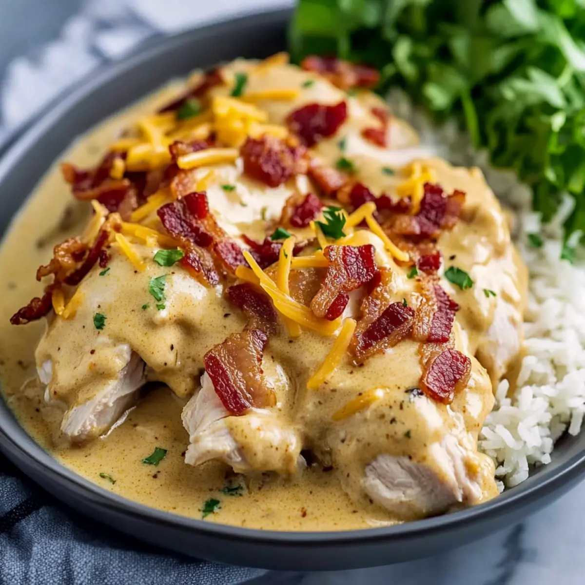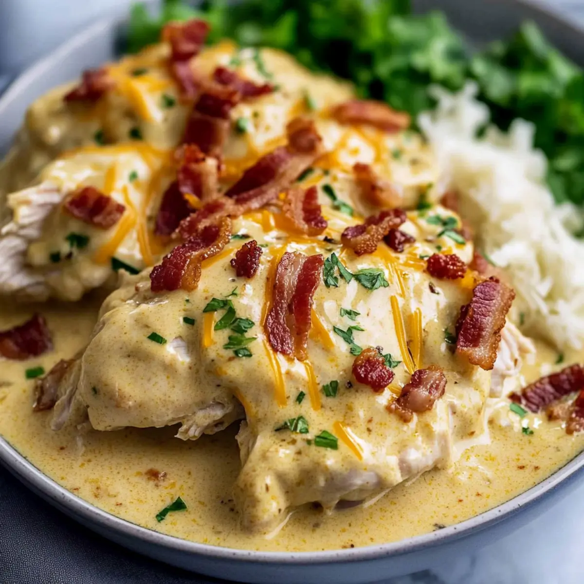 Carefully pour the creamy ranch sauce over the chicken and bacon in the slow cooker, ensuring it’s evenly coated. Spread it around gently with a spatula to cover the chicken entirely for maximum flavor absorption. The delightful aroma will start to fill your kitchen as the sauce begins to work its magic on the ingredients.