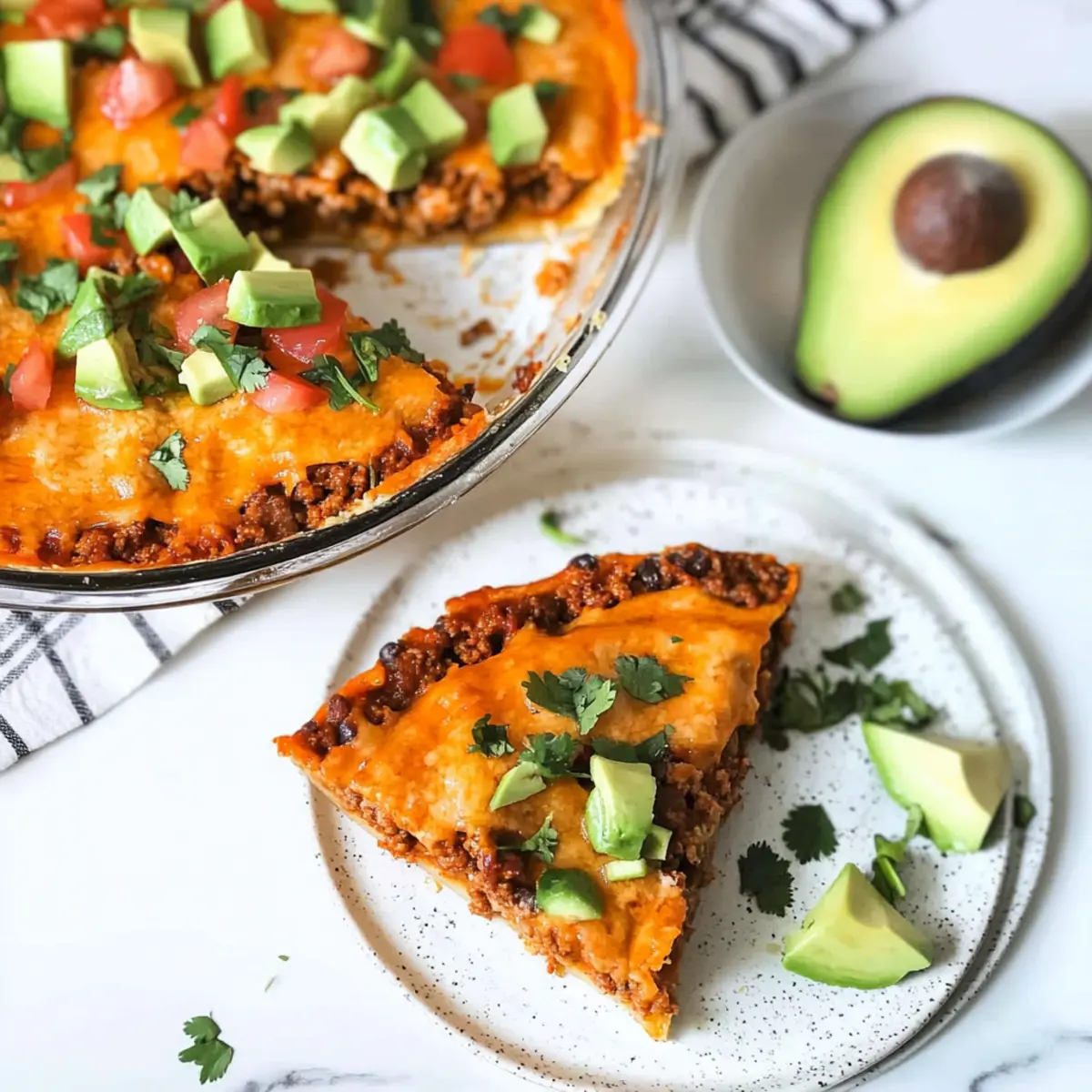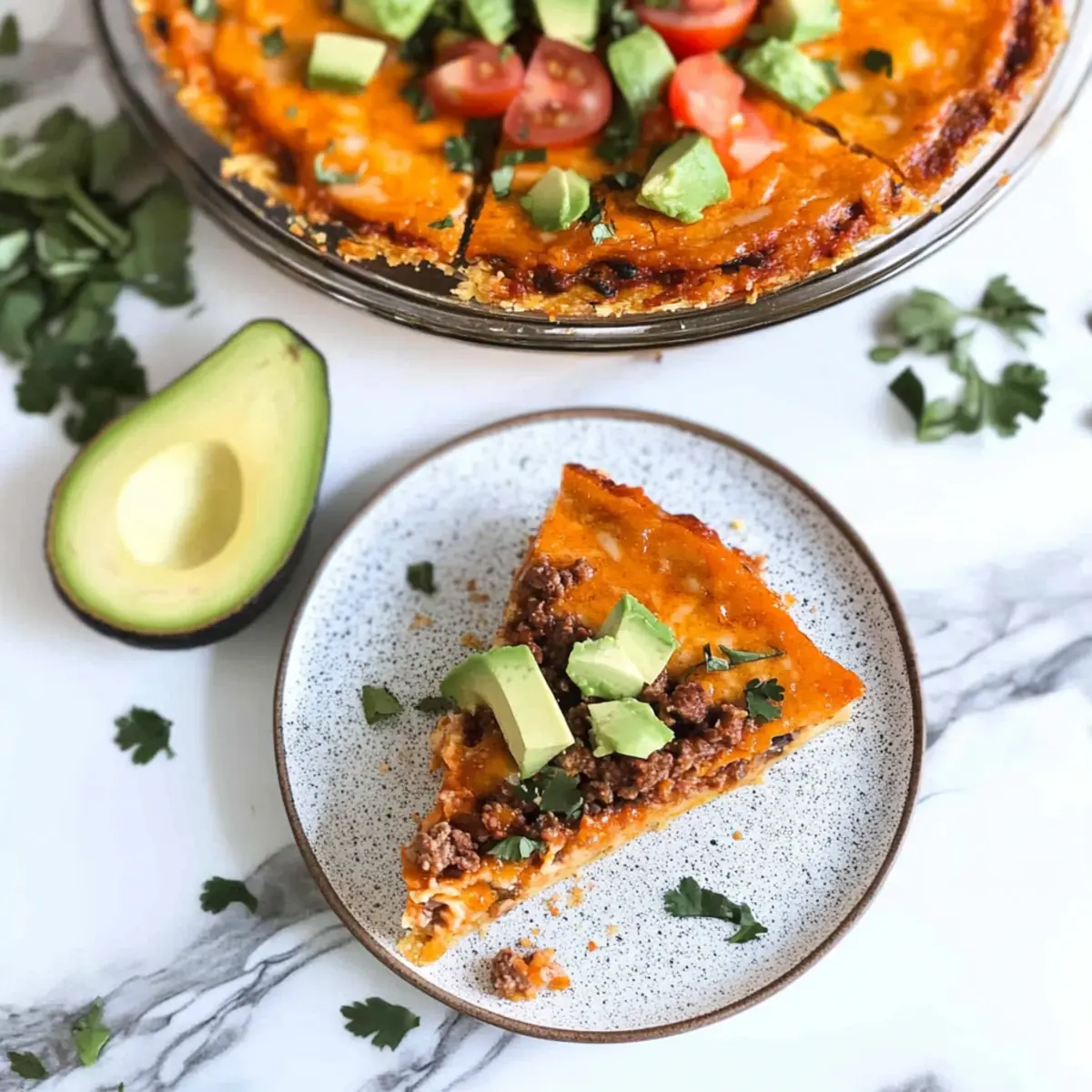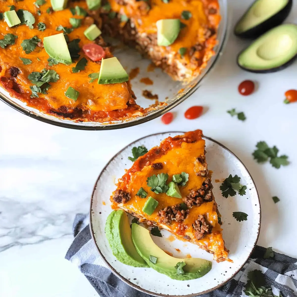 Jump to Recipe Print RecipeAs I stood in my kitchen, craving the comforting flavors of tacos but wanting to stay on track with my keto lifestyle, inspiration struck: why not create a Crustless Keto Taco Pie? This dish brings all the savory goodness of traditional tacos—seasoned beef, cheesy goodness, and just the right amount of spice—without the high carbs or the hassle of a crust. Ready in under an hour, this quick and family-friendly recipe is designed to satisfy your taco cravings while keeping you energized and guilt-free. Whether it’s a busy weeknight or a relaxed weekend gathering, this pie is sure to impress! Curious how to toss it together without breaking a sweat? Let’s dive in! Why is Crustless Keto Taco Pie a Must-Try? Quick and Easy: The preparation is a breeze, taking just about 10 minutes of active cooking time before it’s ready to bake. Savory Satisfaction: With seasoned beef and a sprinkle of cheddar cheese, each slice delivers a punch of flavor that will remind you of your favorite taco nights. Health-Conscious Comfort: Low in carbs and gluten-free, it’s a perfect choice for anyone following a keto lifestyle without sacrificing taste. Versatile Options: Feel free to customize with your favorite ingredients—try adding veggies or swapping proteins—to create a dish that suits your family’s preferences. Family-Friendly Favorite: Kids and adults alike will love digging into this hearty pie, making it a sure hit for gatherings or weeknight dinners. Whether you’re exploring more easy-to-make recipes or looking for comforting options, have you checked out our Chicken Pot Pie Soup or Healthy Oven Tacos? They’re fantastic additions to your collection! Crustless Keto Taco Pie Ingredients • Here’s everything you need to craft your delicious Crustless Keto Taco Pie! For the Filling Ground Beef – Provides the main protein and savory flavor; use 80/20 for optimal fat content, or swap it for ground turkey or chicken for a lighter option. Taco Seasoning – Infuses classic taco flavors; for lower carbs, opt for homemade or sugar-free versions. Heavy Whipping Cream – Essential for a rich, creamy texture; avoid lighter dairy to maintain the pie’s consistency. Eggs – Acts as a binding agent, adding fluffiness; be sure to mix thoroughly with other liquids to prevent lumps. Chunky Salsa – Contributes moisture and acidity to the dish; feel free to pick your favorite variety for personalized flavor. Shredded Cheddar Cheese – Melts beautifully on top, creating a delightful finish; shred from a block for better quality and lower carbs. Garlic Salt – Enhances depth of seasoning; can be substituted with regular salt mixed with garlic powder for a similar effect. Ground Black Pepper – Elevates the overall flavor; use freshly ground for a more potent taste. For Garnishing Sour Cream – Perfect for adding creaminess and tang; consider a low-carb version for keto compliance. Avocado – Adds healthy fats and creaminess; sliced or mashed, it’s a great topping choice! Fresh Cilantro – Brightens the dish with freshness; sprinkle on top for that extra burst of flavor. Step‑by‑Step Instructions for Crustless Keto Taco Pie Step 1: Preheat and Prepare Begin by preheating your oven to 350°F (175°C). Grease a 9-inch pie pan with non-stick spray or butter to ensure an easy release. While the oven warms, gather your ingredients and get ready to create this mouth-watering Crustless Keto Taco Pie, which provides a delightful fusion of flavors without the carbs. Step 2: Cook the Beef In a medium skillet, brown 1 pound of ground beef over medium heat. Cook for about 7-8 minutes, breaking it apart with a spatula until it’s fully cooked and no longer pink. Once done, drain off any excess grease, ensuring your filling stays rich without becoming too greasy. Step 3: Season the Beef Stir in your taco seasoning into the cooked beef, mixing thoroughly to incorporate all the flavors. This addition will transform the beef into a tasty foundation for your keto taco pie. Once well combined, spoon the seasoned beef mixture evenly into the greased pie pan, creating a solid base for the filling. Step 4: Whisk the Cream Mixture In a separate bowl, whisk together 1 cup of heavy cream, 2 eggs, 1 cup of chunky salsa, 1 cup of shredded cheese, 1 teaspoon of garlic salt, and freshly ground black pepper. Aim for a smooth, homogenous mixture that’s well combined, ensuring each slice of your Crustless Keto Taco Pie will be creamy and packed with flavor. Step 5: Pour and Spread Carefully pour the cream mixture over the seasoned beef in the pie pan, ensuring an even distribution throughout. This creamy layer will meld beautifully with the beef as it bakes, creating a delightful texture that mirrors the traditional taco pie experience. Step 6: Top with Cheese Sprinkle an additional 1 cup of shredded cheddar cheese over the top of the mixture, covering it generously. As the pie bakes, this cheese will melt into a beautiful, golden crust, adding an irresistible richness and flavor to your Crustless Keto Taco Pie. Step 7: Bake to Perfection Place the pie in the preheated oven and bake uncovered for 35-40 minutes. Keep an eye on it, checking for a set filling and a golden top at around the 35-minute mark. If necessary, extend the baking time slightly until you achieve perfection, ensuring your keto pie is cooked through and inviting. Step 8: Let it Rest Once baked, remove the pie from the oven and let it rest for 5-10 minutes. This crucial step allows the filling to set, making slicing easier and maintaining the integrity of your Crustless Keto Taco Pie. Step 9: Garnish and Serve Slice the pie into pieces and garnish with your favorite toppings, such as sour cream, avocado, or fresh cilantro. These additions will elevate the dish, adding freshness and richness, creating a beautiful presentation that is sure to impress both family and friends. What to Serve with Crustless Keto Taco Pie Elev
