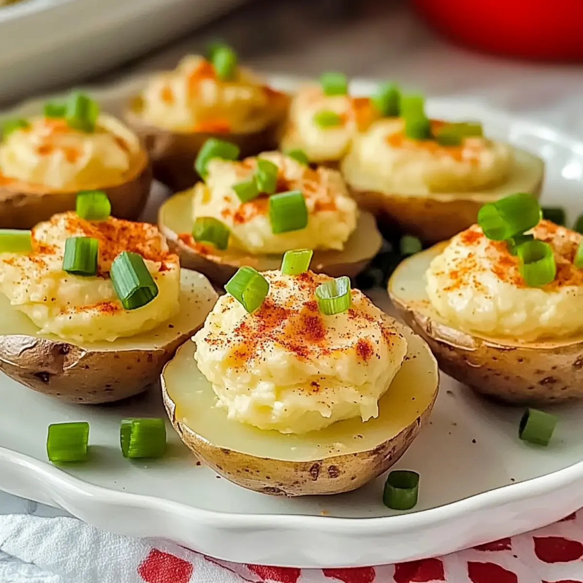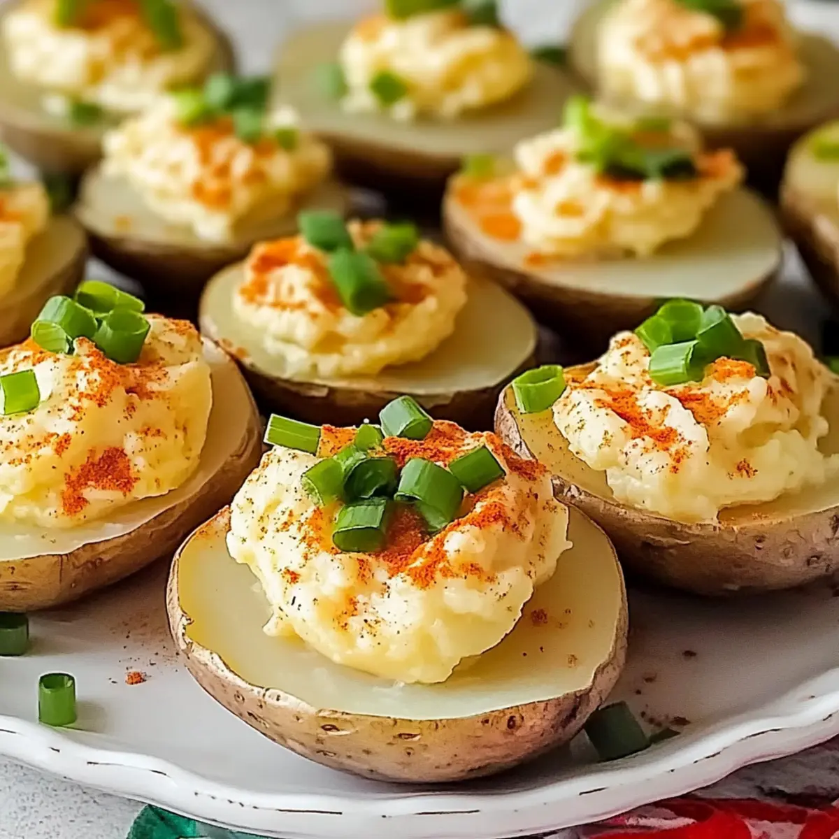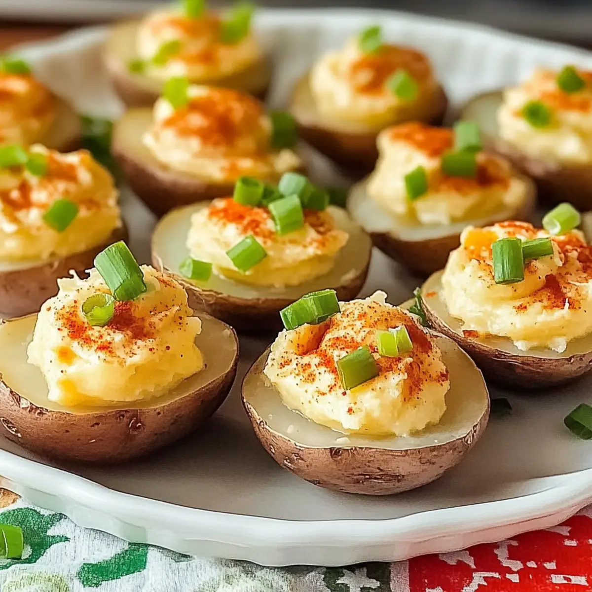 Jump to Recipe Print RecipeAs I prepped for a gathering with friends, the kitchen buzzed with excitement and the unmistakable scent of something delicious. That’s when I decided to whip up a batch of Easy Deviled Potatoes. These little creamy bites put a fun twist on the classic deviled egg and are the perfect crowd-pleaser for any occasion. With a prep time under 30 minutes and the option to pop them in the freezer, they’re not just a treat for your taste buds but also a lifesaver for busy evenings. You can easily customize these deviled potatoes to match any palate—whether that means adding a spicy kick or a vegetarian twist. Curious about how to create these irresistible snacks? Let’s dive in! Why Are Deviled Potatoes a Must-Try? Creamy, Irresistible Flavor: These deviled potatoes pack a delightful punch of creaminess and tang, making them a standout at any gathering. Quick Preparation: With under 30 minutes in the kitchen, you can whip up these bite-sized delights, leaving more time for fun and laughter. Versatile Customization: Whether you crave a spicy kick or a vegetarian option, the variations allow you to easily tailor them to any taste preference. Freezer-Friendly: Prepare ahead of time and store for later! These deviled potatoes are perfect for busy nights or unexpected guests. Crowd-Pleasing Appeal: No one can resist these creamy bites! They’re a surefire way to impress your friends and family, much like Sausage Sweet Potatoes do at any party. Get ready to see them disappear before your eyes! Deviled Potatoes Ingredients For the Potatoes • Baby Potatoes – The hearty texture is perfect for stuffing; choose small, uniform ones for even cooking. • Salt – Essential for enhancing flavor during the boiling process; adjust to taste. • Water – Needed to boil the potatoes until they’re tender and delicious. For the Creamy Filling • Mayonnaise or Sour Cream – Adds a rich, creamy texture; Greek yogurt can be a lighter substitute. • Yellow Mustard – Offers a tangy flavor; start with 1 teaspoon and modify according to your taste. • Dill Pickle Juice – Provides a zesty acidity; sweet pickle juice is a nice alternative for a milder taste. • Garlic Powder – Brings in aromatic richness to enhance the filling’s flavor profile. • Onion Powder – Adds depth and a hint of sweetness to balance the tanginess. • Ground Pepper – A dash will help season the filling to perfection. For Garnish • Chopped Green Onions (Optional) – Introduces freshness and a pop of color to your deviled potatoes. • Paprika (Optional) – A sprinkle adds visual appeal and a subtle smoky flavor. These deviled potatoes are not only easy to make but also entirely customizable to please any crowd! Step‑by‑Step Instructions for Easy Deviled Potatoes Step 1: Prepare Potatoes Begin by washing 1 lb of baby potatoes thoroughly under cold water, scrubbing off any dirt. Slice each potato in half lengthwise, exposing the tender interior. Set the halved potatoes aside on a clean kitchen towel as you get the boiling pot ready. Step 2: Boil In a medium pot, add the halved potatoes and cover them with cold water, ensuring they are fully submerged. Sprinkle in a generous pinch of salt, then turn the heat to high and bring the water to a rolling boil. Once boiling, reduce the temperature to medium-low and simmer for 15-20 minutes, or until the potatoes are fork-tender but still firm. Step 3: Cool Once the potatoes are cooked, carefully drain them in a colander and rinse them under cold running water to stop the cooking process. Allow the potatoes to sit for a few minutes to cool down, ensuring they’re safe to handle. This cooling step is essential for easily scooping out the insides without tearing the skins. Step 4: Scoop With a small spoon or a melon baller, carefully scoop out the insides of each potato half. Leave about ¼-inch of potato intact along the skin to maintain its shape. Place the scooped potato into a mixing bowl, being gentle to avoid breaking the skins of your creamy deviled potatoes. Step 5: Mix Filling In the mixing bowl with the scooped potato, blend in ½ cup of mayonnaise (or sour cream) for creaminess, 1 teaspoon of yellow mustard for tang, and 1 tablespoon of dill pickle juice for flavor. Add a sprinkle of garlic powder, onion powder, and season generously with salt and pepper. Mix everything until smooth and creamy, ensuring all ingredients are well-combined. Step 6: Fill Using a spoon or a piping bag, fill each hollowed potato half with the creamy mixture. Pack the filling generously, allowing it to slightly overflow for a decadent touch. Use the back of a spoon to smooth the top, making each potato a delightful treat ready for garnishing. Step 7: Garnish To elevate your deviled potatoes, sprinkle a dash of paprika on top for a pop of color and flavor. For added freshness, finish with a scattering of chopped green onions. Once garnished, place the filled potatoes in the fridge for at least 30 minutes, allowing the flavors to meld beautifully before serving. What to Serve with Easy Deviled Potatoes The charm of Easy Deviled Potatoes extends far beyond just being a star on their own; they make a fantastic addition to any meal spread, bringing warmth and flavor to the table. Garlic Shrimp Skewers: Succulent and aromatic, these skewers are the perfect pair, balancing the creamy texture of the potatoes with juicy bites of shrimp. Crispy Roasted Brussels Sprouts: The crisp exterior and tender inside of these Brussels sprouts provide a delightful crunch that complements the softness of the deviled potatoes. Fresh Garden Salad: A light, refreshing salad with zesty vinaigrette brightens the palate and elevates the meal’s overall experience, making it absolutely essential. Spicy Garlic Bread: This robust and buttery bread brings a savory kick that mingles beautifully with the creamy filling, making every bite exciting. Classic Coleslaw: The tanginess and crunch o