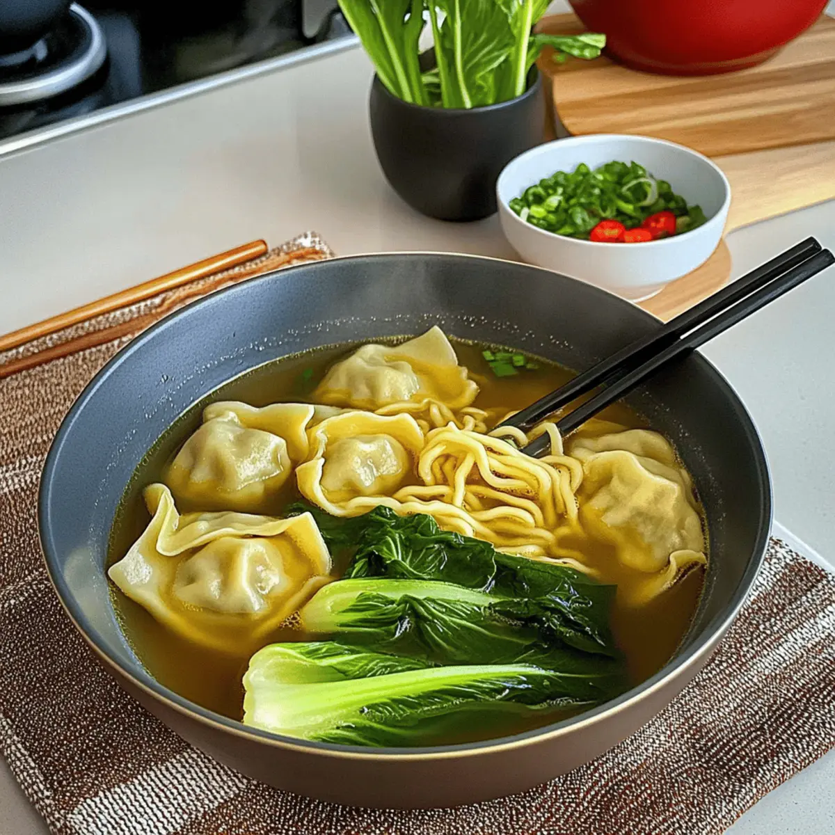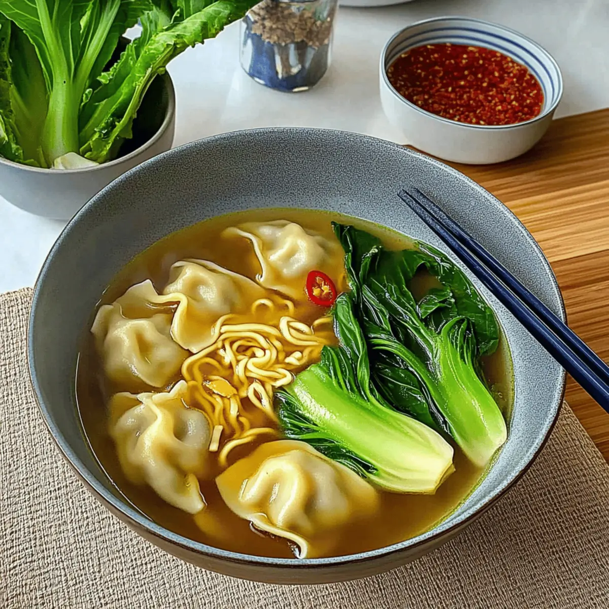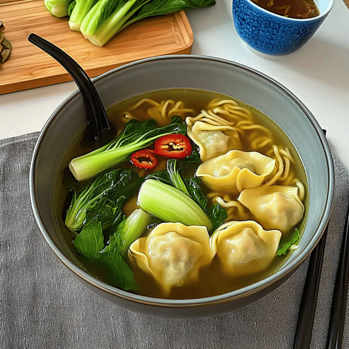 Jump to Recipe Print RecipeThe aroma of simmering broth fills the kitchen, and there’s a simple joy in creating a bowl of comfort. My Quick and Easy Dumpling Noodle Soup brings together hearty frozen dumplings, tender egg noodles, and vibrant bok choy for an Asian Fusion delight that’ll brighten your weeknight meals. Not only is this recipe a lifesaver for those busy evenings, but it also transforms pantry staples into a warm hug in a bowl—a true crowd-pleaser that caters to every palate. With minimal prep and fuss, you can have a steaming bowl ready in no time. How could a simple soup turn into the ultimate weeknight triumph? Let’s dive in and find out! Why is this Dumpling Noodle Soup a Must-Try? Quick and Easy: This recipe is a hassle-free way to whip up a nourishing meal, perfect for those busy nights. Savory Broth: The homemade broth, filled with garlic and ginger, enhances the flavors and creates a warm, inviting aroma. Versatile Ingredients: Feel free to mix and match proteins and veggies! Whether using frozen dumplings or adding seasonal greens, the choices are endless. Crowd-Pleasing Appeal: It’s a comforting dish that satisfies both kids and adults alike, making it ideal for family dinners. Time-Saving: In just under 15 minutes, you can serve up a wholesome soup that tastes like it’s been simmering all day! Dumpling Noodle Soup Ingredients For the Broth Garlic – Adds depth of flavor; substitute with garlic chives or ground cumin if needed. Fresh Ginger – Provides warmth and spice; jarred ginger works as a convenient alternative. Chicken Stock Cubes – Base for the broth; homemade stock can enhance the richness significantly. Sesame Oil – Enhances the broth’s nutty notes; can be swapped with olive oil in a pinch. Sugar – Balances flavors in the broth; optional for those avoiding sweetness. Soy Sauce – Adds umami and saltiness; choose low-sodium soy sauce for a healthier option. Boiling Water – Hydrates and cooks ingredients; ensure it’s at a rolling boil for best results. For the Soup Frozen Dumplings – Serves as the main protein; any flavor, such as pork, chicken, or vegetable, works great. Bok Choy – Provides essential greens; feel free to use other leafy vegetables or spinach. Red Chilli – Adds heat and a pop of color; omit for a milder soup or use bell pepper instead. Spring Onions – Offers freshness and crunch; regular onions can be used but will change flavor slightly. Pre-Cooked Egg Noodles – Quick cooking base; rice noodles can be substituted for a gluten-free version. Fresh Coriander (optional) – Garnish for added freshness; skip if you’re not a fan of cilantro. Step‑by‑Step Instructions for Delicious Dumpling Ramen Bowl Step 1: Prepare the Broth In a large pot, combine minced garlic, grated fresh ginger, chicken stock cubes, sesame oil, sugar, and soy sauce. Pour in 6 cups of boiling water, ensuring the mixture reaches a rolling boil. Stir well, and observe the broth bubbling with flavors infusing as the garlic and ginger release their aromatic essence. This savory base sets the stage for your delicious dumpling ramen bowl. Step 2: Cook the Dumplings Once your broth is boiling, carefully add the frozen dumplings to the pot. Allow them to simmer for about 5 minutes, stirring gently to prevent them from sticking to one another. Watch as the dumplings turn a lovely golden color while heating through, providing that satisfying texture. This step enhances the meal with the protein component that makes the ramen bowl hearty. Step 3: Prep the Vegetables While the dumplings are simmering, halve and wash the bok choy to prepare it for the soup. Slice the red chilli and spring onions, setting them aside for garnishing later. This process not only adds essential greens and vibrant flavors to your dumpling ramen bowl but also fills your kitchen with an inviting aroma of fresh veggies. Step 4: Incorporate Noodles and Greens After the dumplings have simmered for 5 minutes, gently add the pre-cooked egg noodles and the prepared bok choy to the broth. Cook for an additional 2 minutes, letting the noodles soak up the savory flavors. Keep an eye on the bok choy; it should remain slightly crisp, adding a delightful crunch to your delicious dumpling ramen bowl. Step 5: Serve with Style Ladle the steaming soup into bowls, ensuring each serving is filled with dumplings, noodles, bok choy, and that rich broth. The colors and aromas of your delicious dumpling ramen bowl are stunning—present it with flair! Step 6: Garnish and Enjoy Top each bowl with the sliced red chilli and spring onions for an extra flavor boost. If desired, sprinkle with fresh coriander to enhance the freshness of the dish. Serve the delicious dumpling ramen bowl immediately, and watch everyone delight in this cozy, comforting meal that feels like a warm hug in a bowl. Dumpling Noodle Soup Variations Feel free to adjust this recipe to suit your taste buds or dietary needs, creating a personalized dish that excites your palate! Vegetarian: Substitute frozen dumplings with tofu or veggie dumplings. This makes a delicious and satisfying meal for plant-based diets. Spicy Upgrade: Add sliced jalapeños or a spoonful of sriracha to the broth for a fiery kick. The heat adds an exciting dimension to your cozy soup! More Veggies: Toss in additional vegetables like snap peas or carrots for a vibrant and nutritious boost. They’ll add color and crunch, making each bite delightful. Flavor Boost: Drizzle a touch of hoisin sauce or oyster sauce into the broth for an umami explosion. These ingredients elevate the dish into restaurant-quality fare. Noodle Options: Swap out egg noodles for rice noodles or even zucchini noodles for a lighter spin. Choose your favorite noodle type for a unique take on this classic recipe! Herb Infusion: Fresh mint or Thai basil can replace coriander for an aromatic twist. These herbs deliver a refreshing flavor that complements the soup beautifully. Chicken U